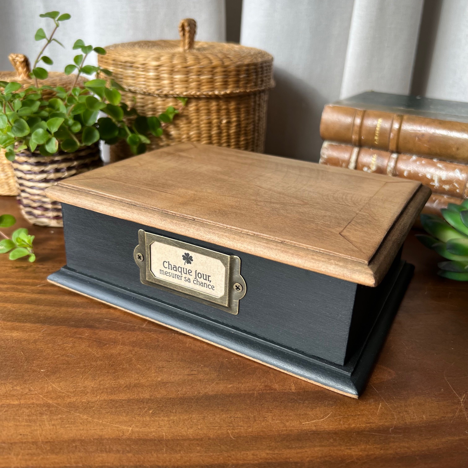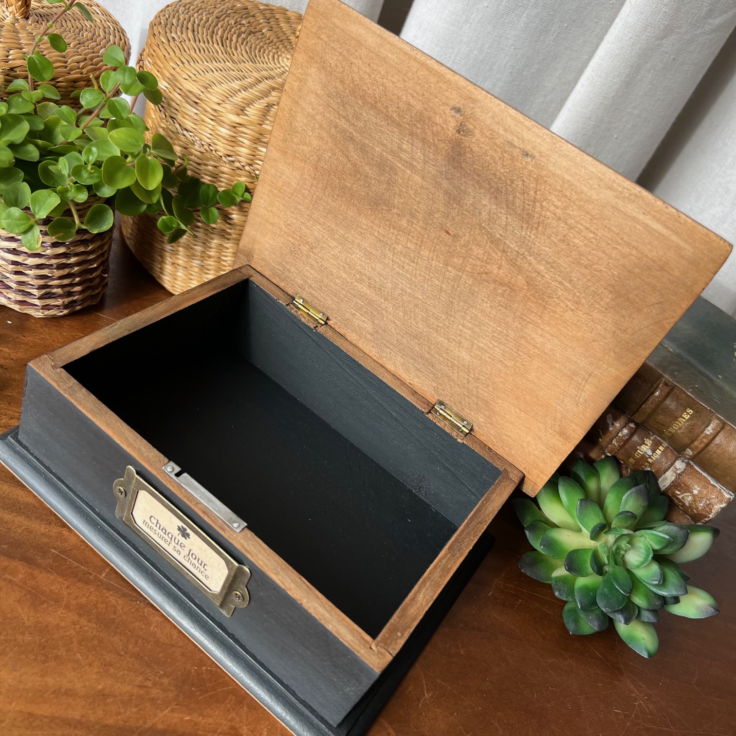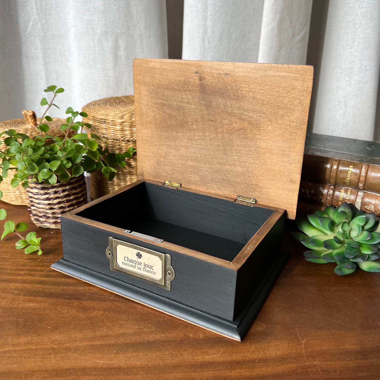 #boîteÀSecrets #boîteBois #boîteÀBijoux #porteÉtiquette #messageInspirant #maValiseEnCarton #décoNoire #patineBois #chance #brocanteChic