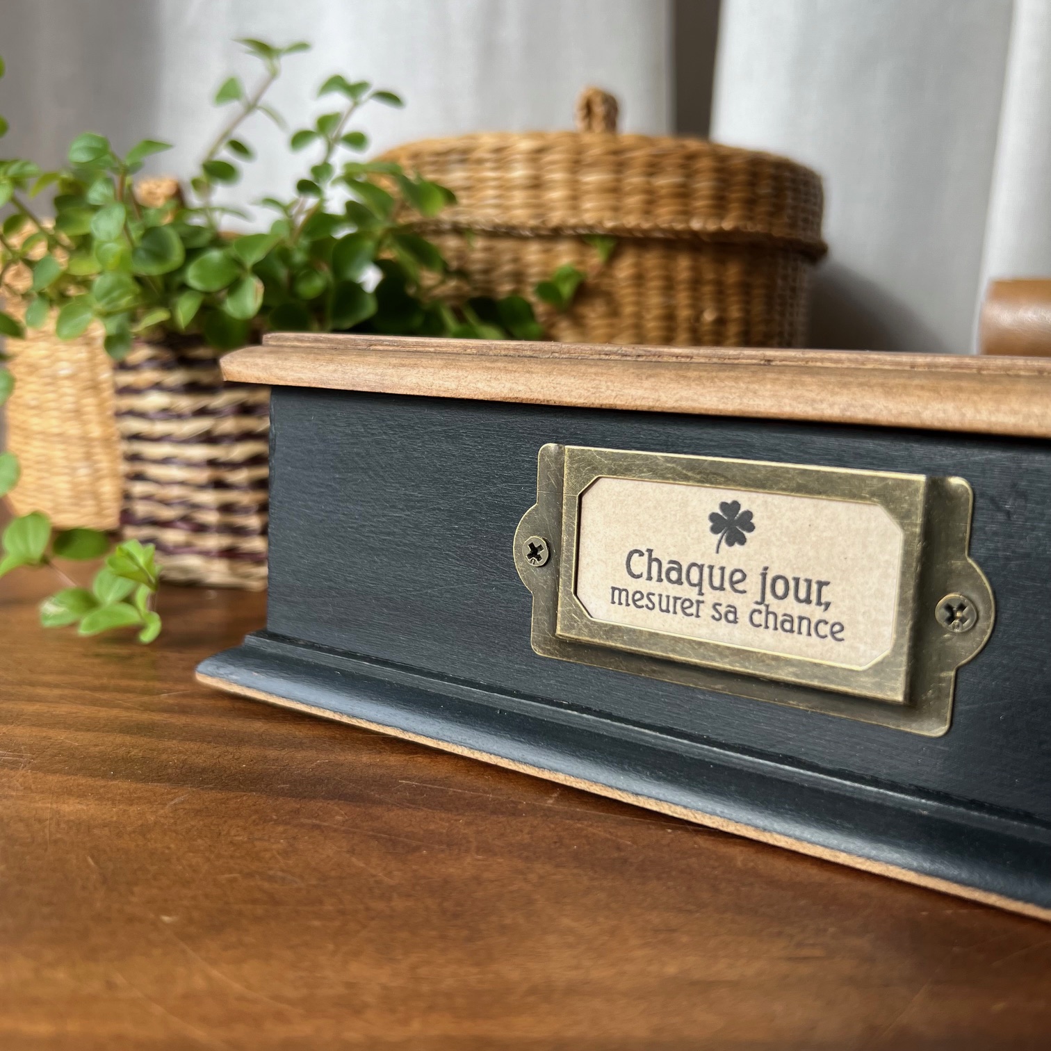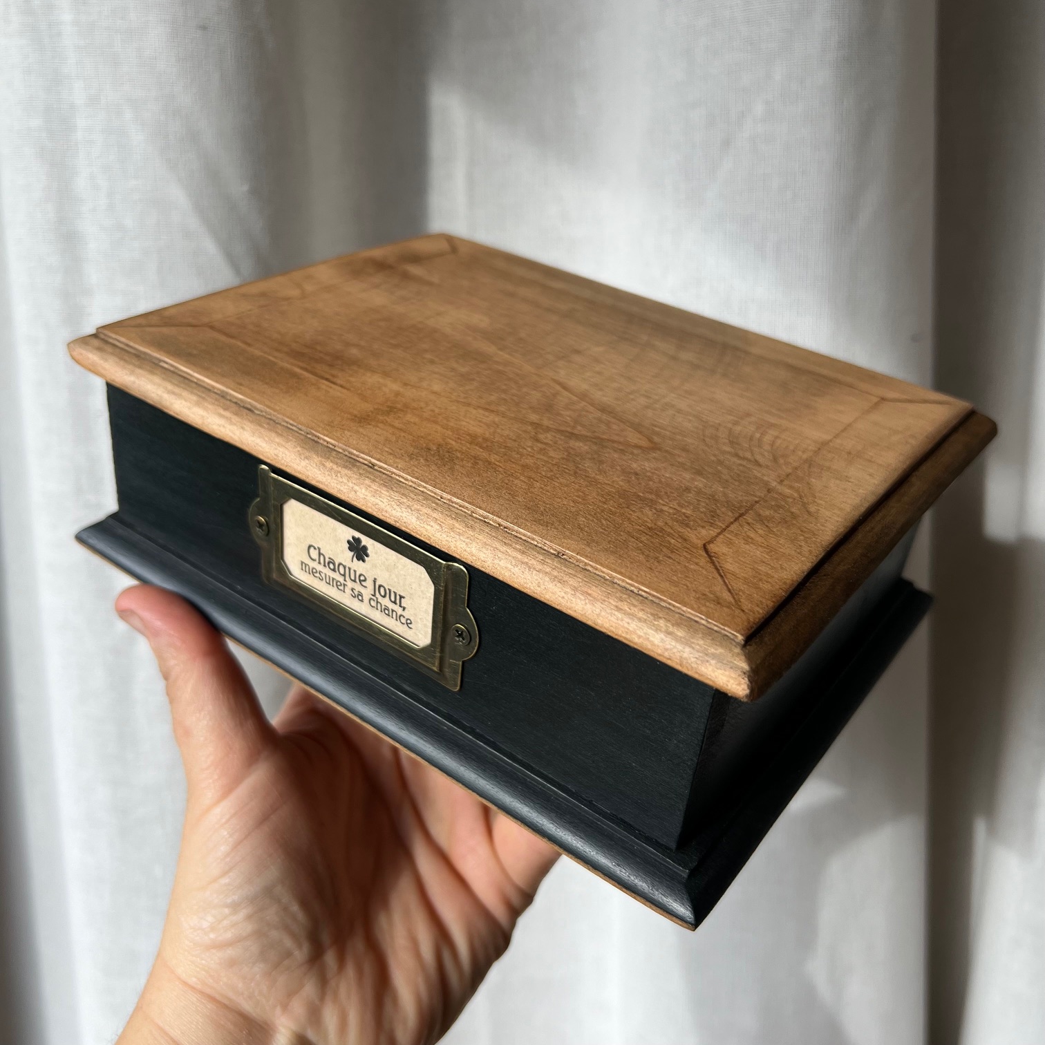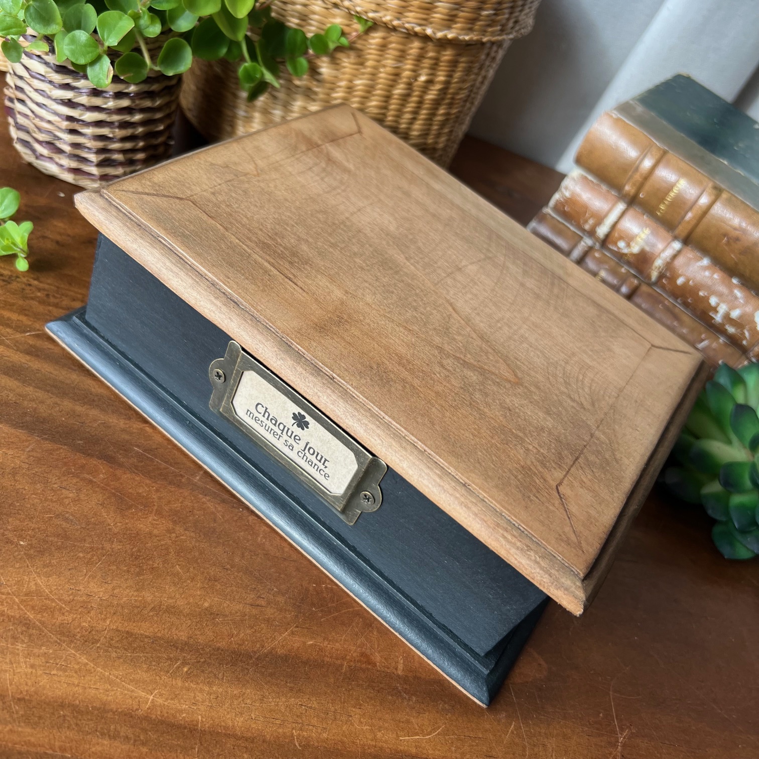 #boîteÀSecrets #boîteBois #boîteÀBijoux #porteÉtiquette #messageInspirant #maValiseEnCarton #décoNoire #patineBois #chance #brocanteChic