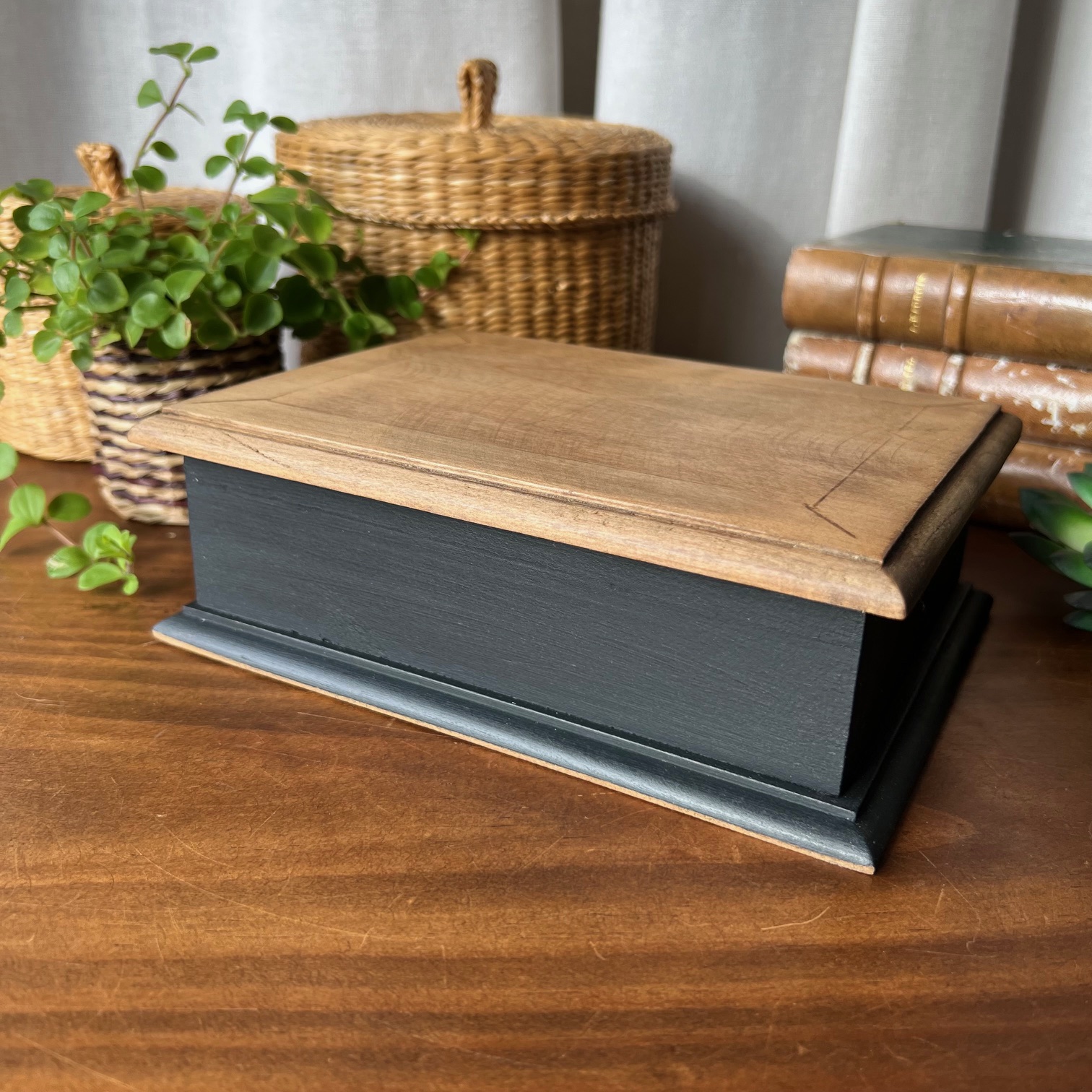 Une jolie boîte à offrir ou à s’offrir… Le corps est patiné noir, le couvercle garde la belle couleur du bois — un contraste qui lui va parfaitement. À l’avant, un porte-étiquette cache un ancien trou de serrure devenu décoratif.