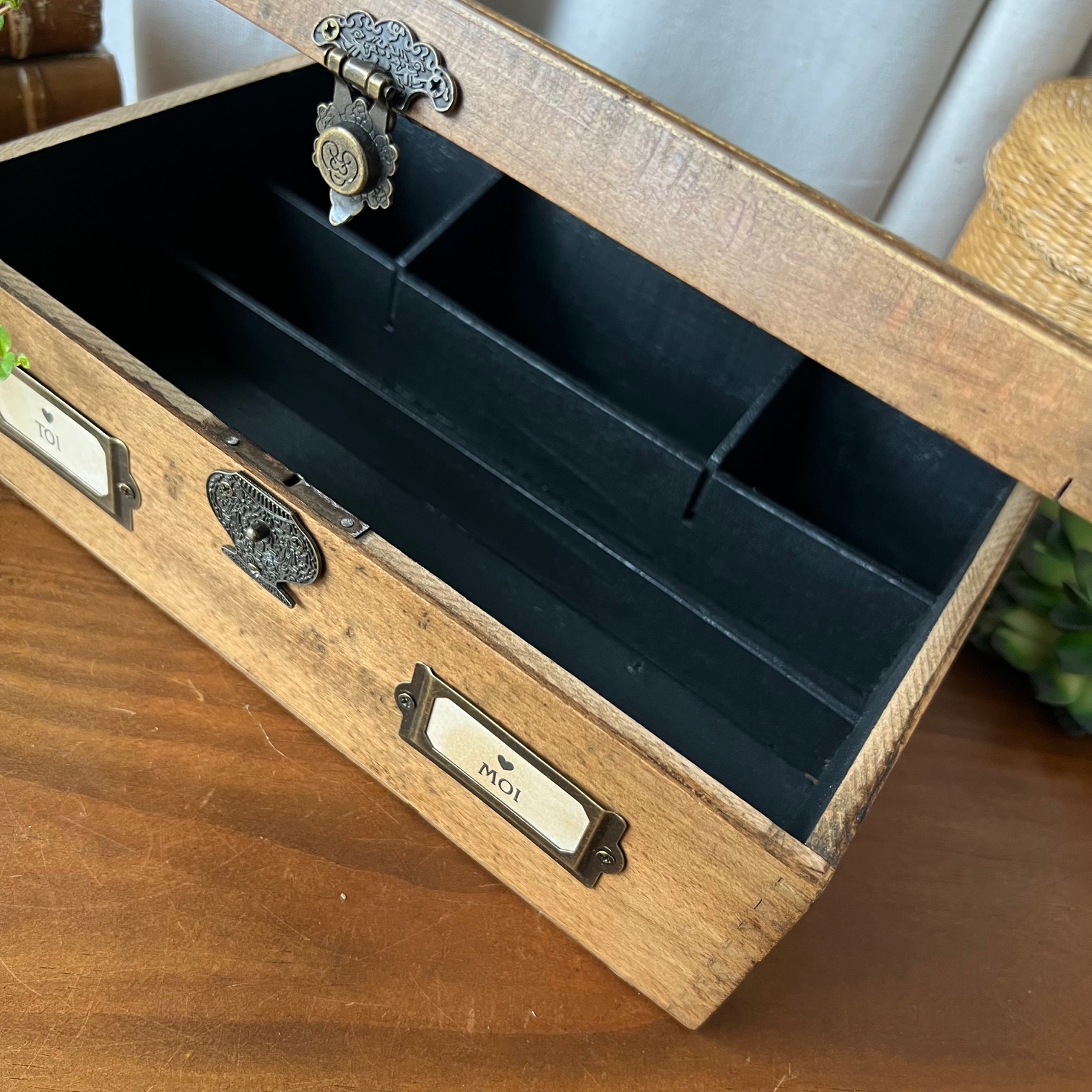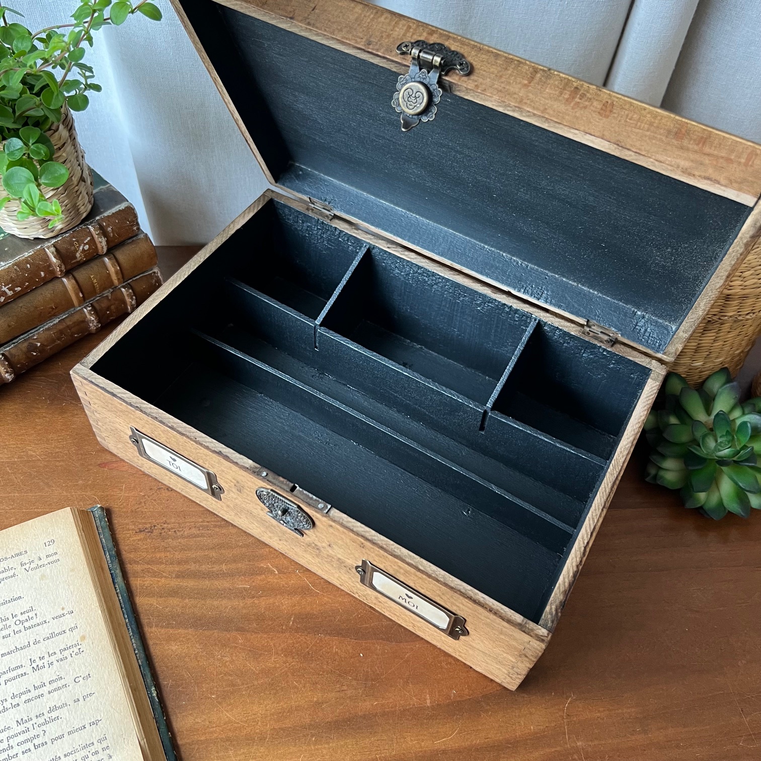 #MaValiseEnCarton #BoiteEnBois #DécoVintage #ObjetsPatinés #BrocanteChic #OrganisationAvecStyle #DécorationIntérieure #PatineNoire #BoiteCompartimentée #TrésorsÀConserver #VintageLovers #ObjetUnique #DécorationPoétique #ArtisanatEtRécup