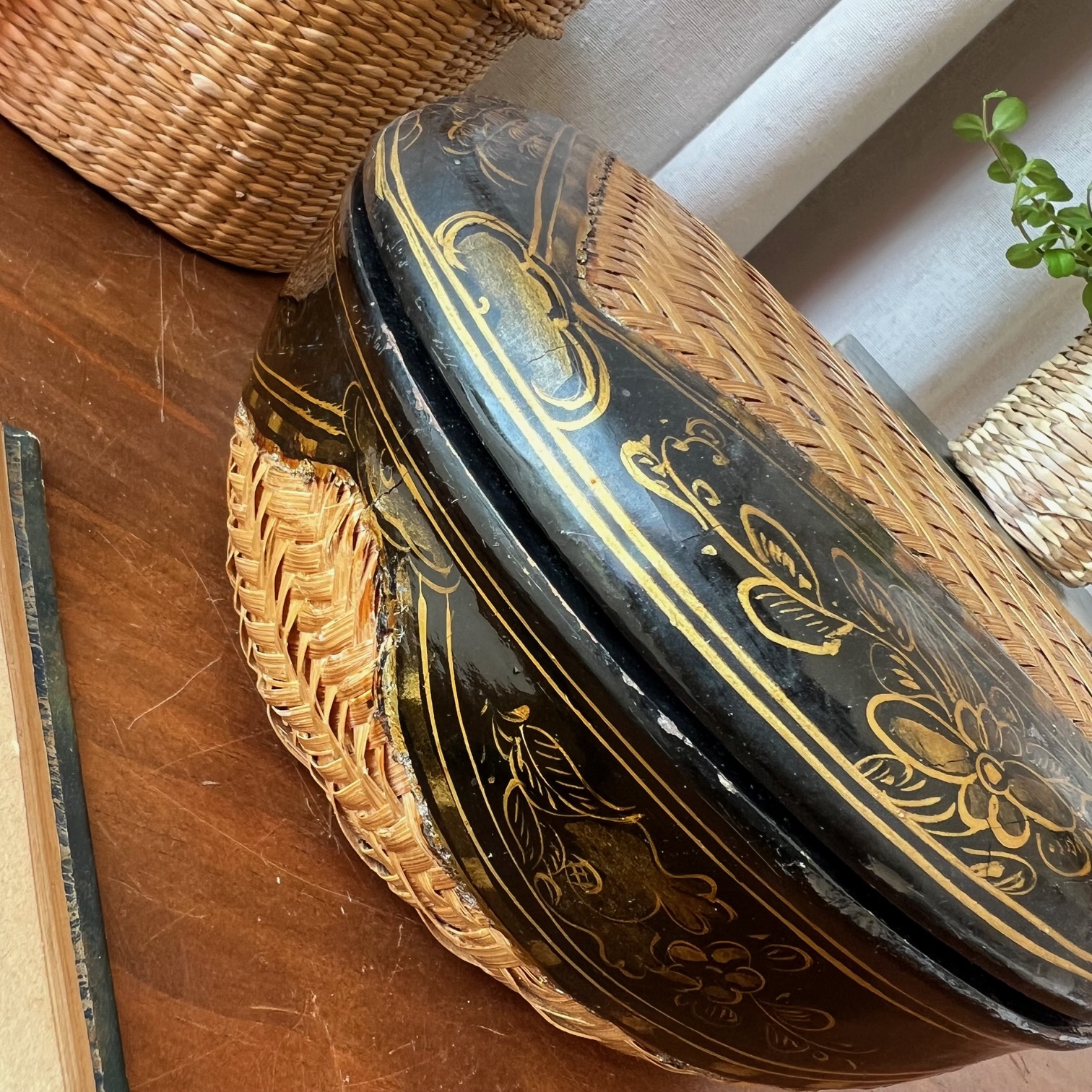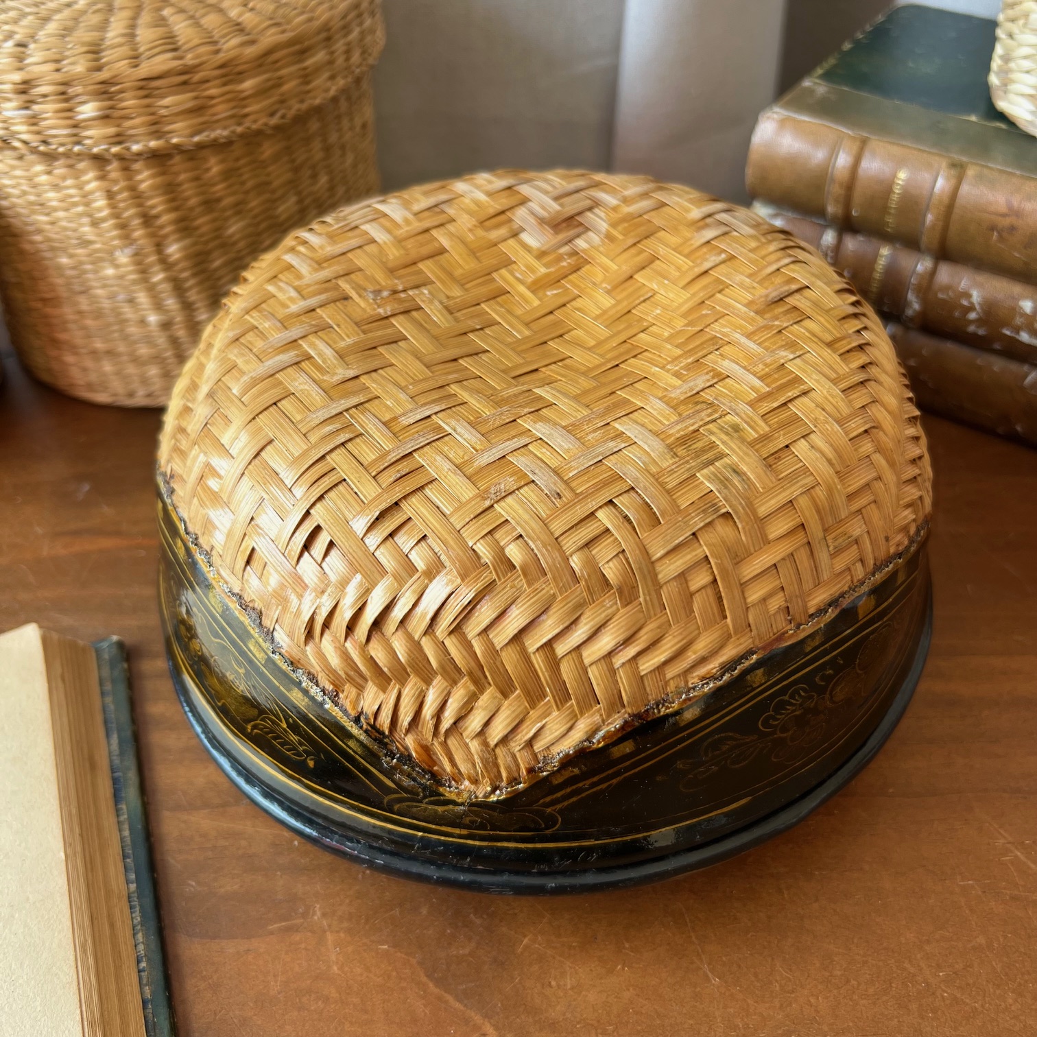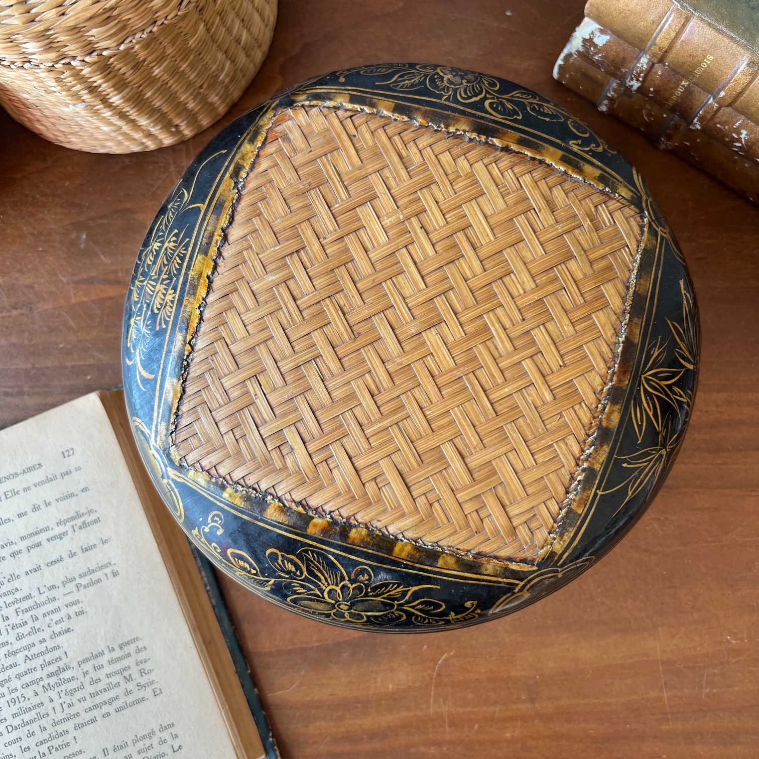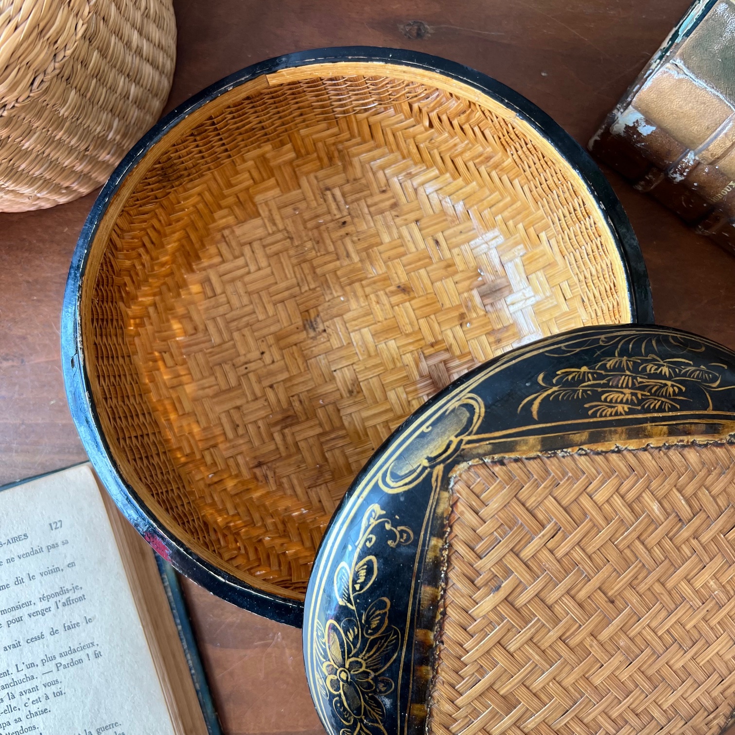 Un charme fou pour cette boîte ancienne datant de la fin du XIXe siècle, en papier mâché noir rehaussé de dorures fines et habillée d’une délicate marqueterie de paille.