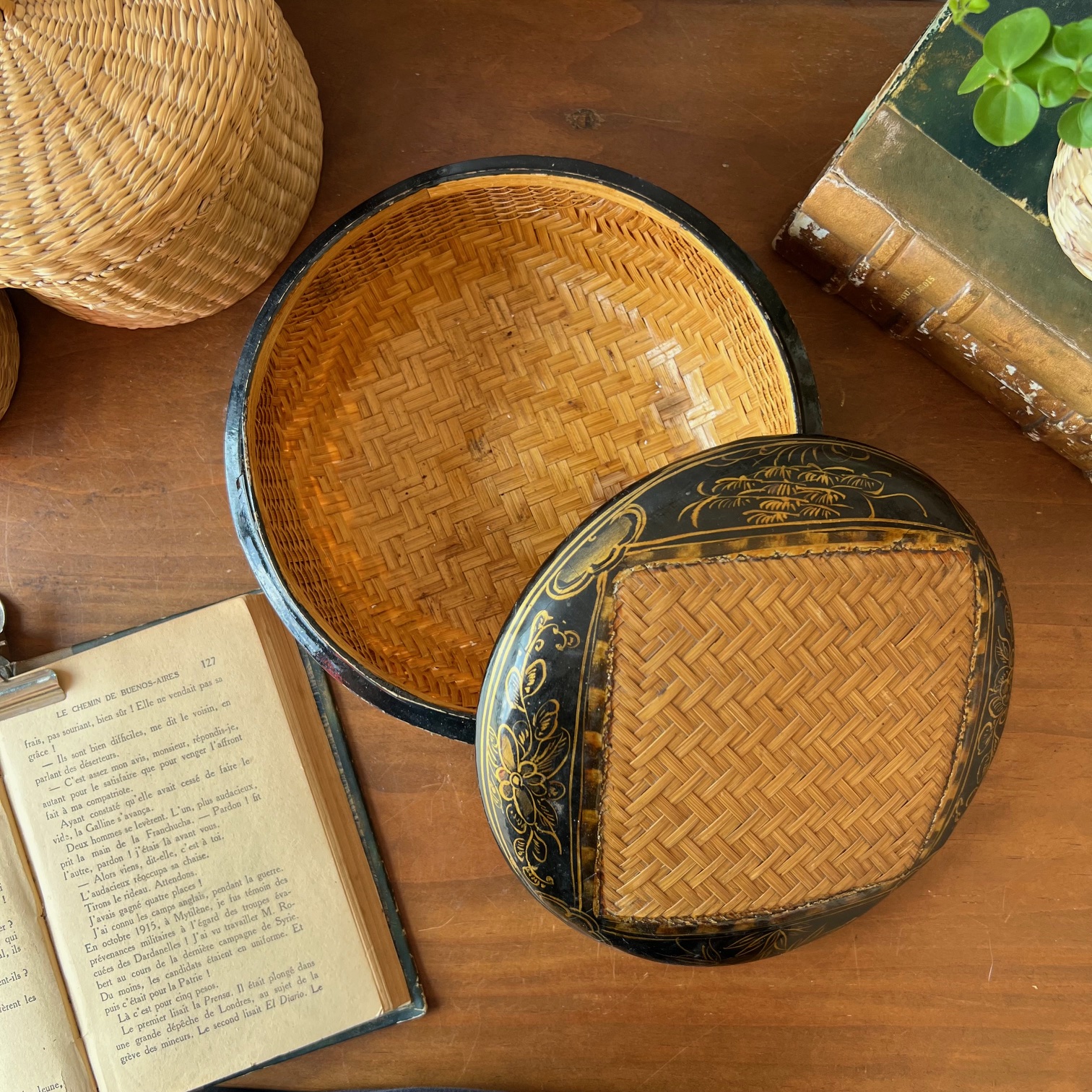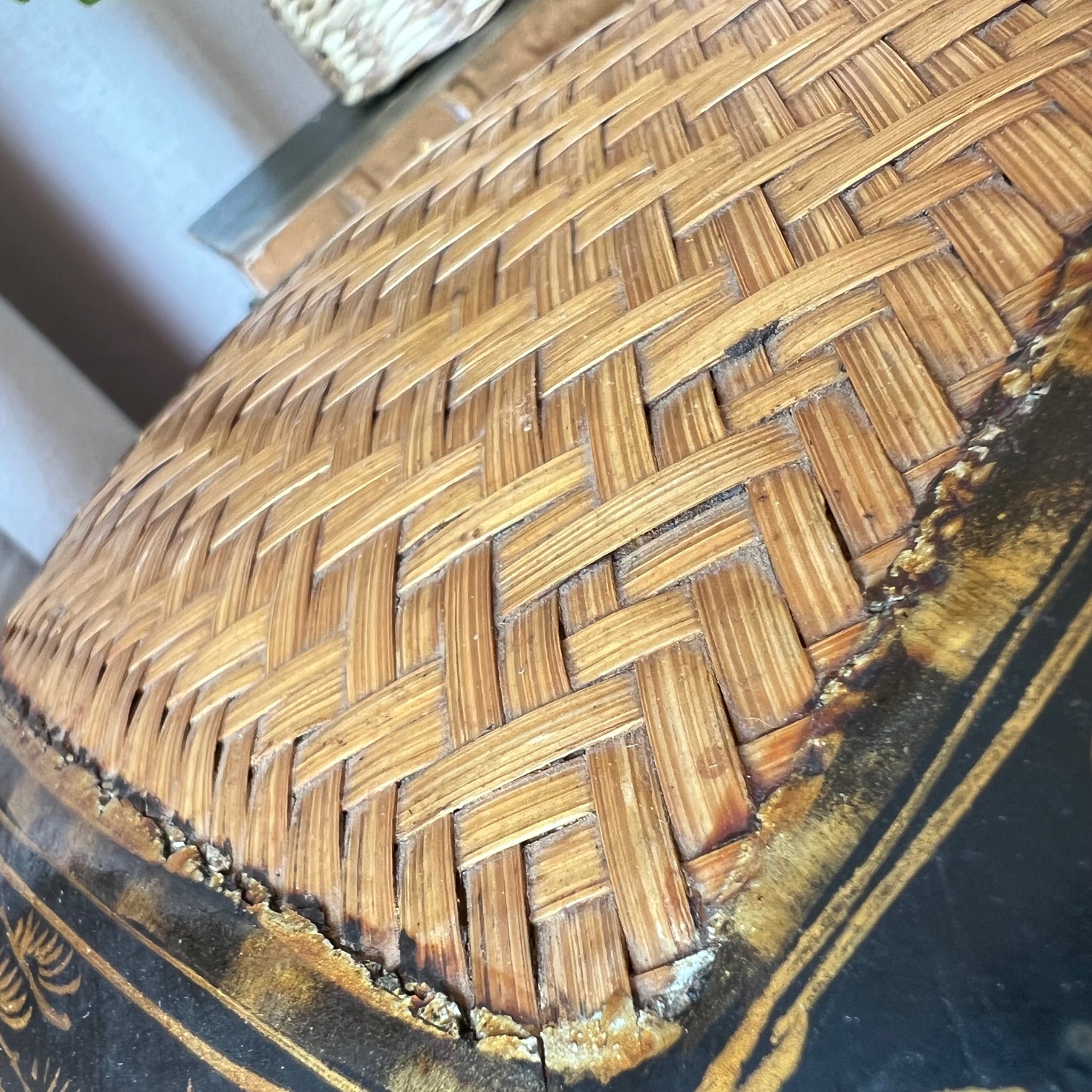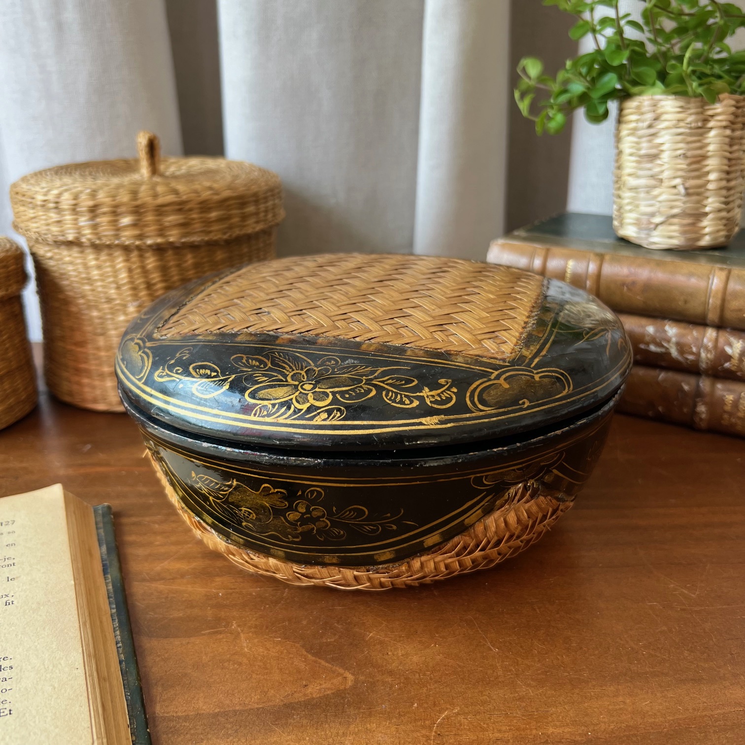 Un charme fou pour cette boîte ancienne datant de la fin du XIXe siècle, en papier mâché noir rehaussé de dorures fines et habillée d’une délicate marqueterie de paille.