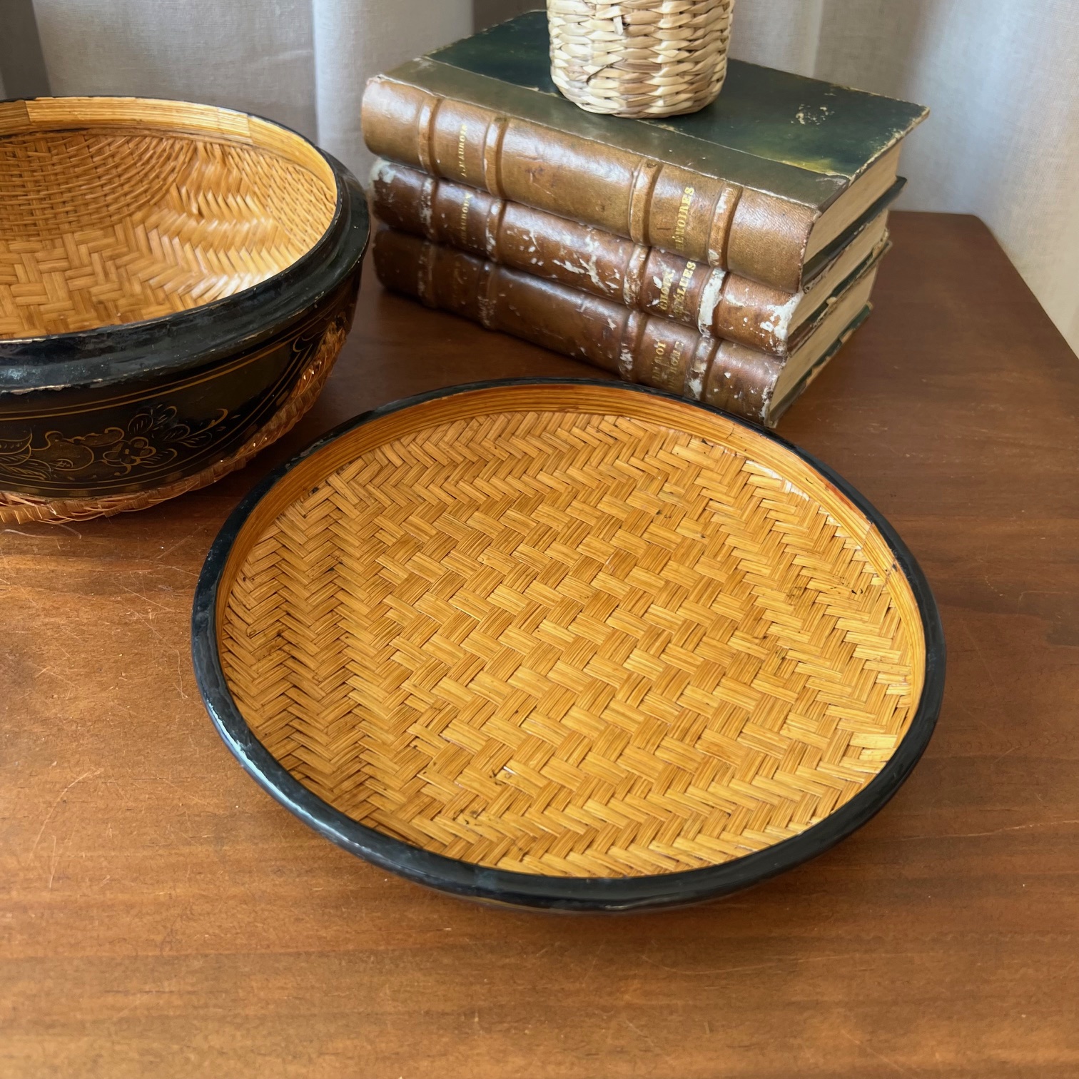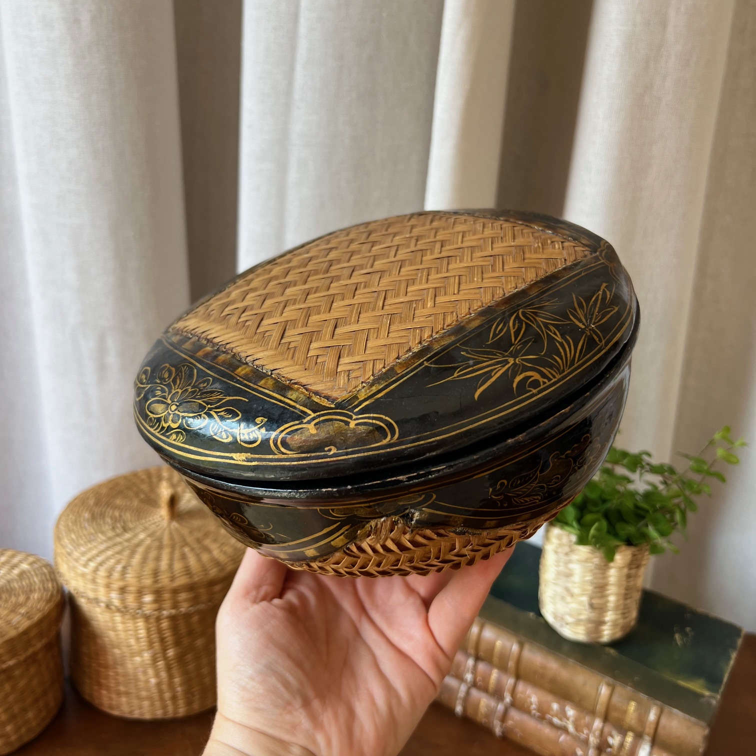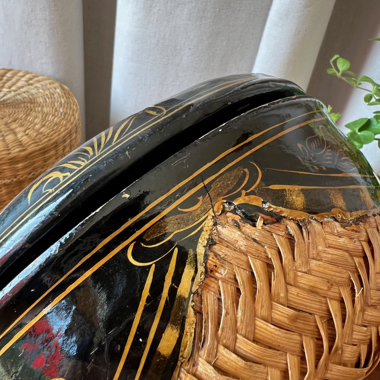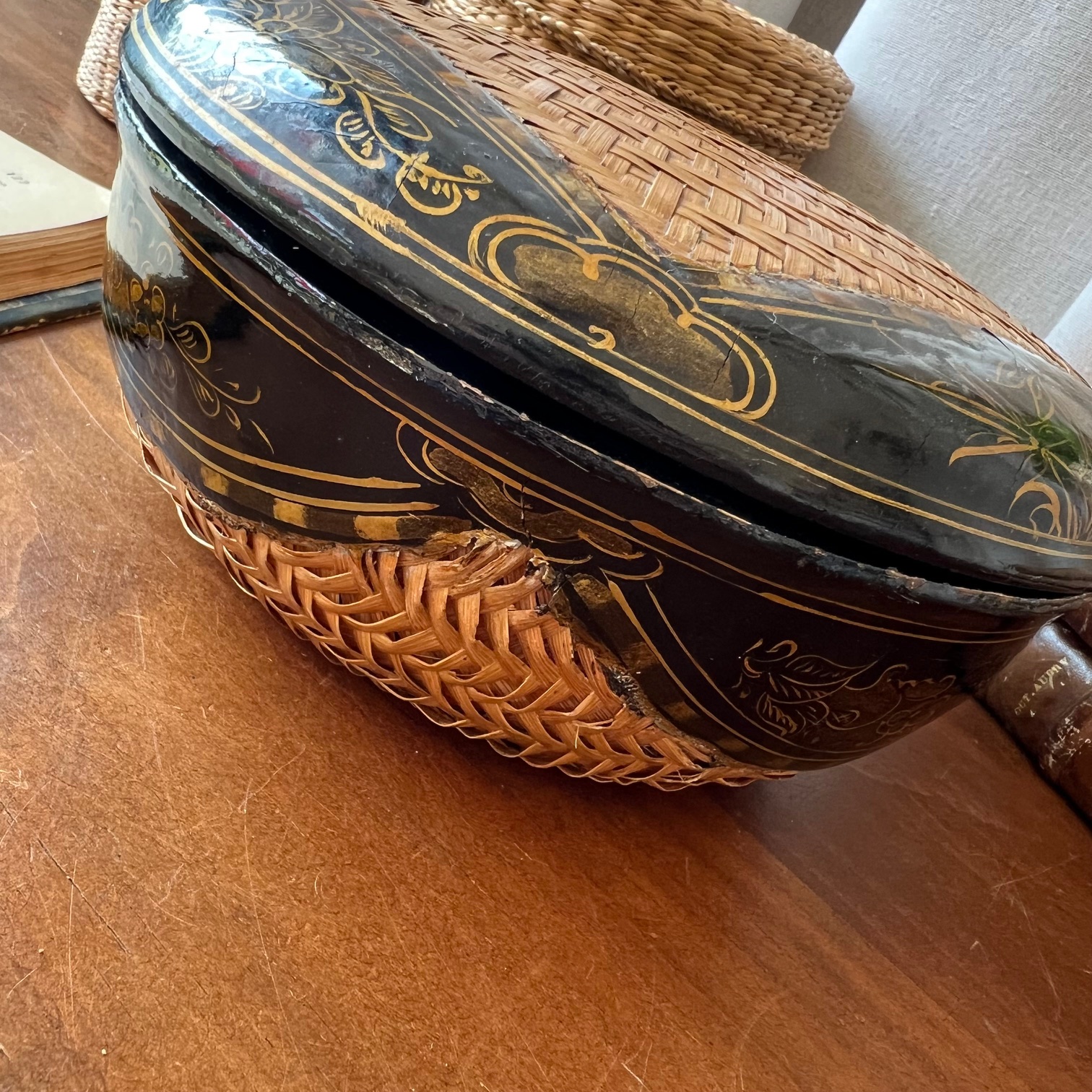 Un charme fou pour cette boîte ancienne datant de la fin du XIXe siècle, en papier mâché noir rehaussé de dorures fines et habillée d’une délicate marqueterie de paille.