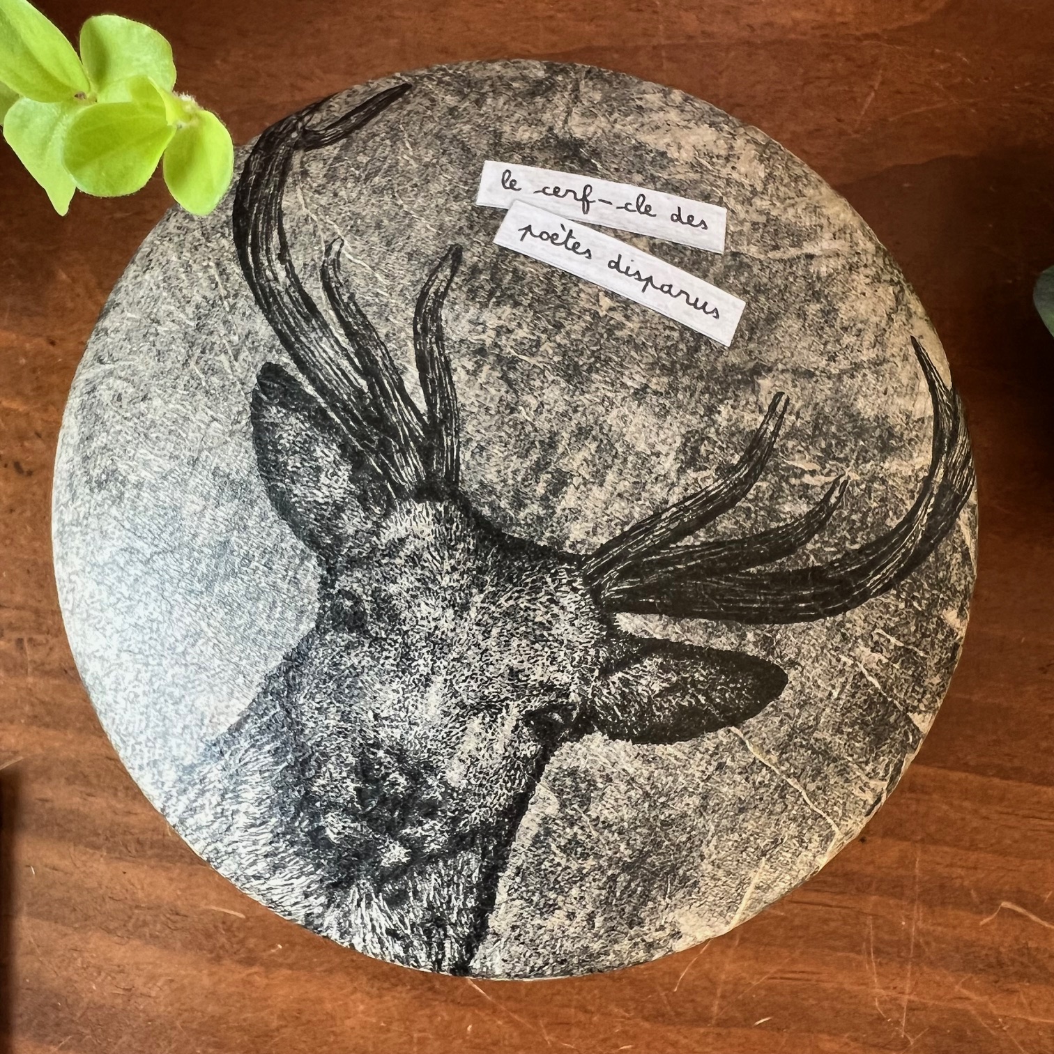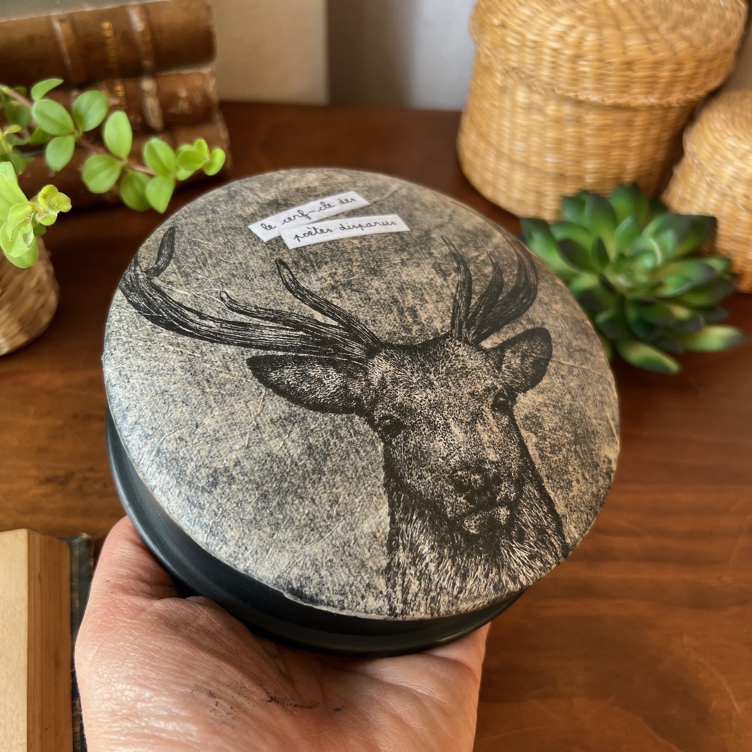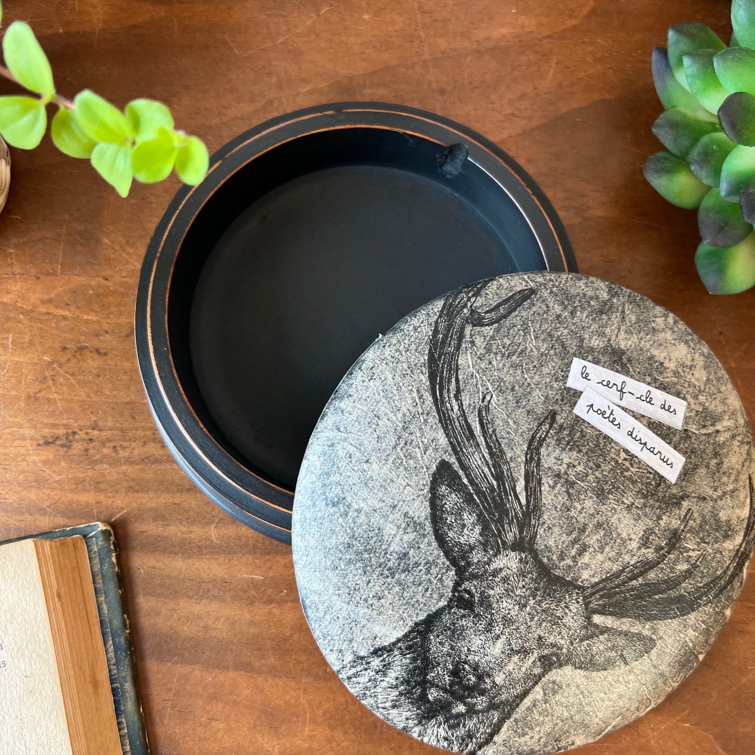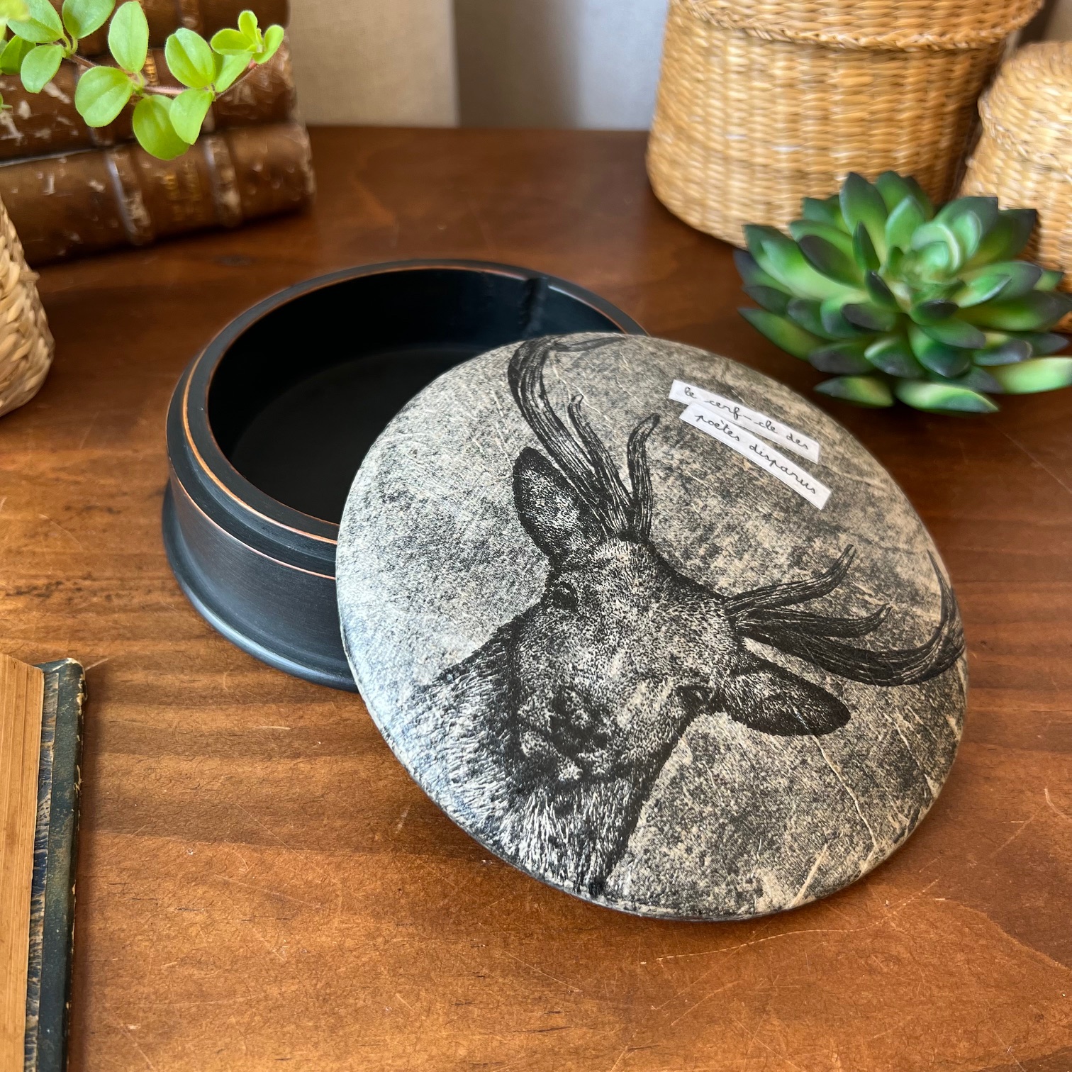 Boite ronde en bois « Le cerf-cle des poètes disparus » n°2