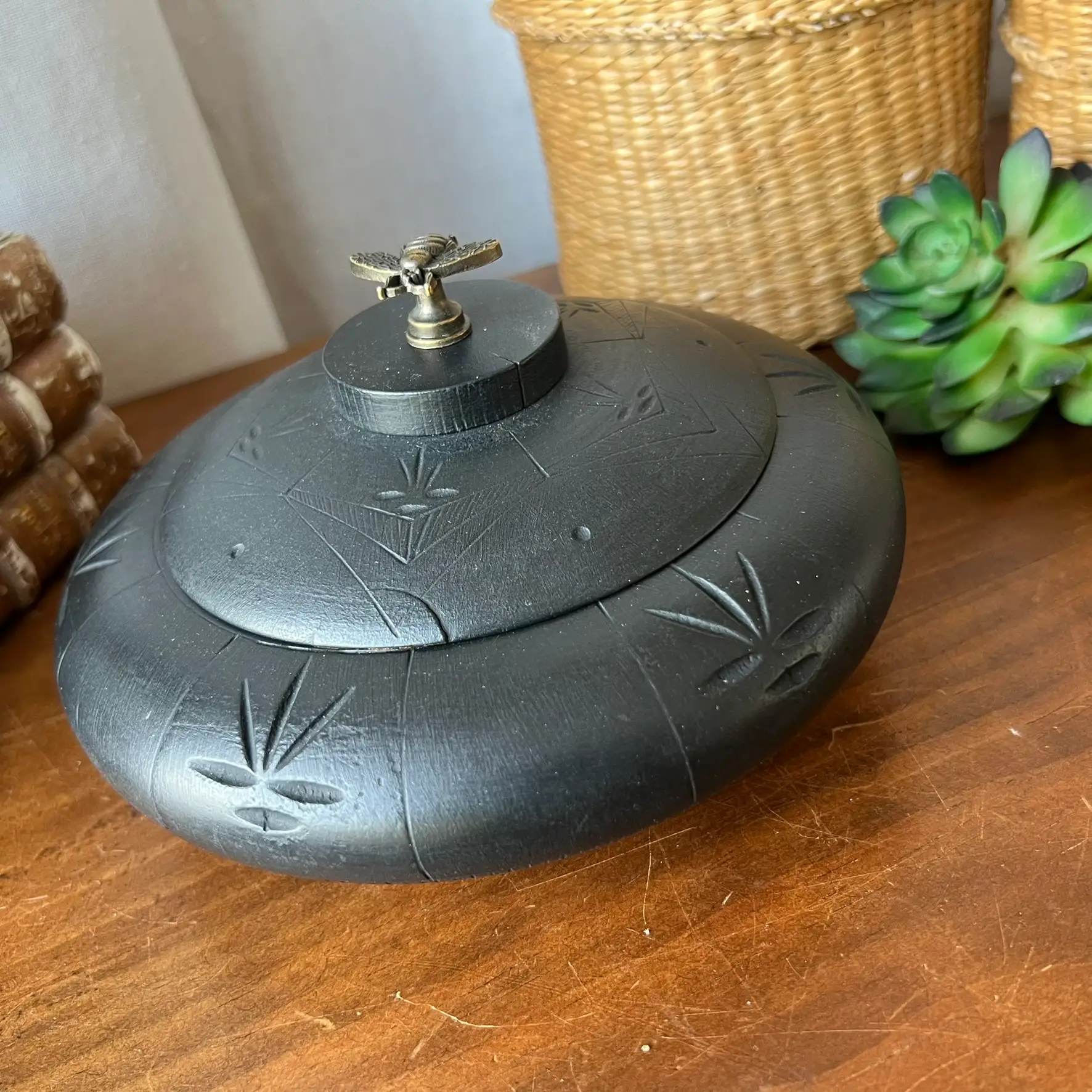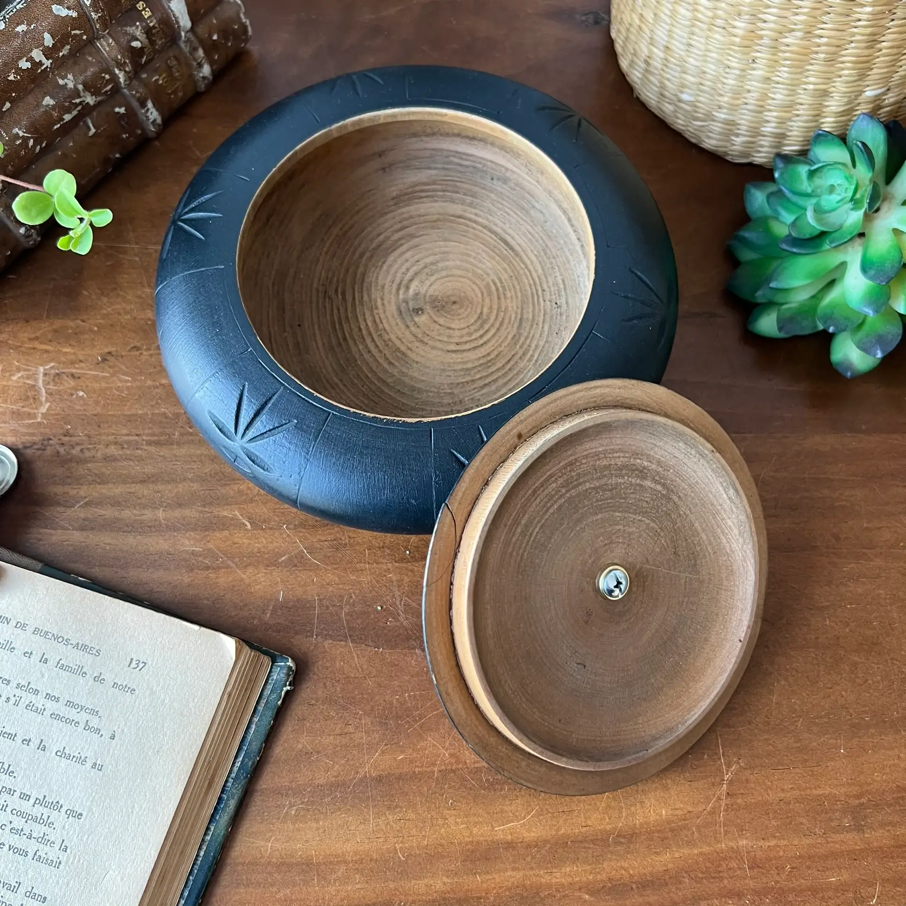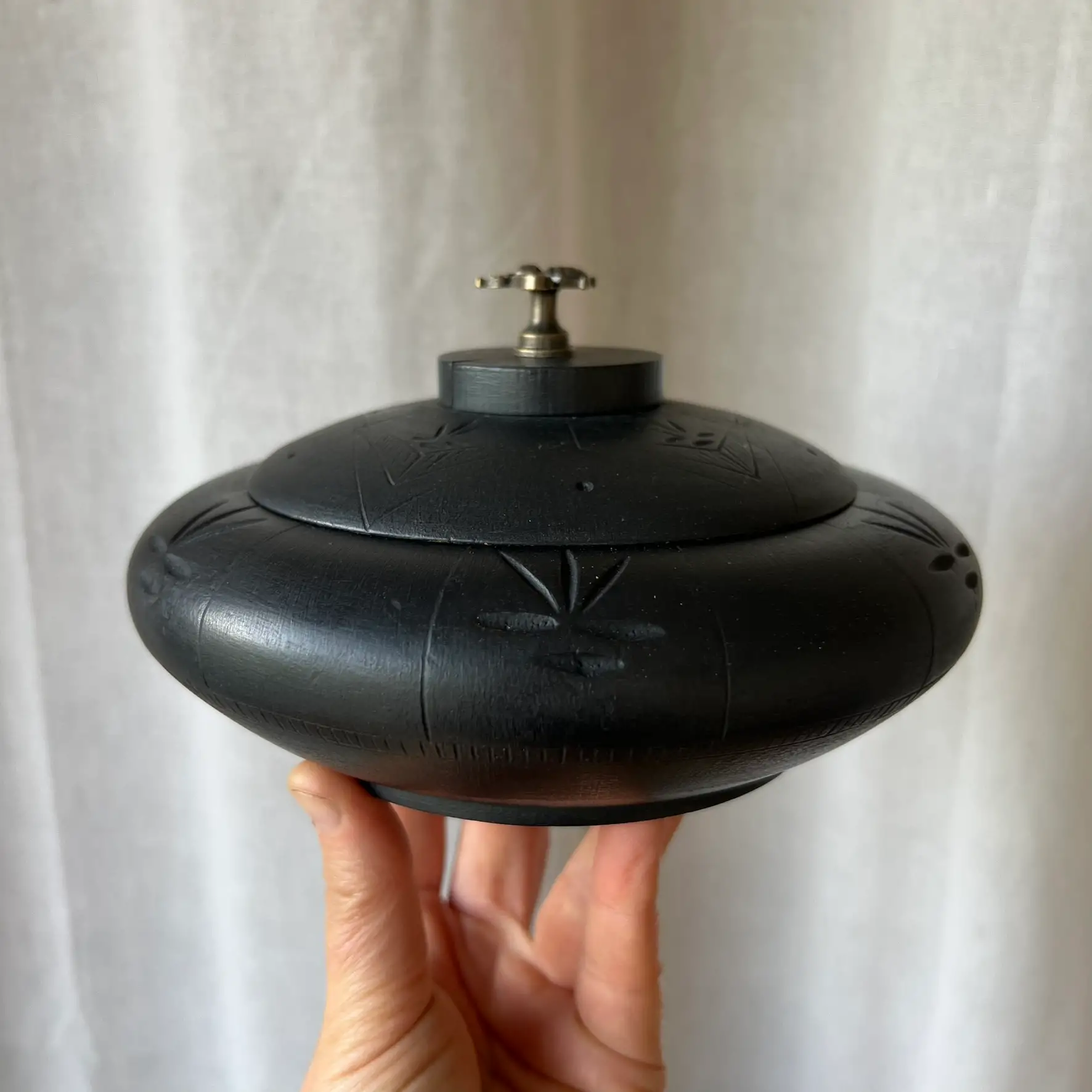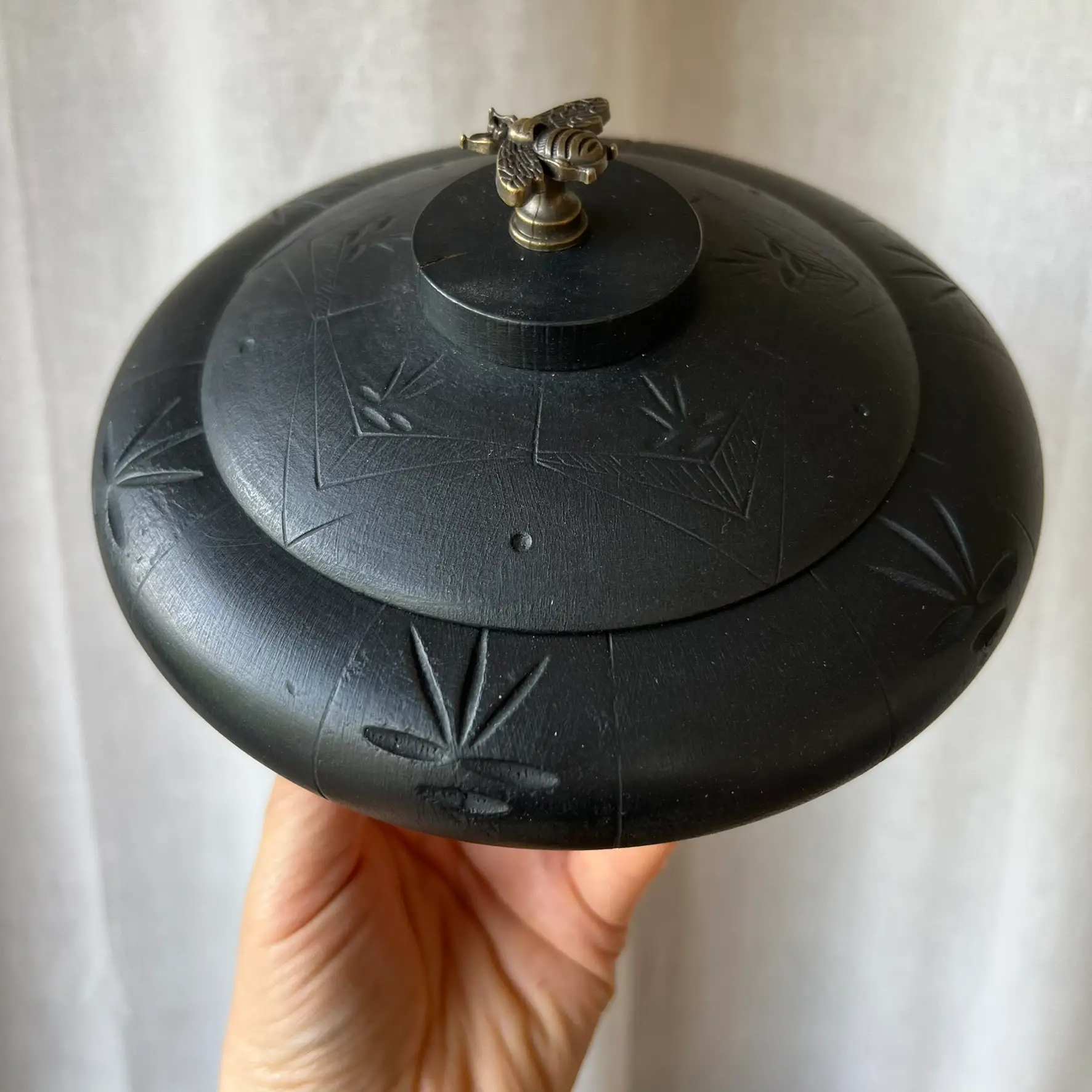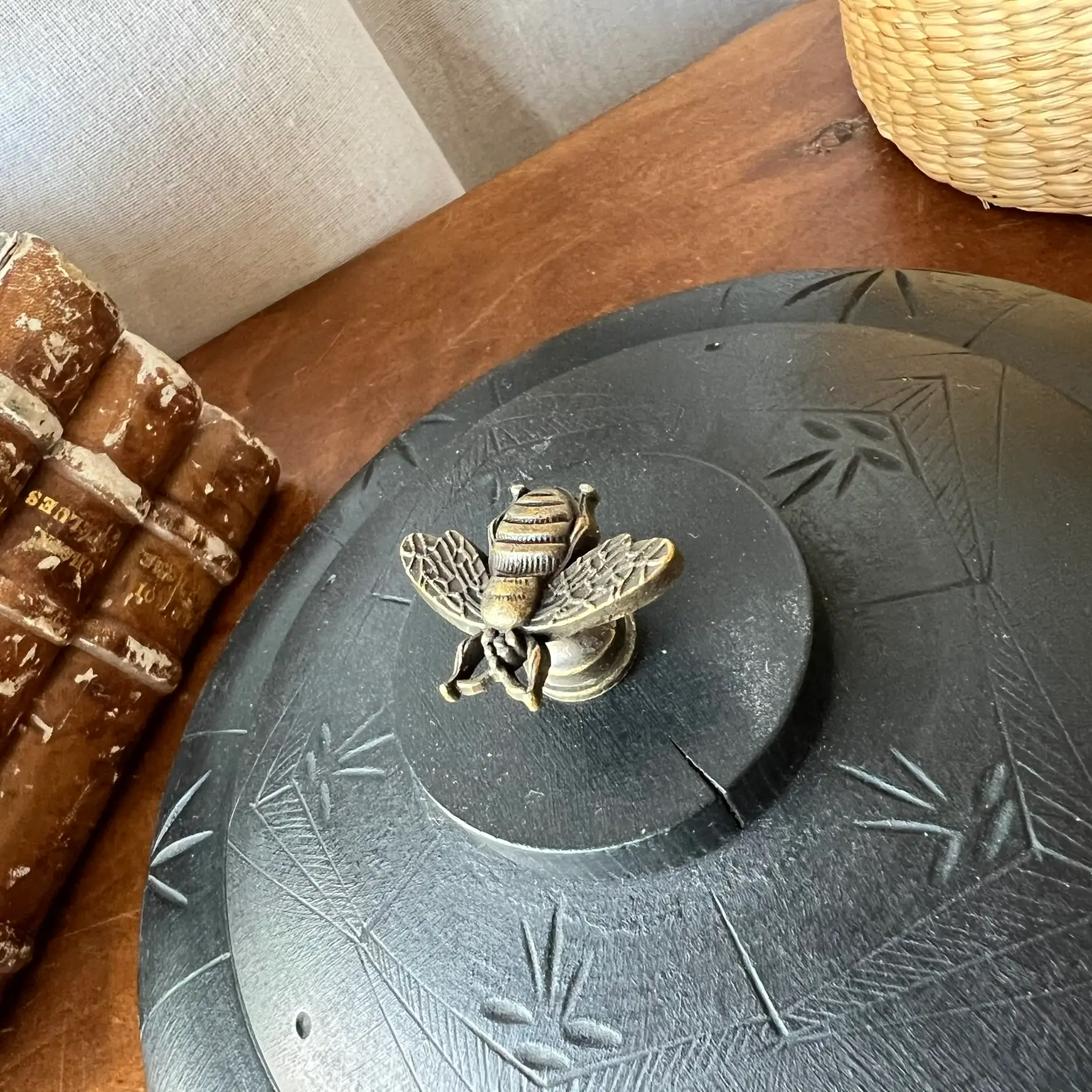 Mais j’avais envie de lui donner plus de caractère. Alors j’ai contrasté. Un extérieur noir patiné, pour la profondeur. Un intérieur laissé bois, pour la douceur. Et puis ce petit détail qui change tout… Une abeille dorée posée sur le couvercle. Comme si elle venait s’y déposer naturellement.