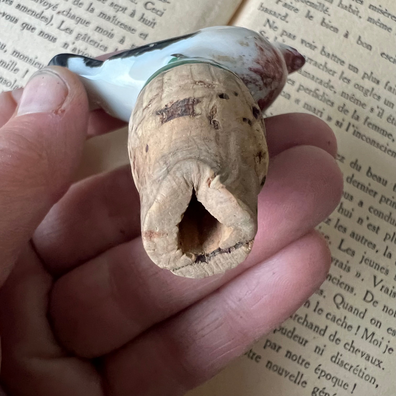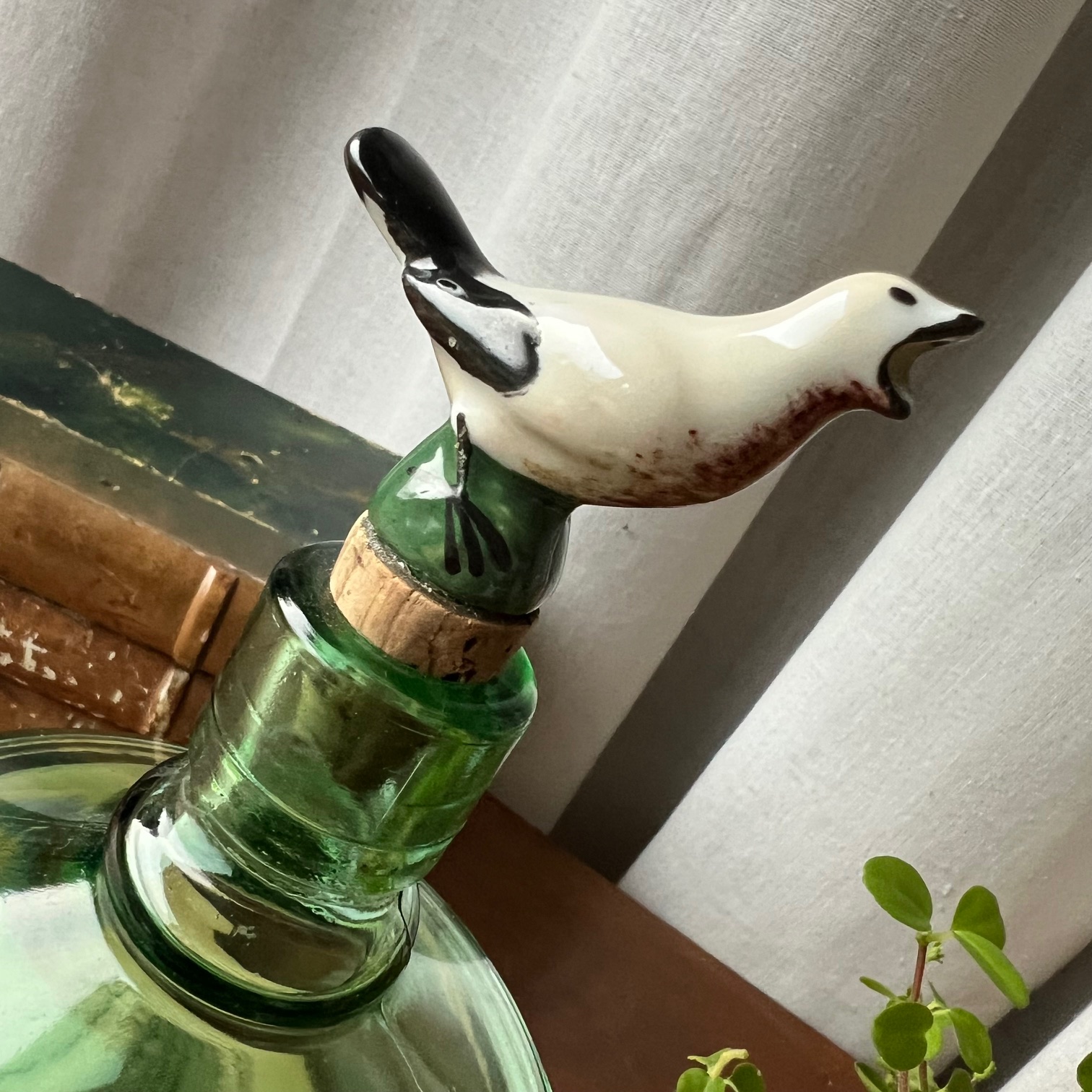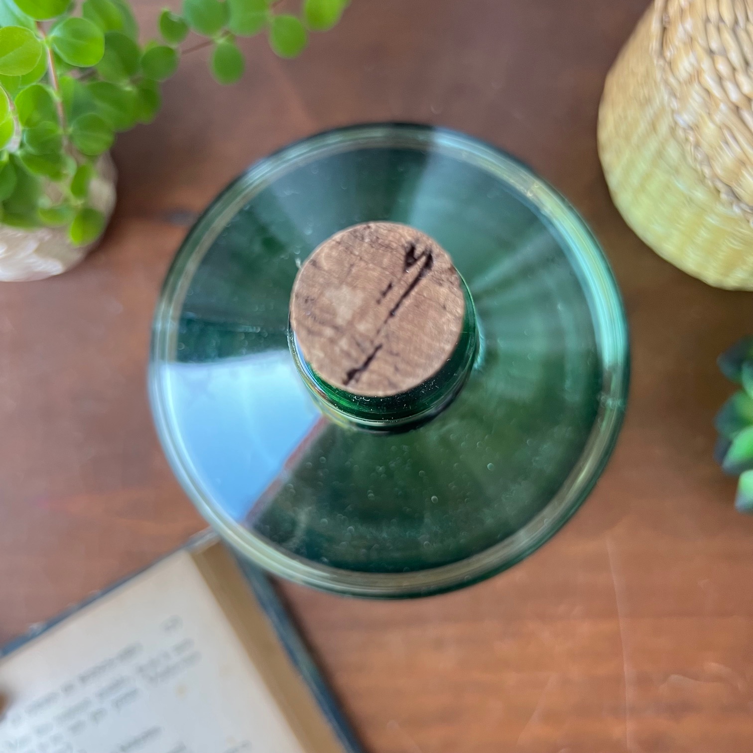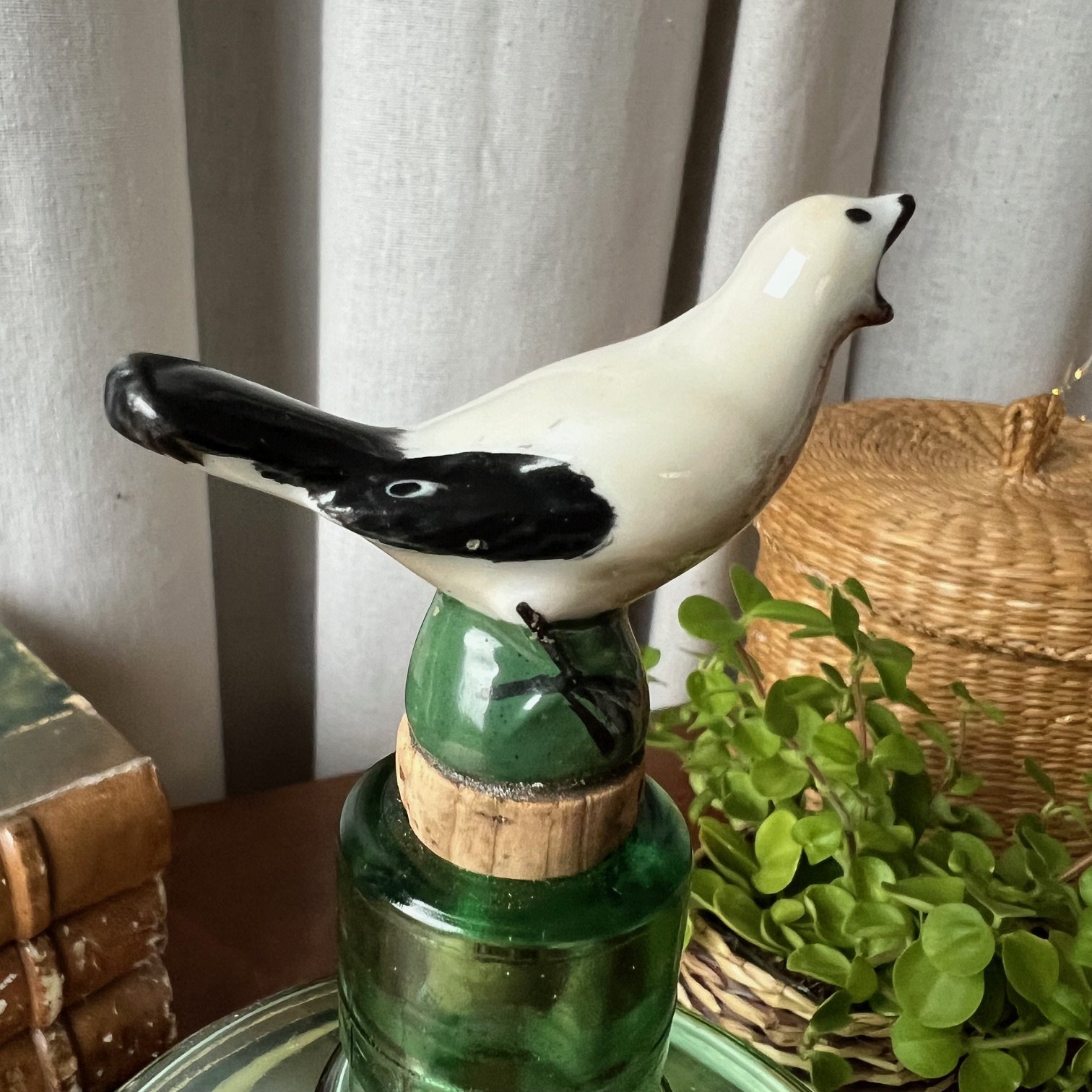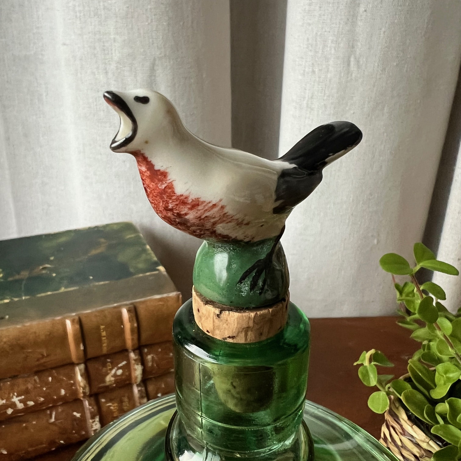 On ne résiste pas au charme de cette ancienne bouteille en verre épais, avec sa silhouette tout en rondeur et sa belle couleur verte. Et on craque pour ce bouchon doseur et verseur « oiseau » en porcelaine et liège. Un objet plein de caractère !