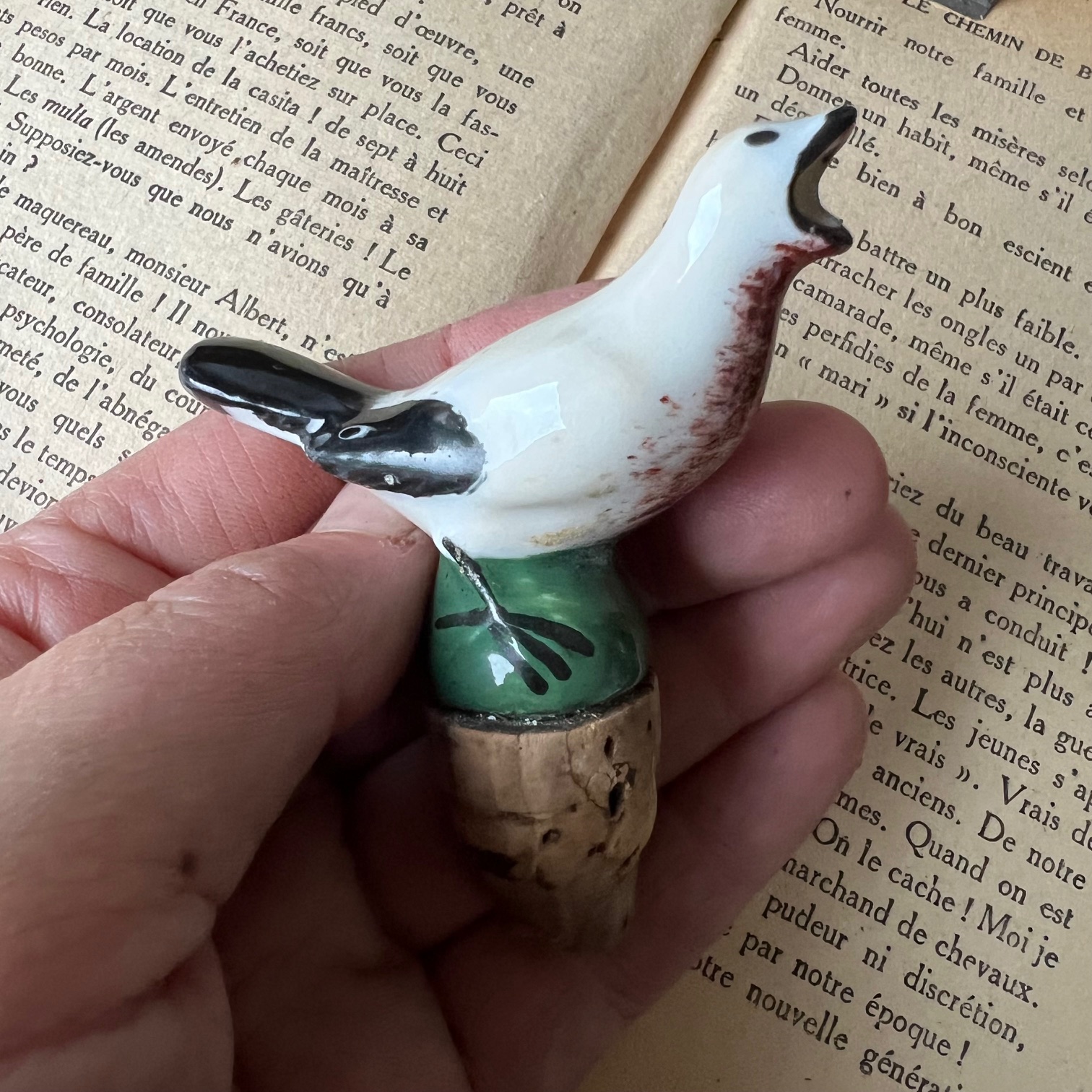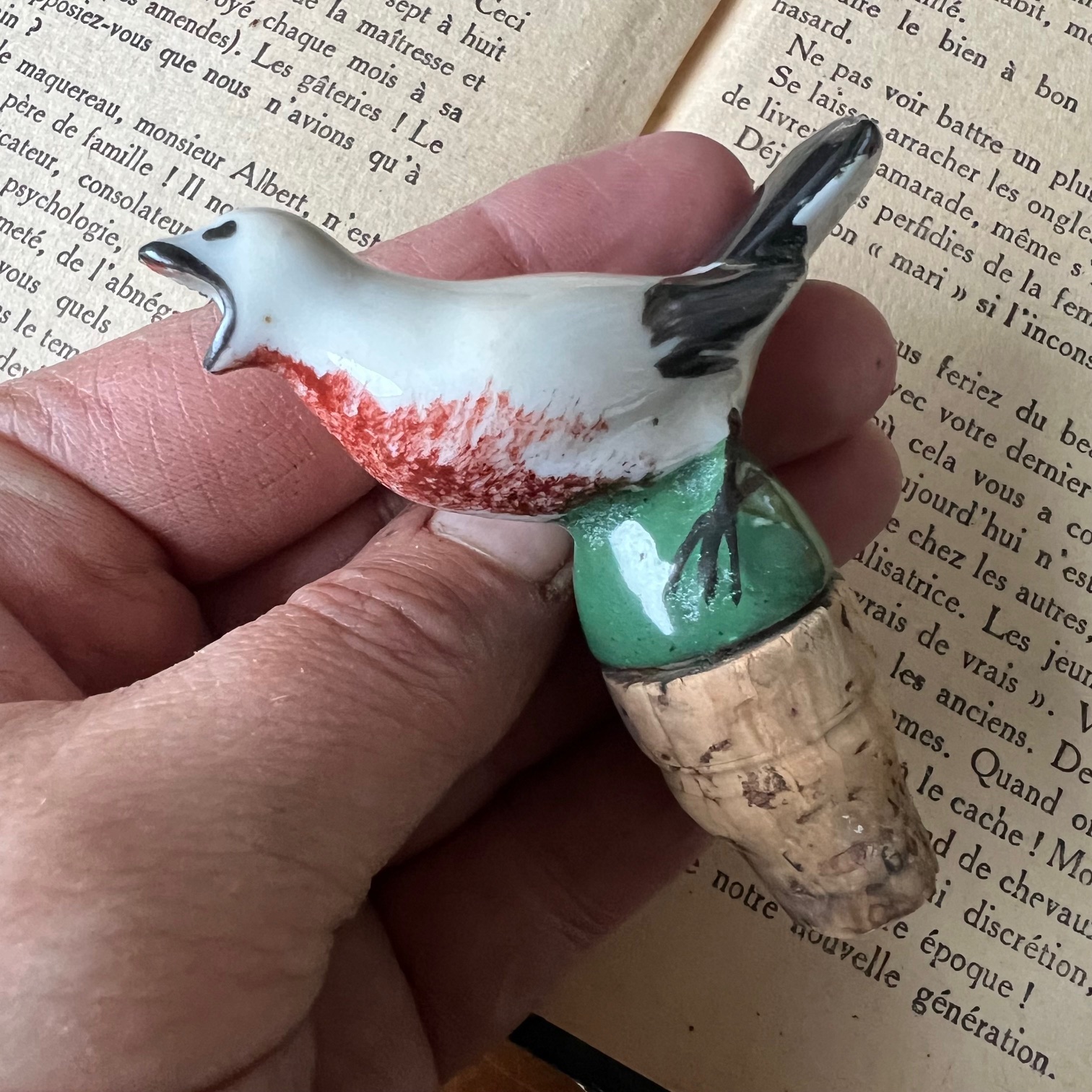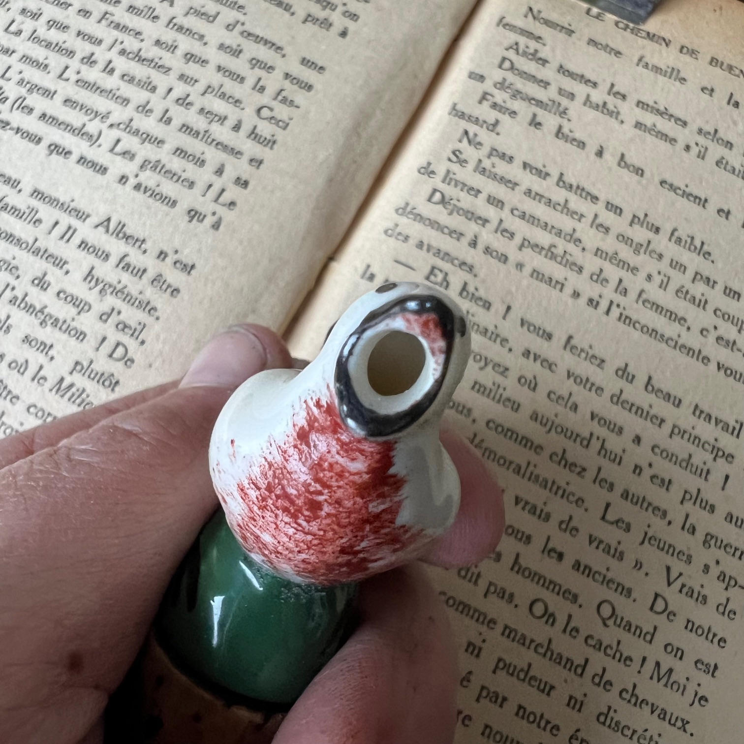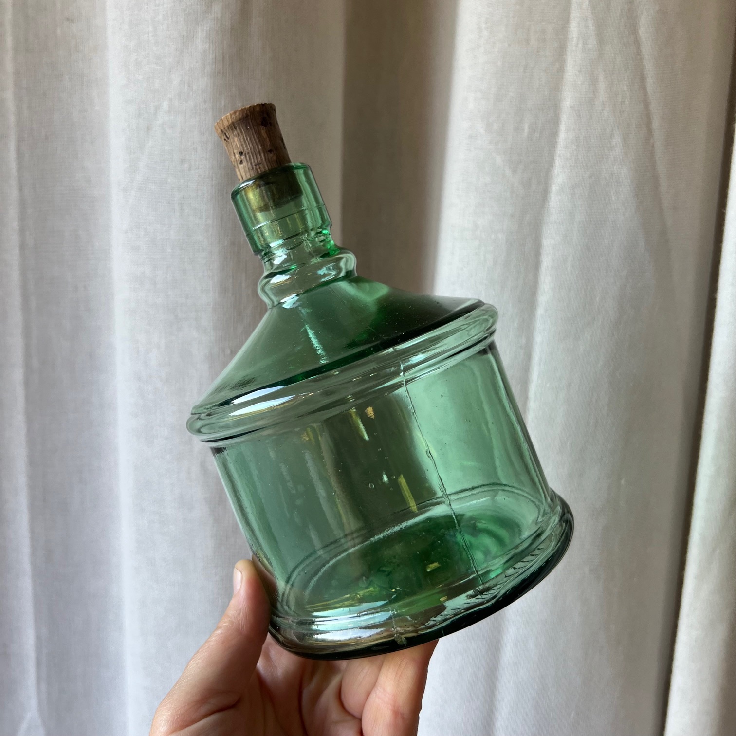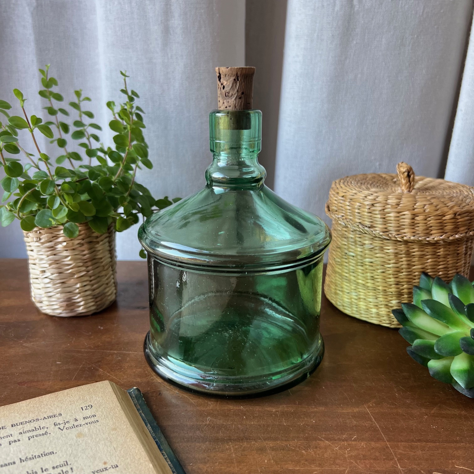 On ne résiste pas au charme de cette ancienne bouteille en verre épais, avec sa silhouette tout en rondeur et sa belle couleur verte. Et on craque pour ce bouchon doseur et verseur « oiseau » en porcelaine et liège. Un objet plein de caractère !