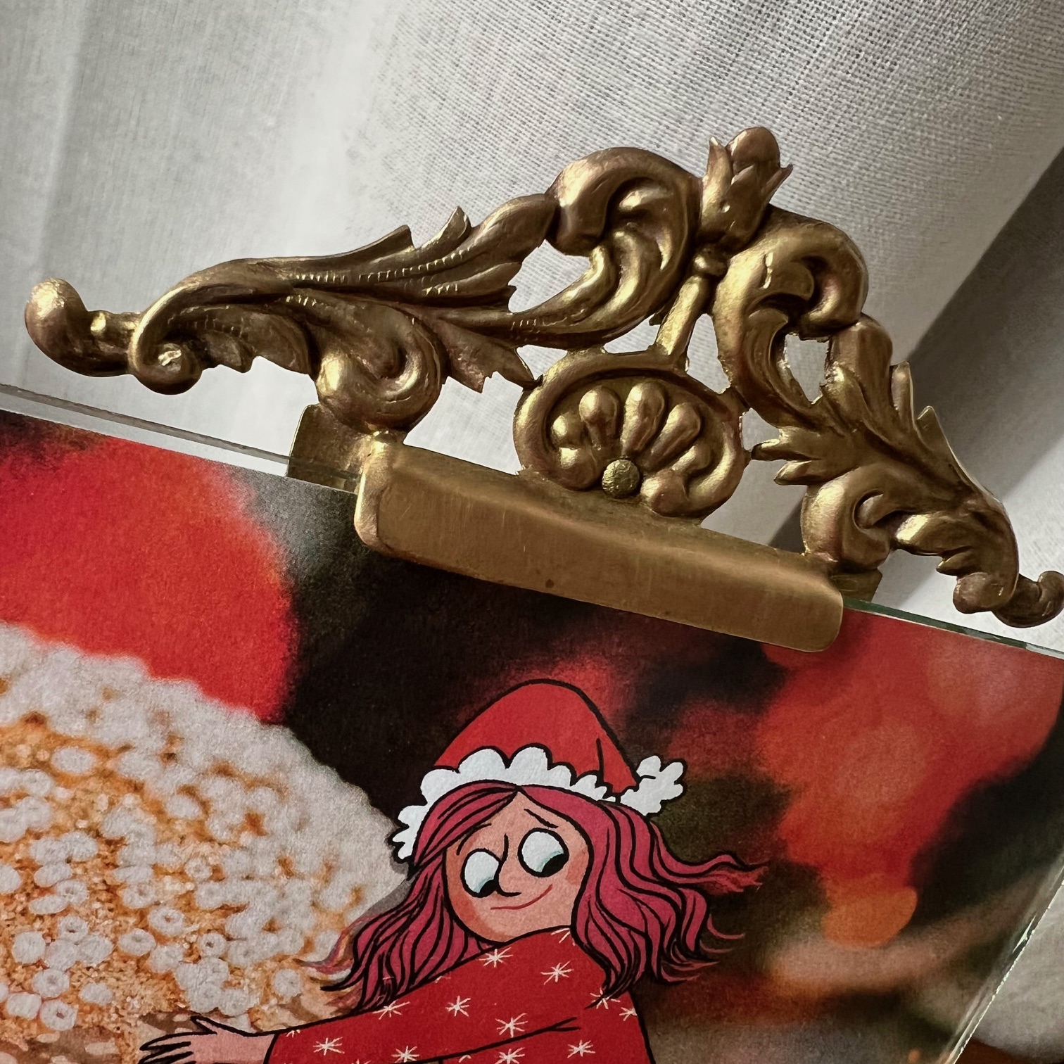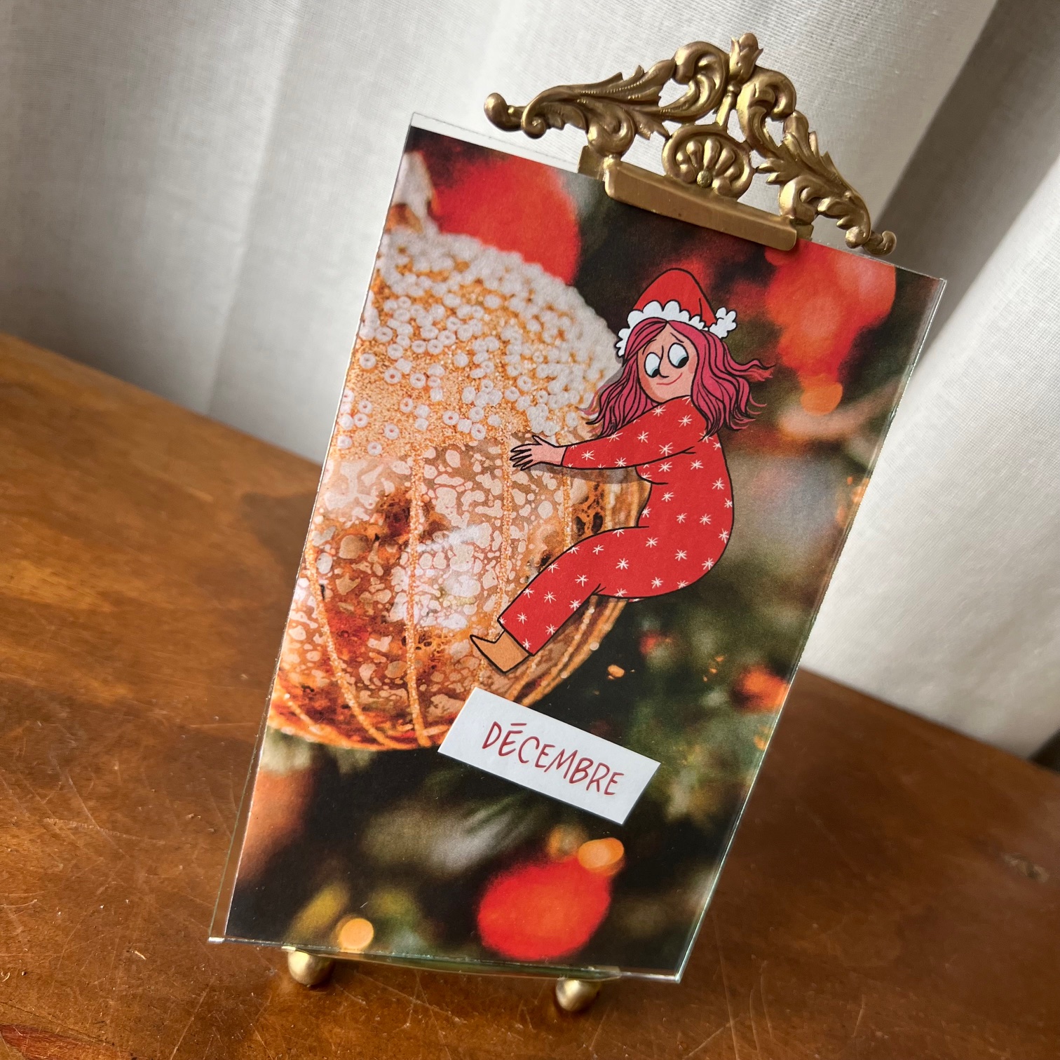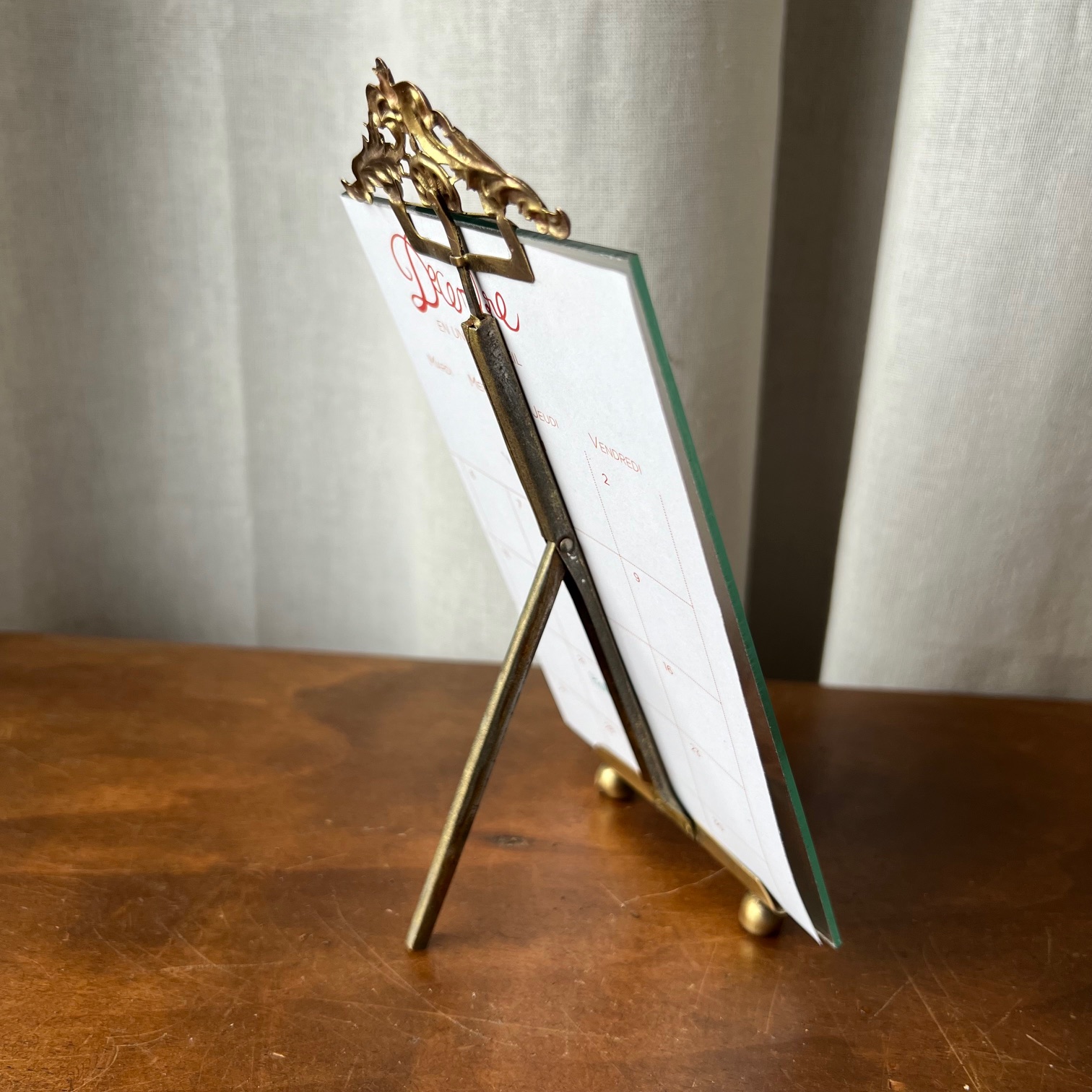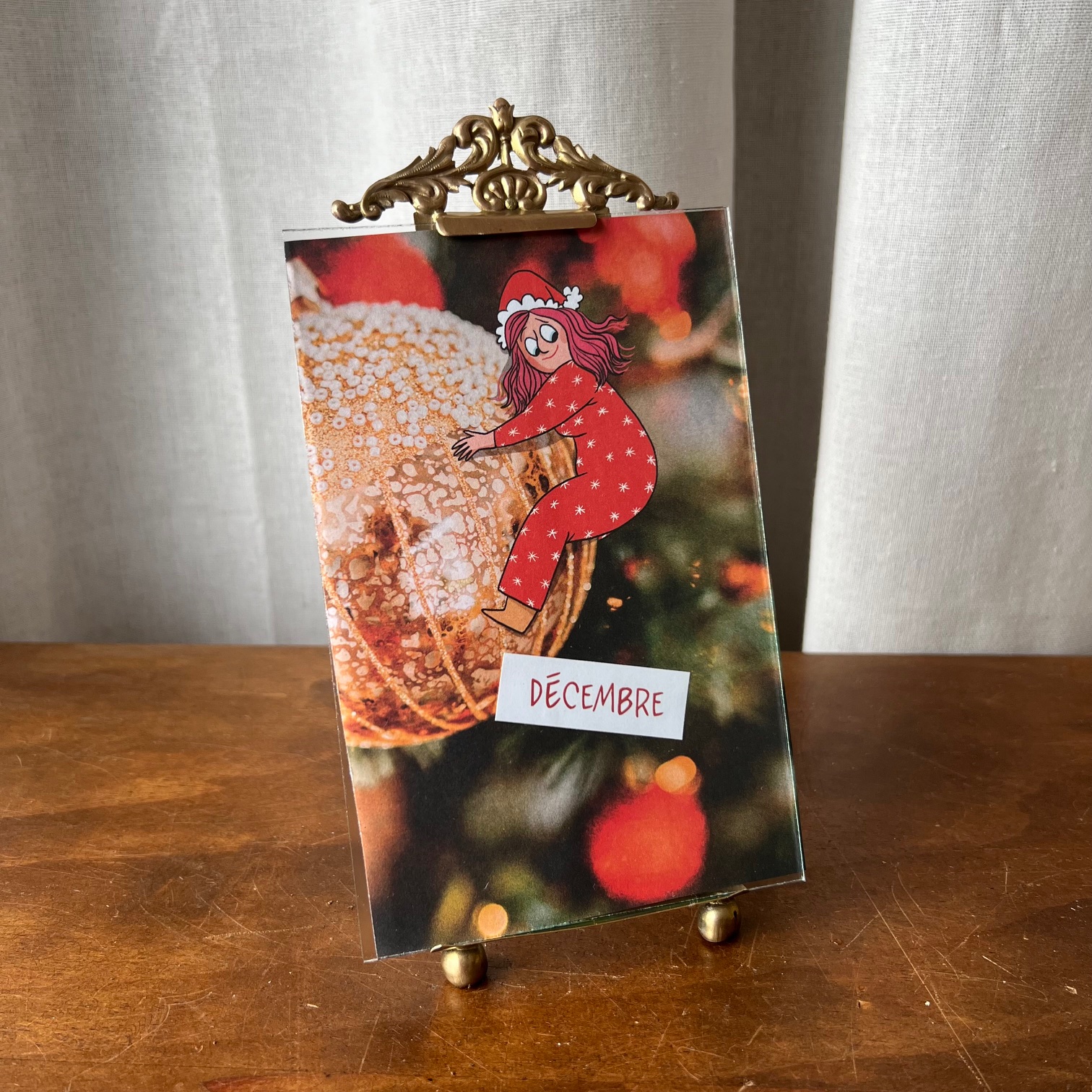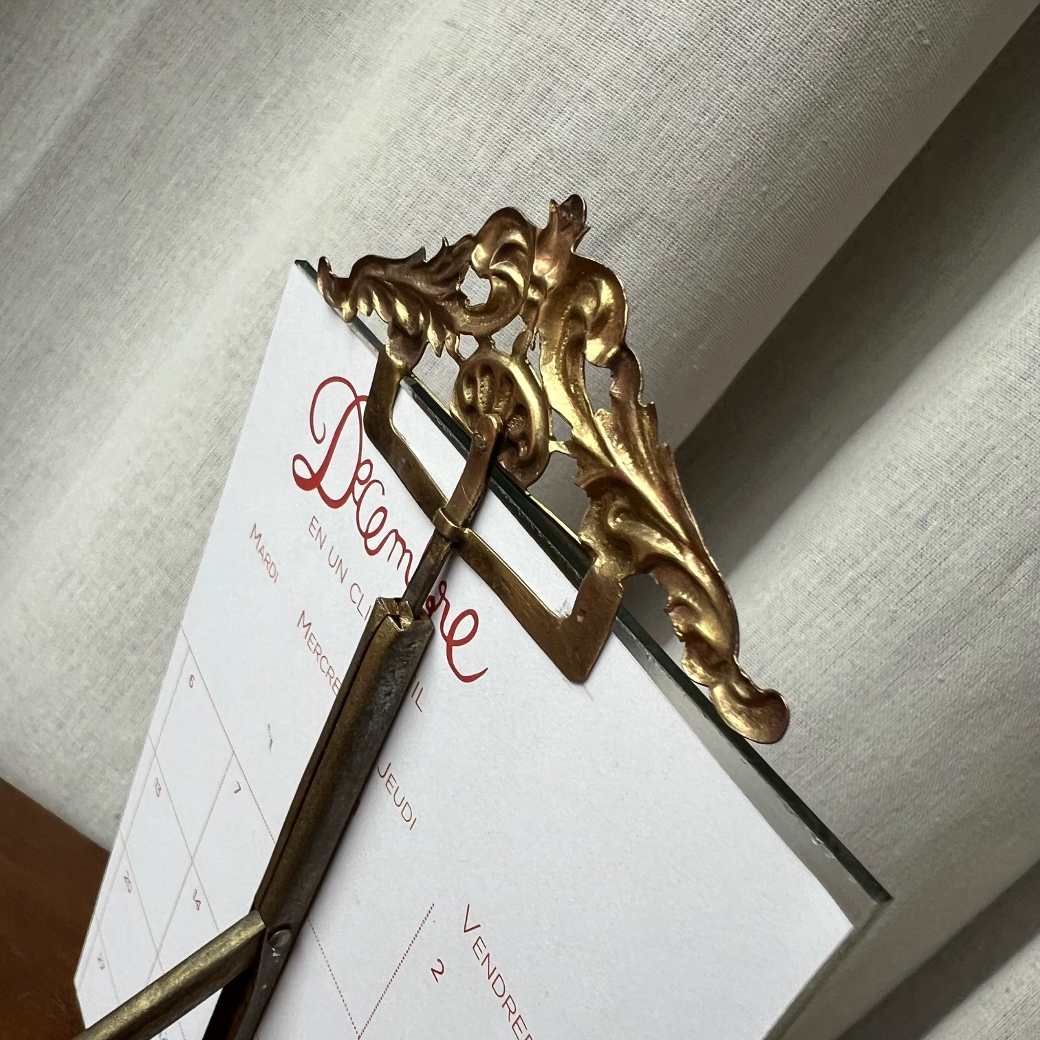 Coup de cœur pour cet ancien cadre à poser avec son fronton travaillé en laiton et ses pieds « boule ». On aime sa jolie patine dorée ! Son verre biseauté d’origine – très abîmé – a été remplacé par un verre sans reflet. Et en attendant de glisser votre plus beau cliché, j’ai inséré une illustration de saison de la talentueuse et pétillante Mathou.