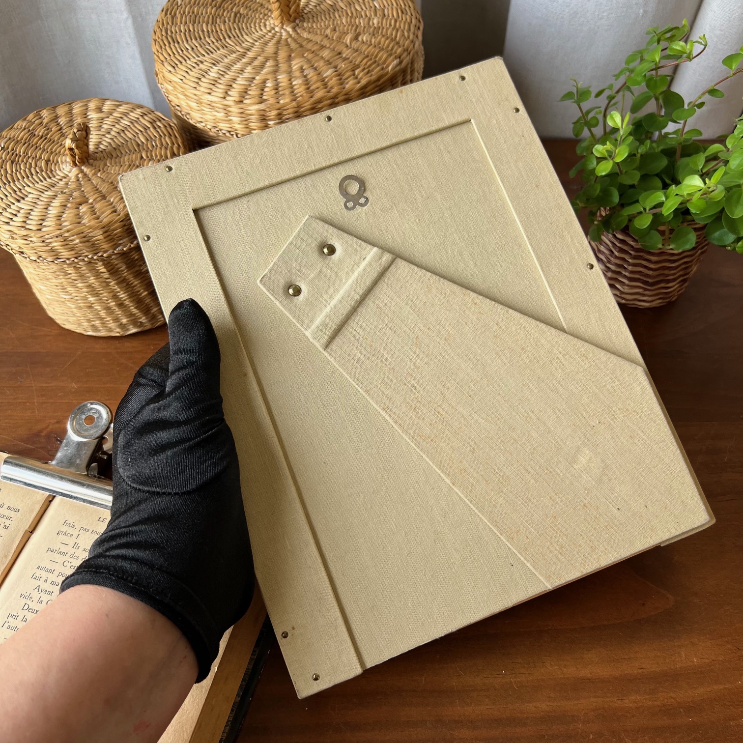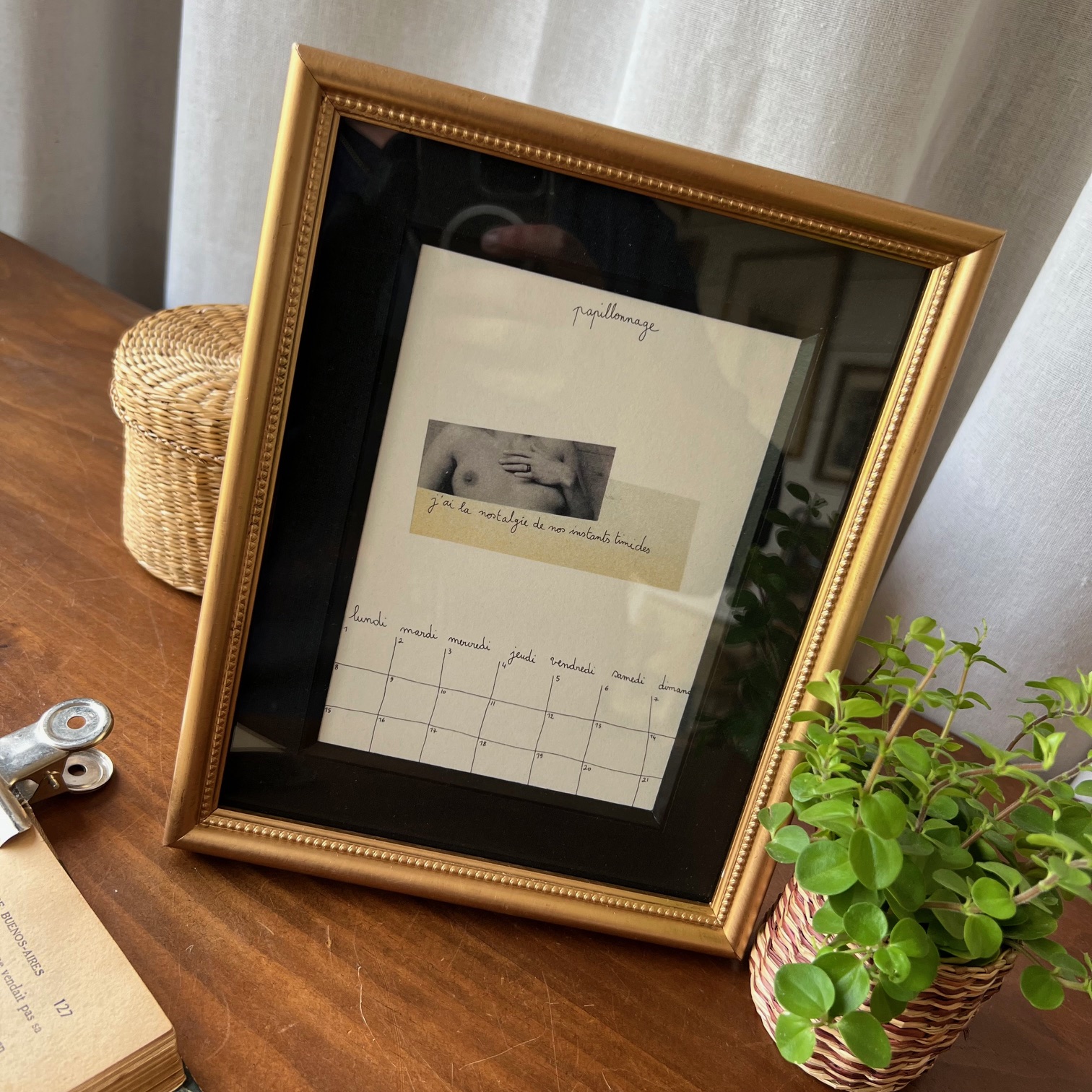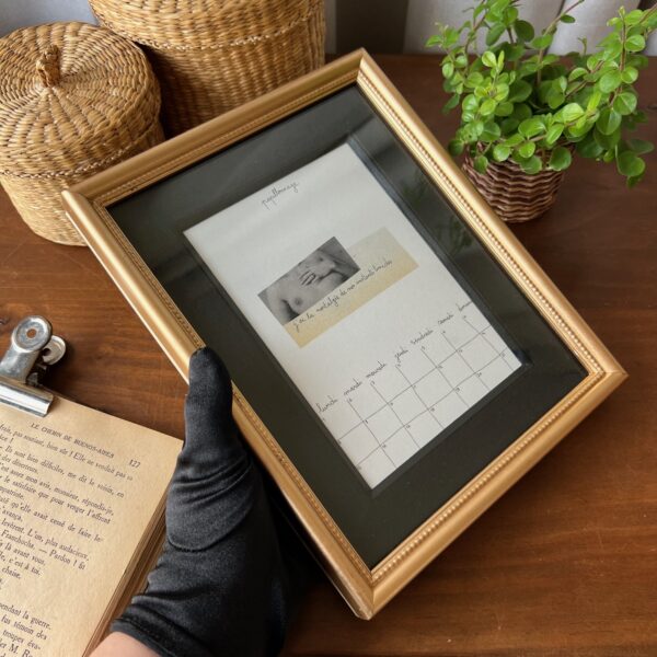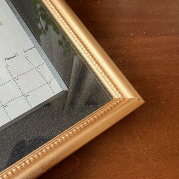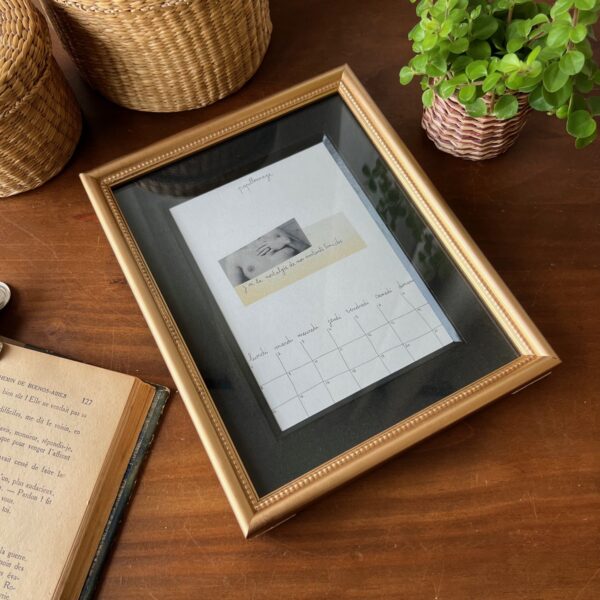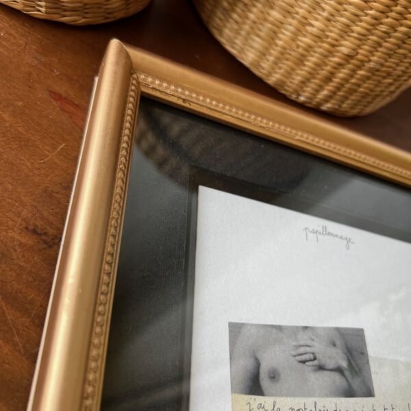 Coup de cœur pour ce cadre ancien, charmant à souhait, prêt à accueillir votre plus jolie photo… En attendant, les mots poétiques de « Papillonnage » l’accompagnent. On aime l’alliance du doré de l’encadrement et du passe-partout noir. En bel état !