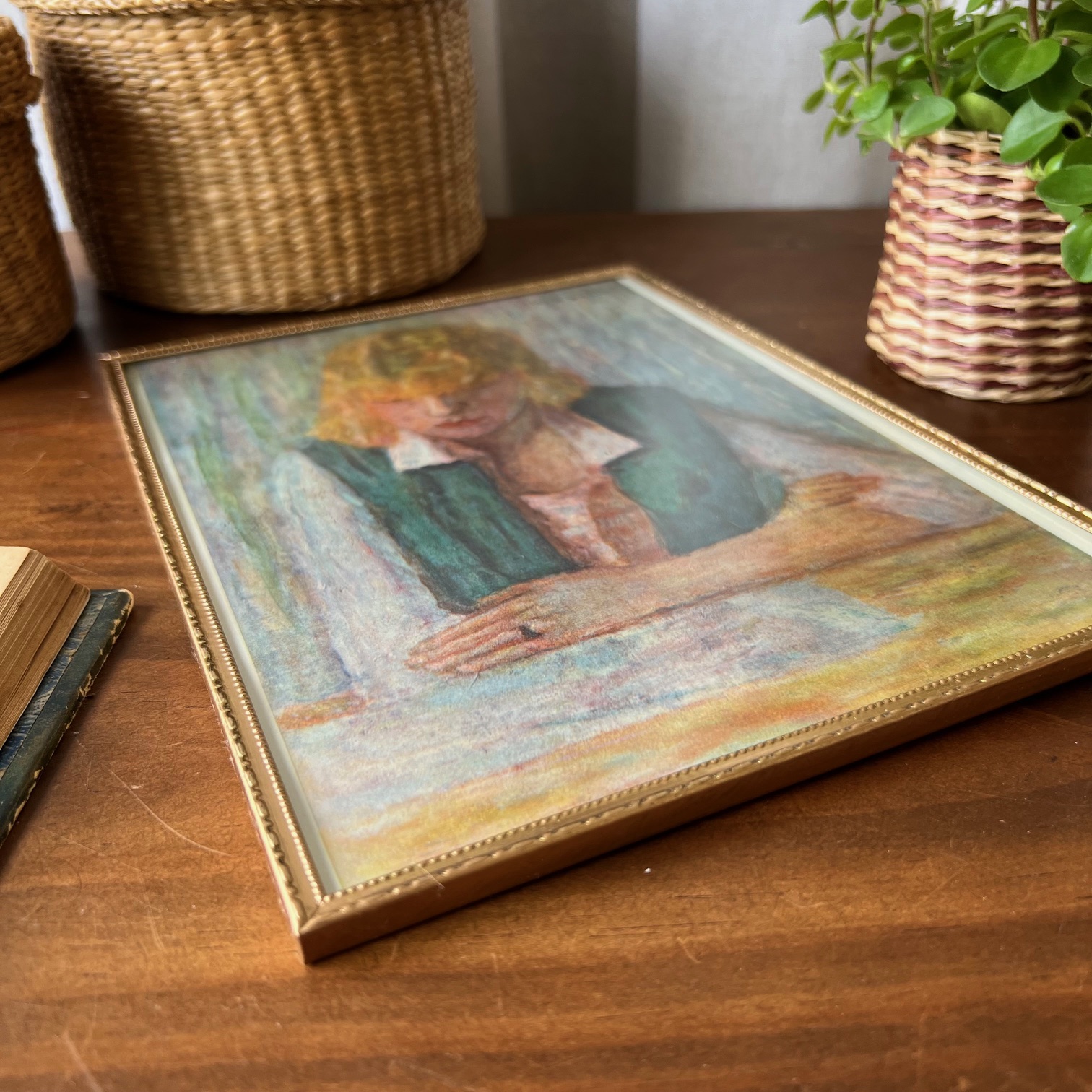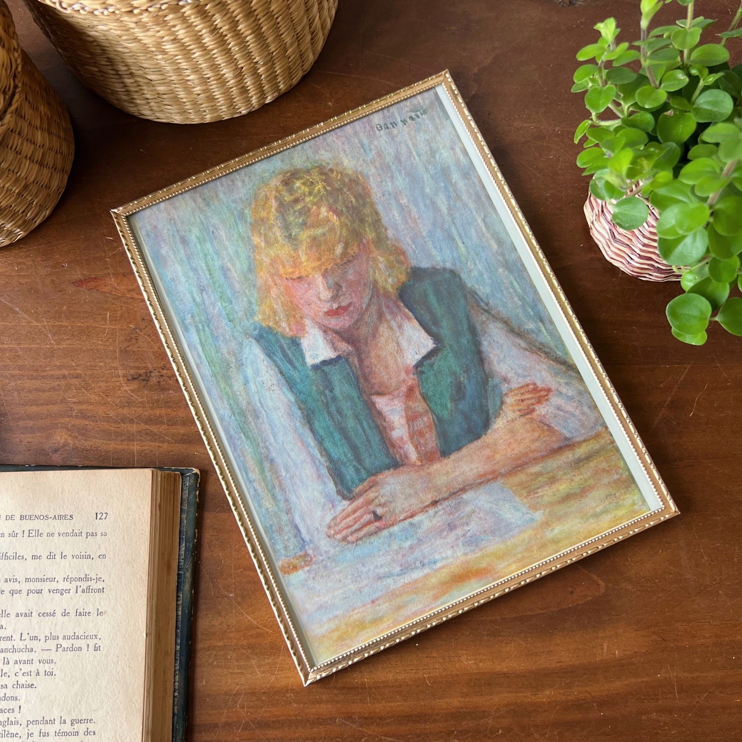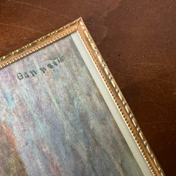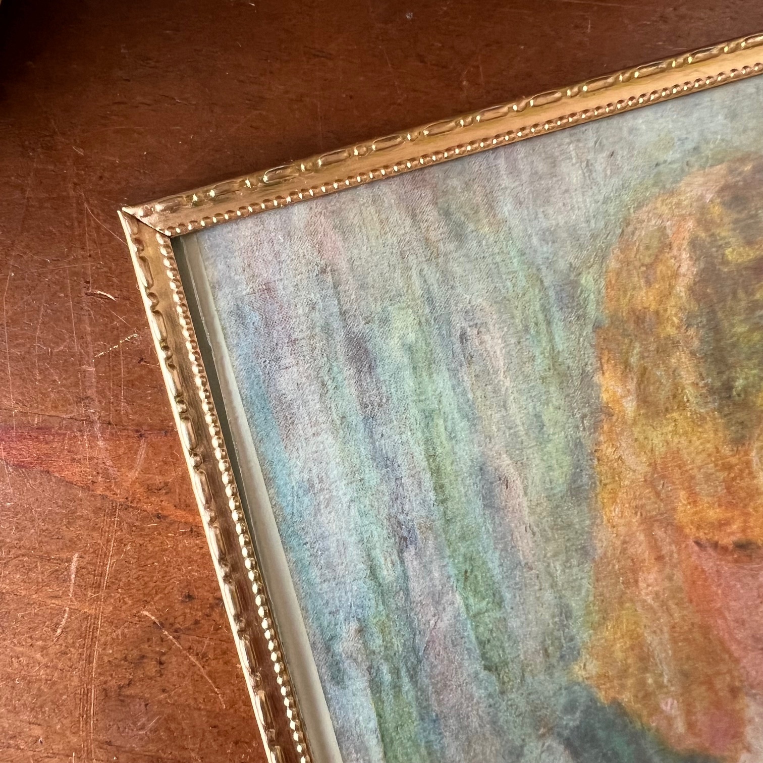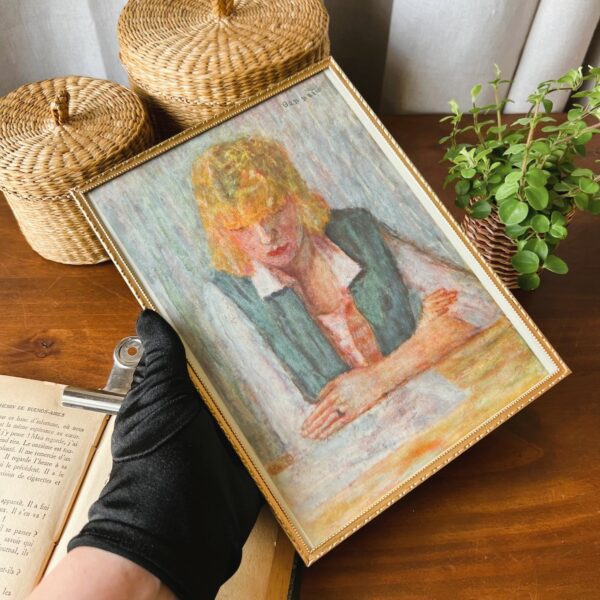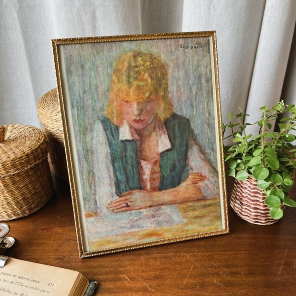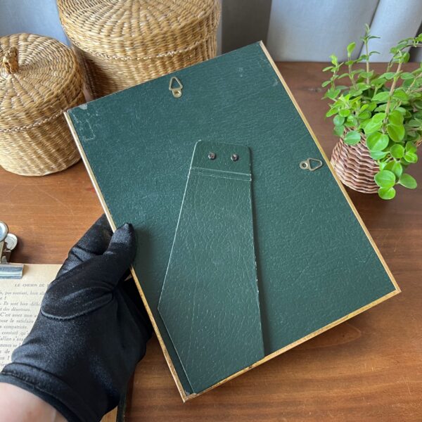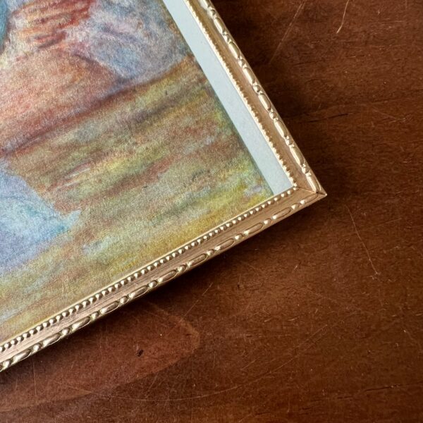 Joli cadre vintage en métal redoré à accrocher. Le verre – sans reflet – est en bel état. Idéal pour mettre en lumière votre plus belle photo ! Dans l’attente, j’y ai glissé une illustration du peintre intimiste Pierre Bonnard. A poser ou à accrocher.