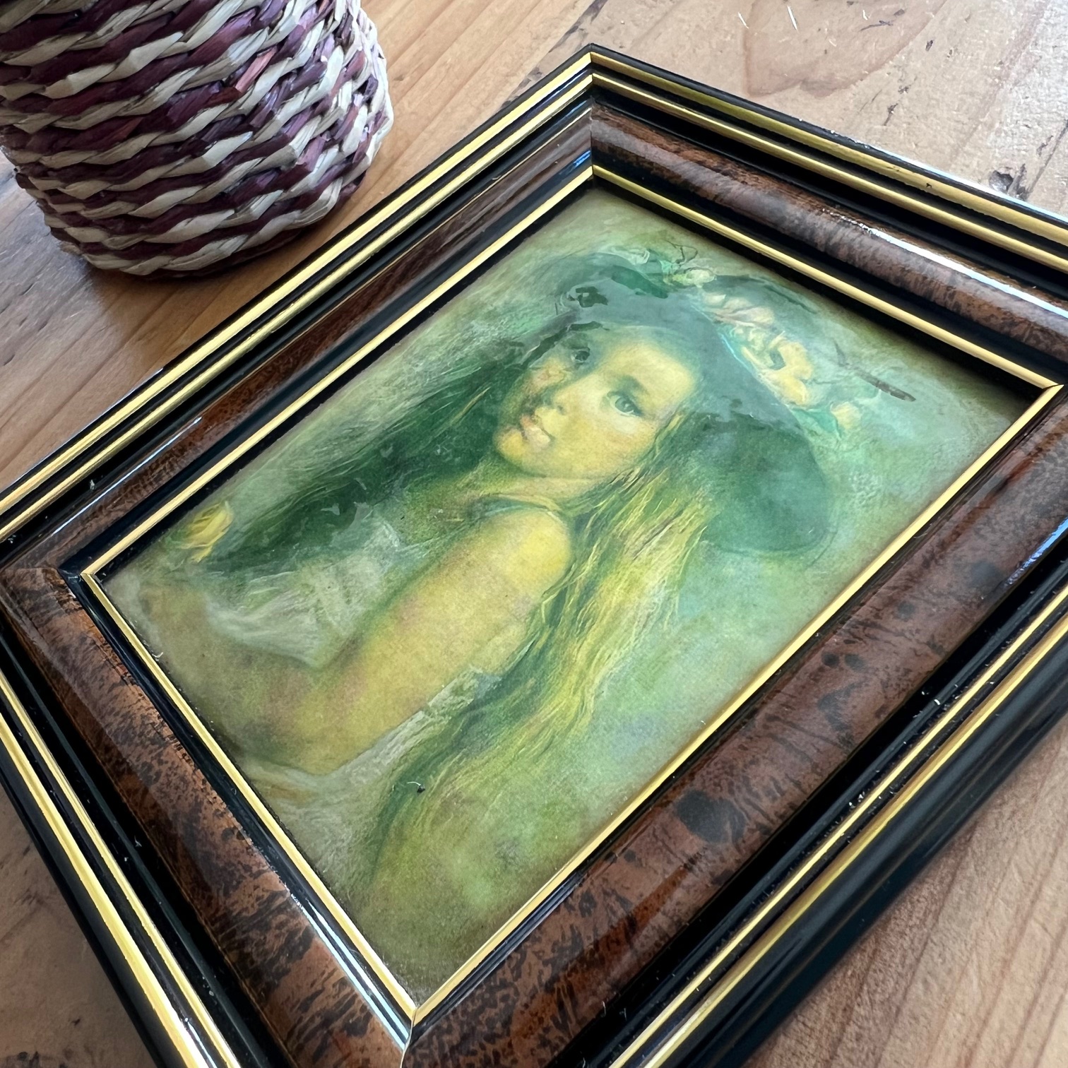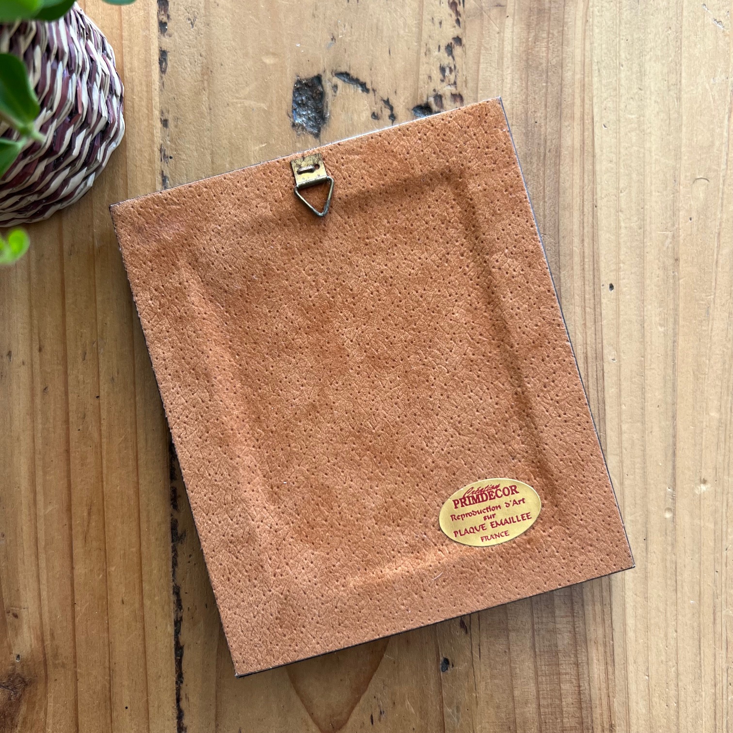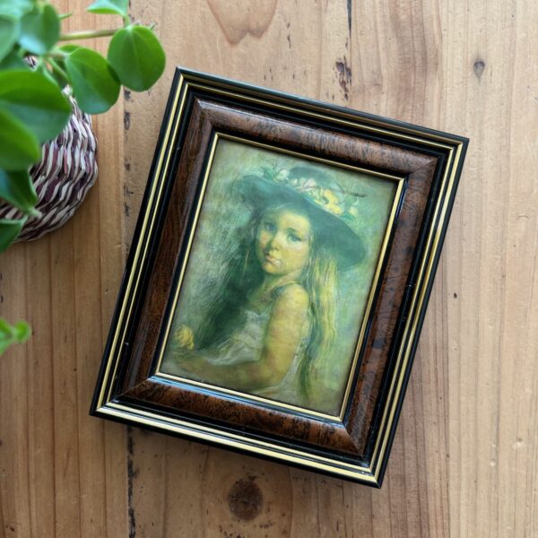 Joli petit cadre avec plaque en émail, reproduction d’art représentant une fillette. Encadrement en bel état, étiquette d’origine et accroche au dos. En bel état ! Charmant à souhait.