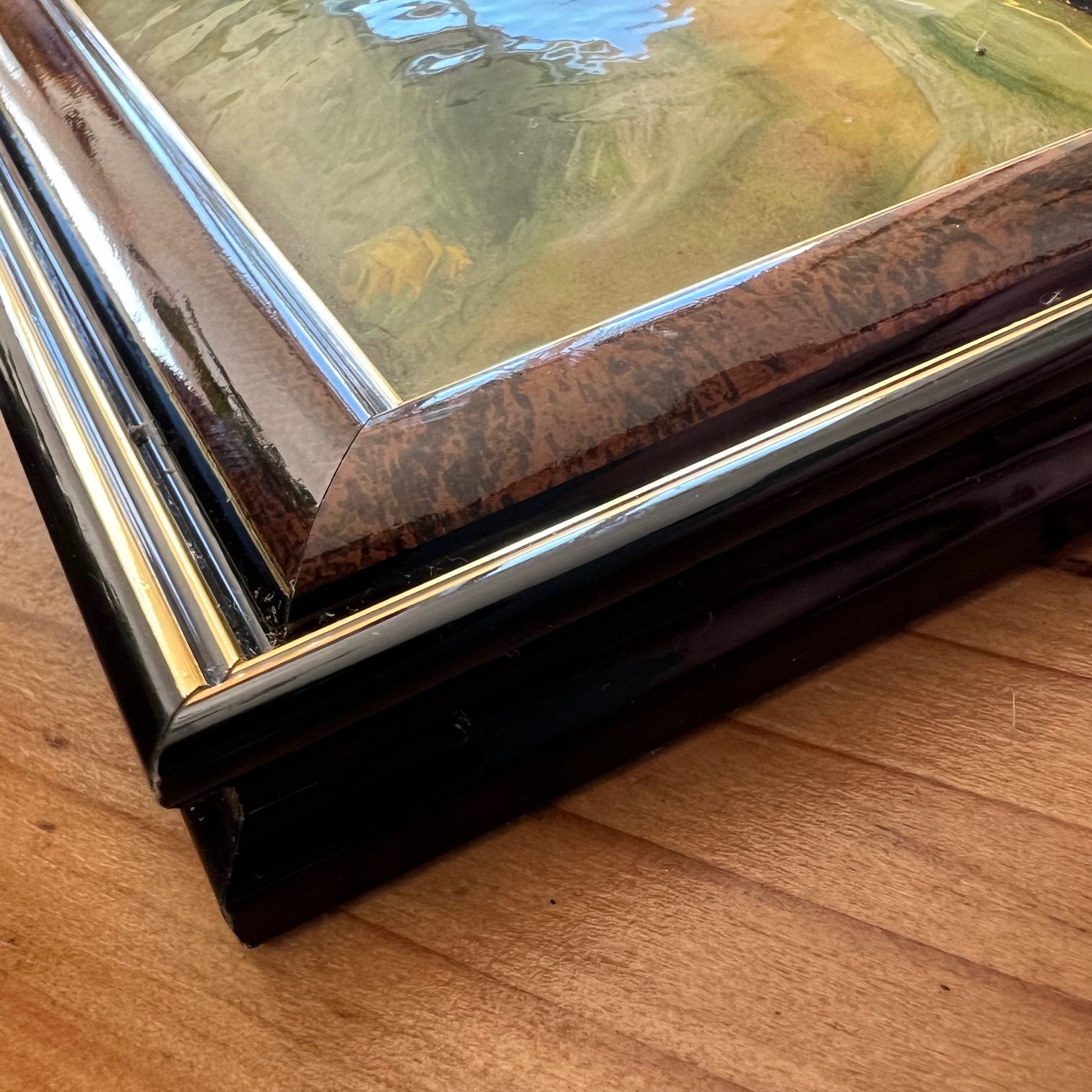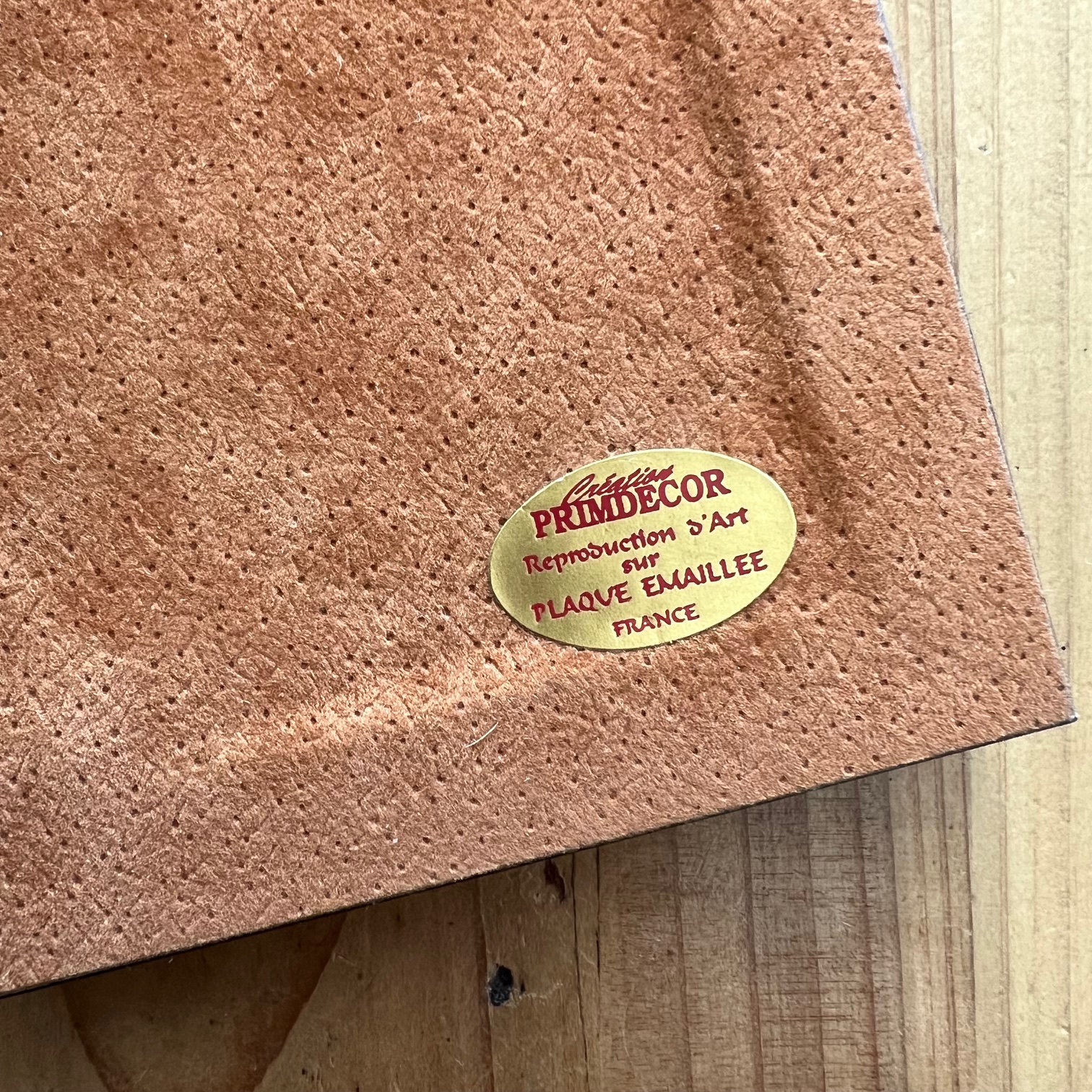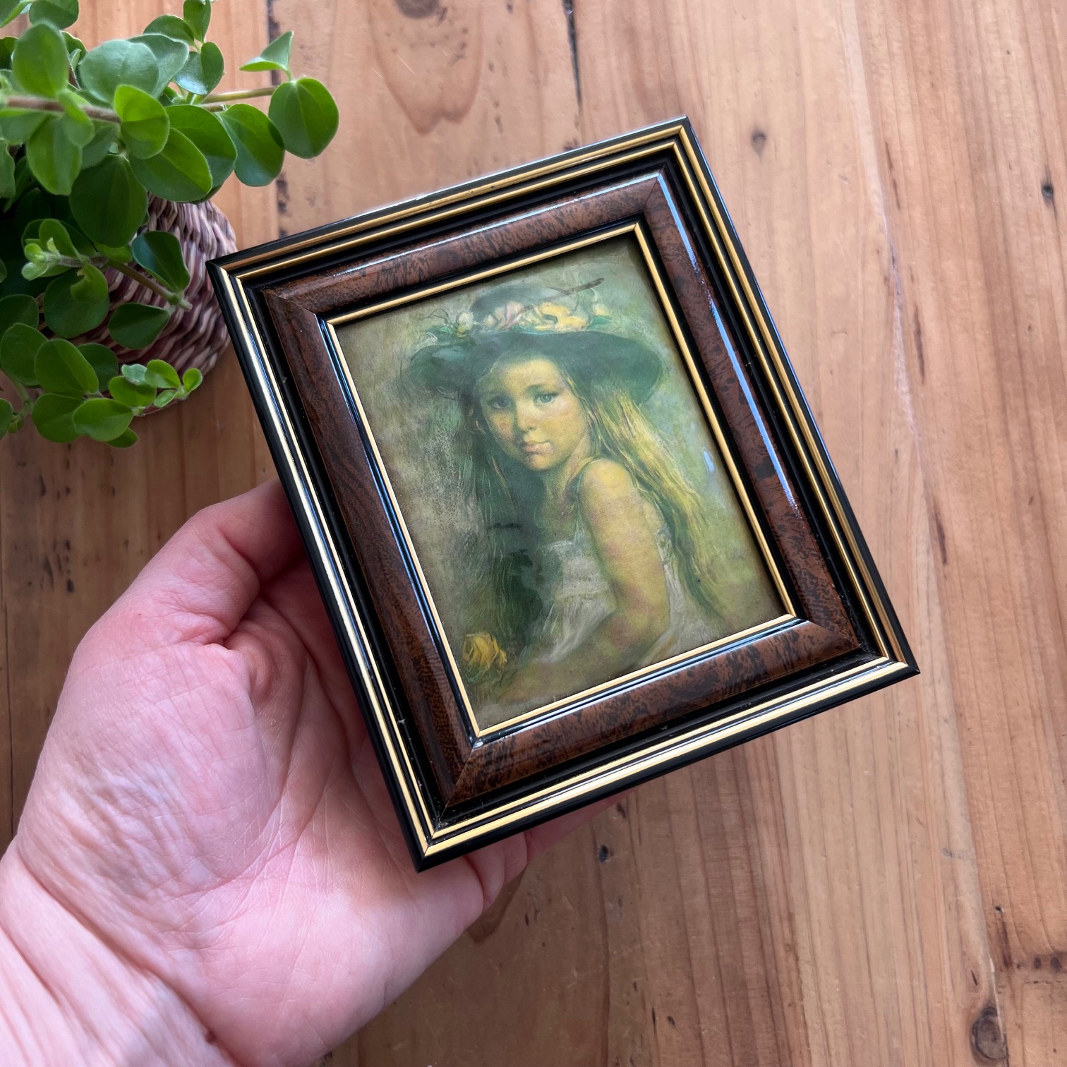 Joli petit cadre avec plaque en émail, reproduction d’art représentant une fillette. Encadrement en bel état, étiquette d’origine et accroche au dos. En bel état ! Charmant à souhait.