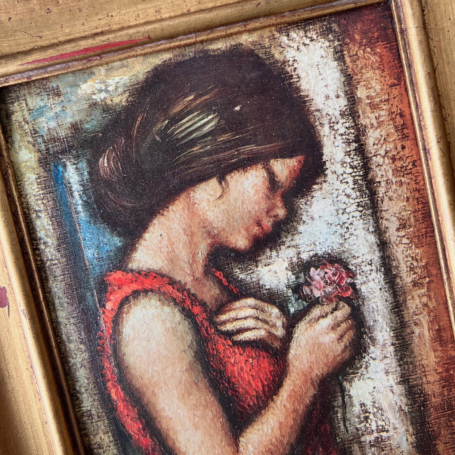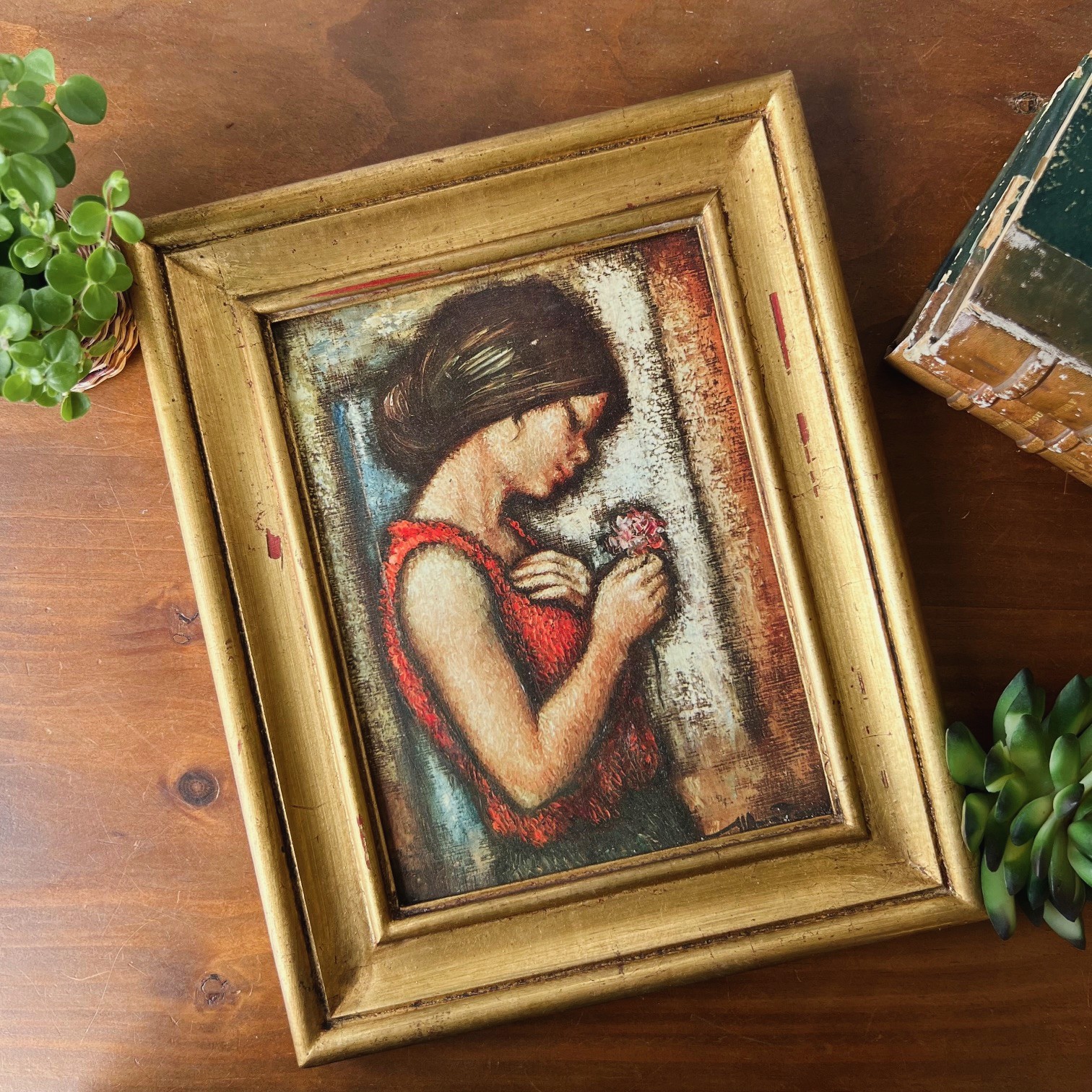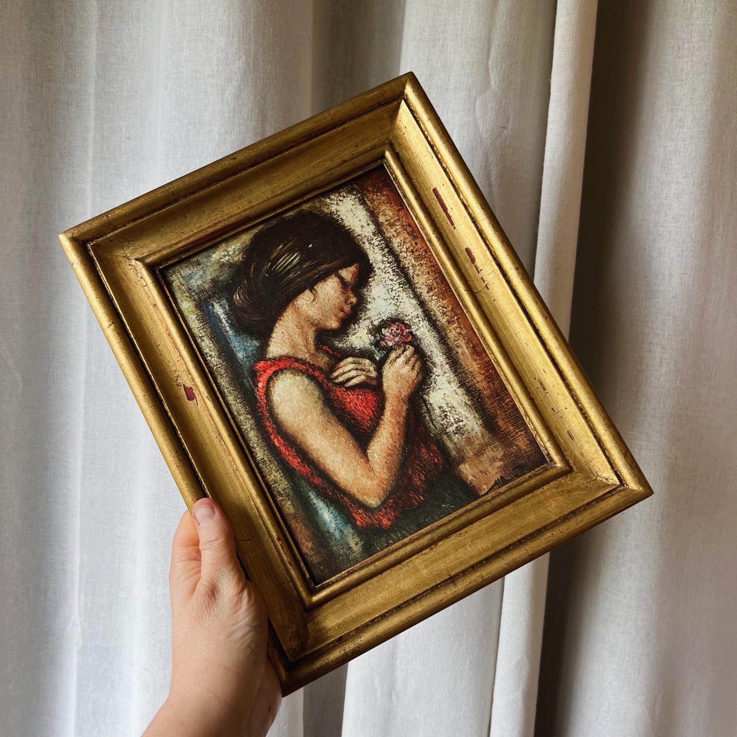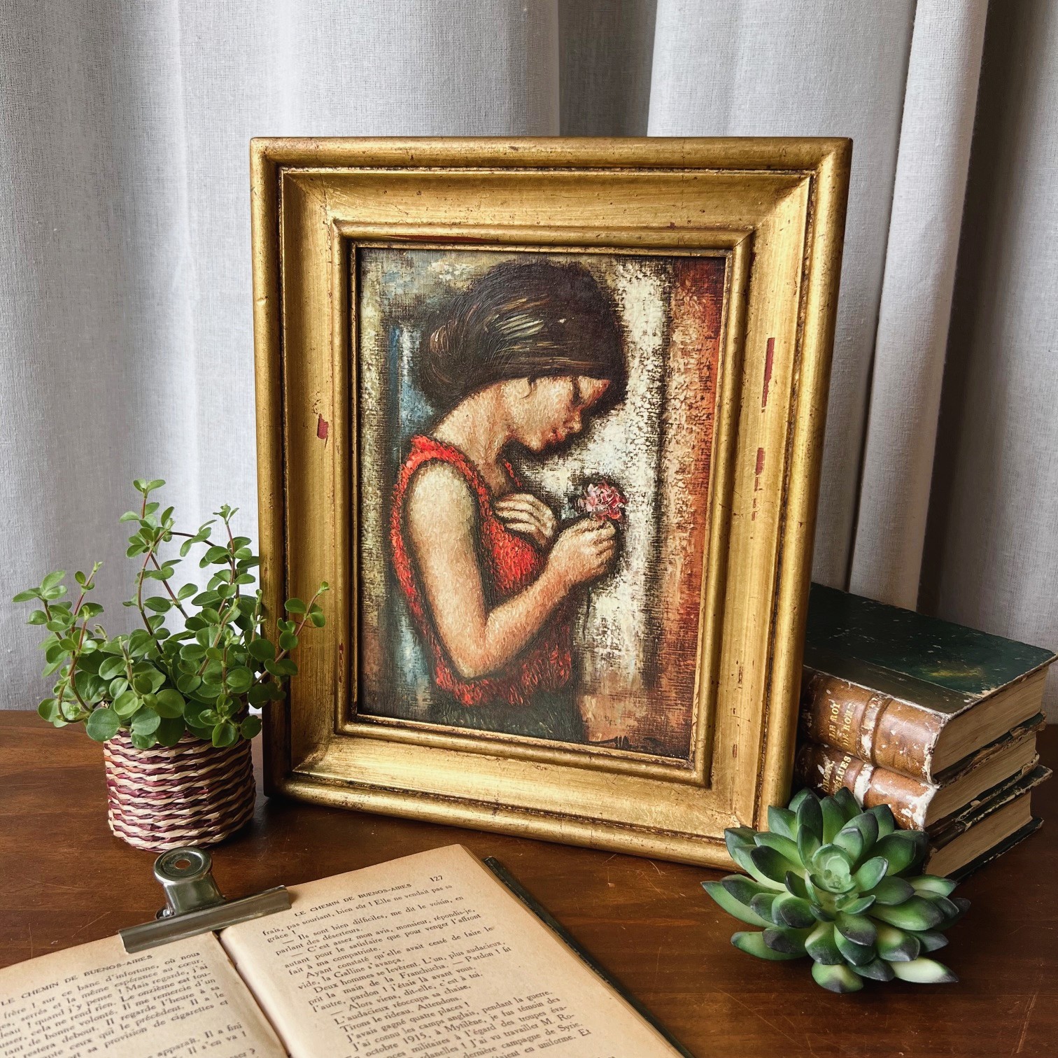 Dans ce regard baissé, ce geste presque sacré vers la fleur, on devine les souvenirs, l’attente, ou peut-être un secret qu’elle ne dira jamais. Le cadre doré patiné prolonge cette impression d’avoir entre les mains un fragment de mémoire.