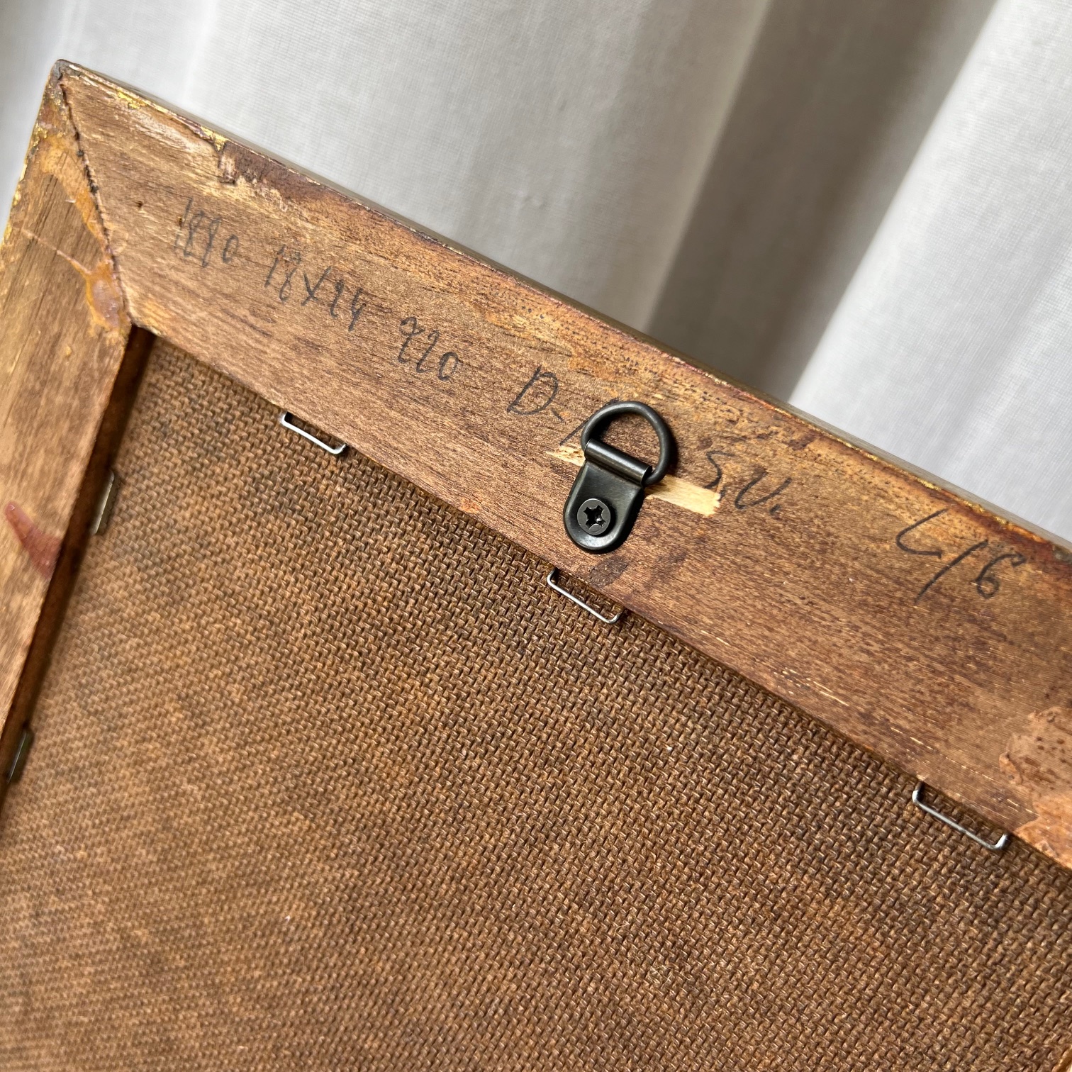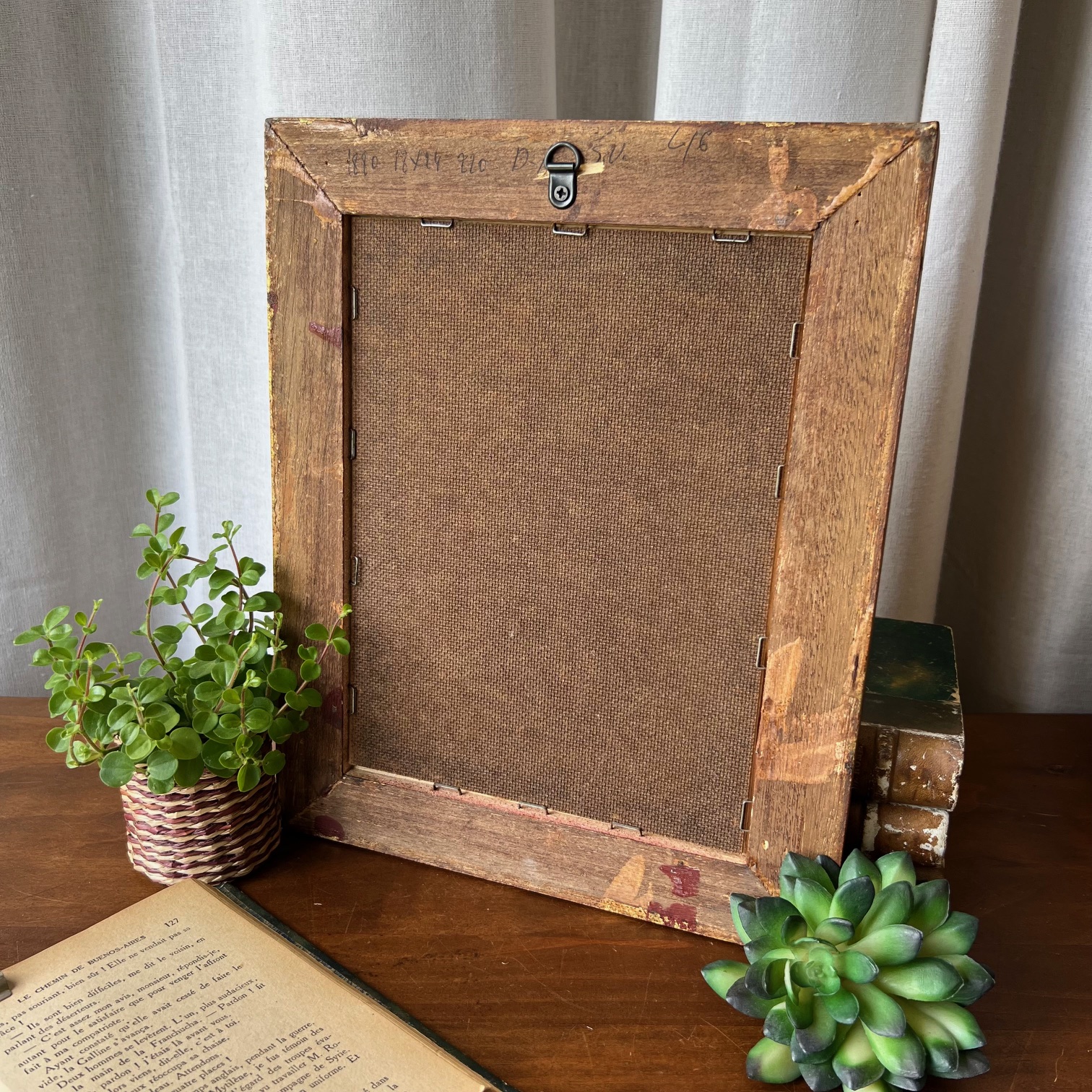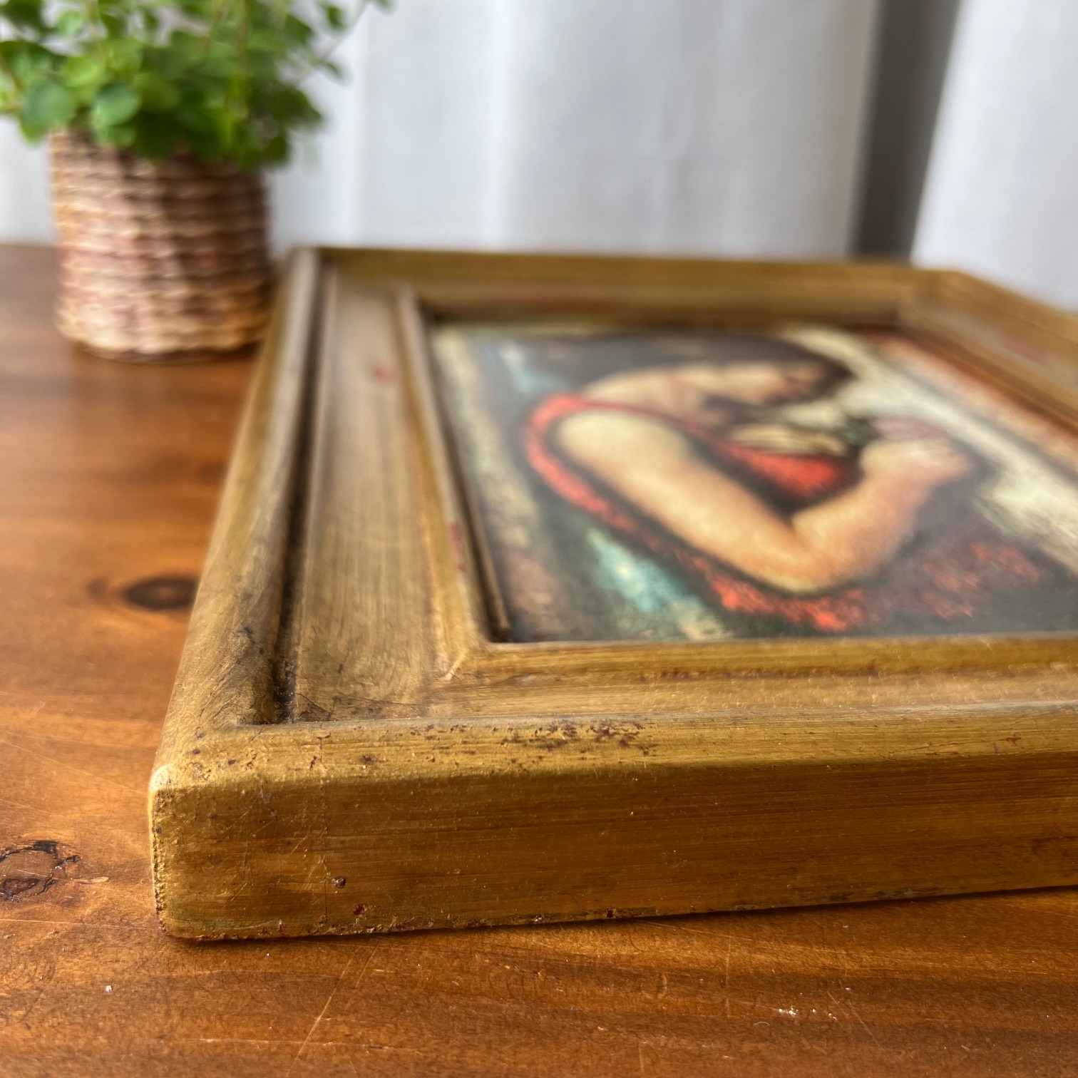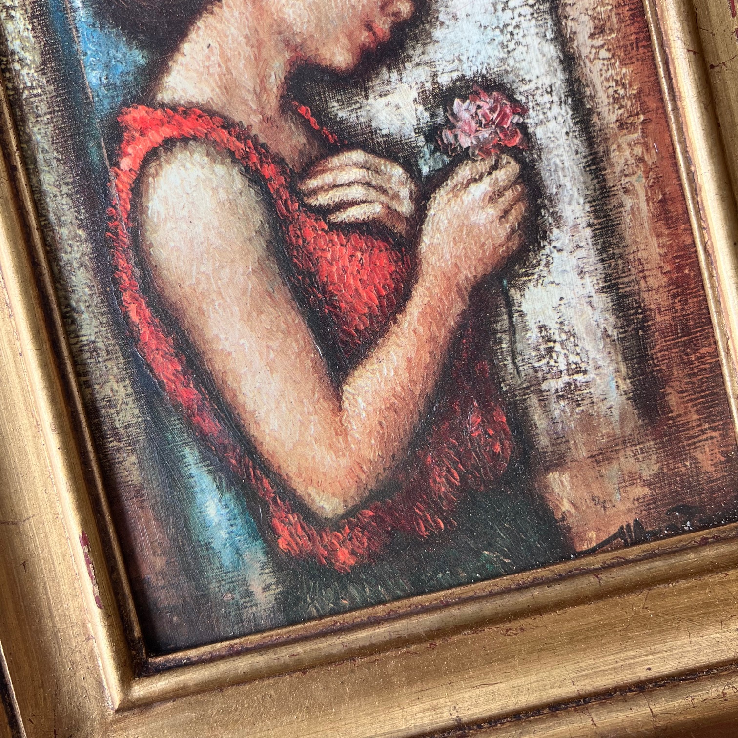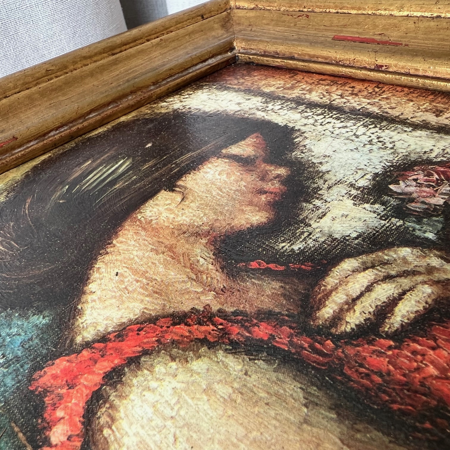 Dans ce regard baissé, ce geste presque sacré vers la fleur, on devine les souvenirs, l’attente, ou peut-être un secret qu’elle ne dira jamais. Le cadre doré patiné prolonge cette impression d’avoir entre les mains un fragment de mémoire.