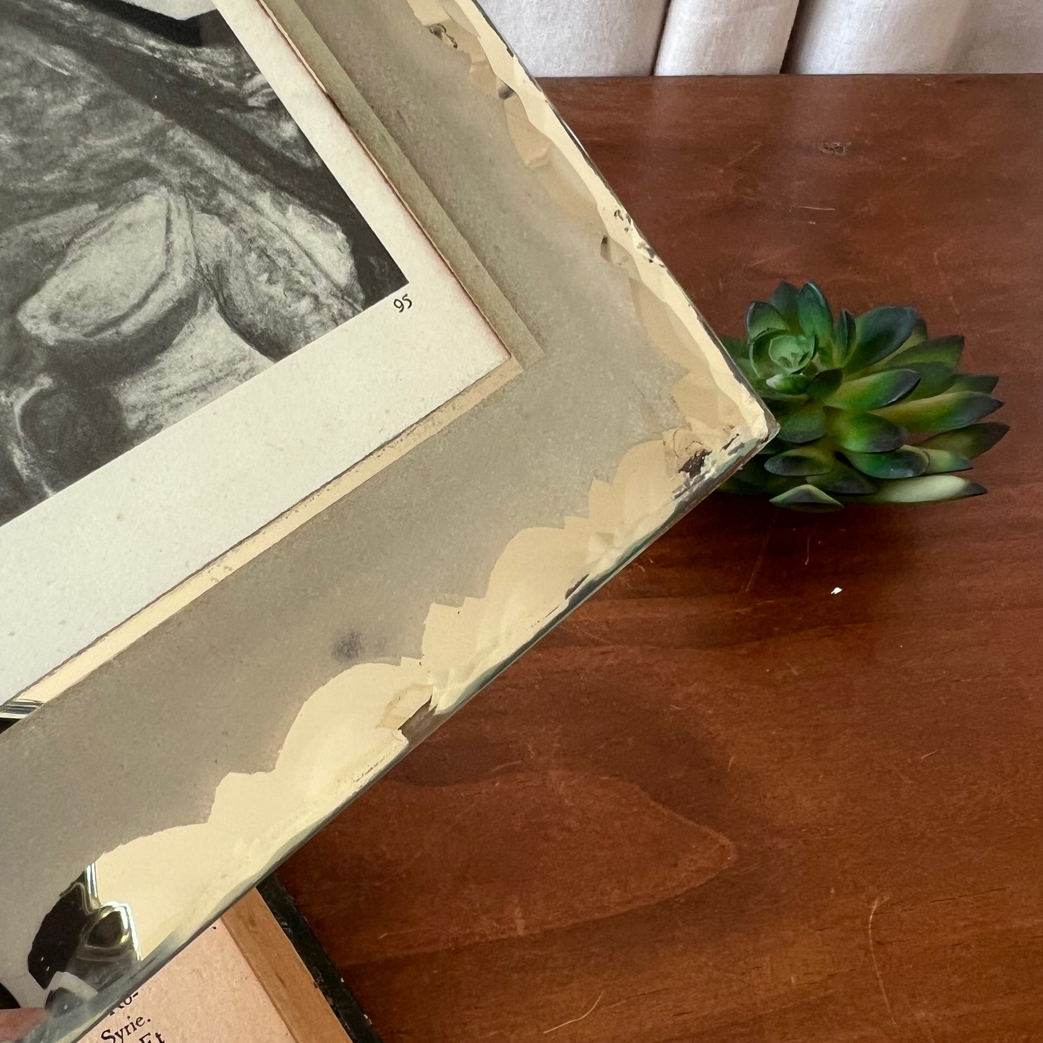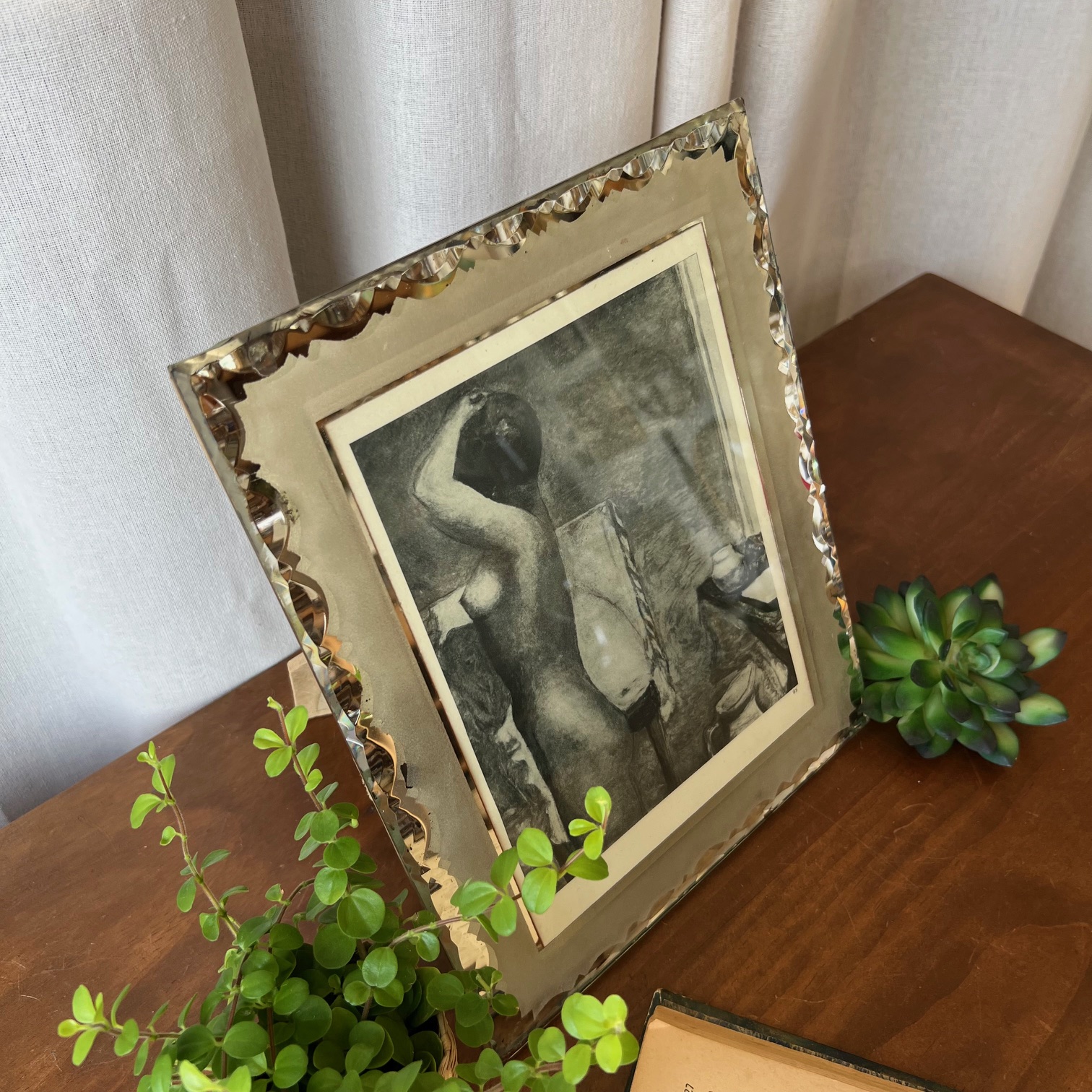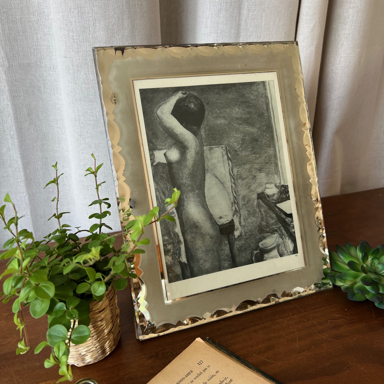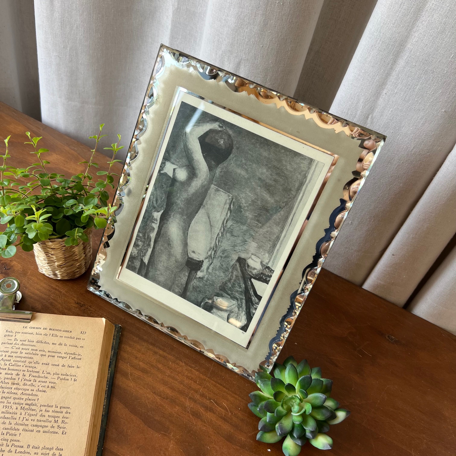 Un cadre ancien comme une petite fenêtre sur le passé… Avec son bord de miroir biseauté, il capte la lumière et la renvoie en reflets subtils, apportant une élégance discrète à vos souvenirs. Quelques marques du temps témoignent de sa belle histoire et lui donnent ce charme inimitable des objets qui ont traversé les années.