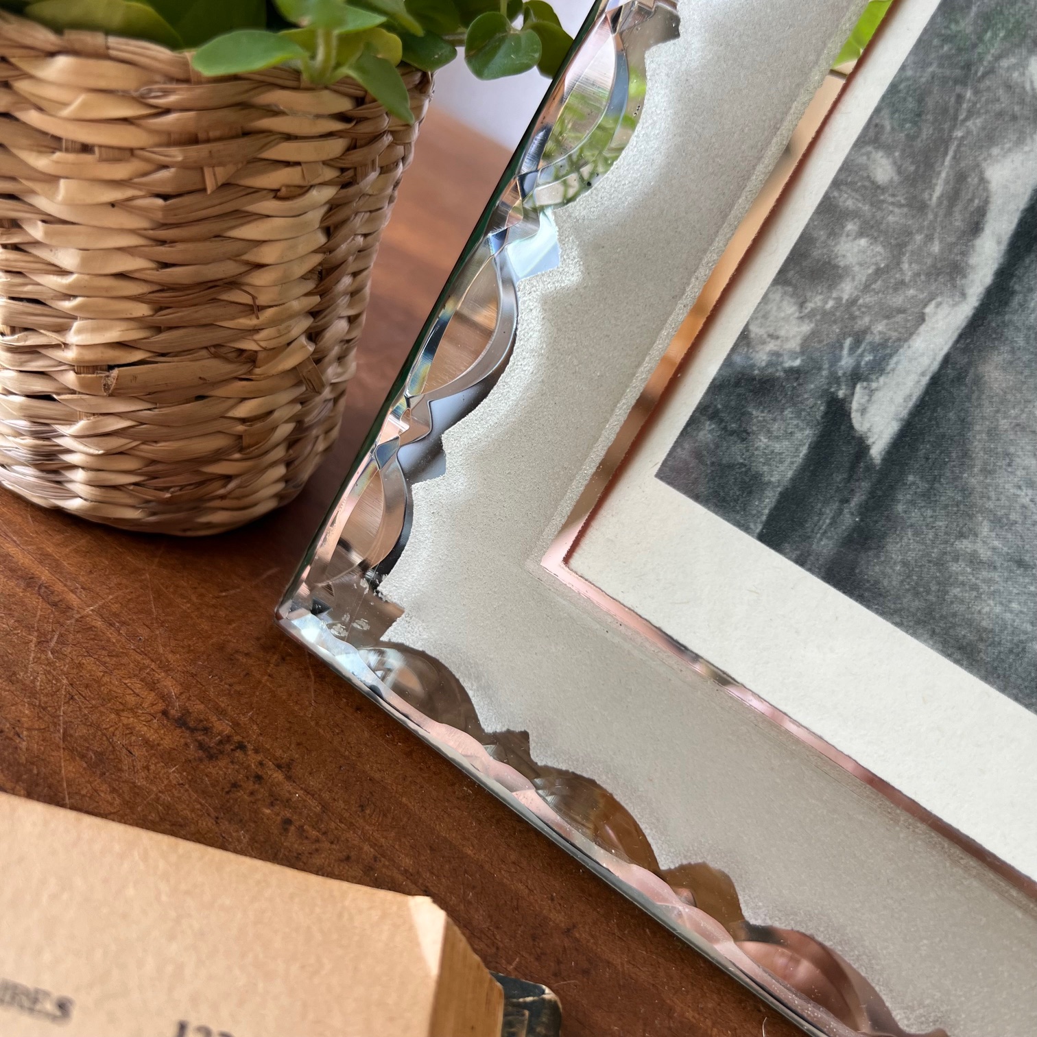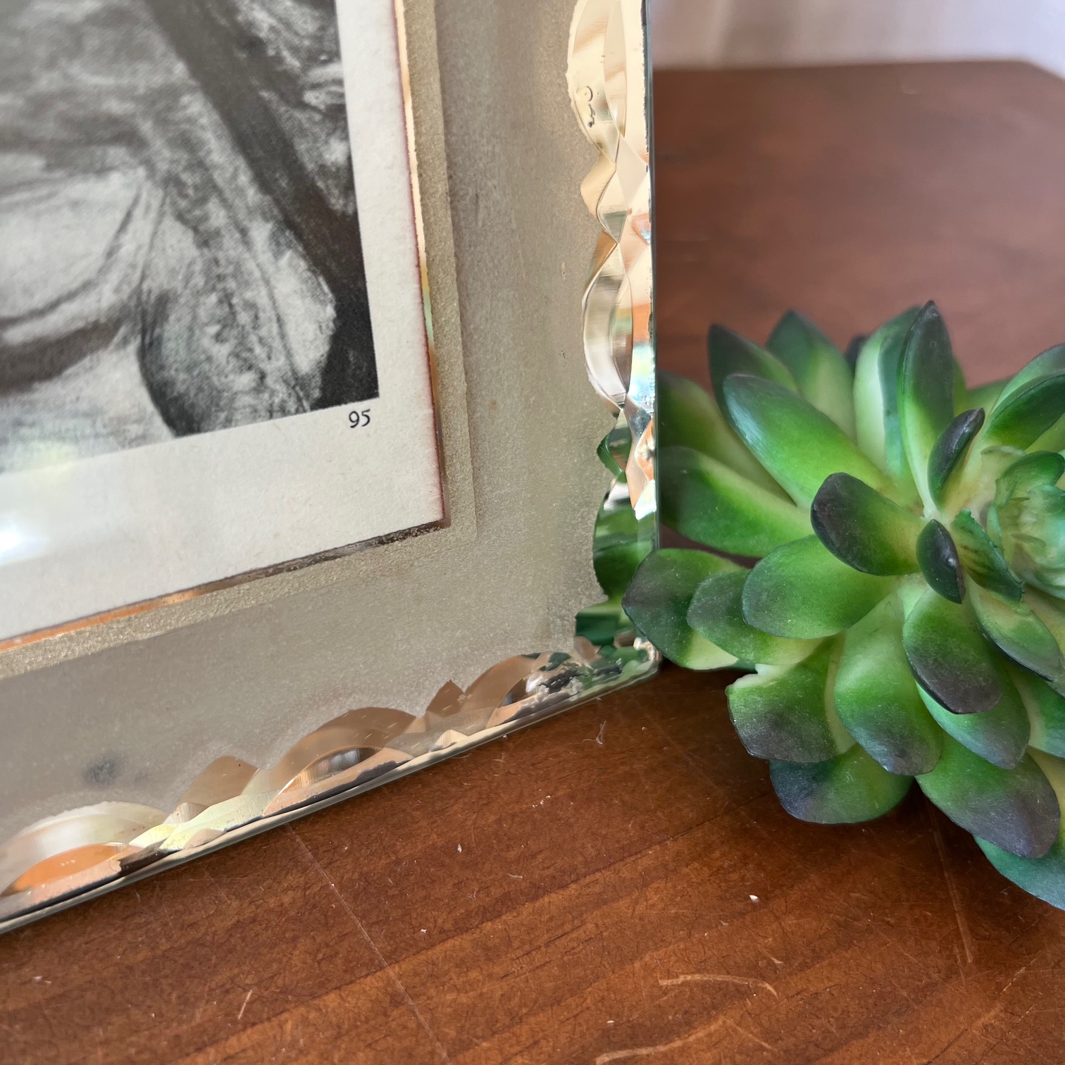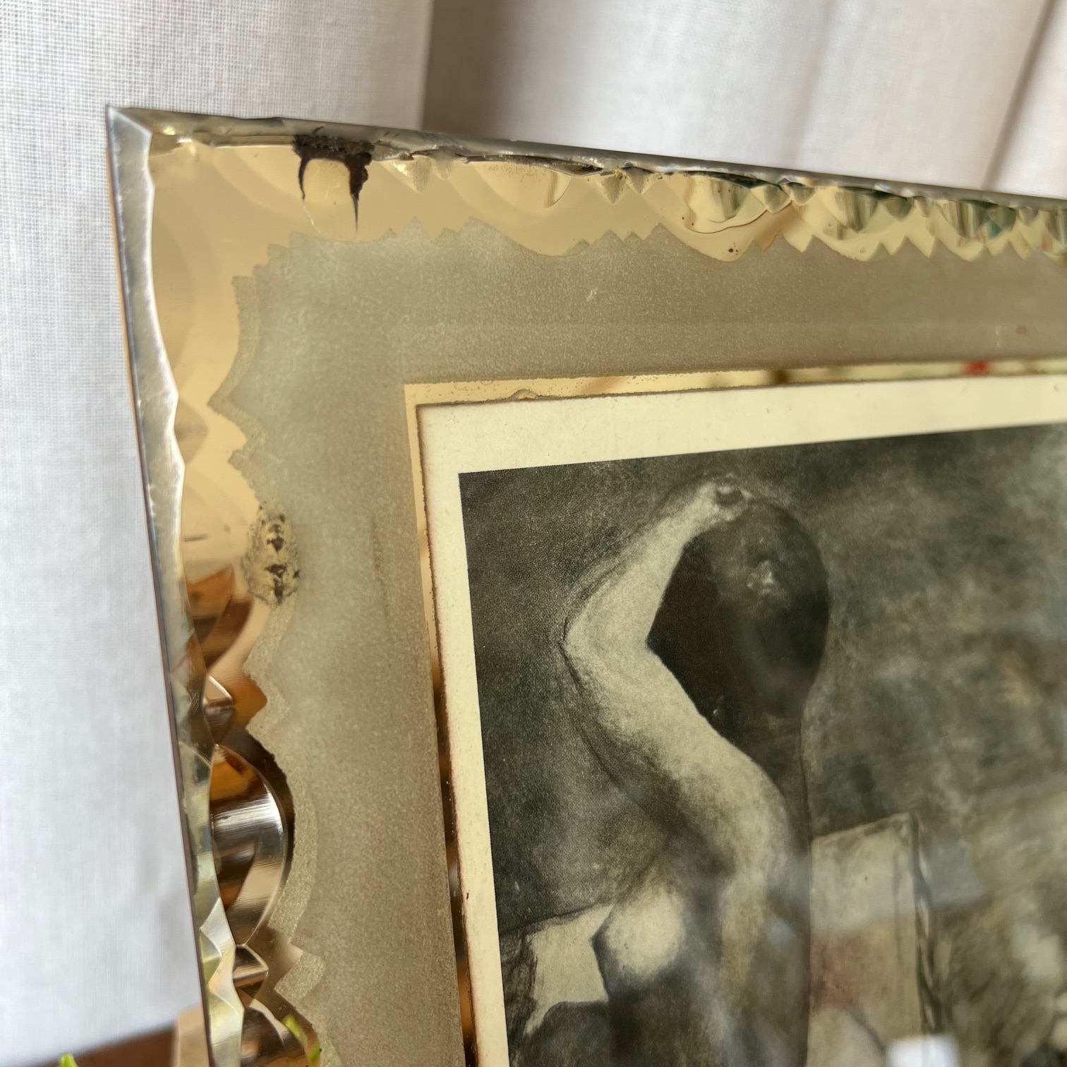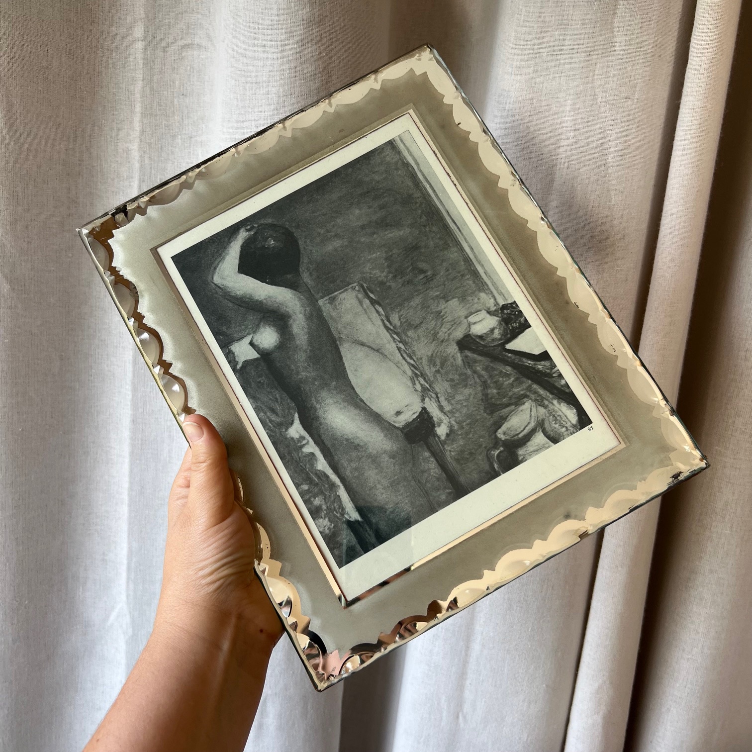 Un cadre ancien comme une petite fenêtre sur le passé… Avec son bord de miroir biseauté, il capte la lumière et la renvoie en reflets subtils, apportant une élégance discrète à vos souvenirs. Quelques marques du temps témoignent de sa belle histoire et lui donnent ce charme inimitable des objets qui ont traversé les années.