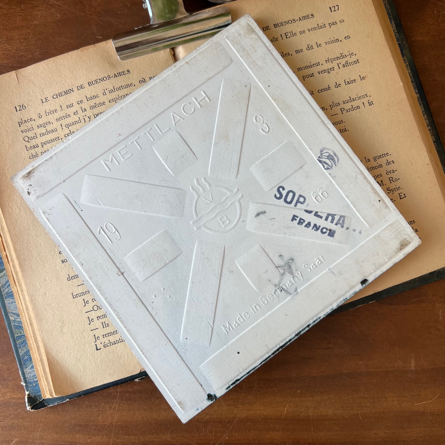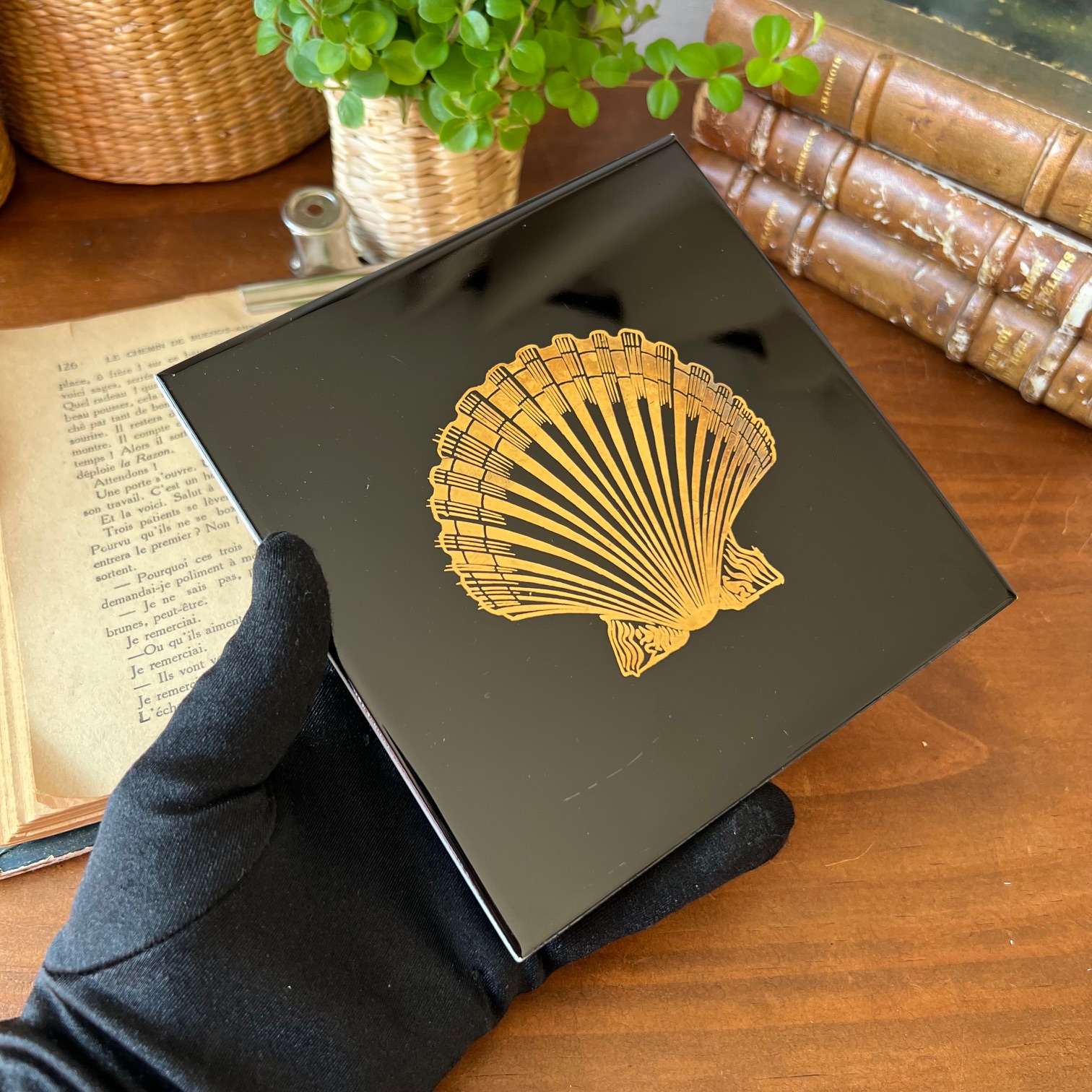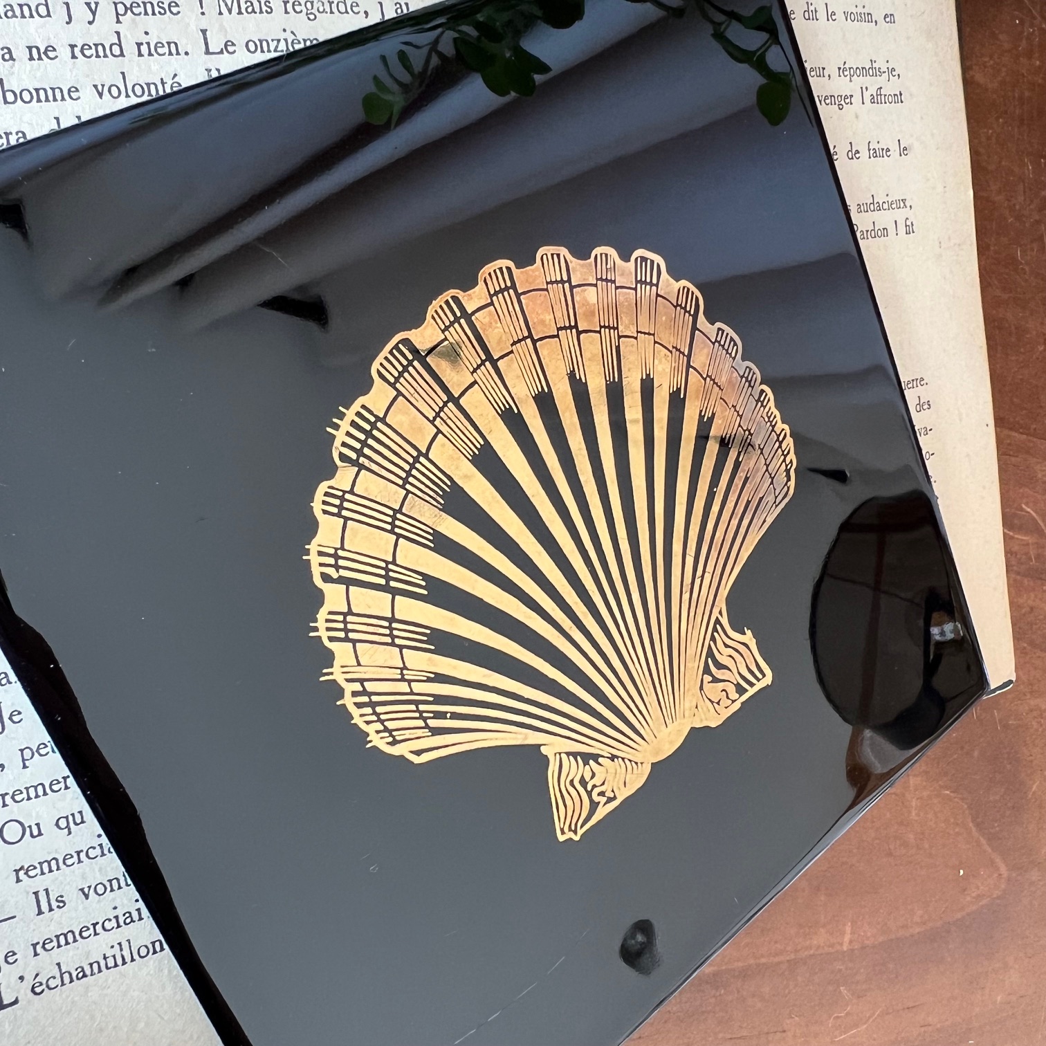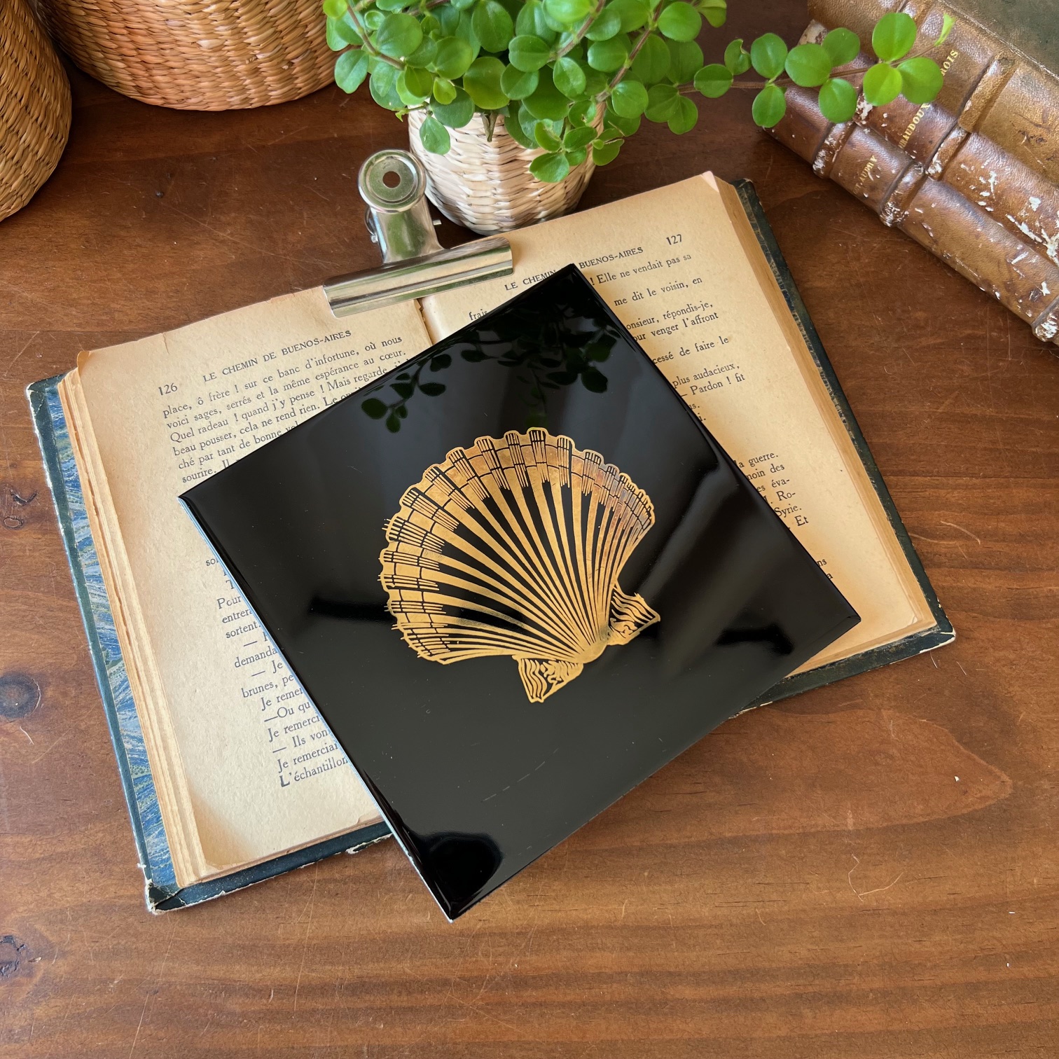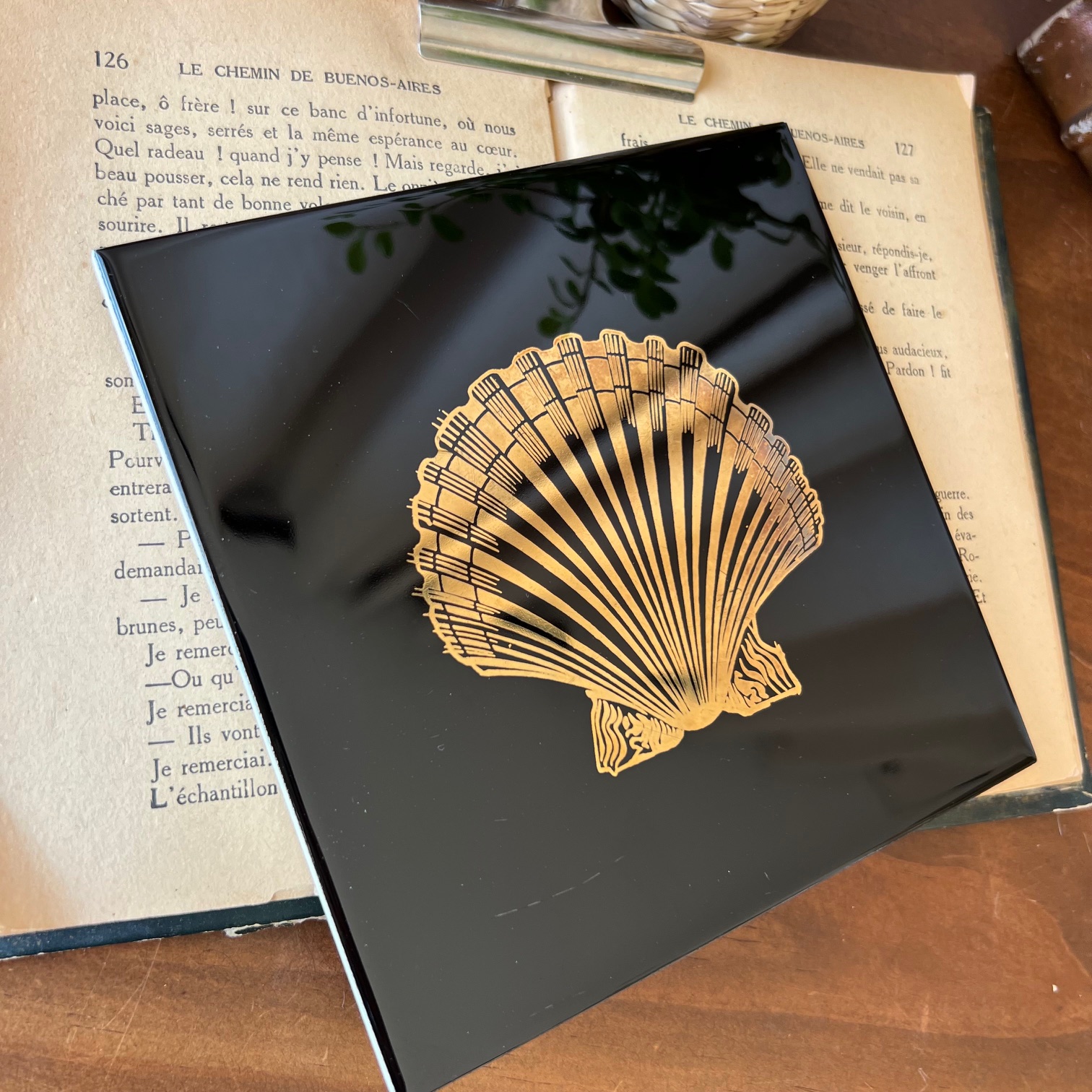Un seul carreau… et déjà, tout un imaginaire. Fabriqué par la célèbre maison Mettlach, dans la région de la Sarre en Allemagne, ce carreau ancien de 15 x 15 cm mêle fond noir brillant et décor doré, ici une coquille Saint-Jacques finement stylisée.