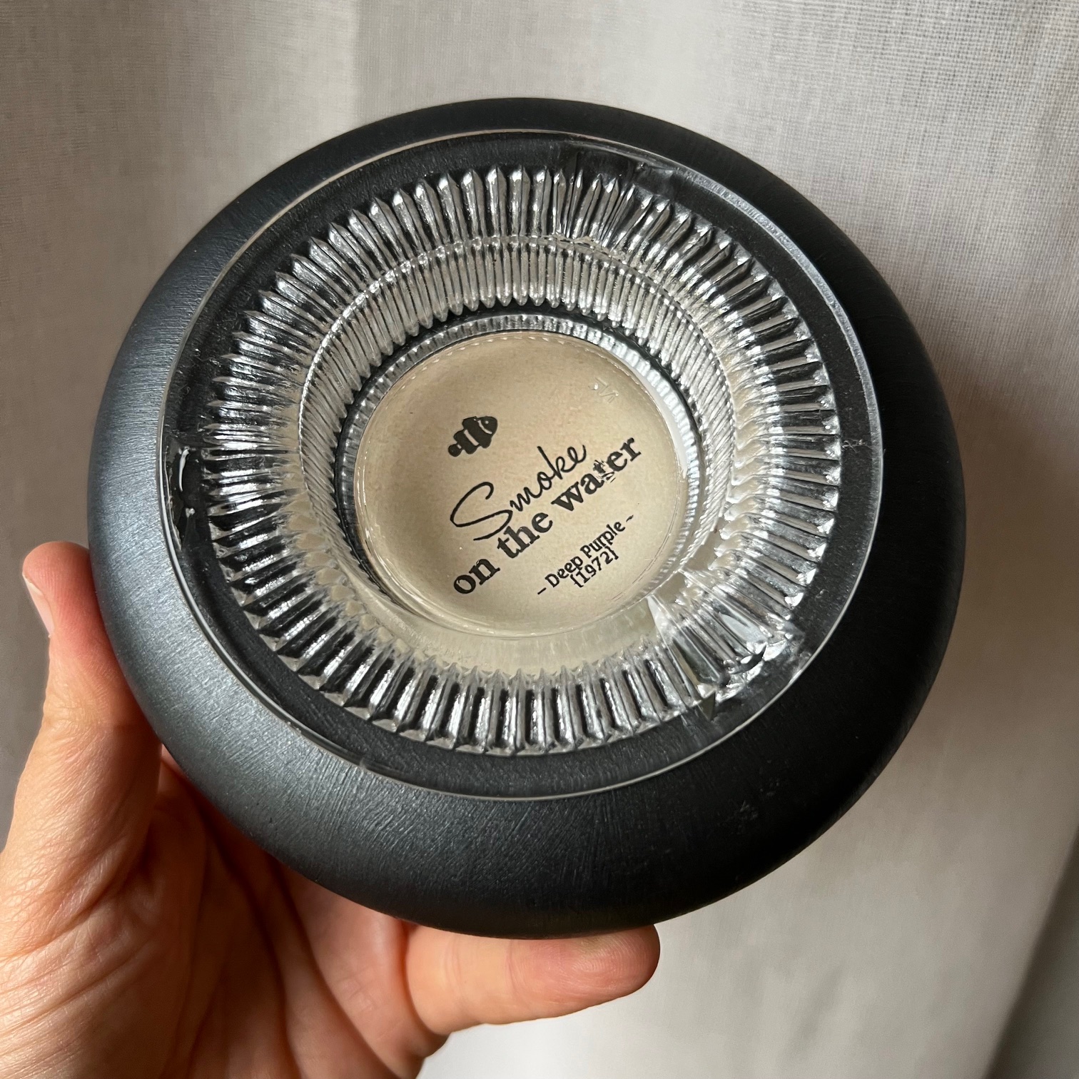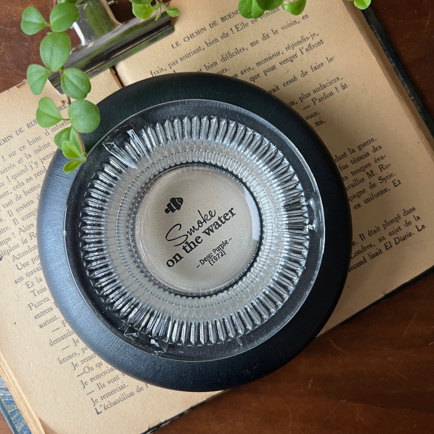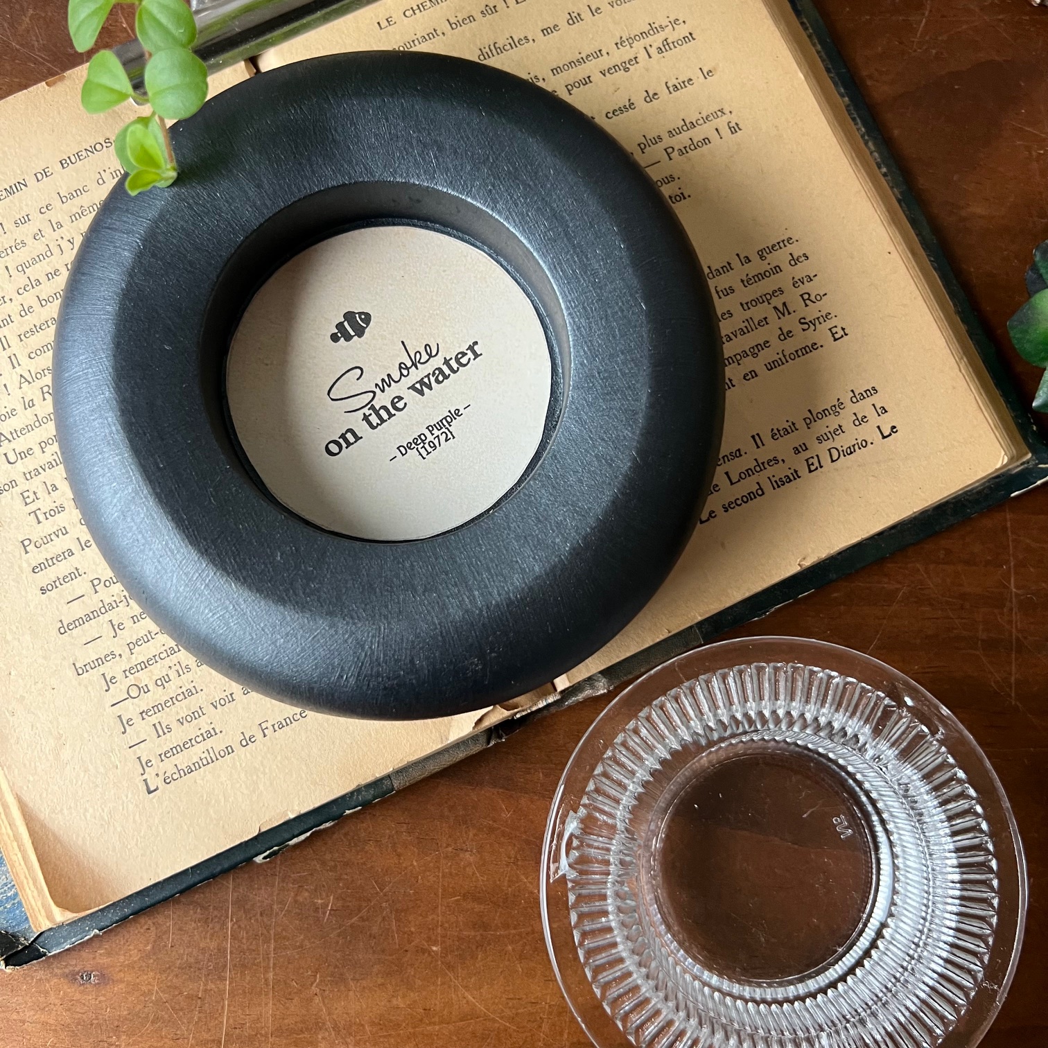 Ancien cendrier au socle en bois noirci et réceptacle en verre à trois encoches. Sa particularité ? Sous le verre, un espace discret où vient se glisser un petit médaillon de papier. Ici, j’y ai choisi un clin d’œil musical à Deep Purple avec le mythique “Smoke on the Water” (1972).