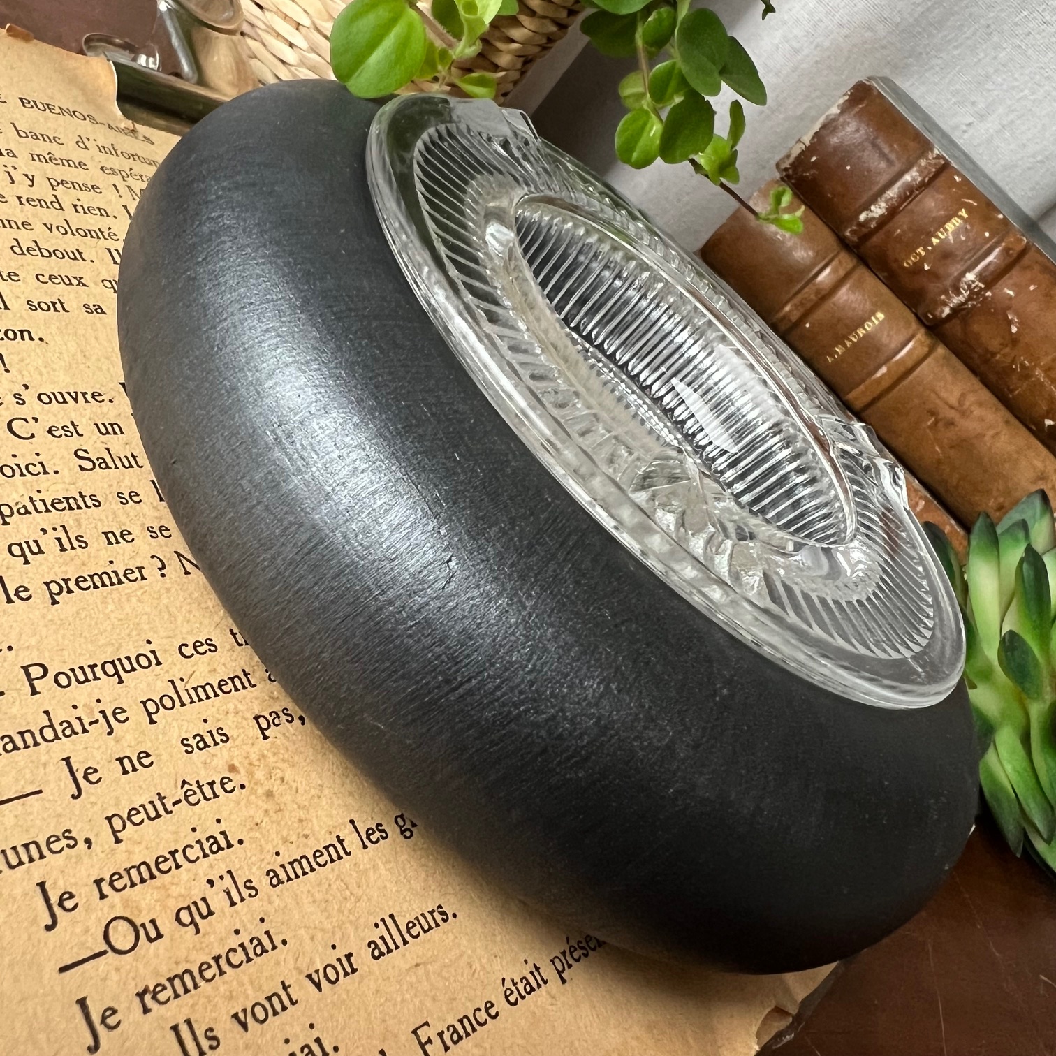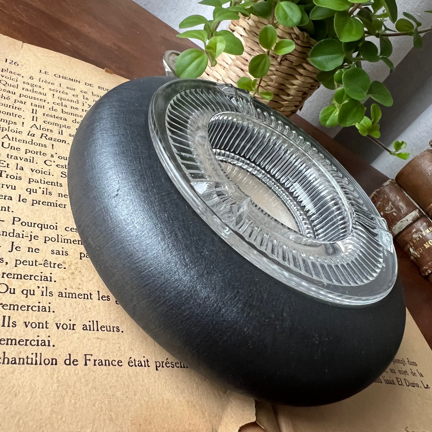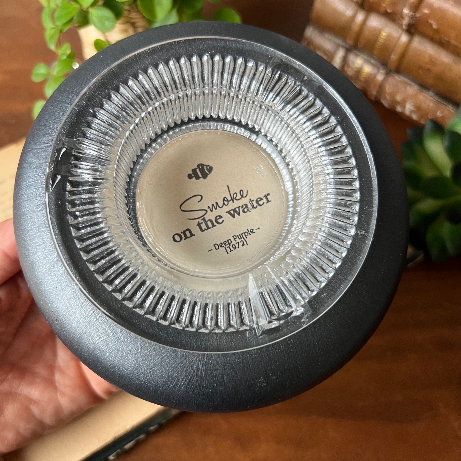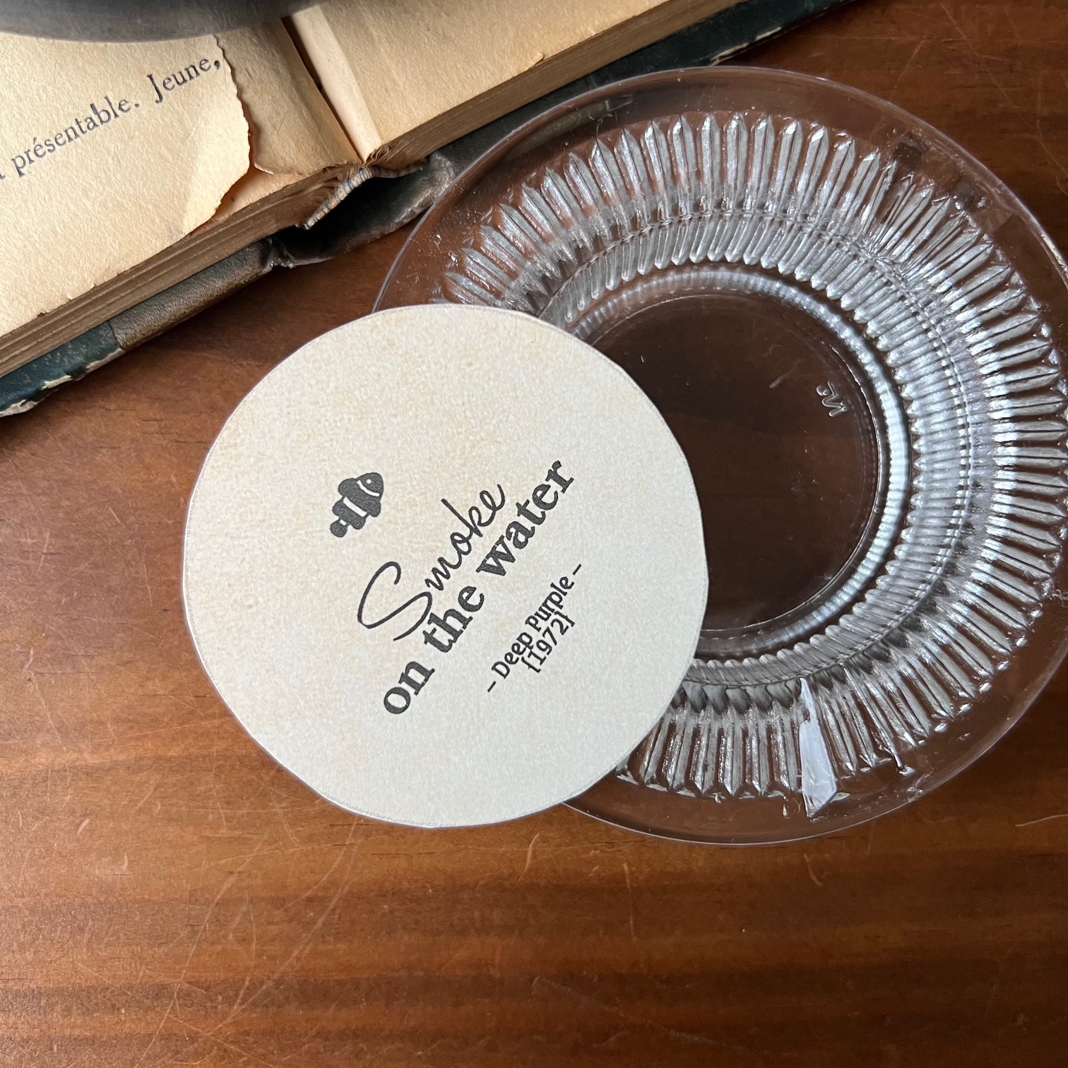 Ancien cendrier au socle en bois noirci et réceptacle en verre à trois encoches. Sa particularité ? Sous le verre, un espace discret où vient se glisser un petit médaillon de papier. Ici, j’y ai choisi un clin d’œil musical à Deep Purple avec le mythique “Smoke on the Water” (1972).
