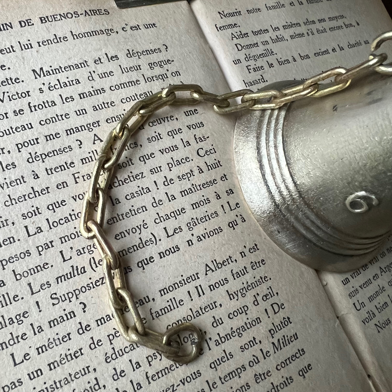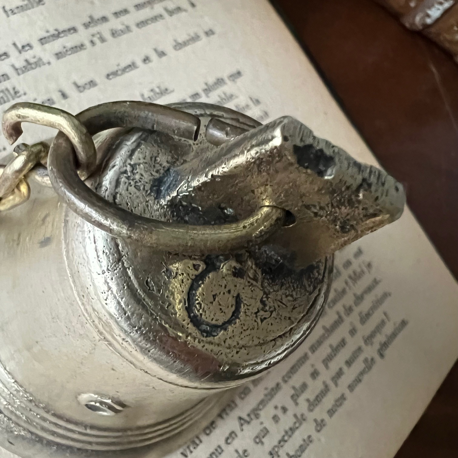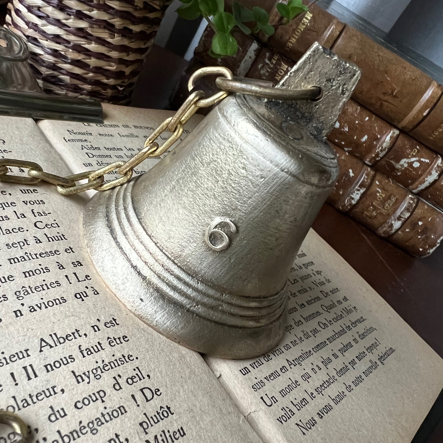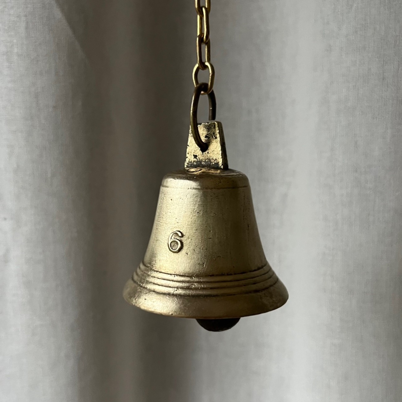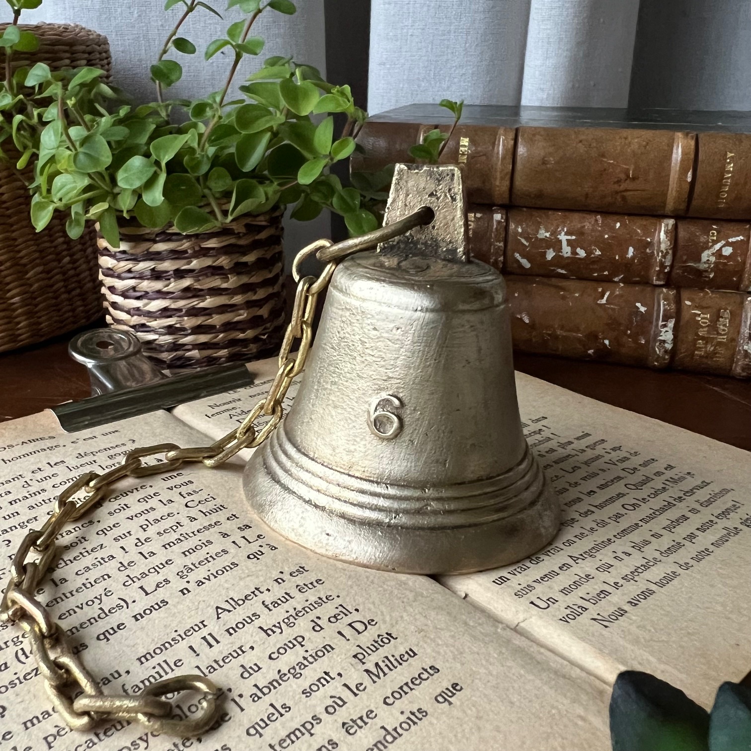 Une petite cloche en bronze comme on n’en croise plus souvent : un numéro « 6 » en relief sur le dessus, teinte chaude, tintement clair et rond grâce à son gros grelot intérieur.