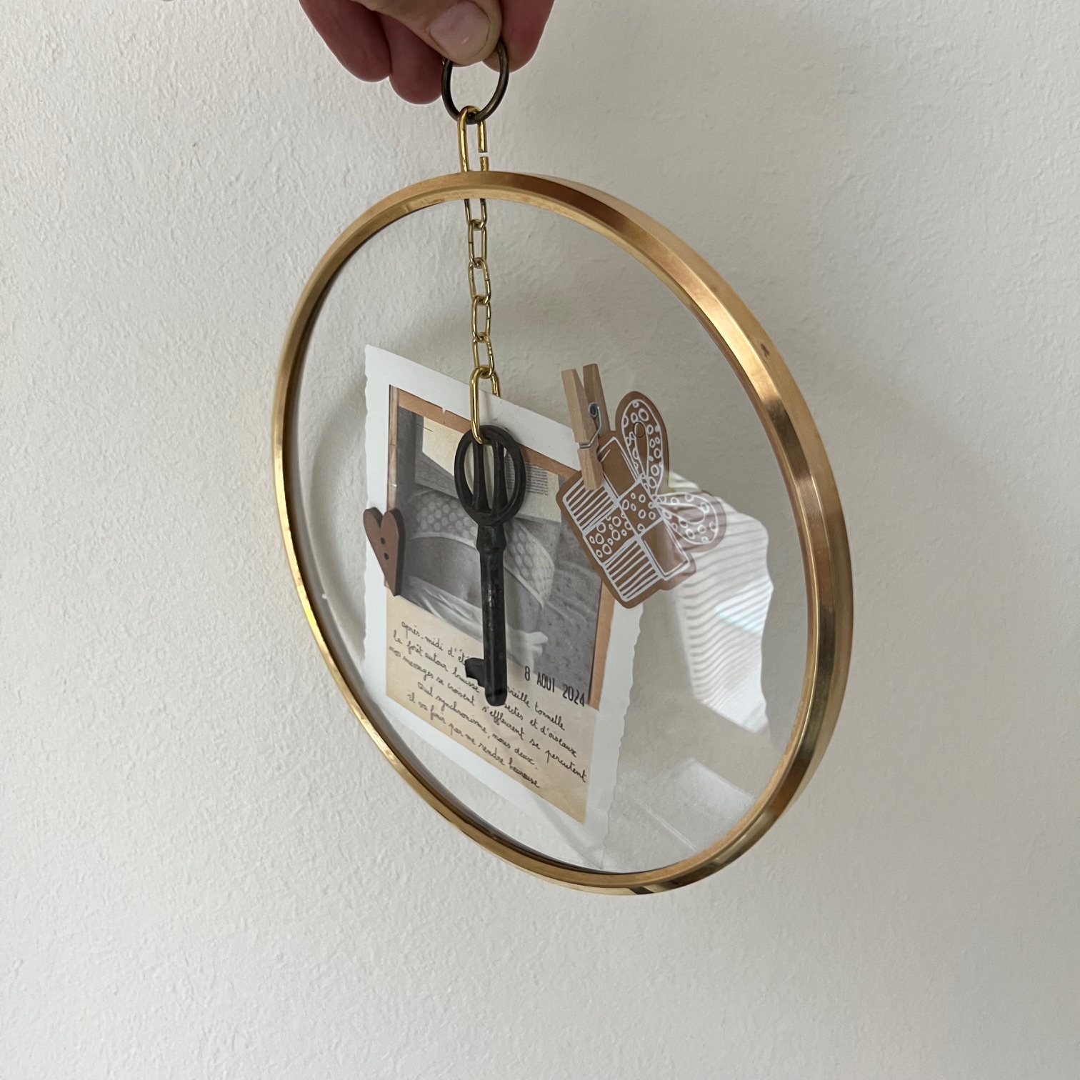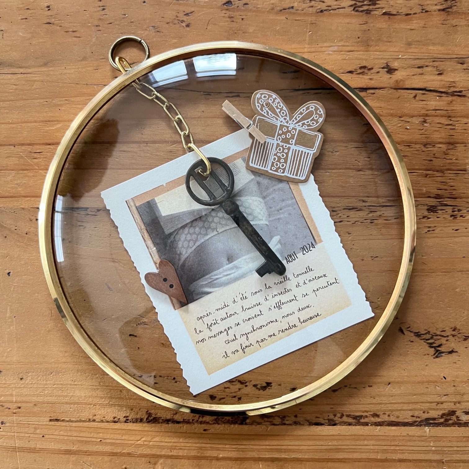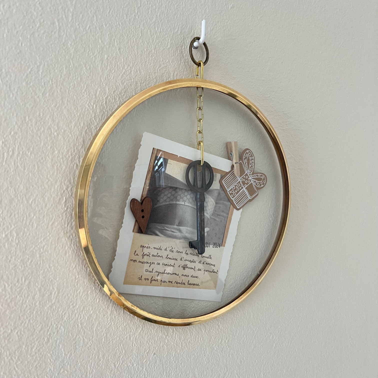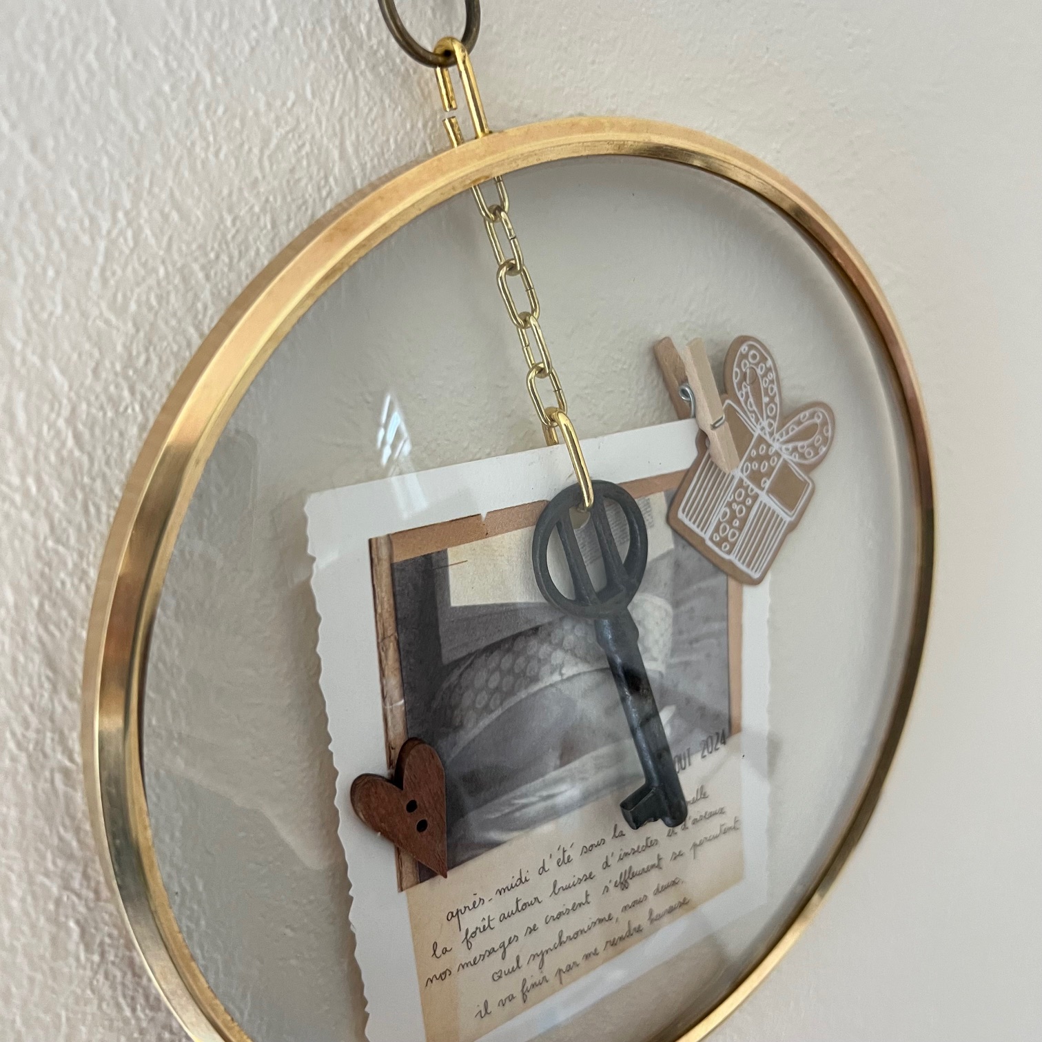 Ce cadran d’horloge vintage, avec son verre bombé et son cerclage en laiton doré, s’offre une seconde destinée. À l’intérieur, une clé ancienne suspendue, quelques mots poétiques signés « Papillonnage« , et de délicats détails chinés et assemblés avec soin.