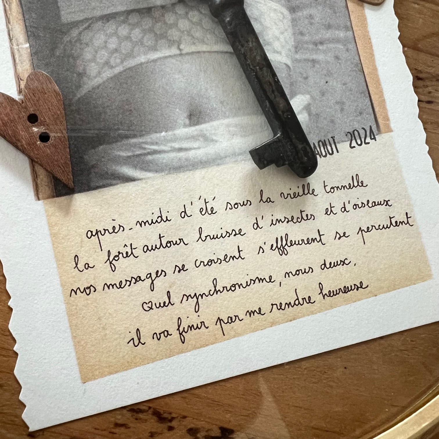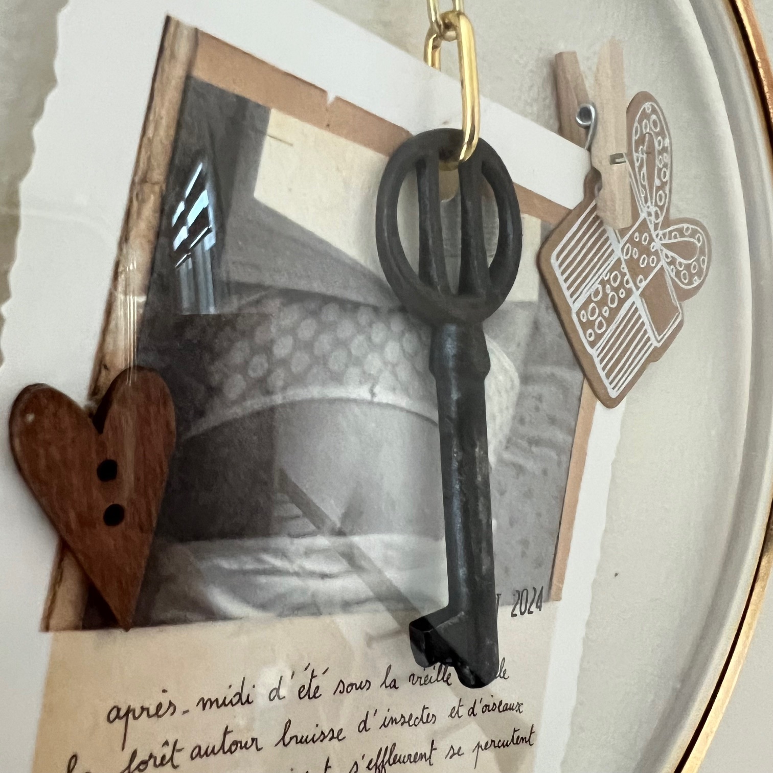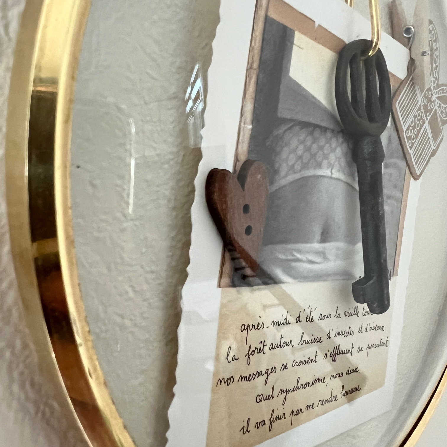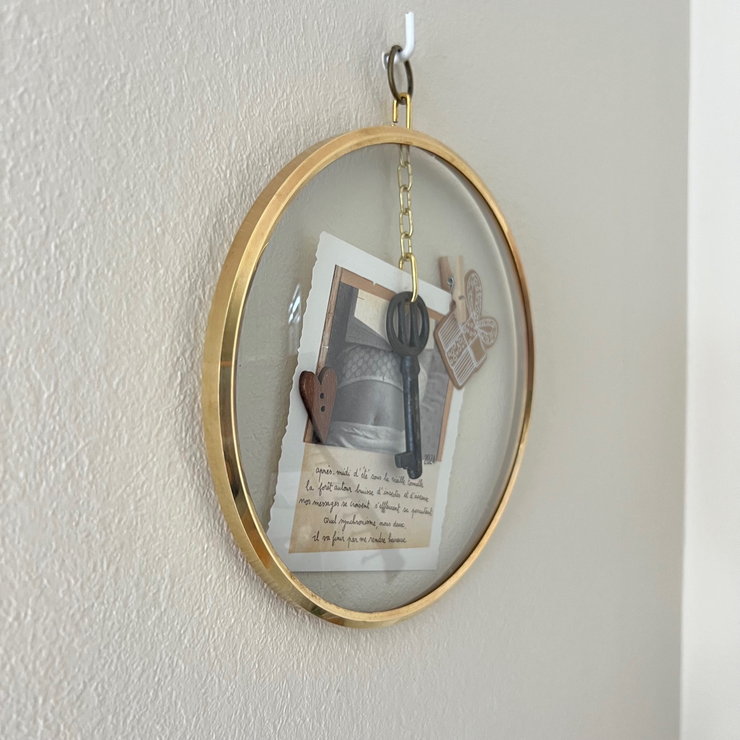 Ce cadran d’horloge vintage, avec son verre bombé et son cerclage en laiton doré, s’offre une seconde destinée. À l’intérieur, une clé ancienne suspendue, quelques mots poétiques signés « Papillonnage« , et de délicats détails chinés et assemblés avec soin.