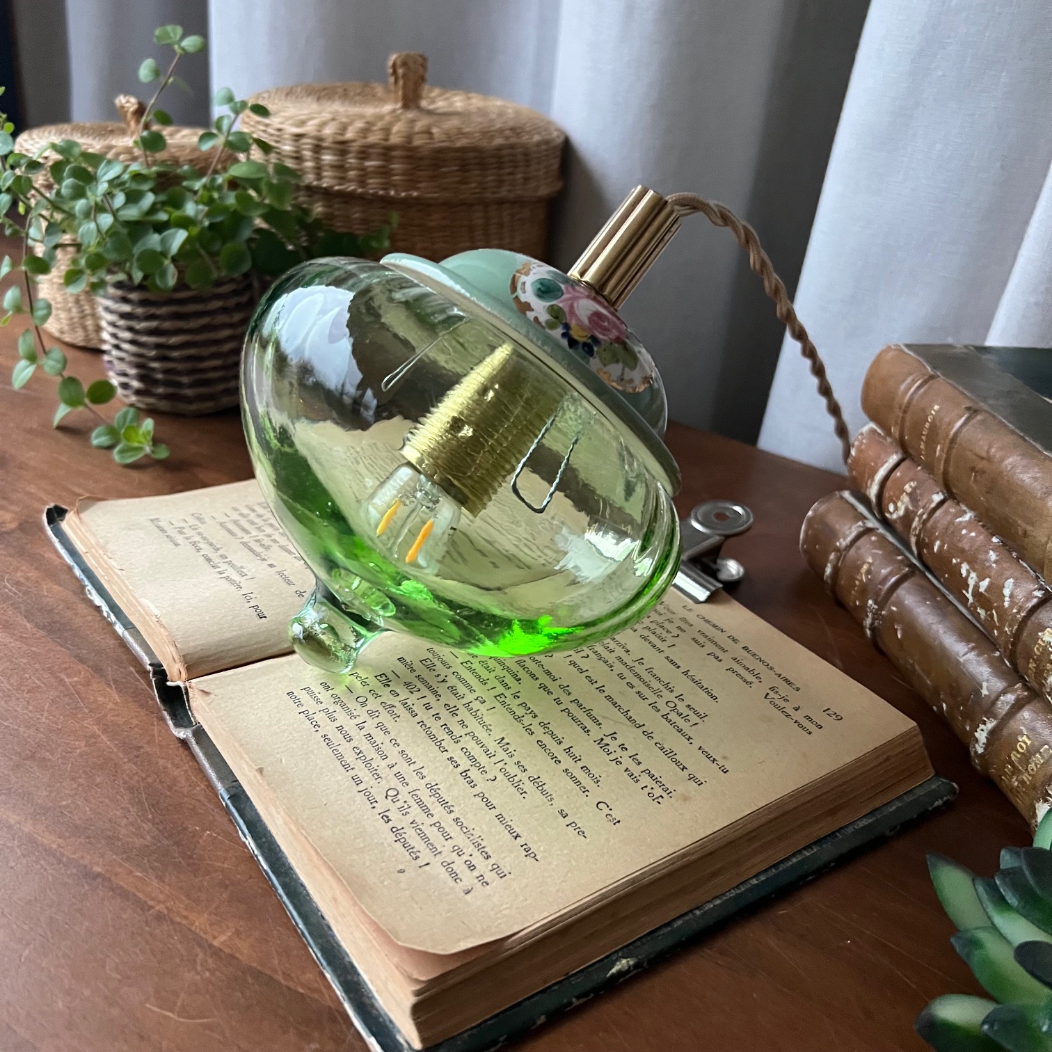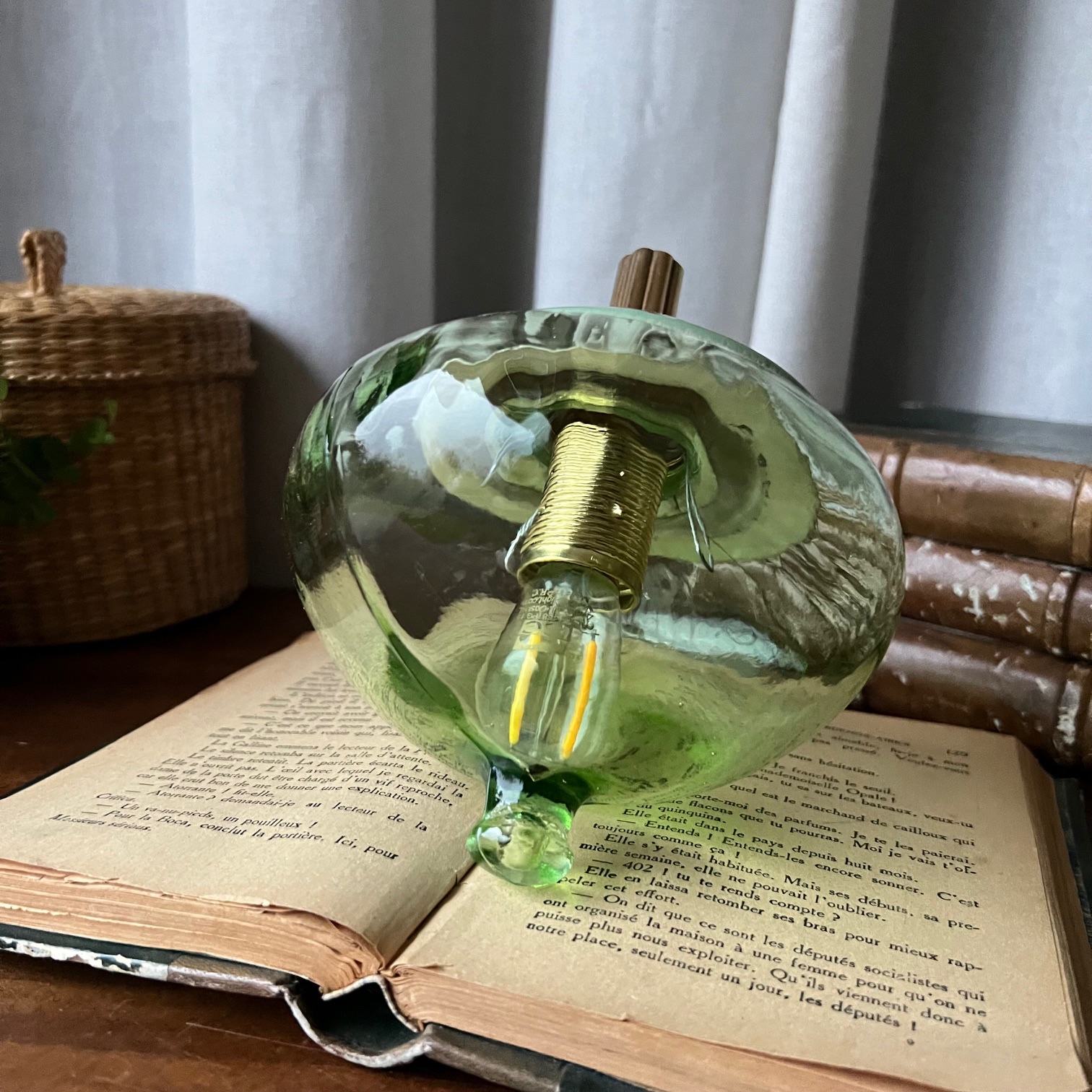 Parfois, une lampe à pétrole ne peut plus éclairer comme avant : le ruban est figé, le pied abîmé, le laiton altéré… Mais sa cuve en verre, elle, garde encore toute sa grâce. Alors on l’imagine autrement, on lui offre une nouvelle lumière.