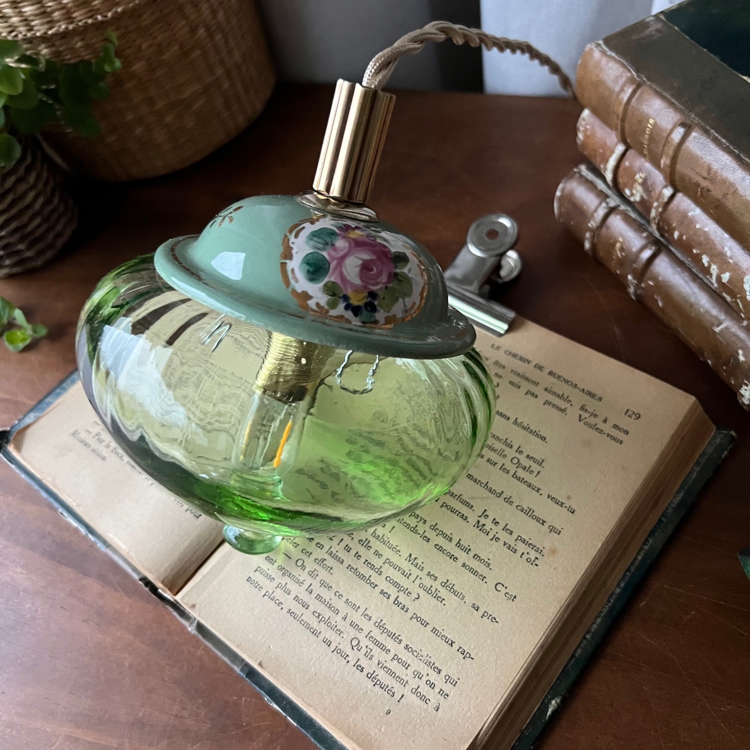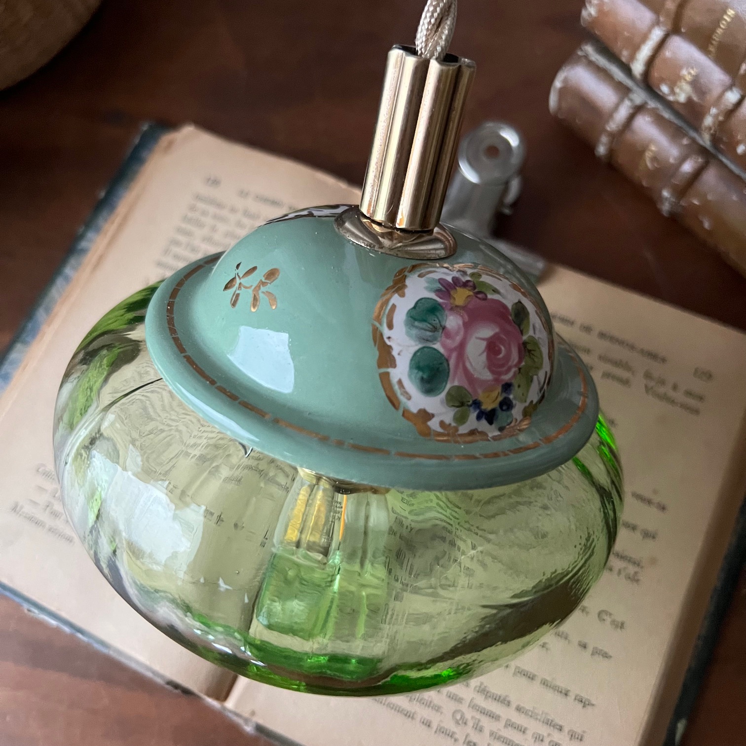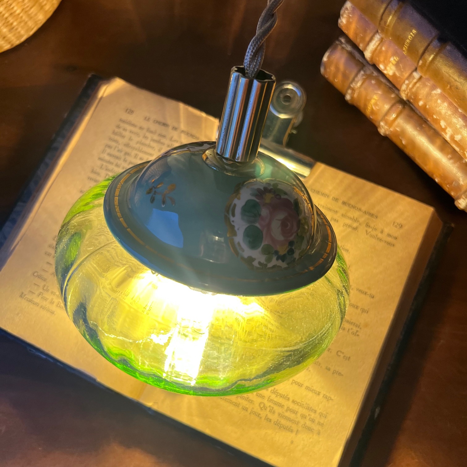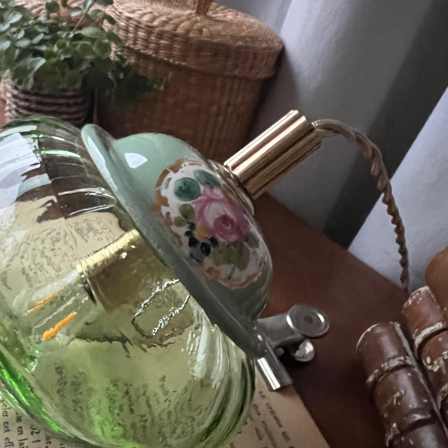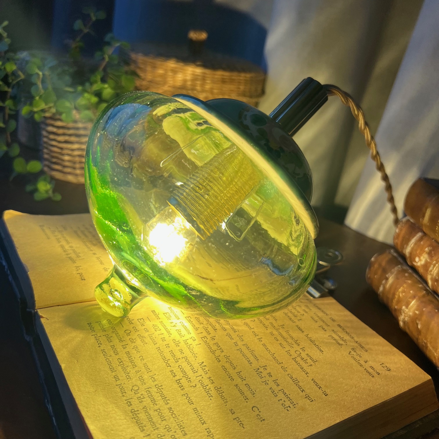 La voici transformée en baladeuse délicate, à suspendre ou à poser, selon l’envie. On craque pour le verre en vert lumineux, le « chapeau » en céramique italienne… et cette douce allure d’objet réinventé.
