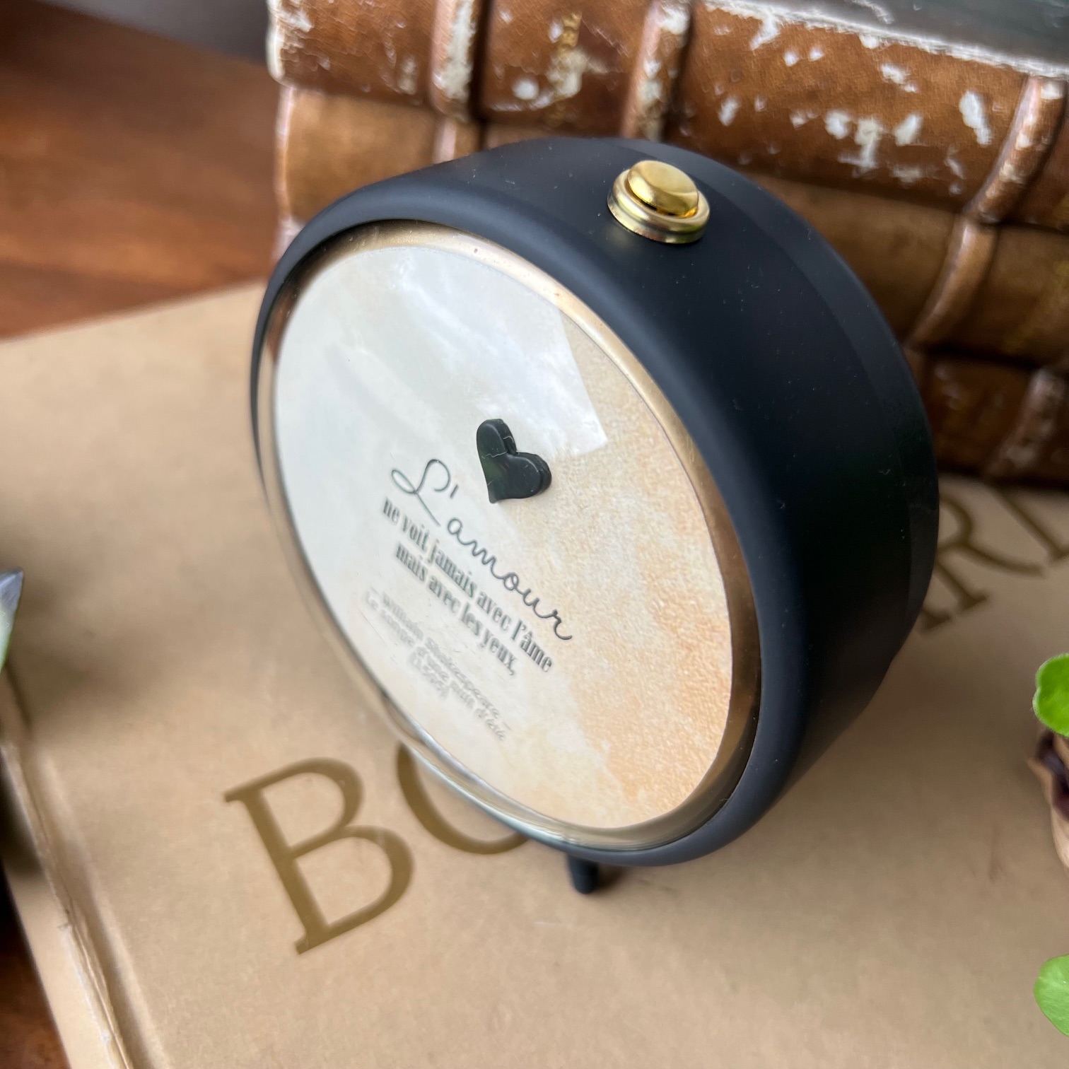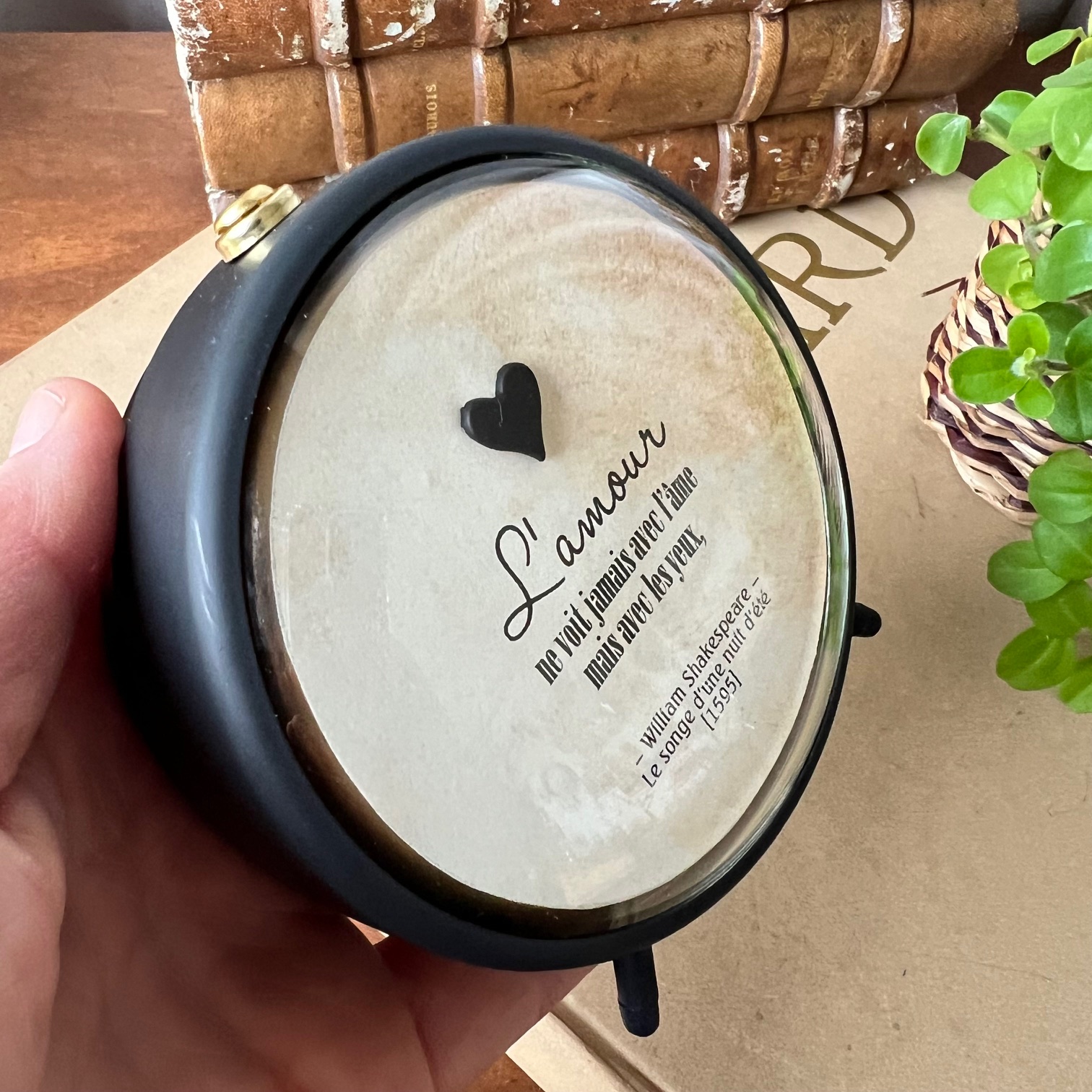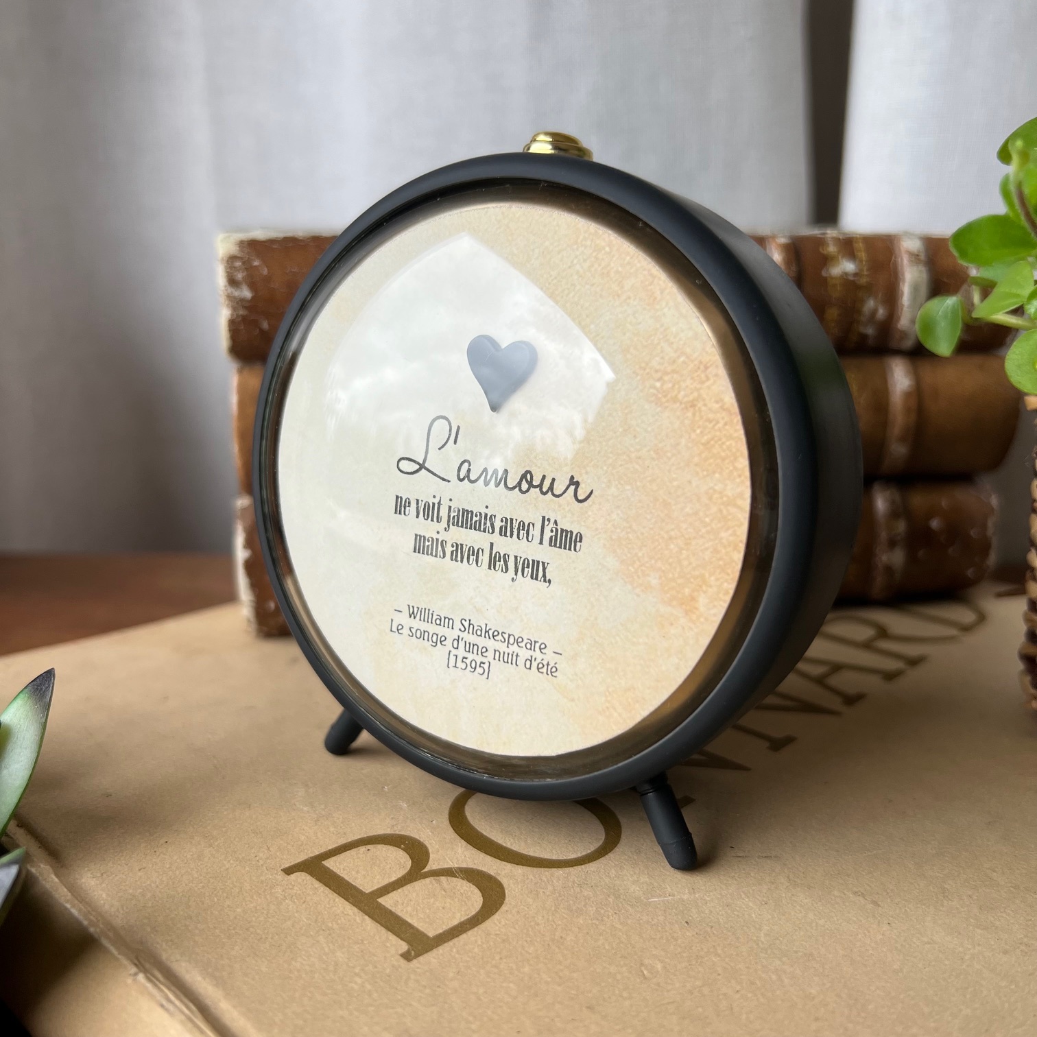Ce réveil vintage ne marque plus les heures… mais garde en lui une phrase de Shakespeare, délicate et puissante à la fois. Une phrase qui parle des illusions de l’amour, de cette magie qui parfois trouble la raison pour n’écouter que le cœur.