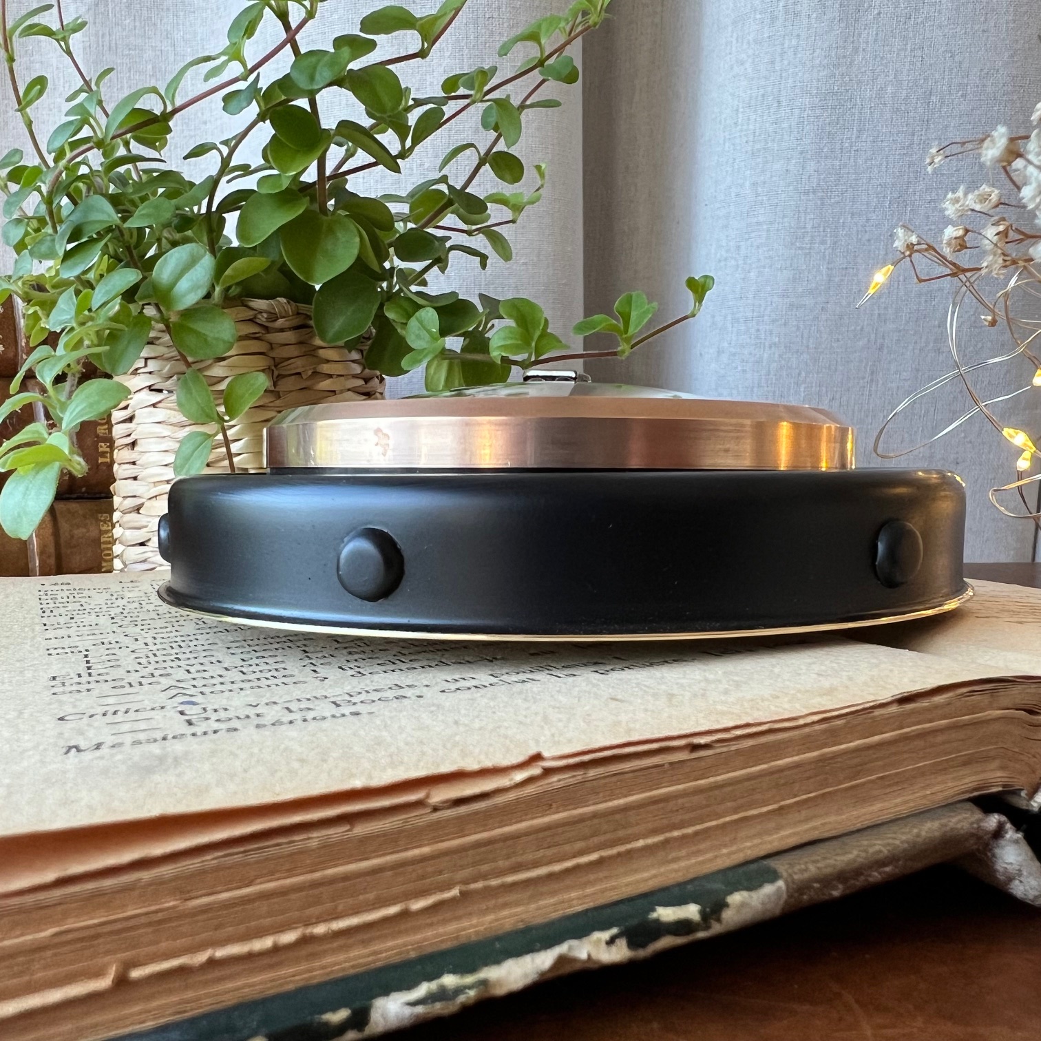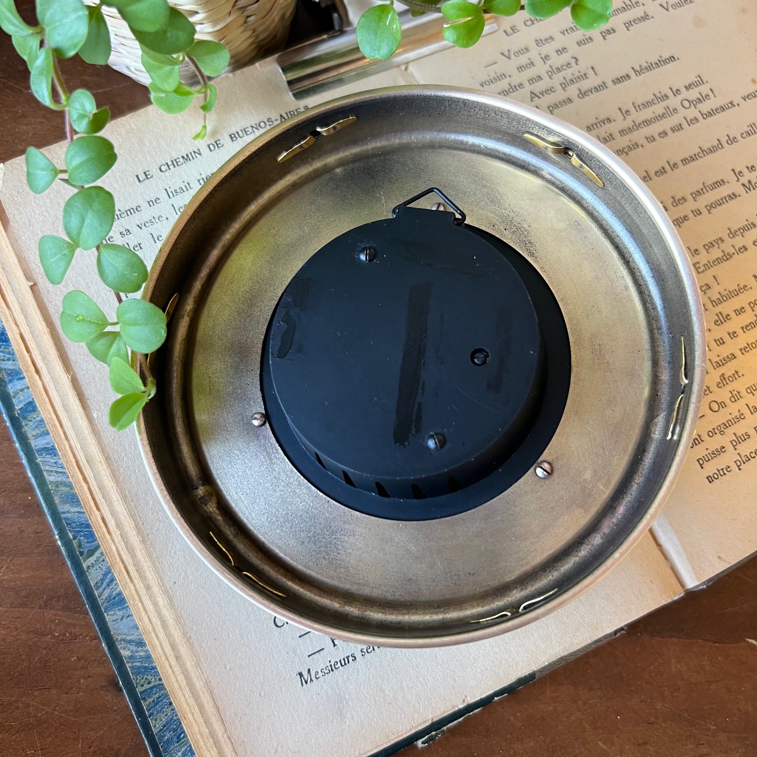 Le mécanisme fatigué ne disait plus le temps. Alors, doucement, il a été retiré ; le cadre rond en bois, patiné en noir. Au centre du cadran bombé, un petit cœur en laiton s’est installé. Juste là, à la place des aiguilles. Un nouveau repère.