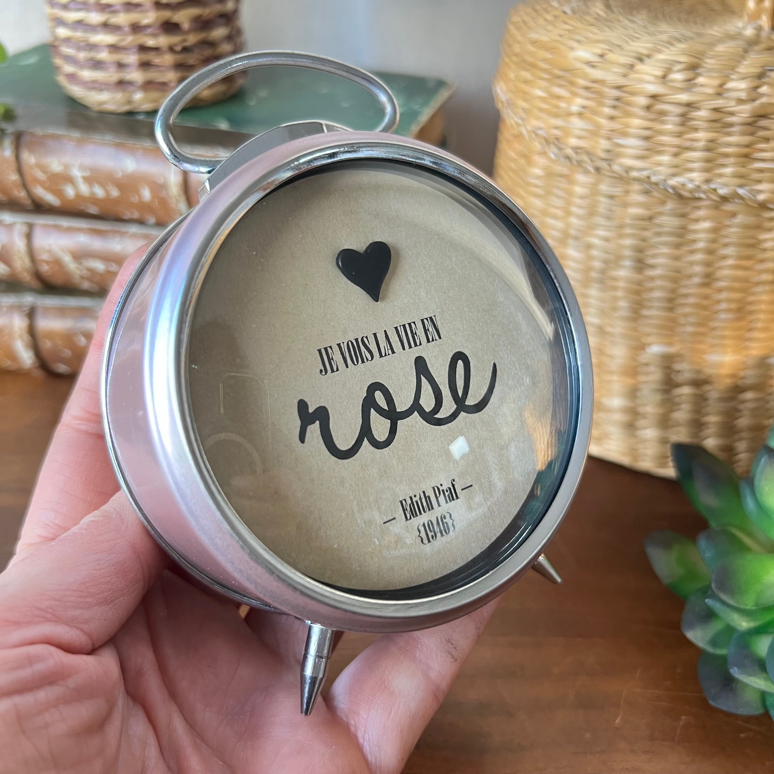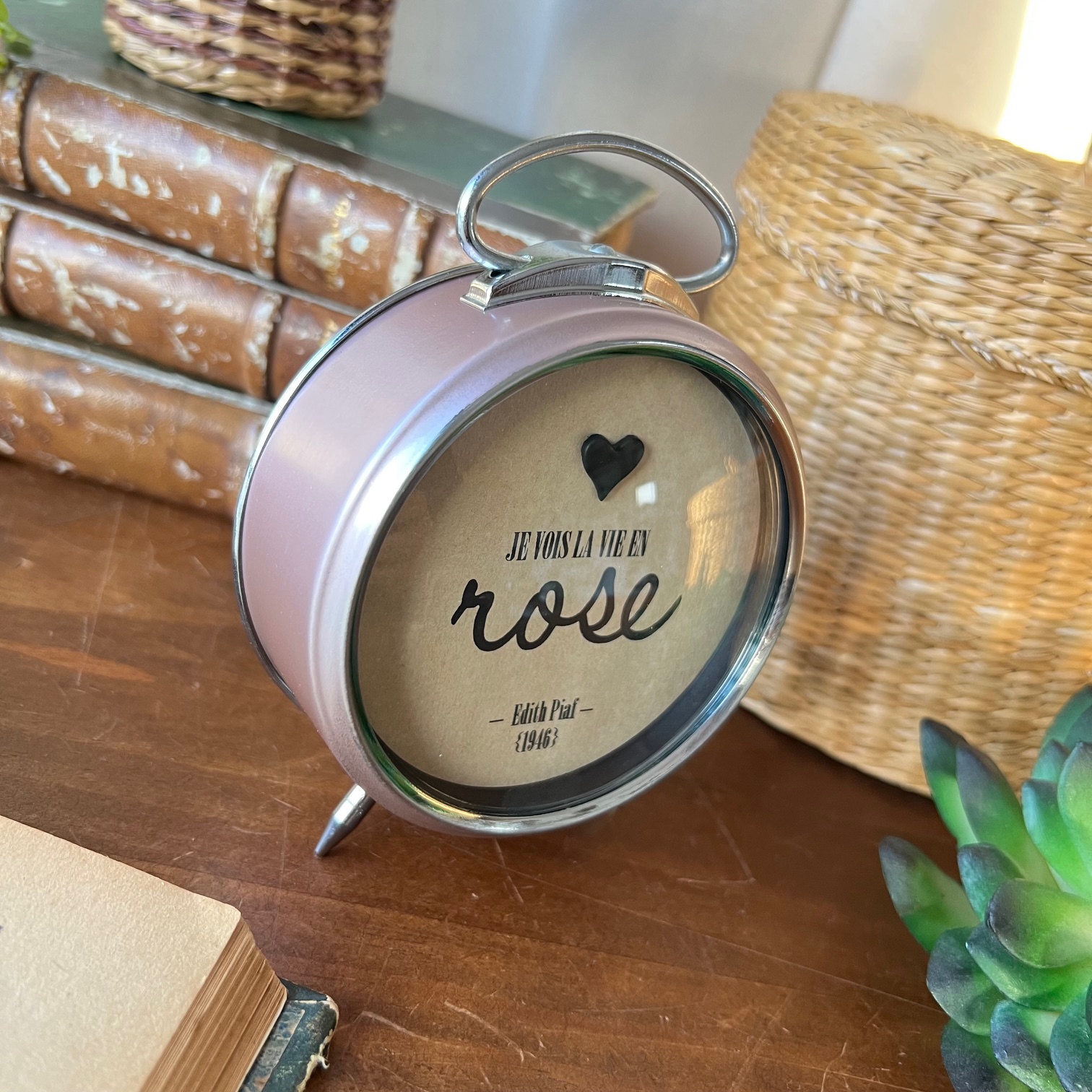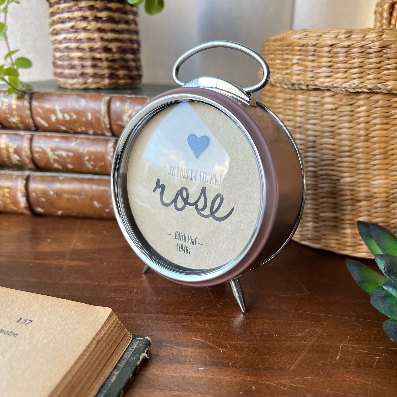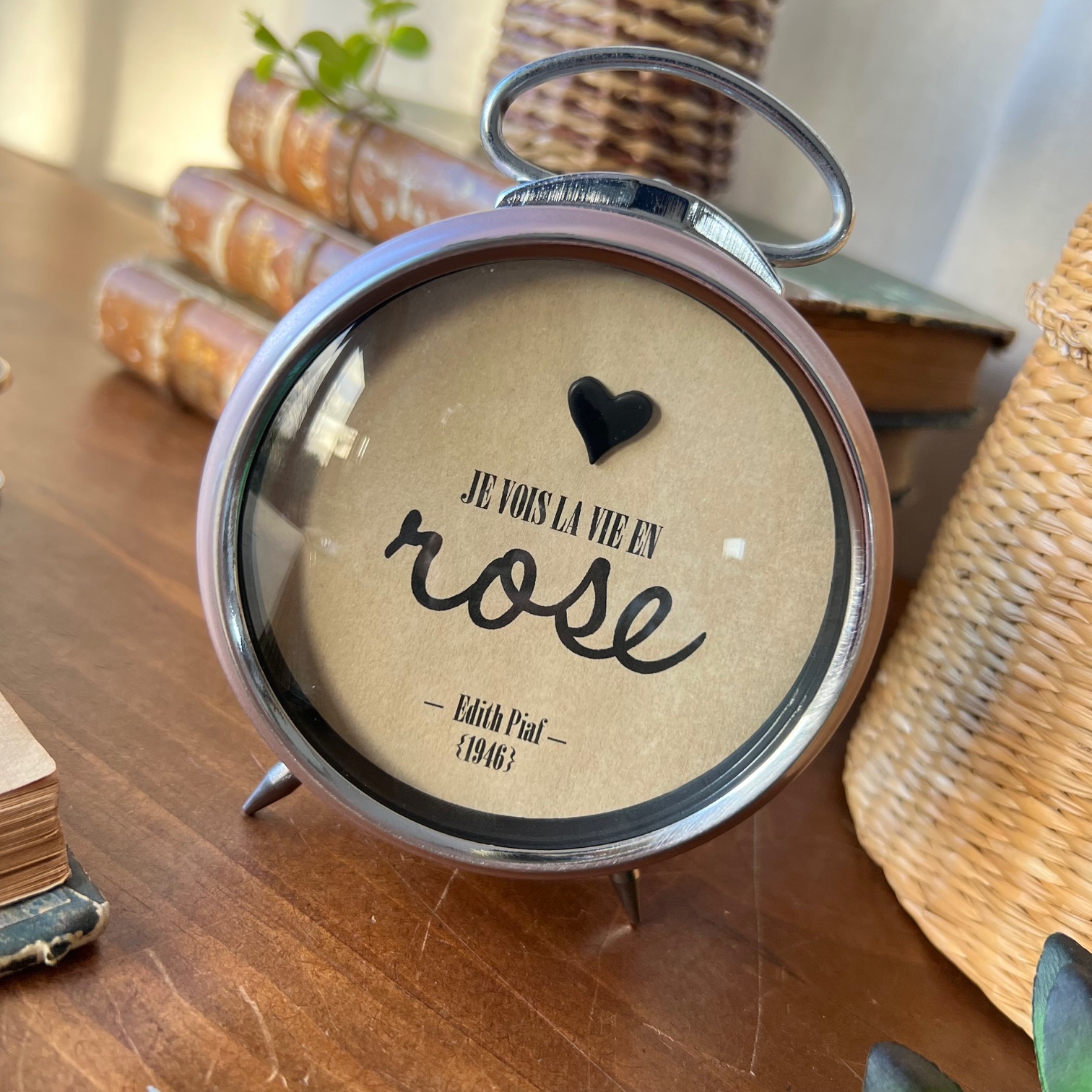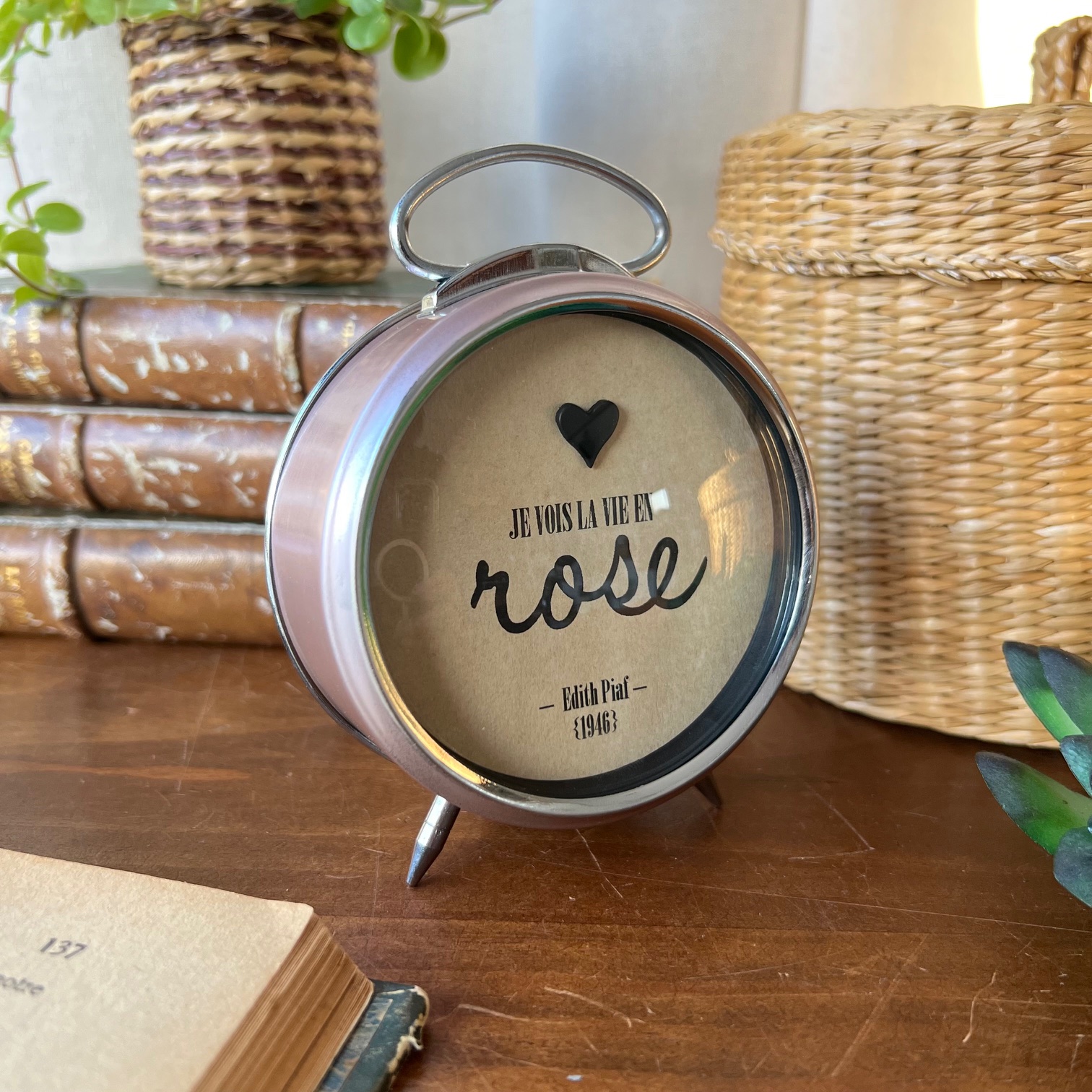 Au centre, cette phrase qui dit tout : « Je vois la vie en rose« . Avec ROSE écrit plus fort, plus grand. Parce que parfois, il faut oser appuyer là où ça fait du bien. En dessous, simplement : Édith Piaf – 1946. Parce que cette chanson traverse les époques comme ce réveil traverse le temps.