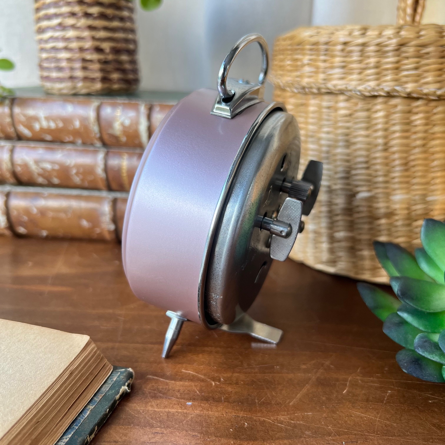 Quand je l’ai récupéré, il ne fonctionnait plus. Le tic-tac s’était tu, le temps avait fait son œuvre. Alors je l’ai détourné, doucement. Je lui ai offert un rose poudré, tendre, presque timide. Le reste est resté argenté, brut, assumé. Deux couleurs qui se répondent, sans se voler la vedette.