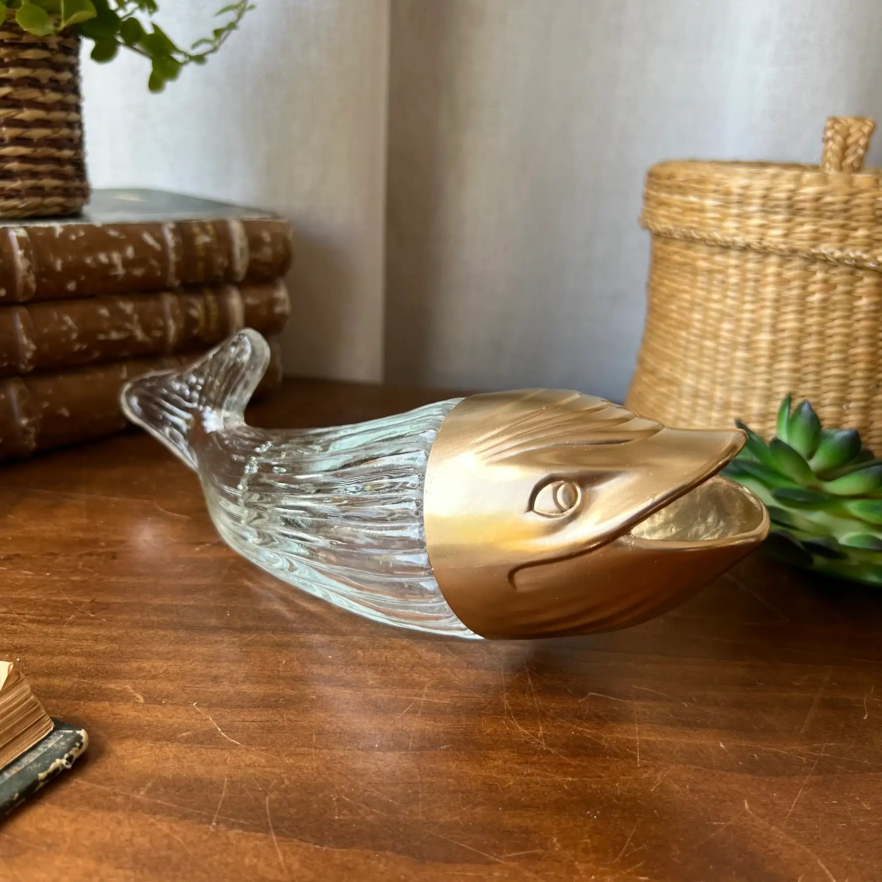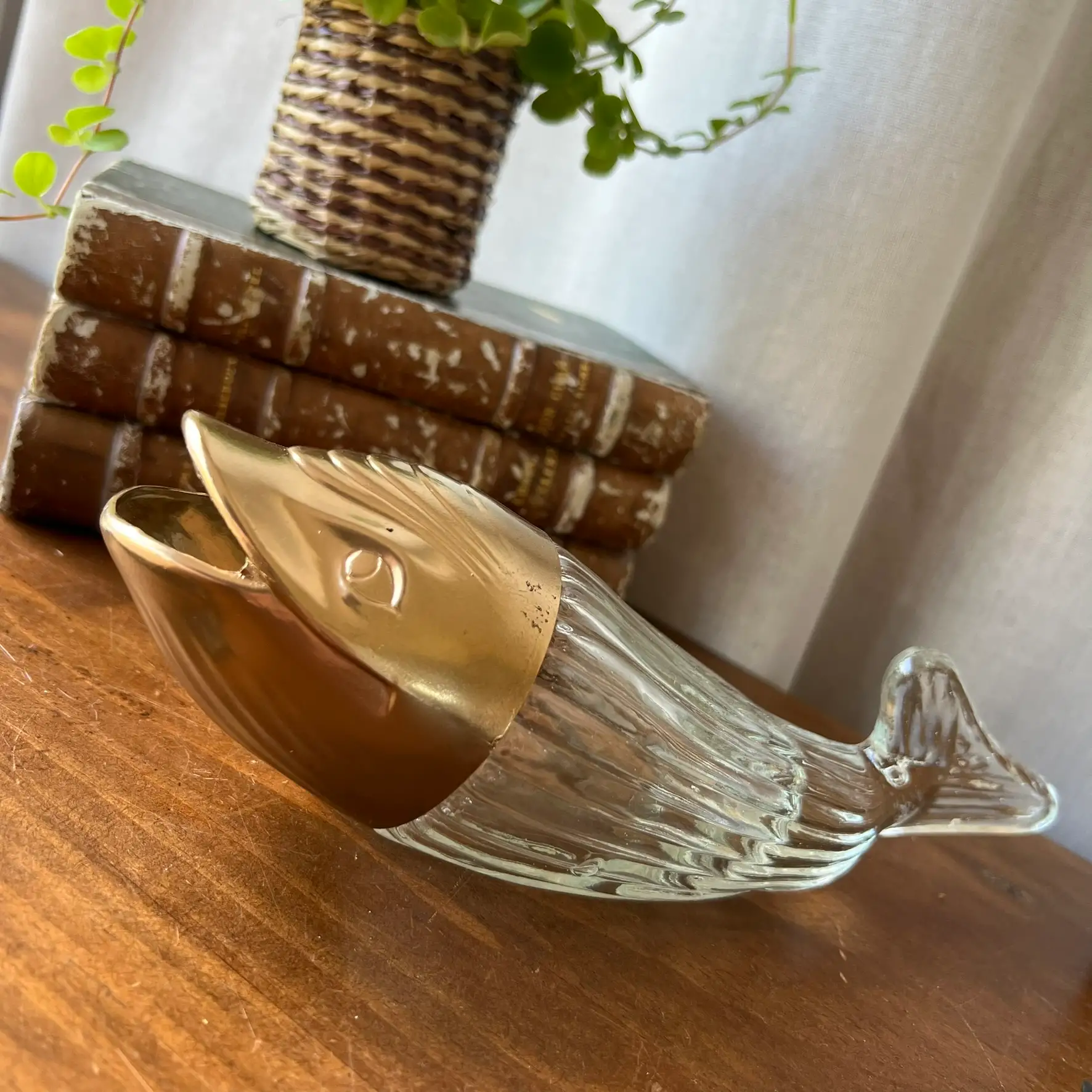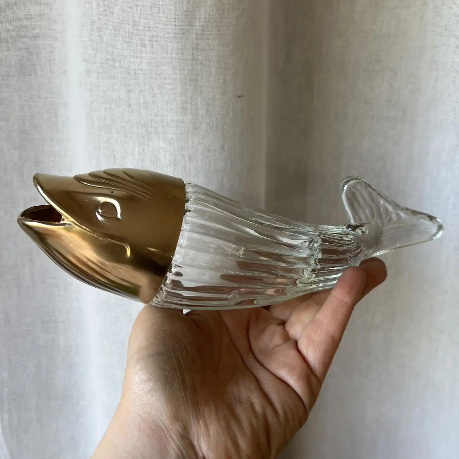 Ce distributeur à cacahuètes en forme de baleine mêle verre et plastique, avec une tête que j’ai reprise en doré pour lui redonner une seconde vie. Parfait pour l’apéro, mais aussi comme objet déco plein de personnalité. Typiquement le genre de pièce qu’on remarque… et qu’on garde.