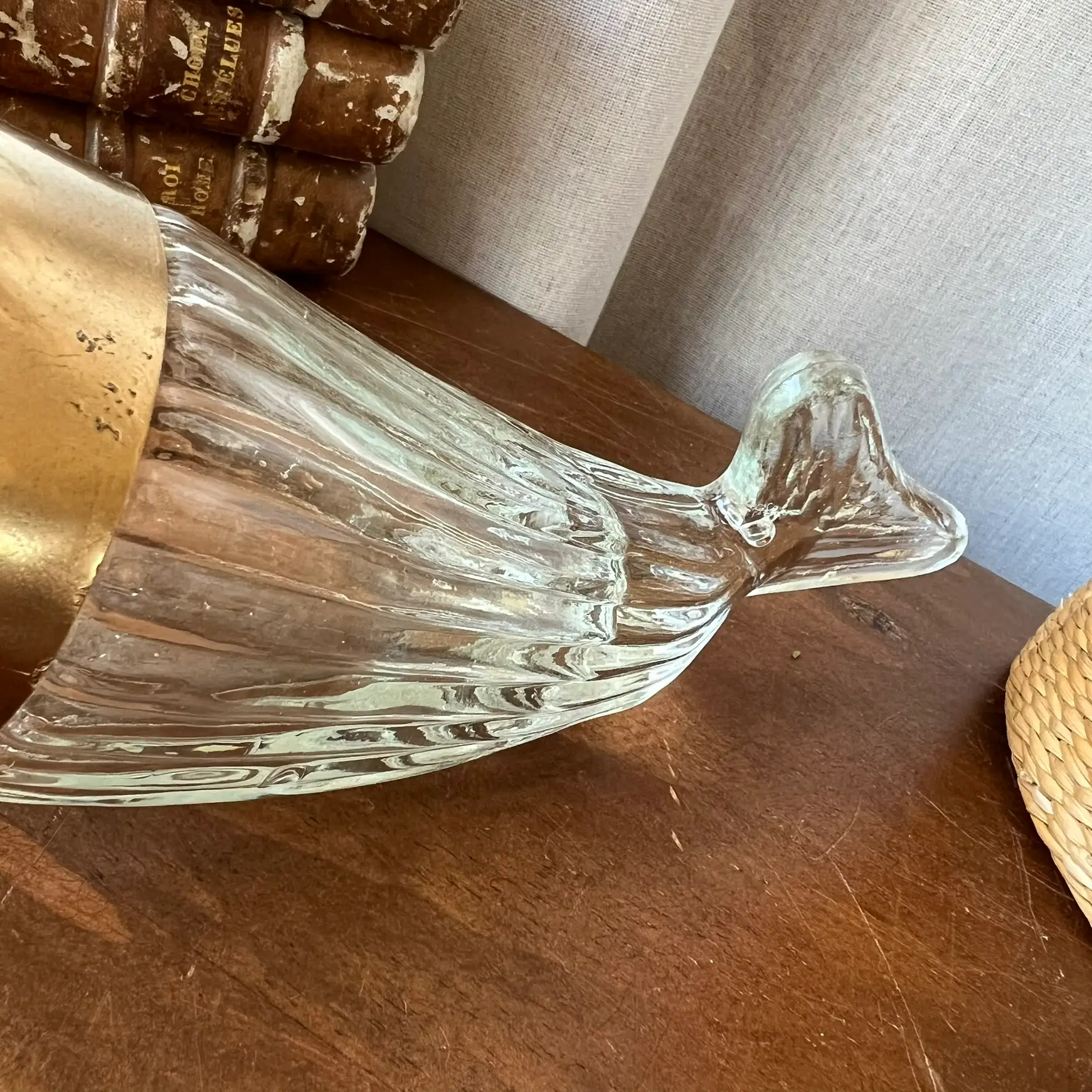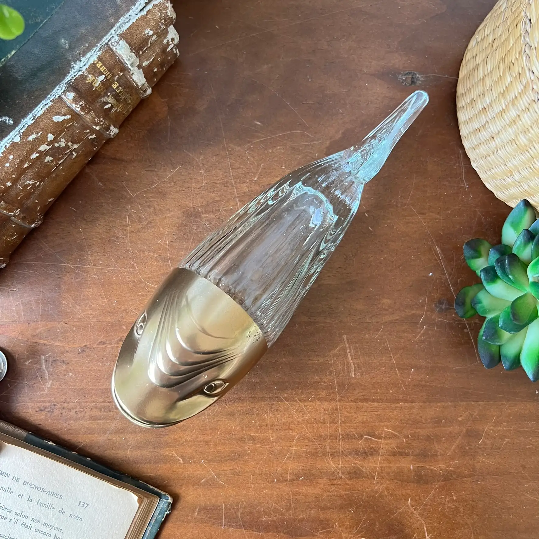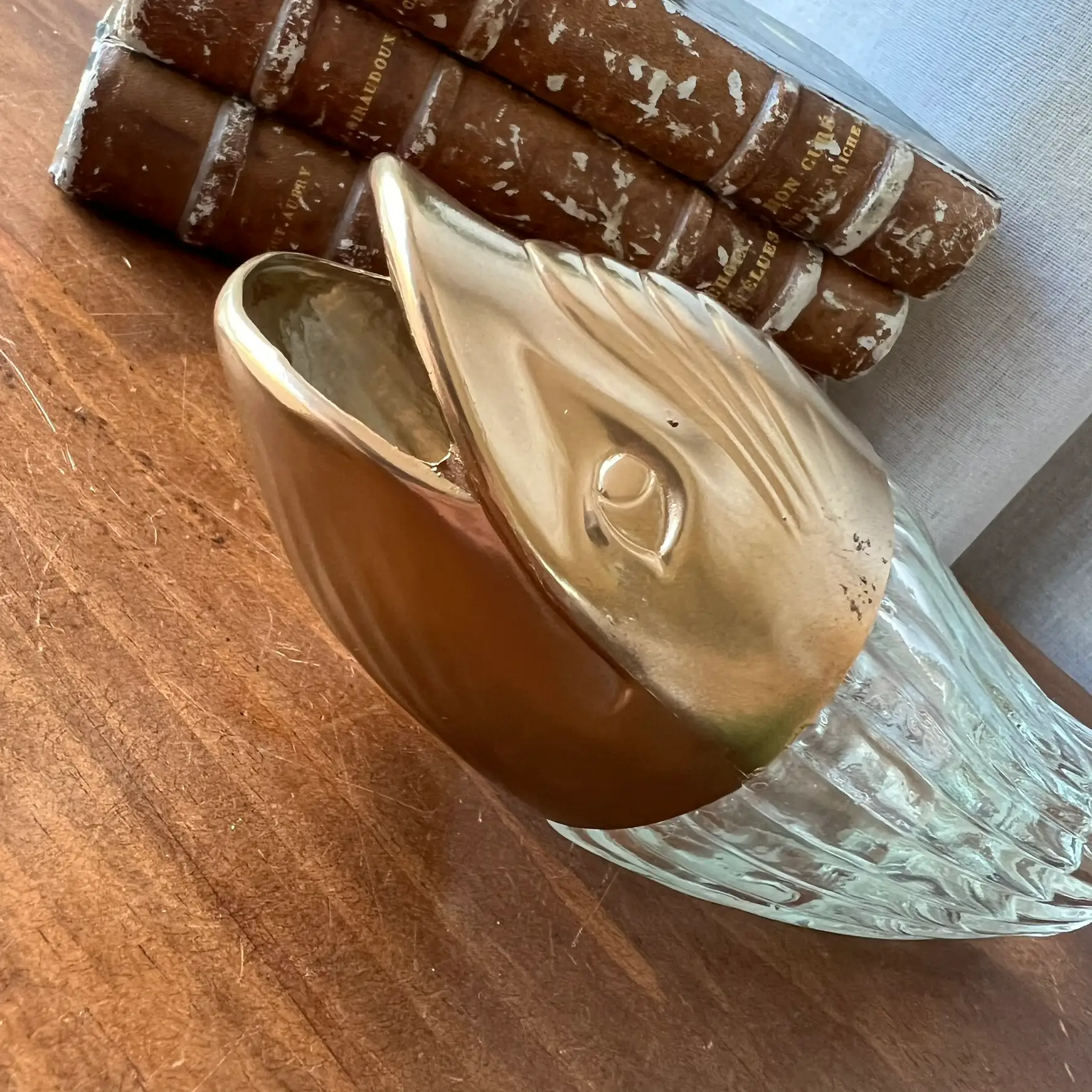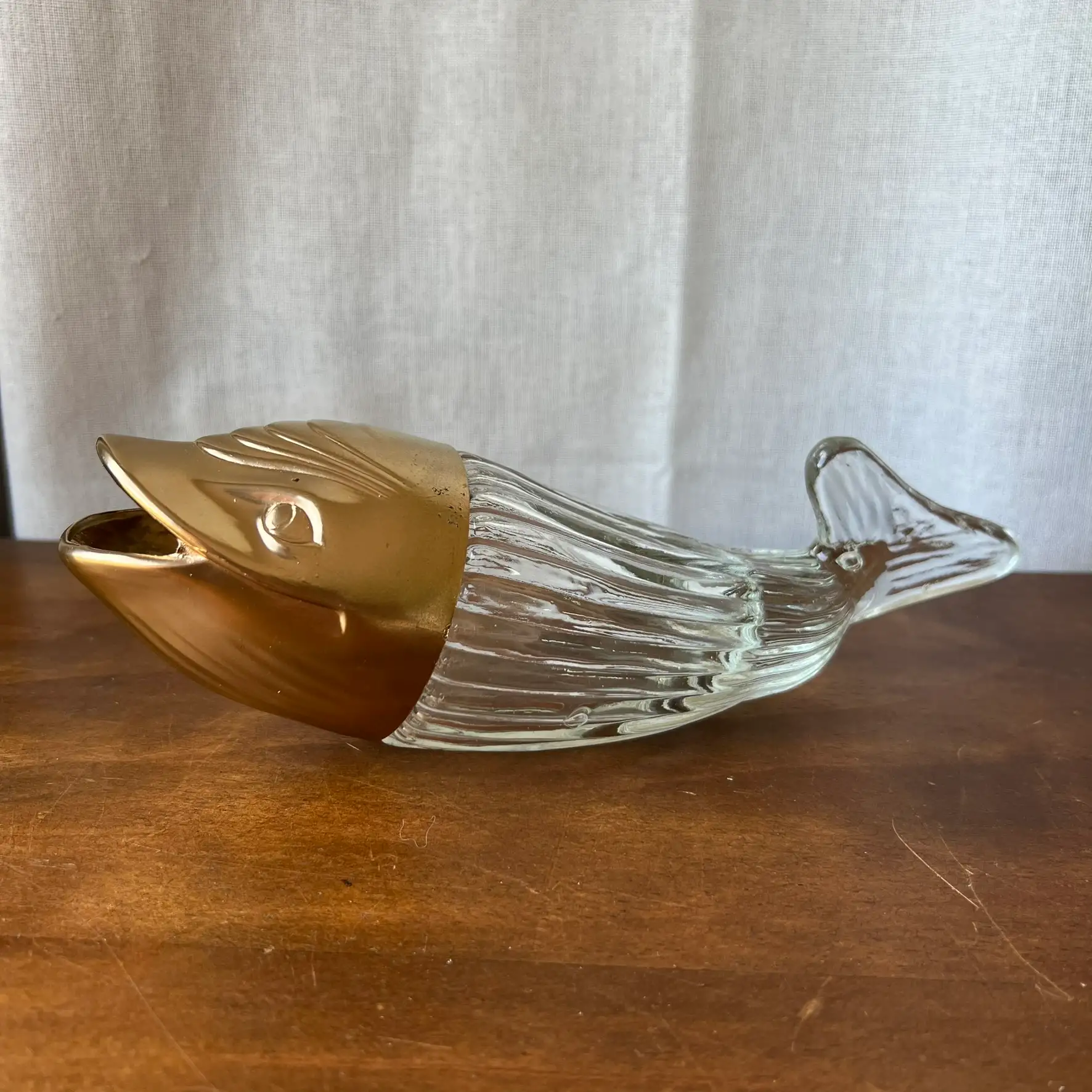 Ce distributeur à cacahuètes en forme de baleine mêle verre et plastique, avec une tête que j’ai reprise en doré pour lui redonner une seconde vie. Parfait pour l’apéro, mais aussi comme objet déco plein de personnalité. Typiquement le genre de pièce qu’on remarque… et qu’on garde.