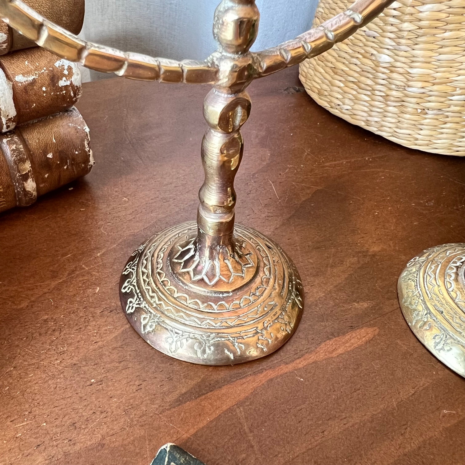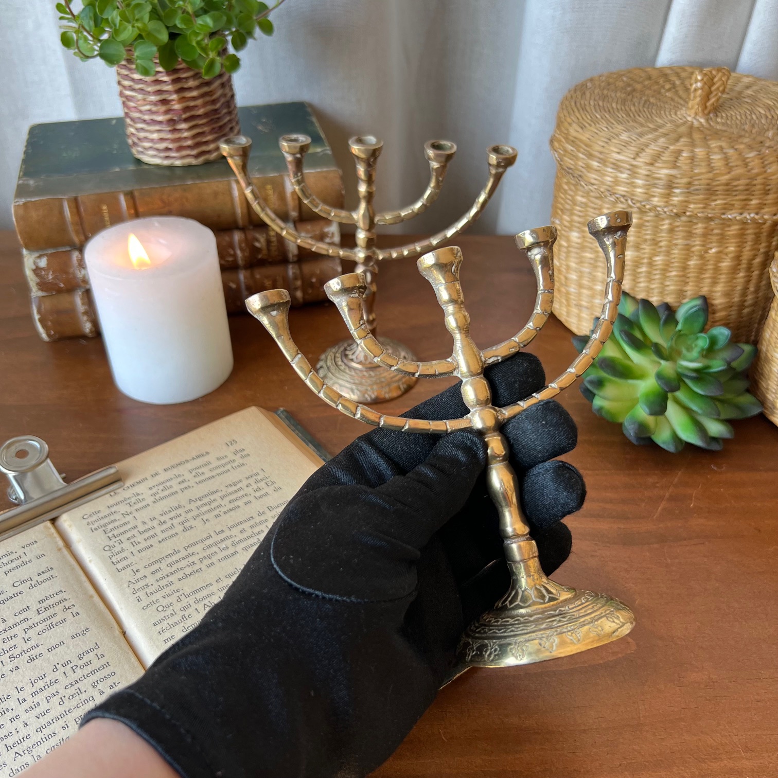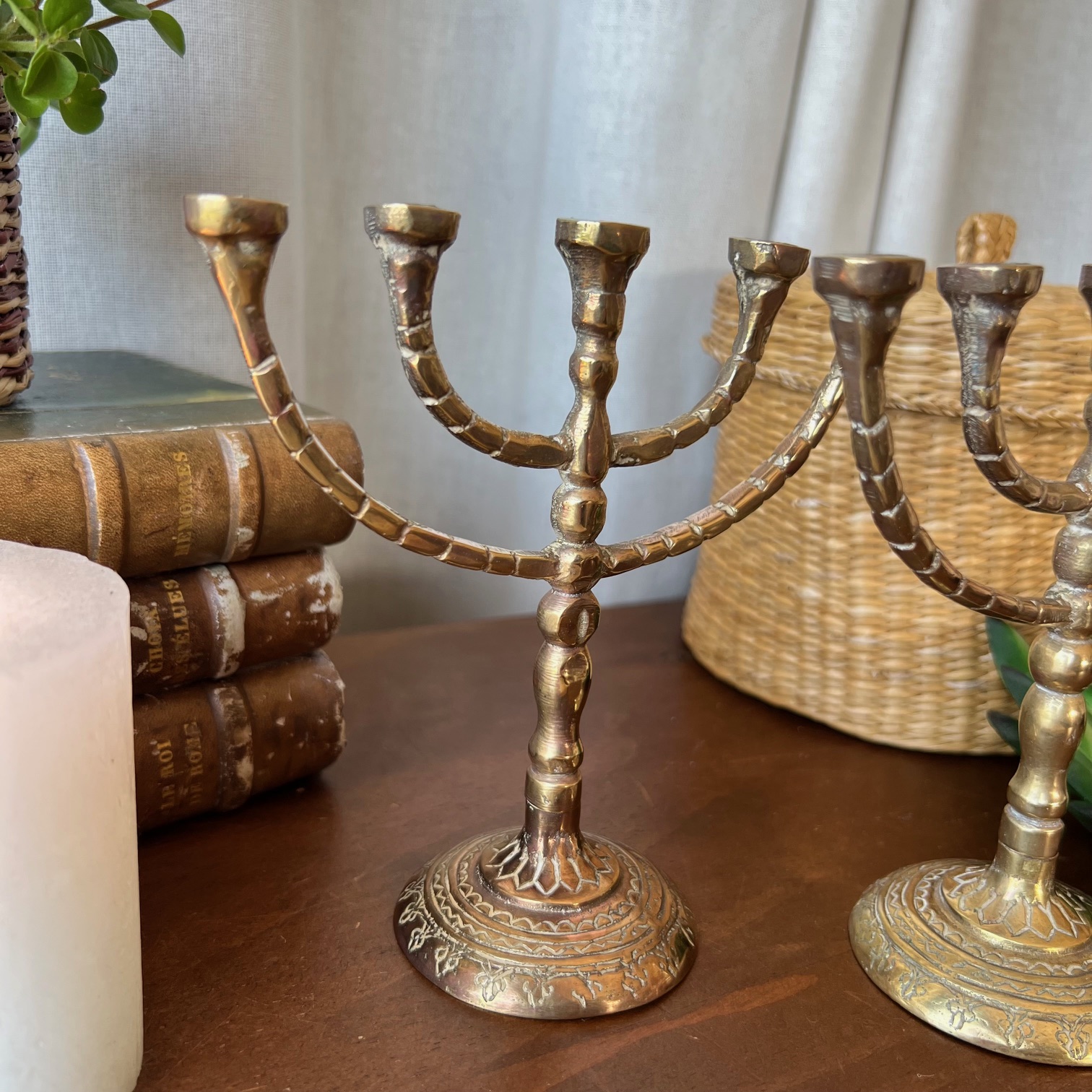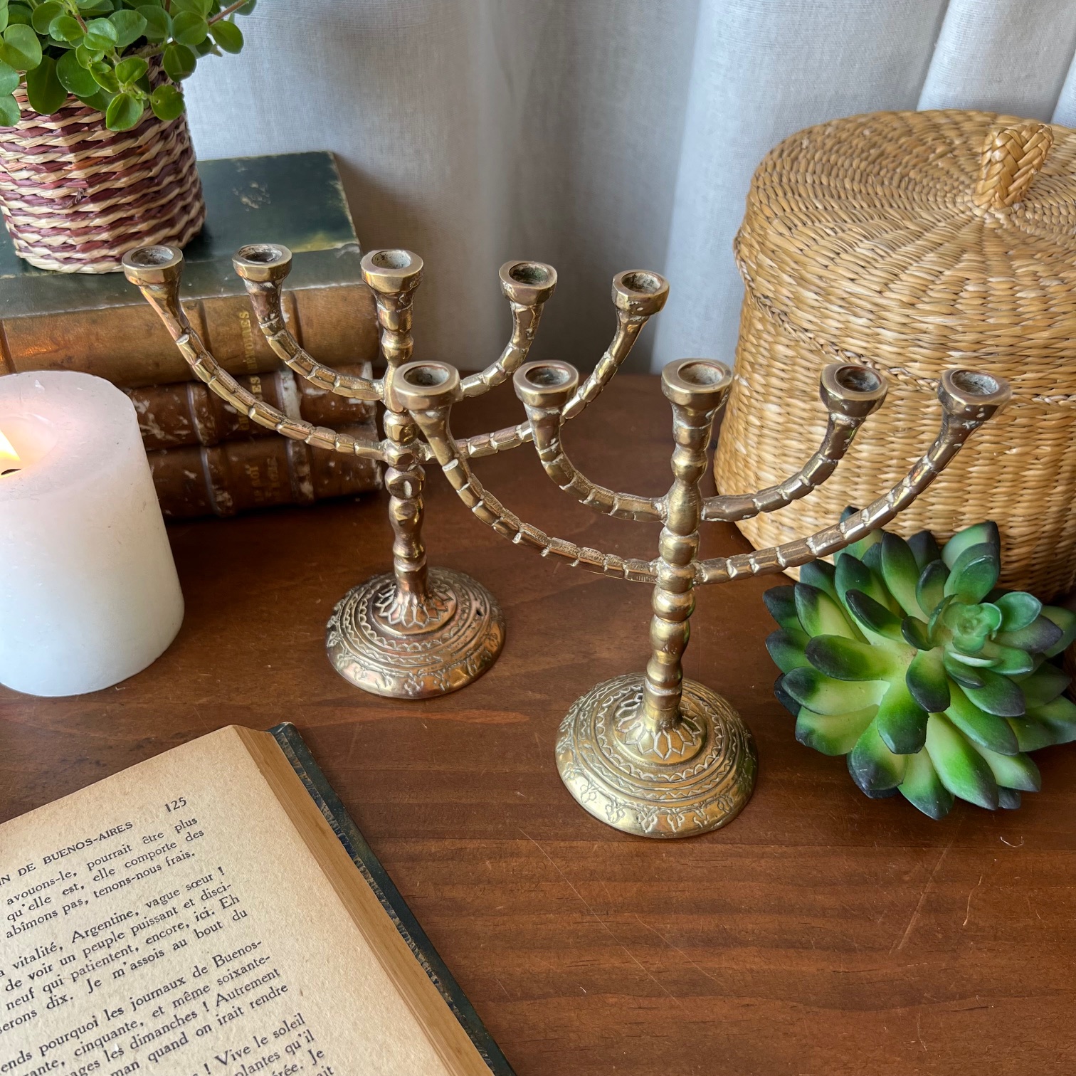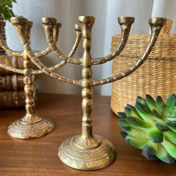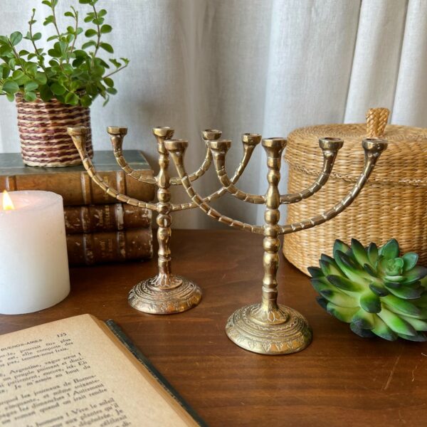 Coup de cœur pour ce duo de Ménorah à 5 bras de lumière. En laiton, ce duo arbore une très belle patine dorée. La menorah, le chandelier du Temple de Jérusalem, est devenue l’un des symboles les plus puissants de l’identité juive après la destruction du Temple. Symbole même du Temple, elle représente l’espoir du peuple juif en la rédemption, la reconstruction de ce lieu de culte et le retour de jours meilleurs.