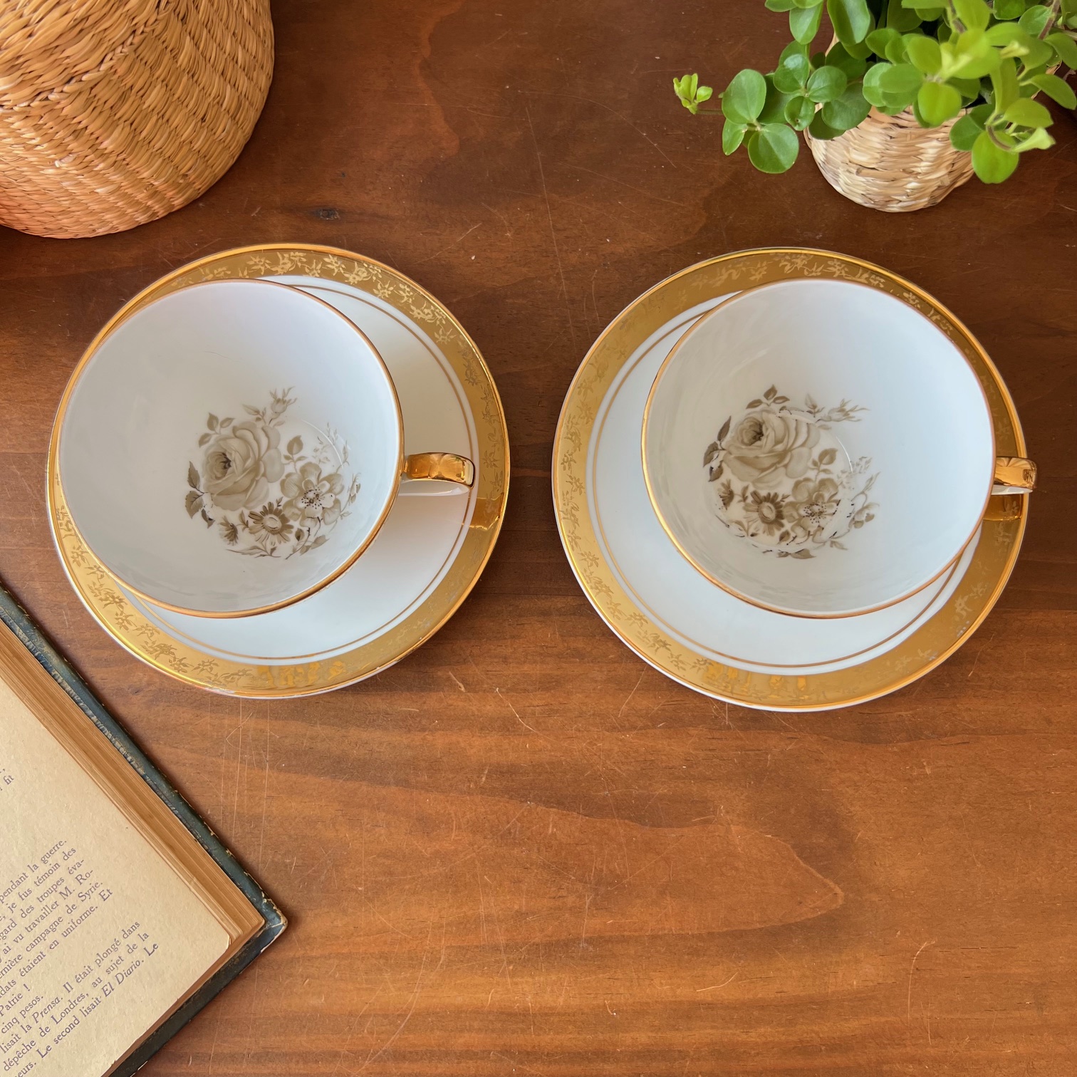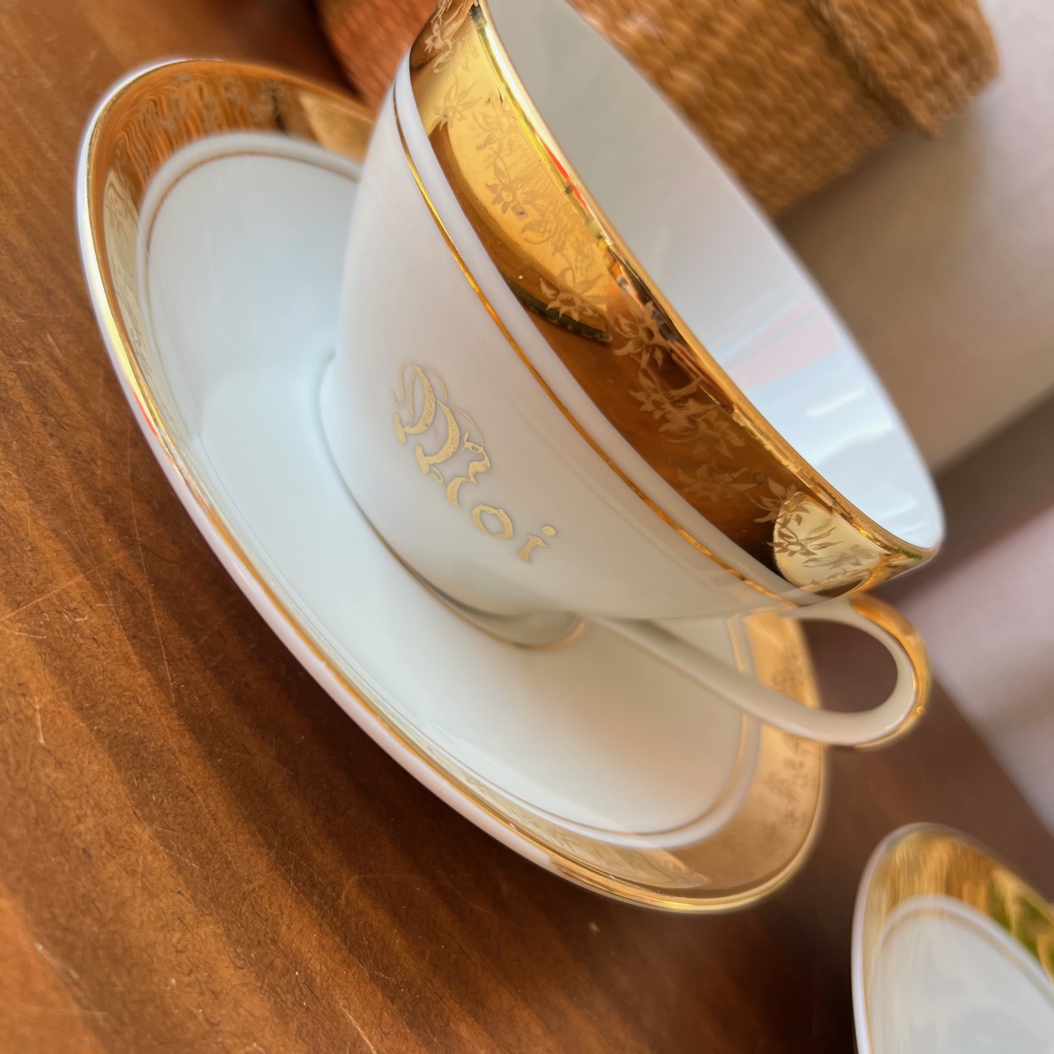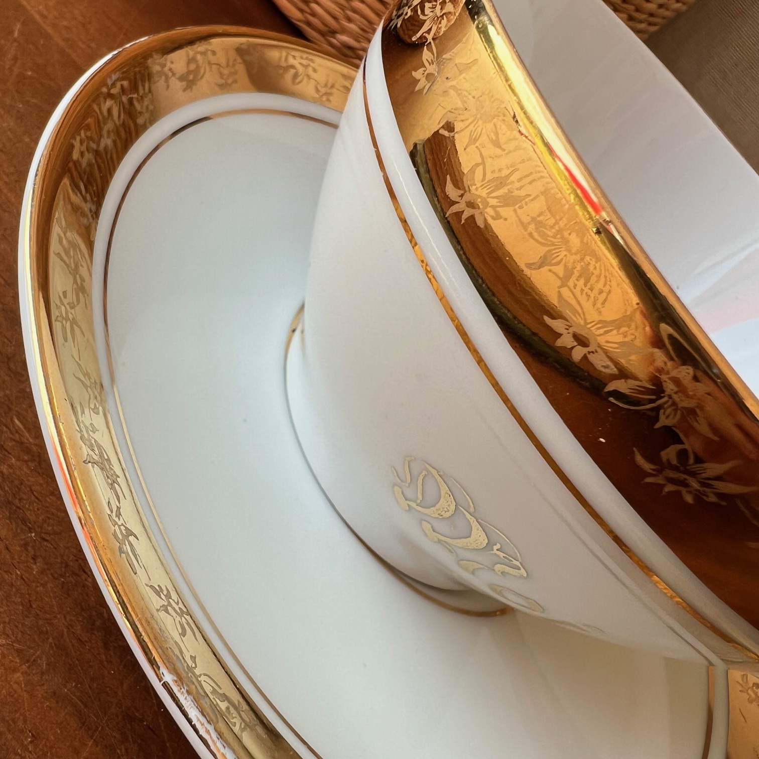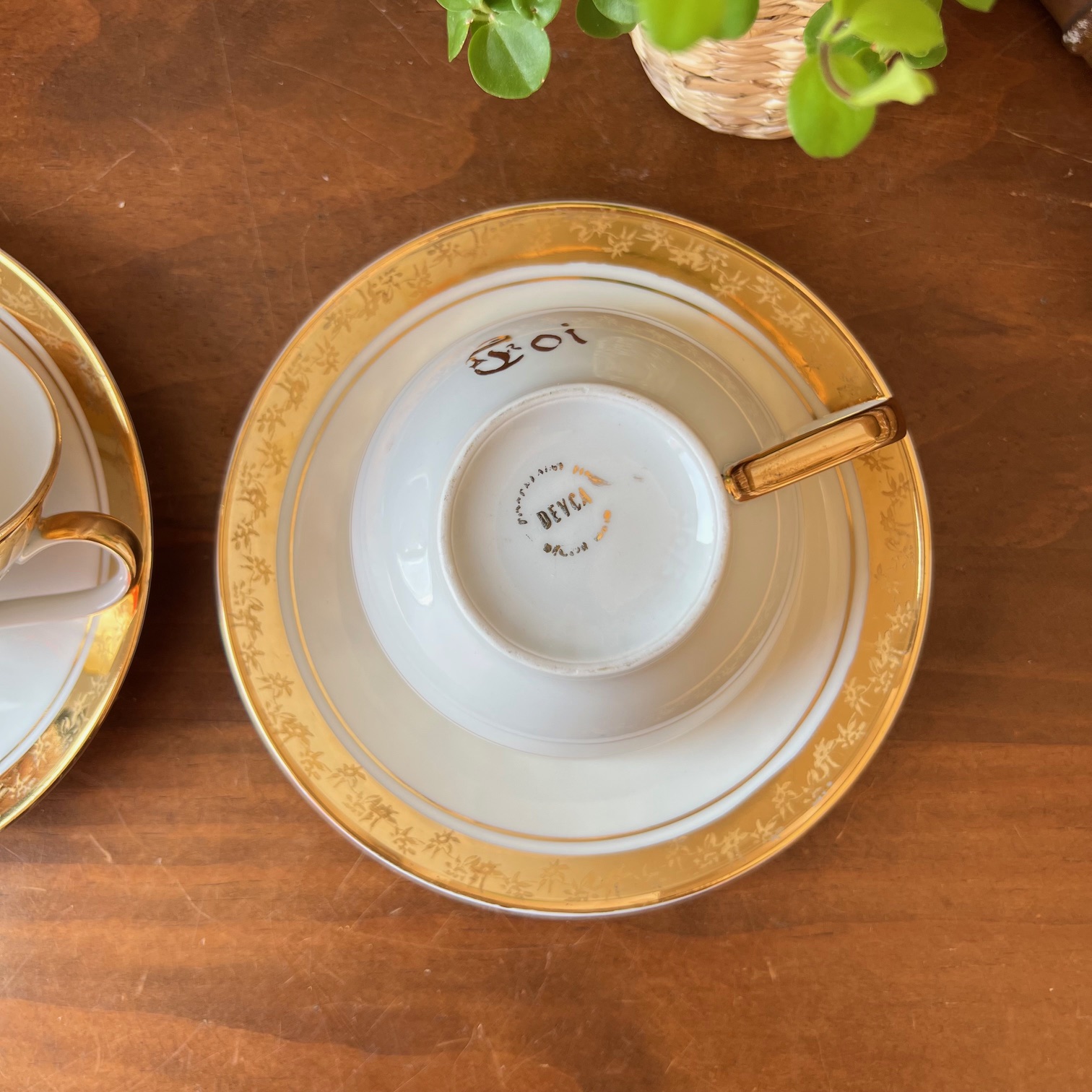 Ce joli duo de tasses blanches soulignées d’un bandeau doré à décor floral, signé FK, a ce je-ne-sais-quoi de romantique et d’intemporel.
