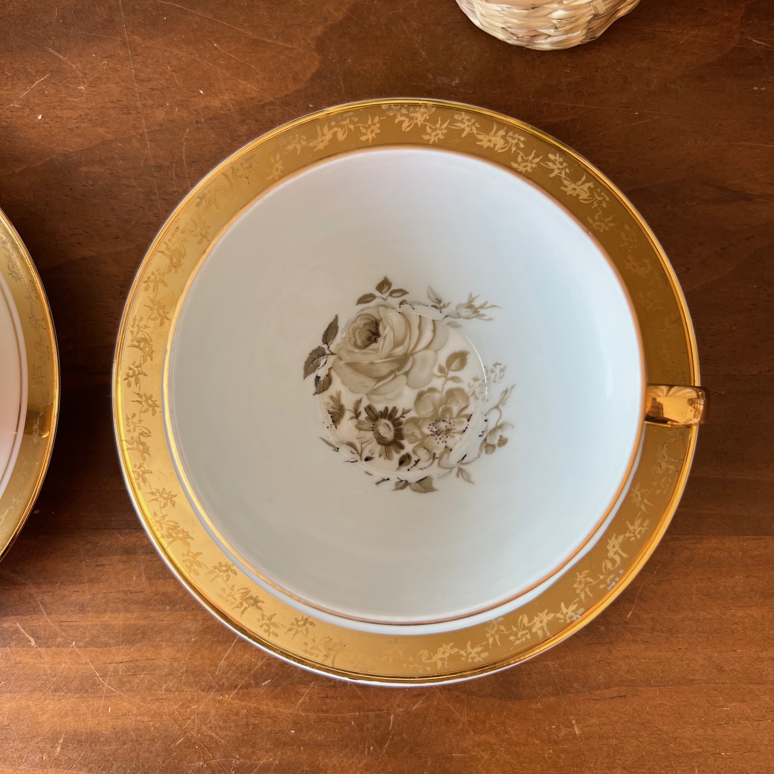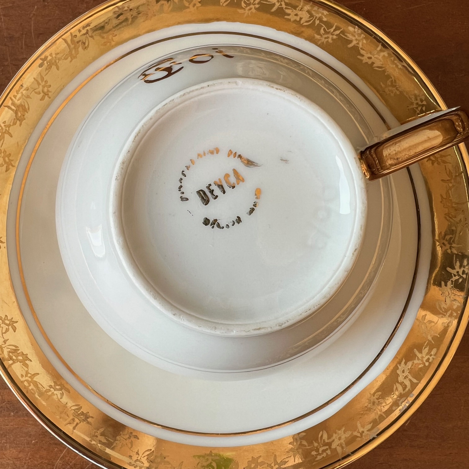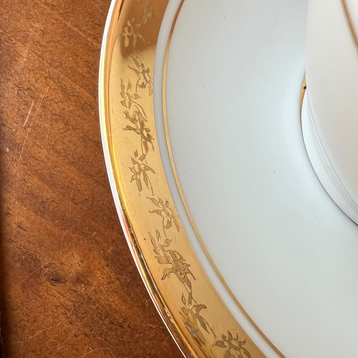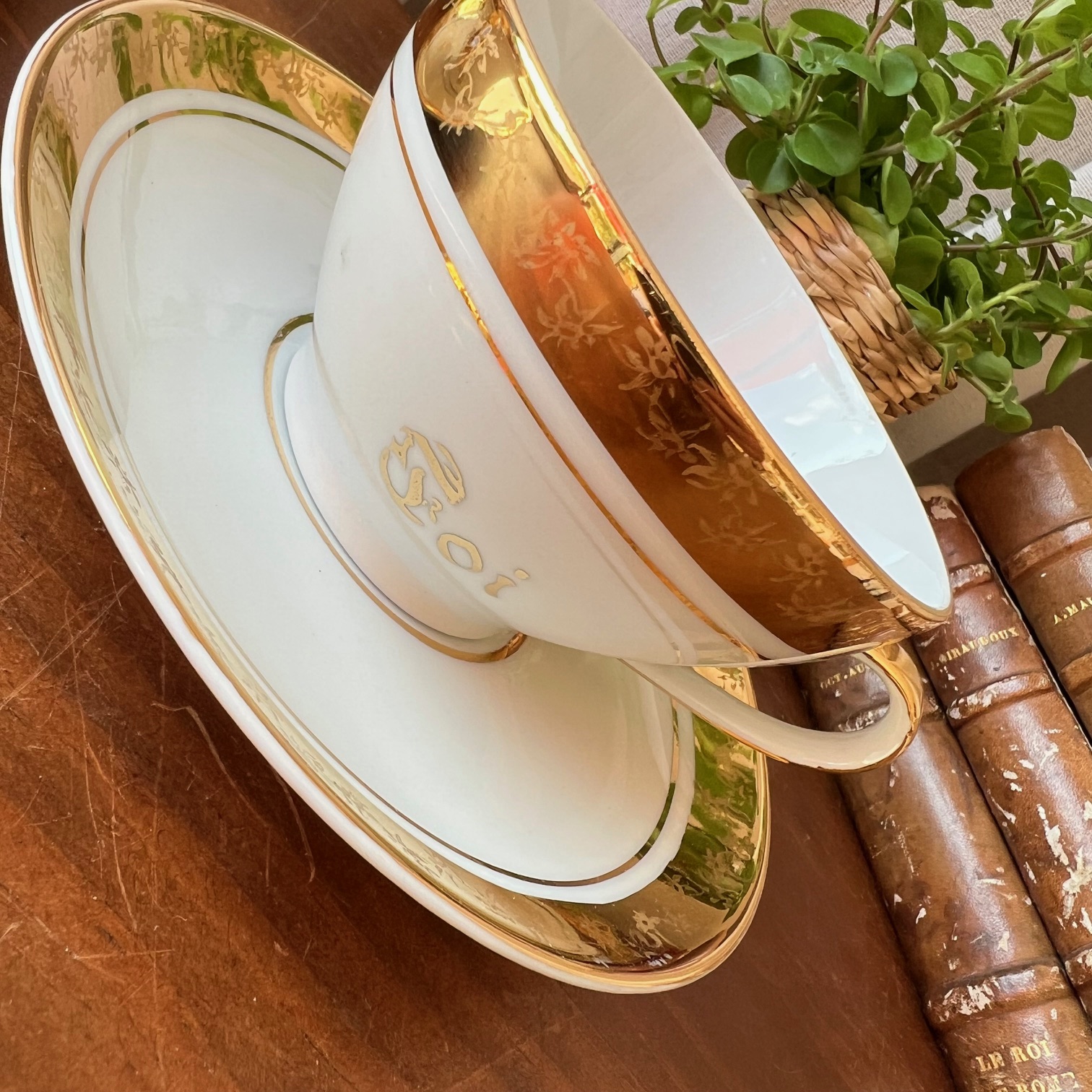 Ce joli duo de tasses blanches soulignées d’un bandeau doré à décor floral, signé FK, a ce je-ne-sais-quoi de romantique et d’intemporel.