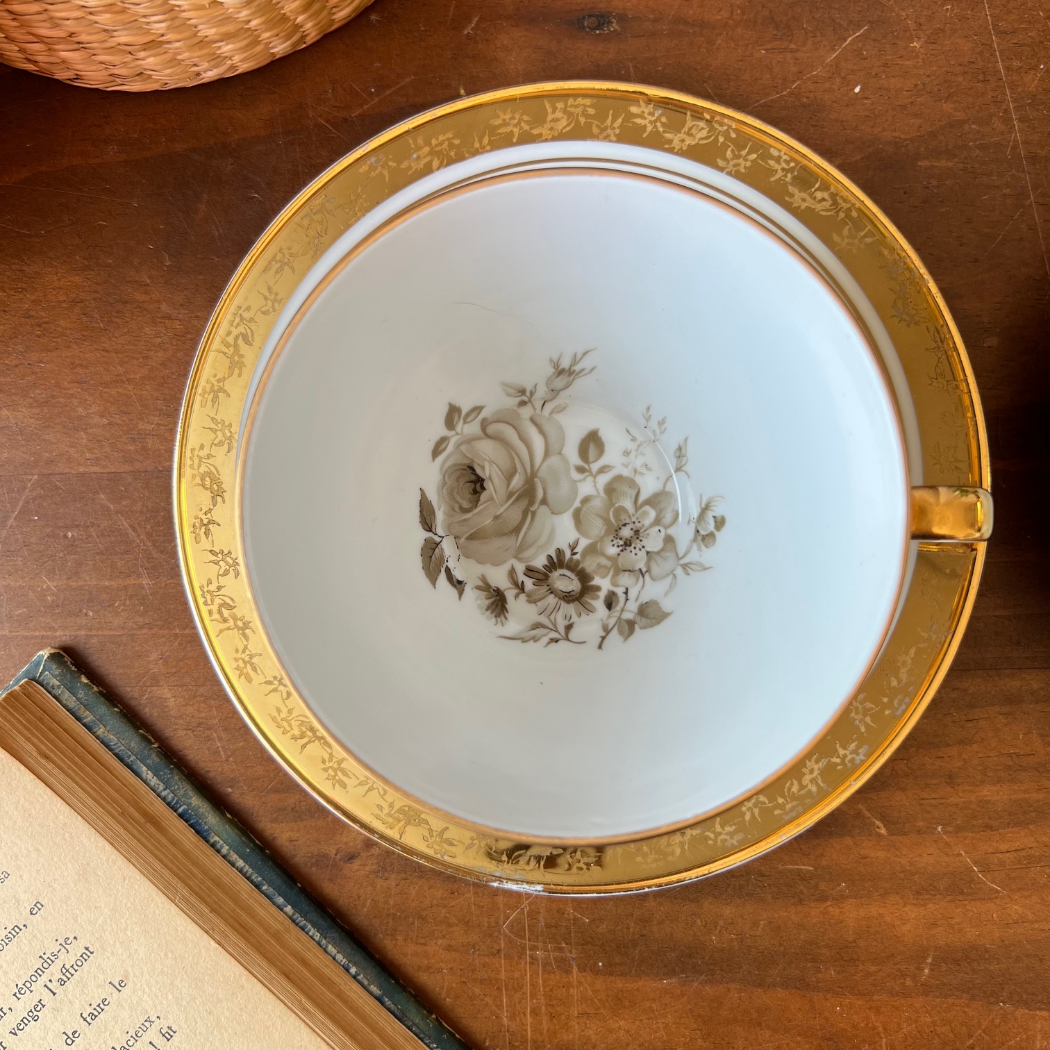 Et quand la tasse se vide… un bouquet se révèle, niché au fond comme un secret : des roses dans les tons bruns et vieux rose, presque sépia, comme une image fanée qu’on aime revoir.