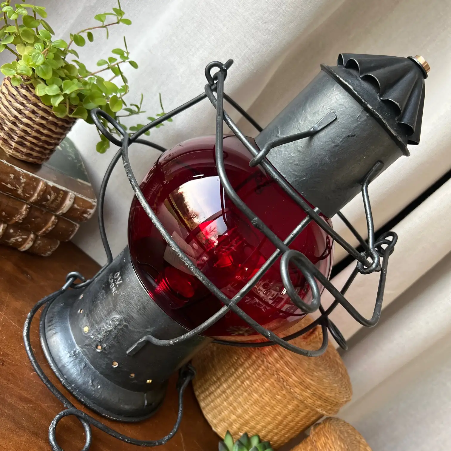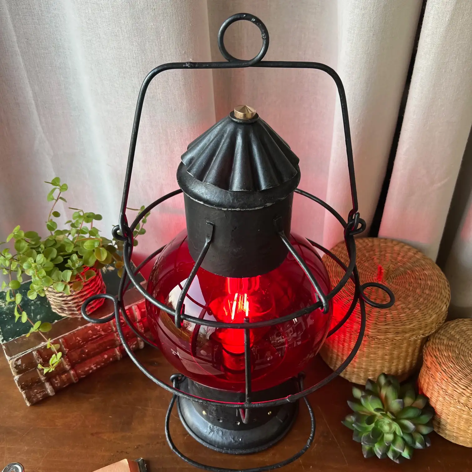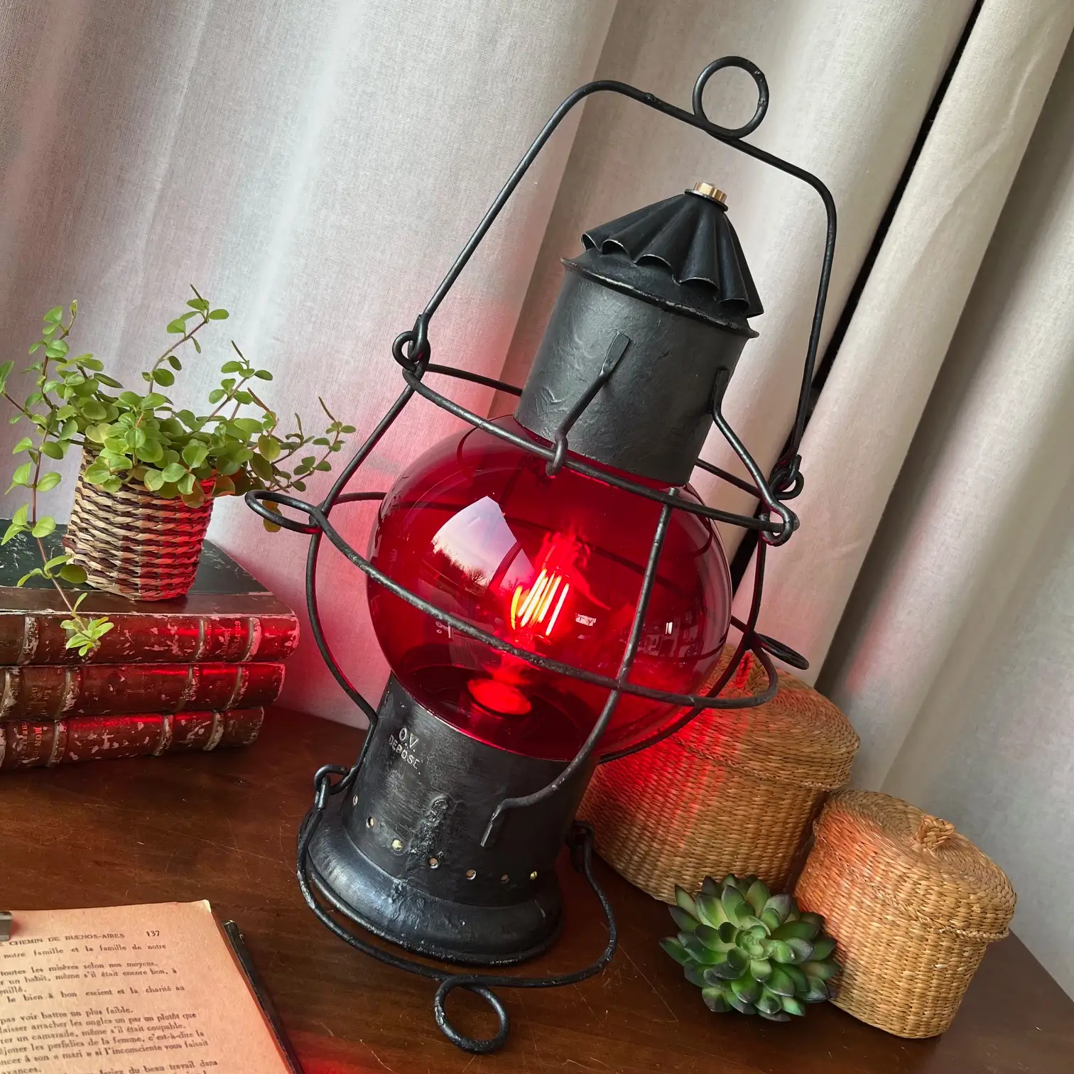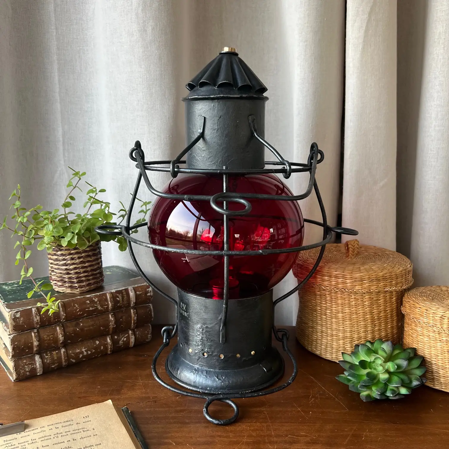 Ce fanal ancien a traversé le temps avec sa structure robuste et son globe rouge, autrefois porteur de messages essentiels. Restauré avec soin, il a conservé ce qui fait son âme : une armature en métal aux lignes franches, une patine noircie subtilement reprise, et ces petits accents dorés qui accrochent la lumière juste ce qu’il faut.