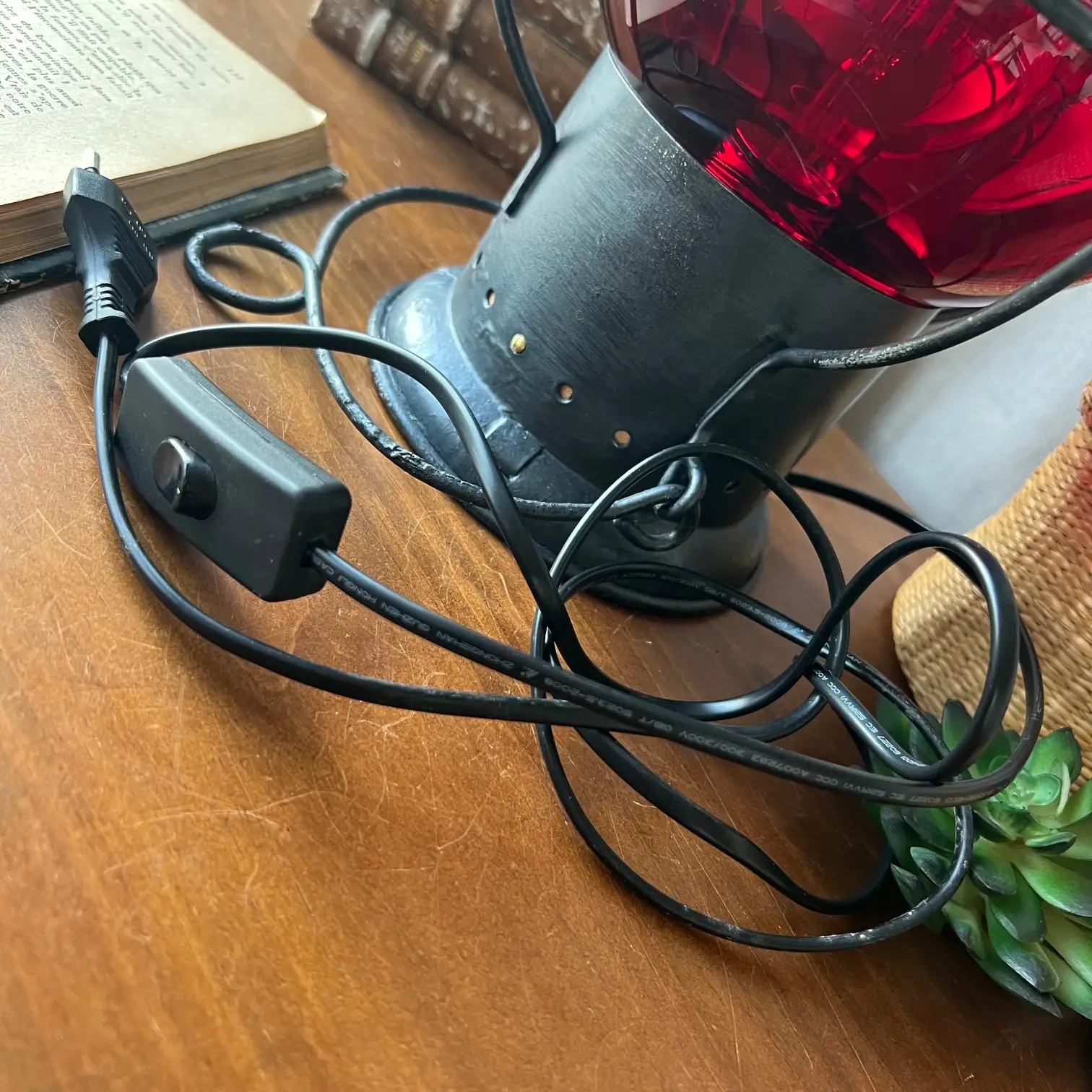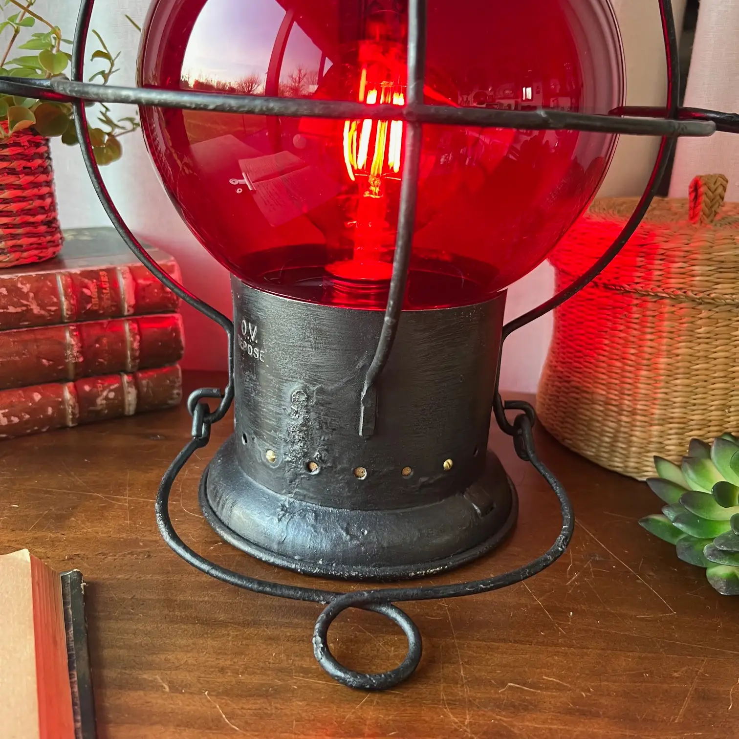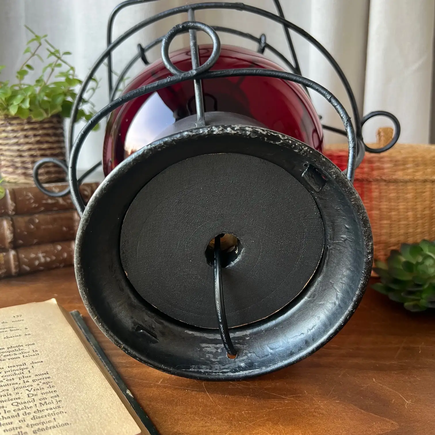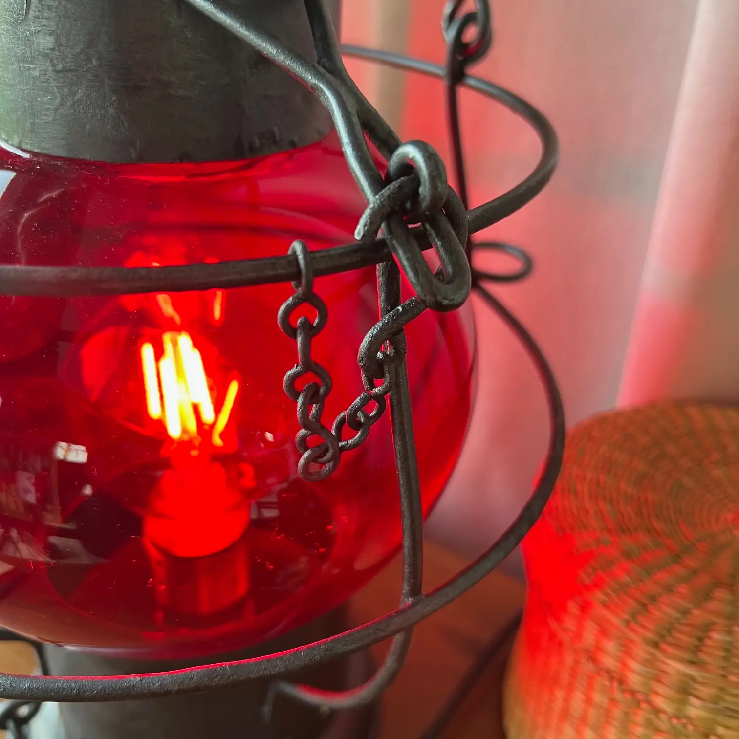 Le globe en verre rouge, en très bel état, diffuse aujourd’hui une lumière chaude et enveloppante. À l’intérieur, une ampoule ronde neuve vient révéler toute la profondeur de cette teinte si particulière, presque vivante selon l’intensité.