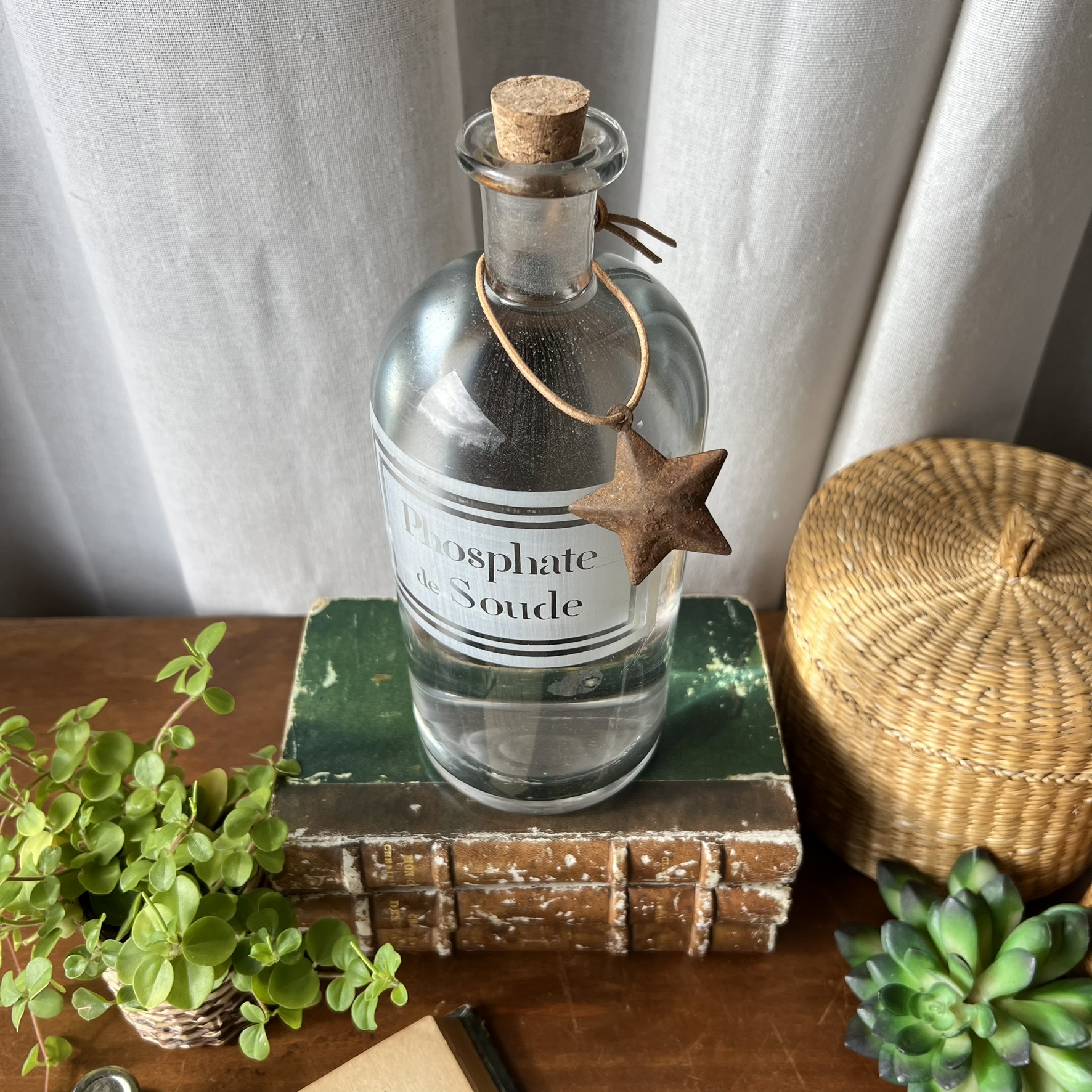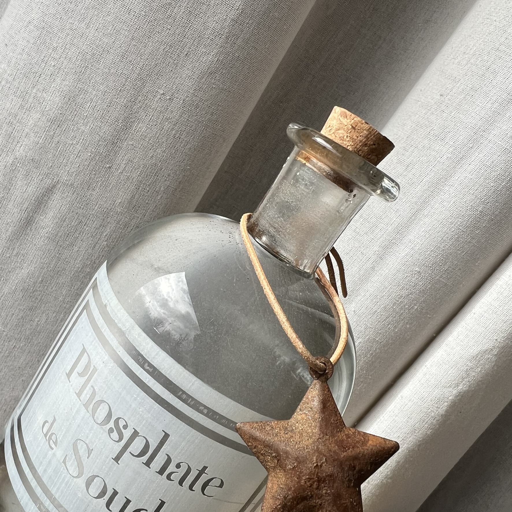 Quelques dépôts subsistent malgré un nettoyage minutieux — traces du temps que l’on peut atténuer en le remplissant d’eau (comme ici sur les photos), comme un clin d’œil à son usage passé. Son bouchon en liège et la petite étoile en métal nouée sur un lien de cuir lui donnent cette touche « cabinet de curiosité » que j’aime tant.