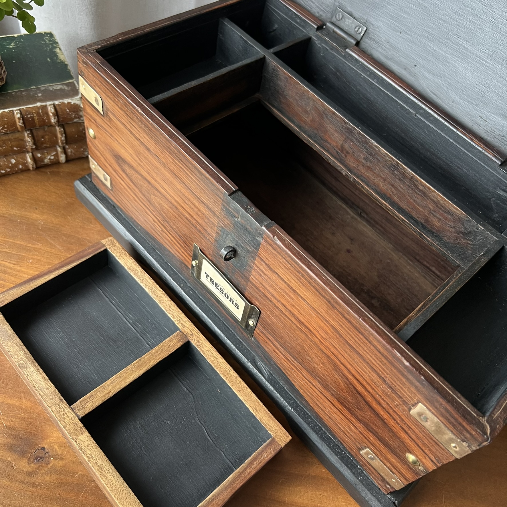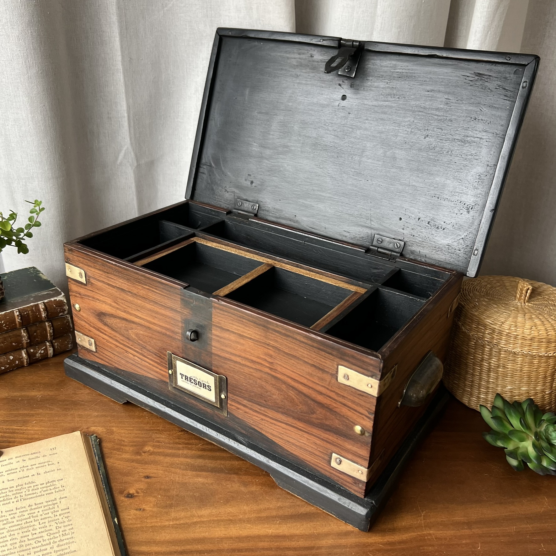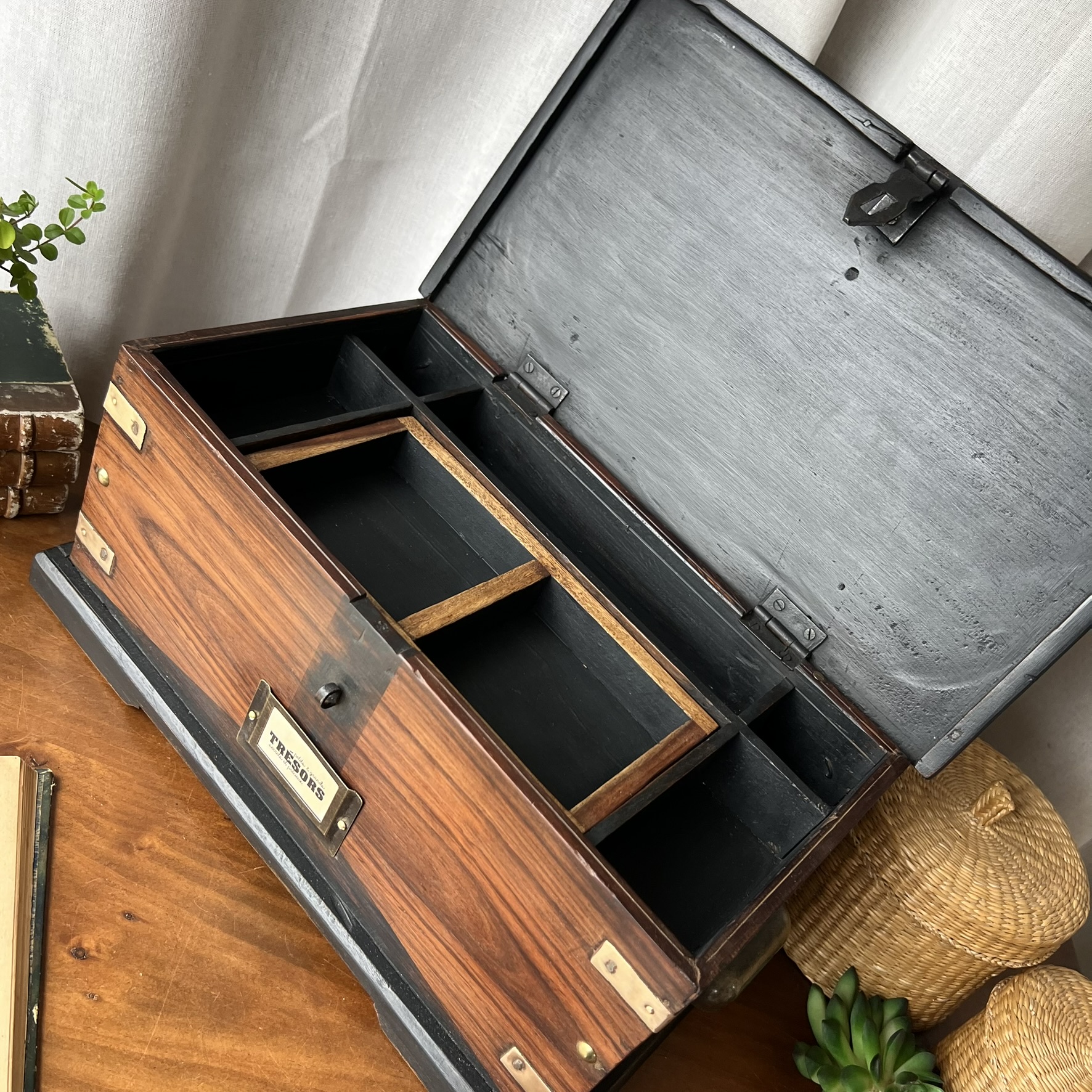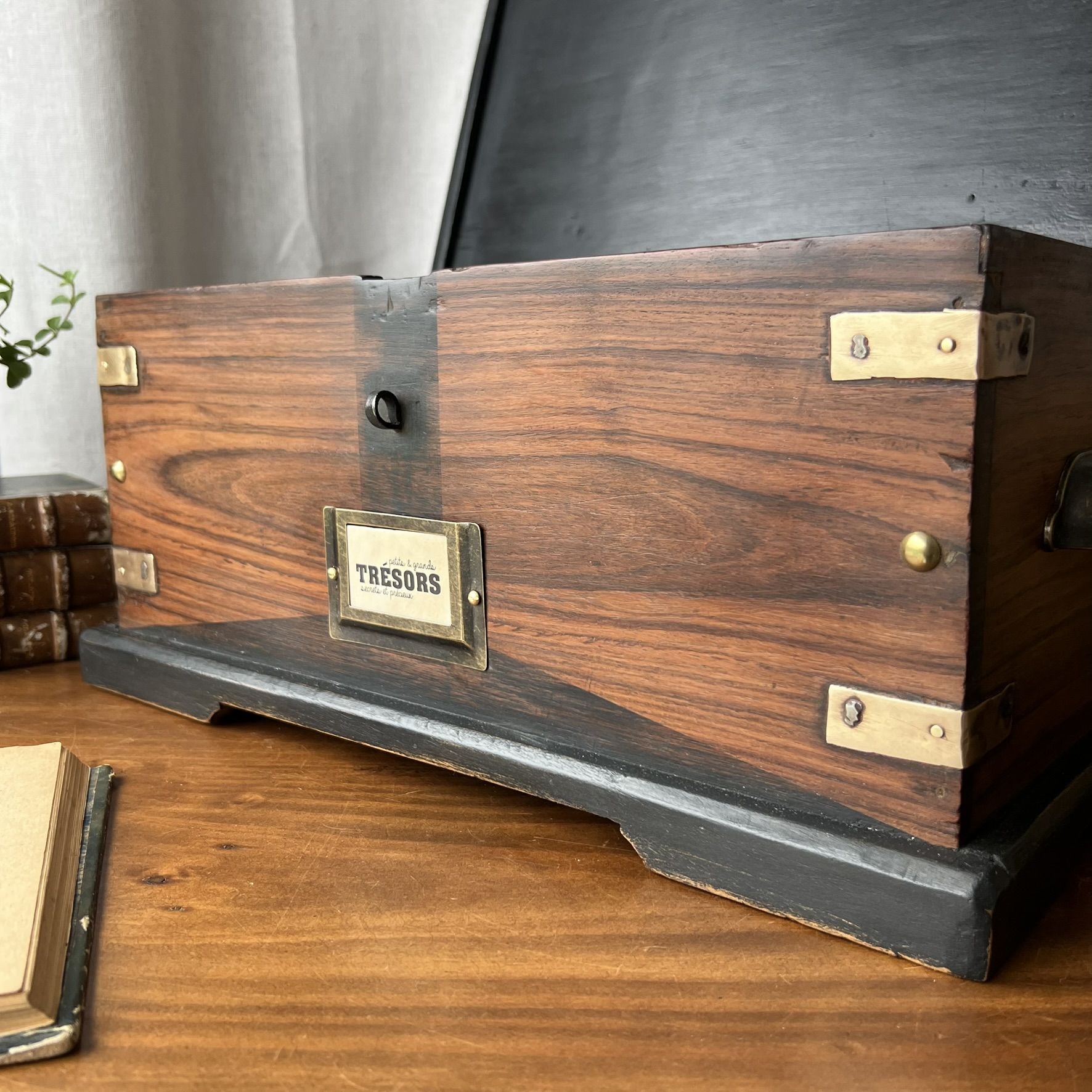 À l’intérieur, un compartiment amovible qui se soulève… et puis soudain, toute la profondeur du coffre se dévoile. Une cachette dans la cachette. Le bois raconte son histoire : des zones brutes, d’autres peintes en noir, patinées par le temps. Rien n’est lisse. Tout est vivant. J’ai ajouté deux poignées latérales pour lui redonner de la mobilité, pour qu’il puisse continuer à voyager.