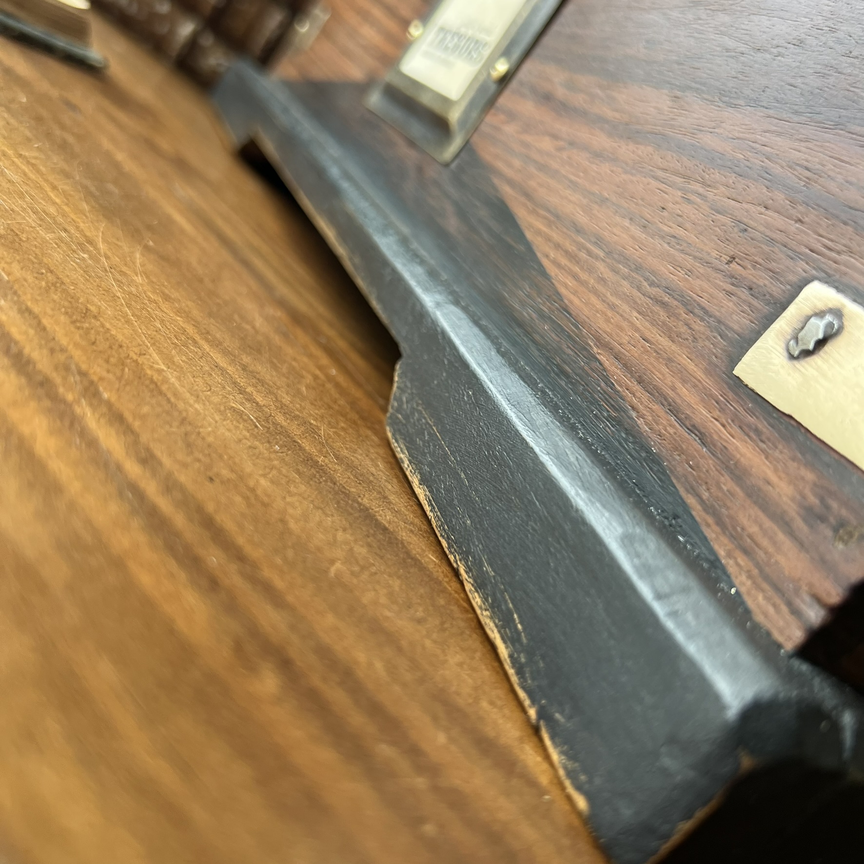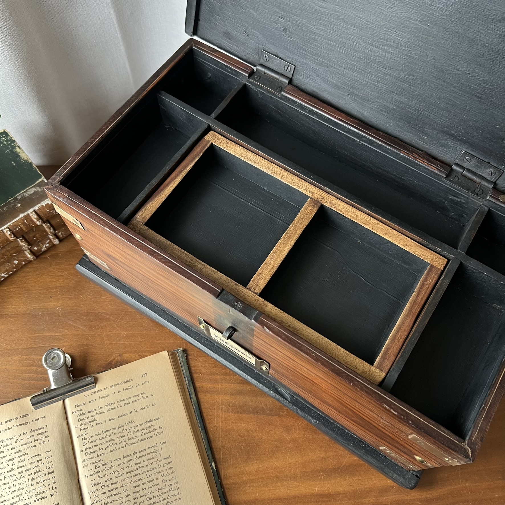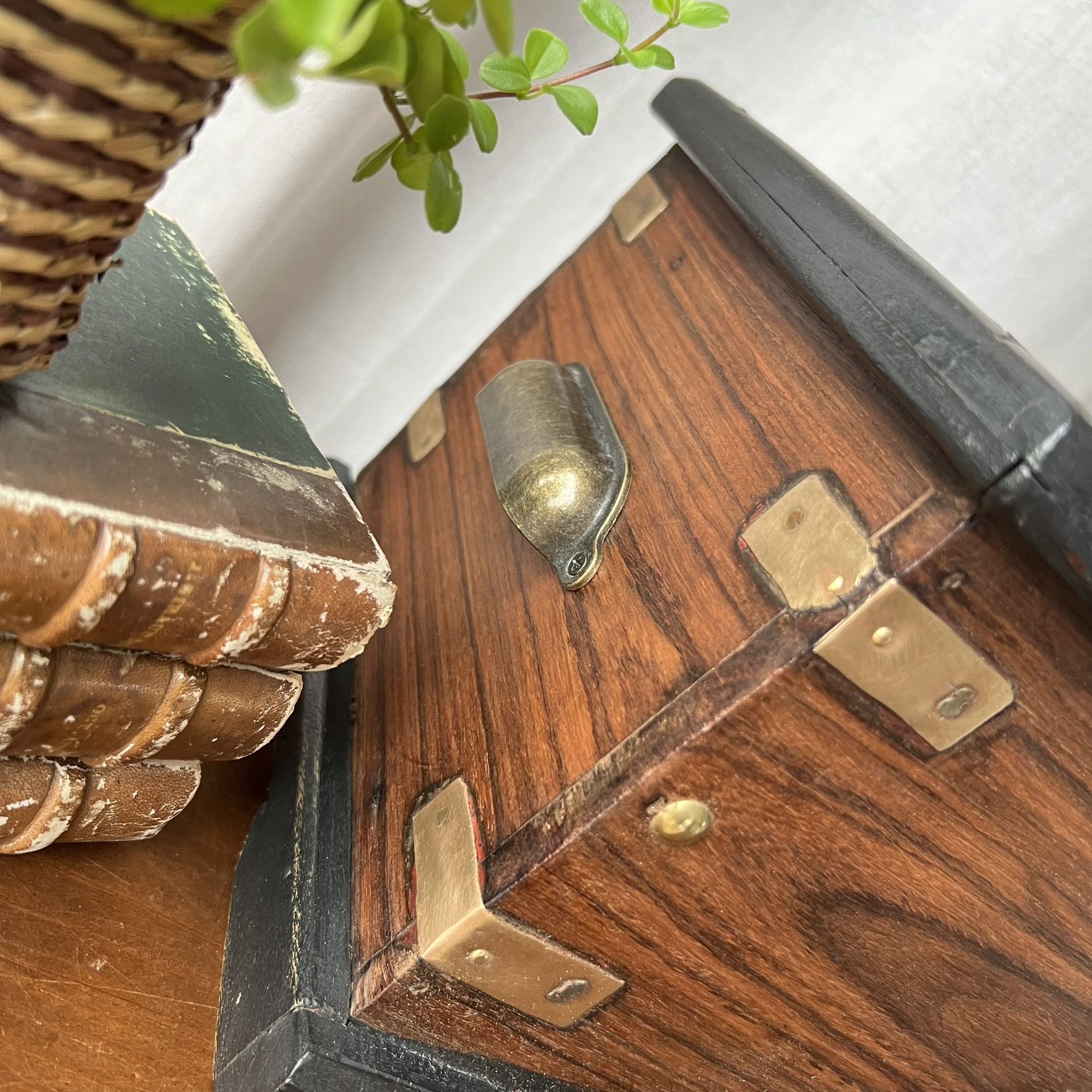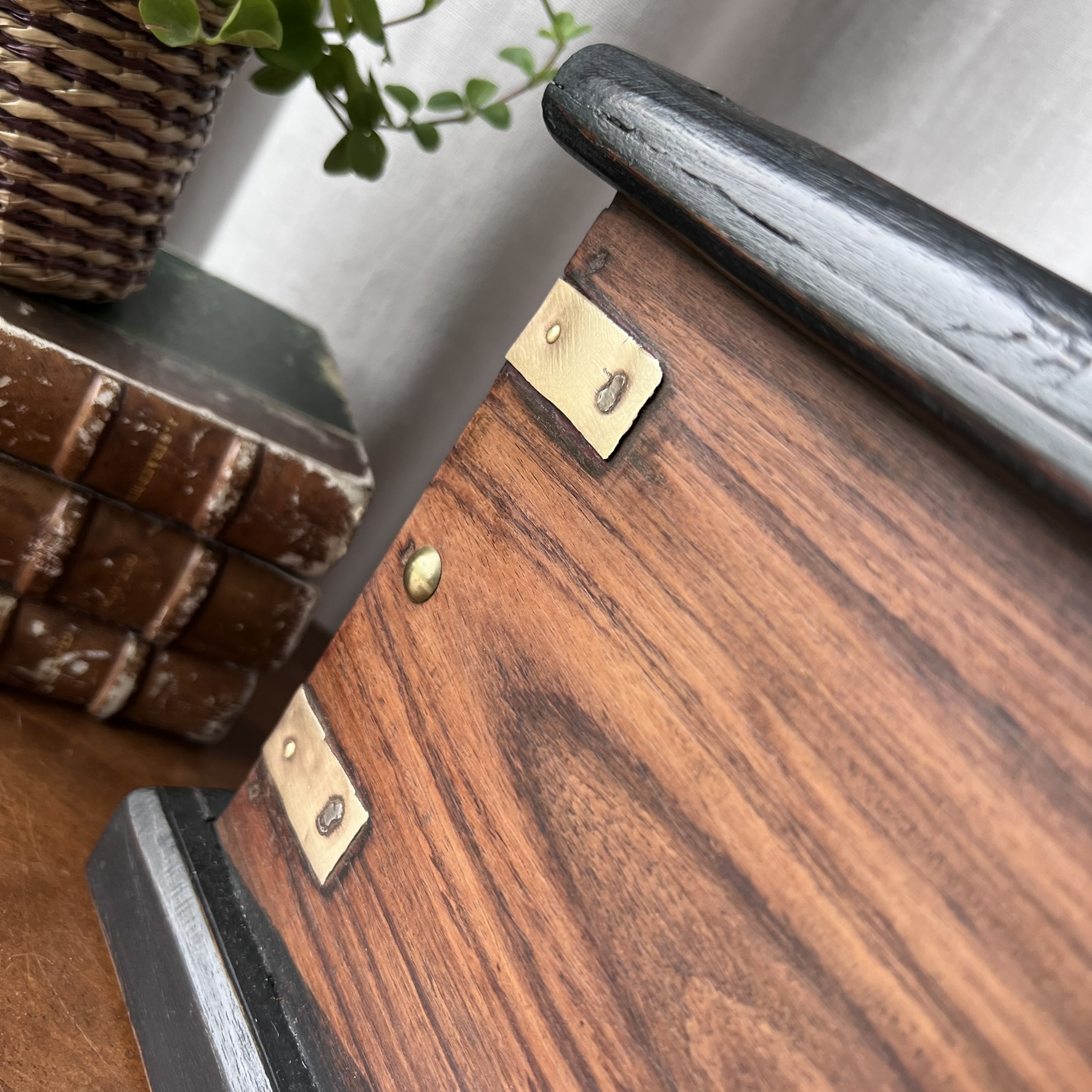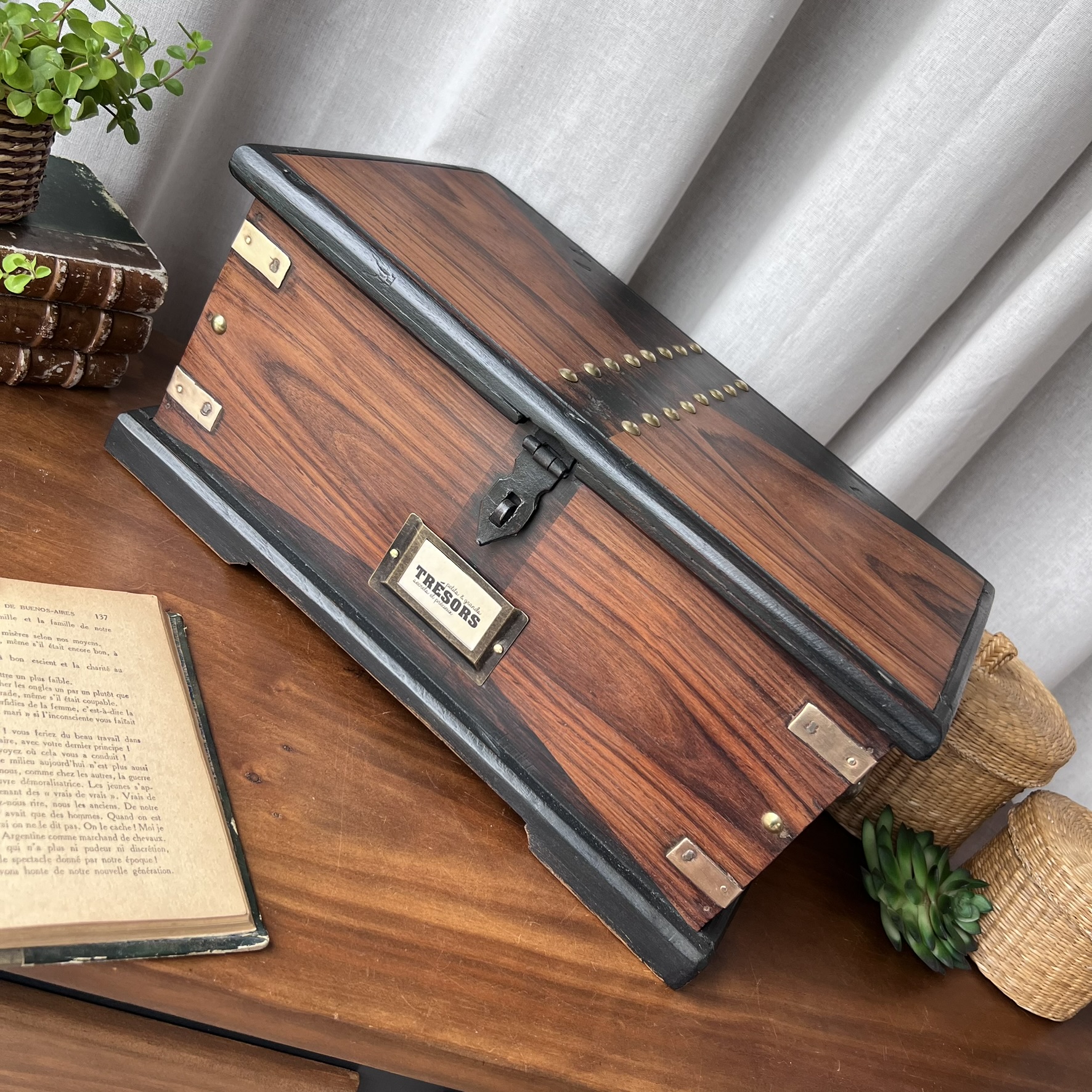 À l’intérieur, un compartiment amovible qui se soulève… et puis soudain, toute la profondeur du coffre se dévoile. Une cachette dans la cachette. Le bois raconte son histoire : des zones brutes, d’autres peintes en noir, patinées par le temps. Rien n’est lisse. Tout est vivant. J’ai ajouté deux poignées latérales pour lui redonner de la mobilité, pour qu’il puisse continuer à voyager.