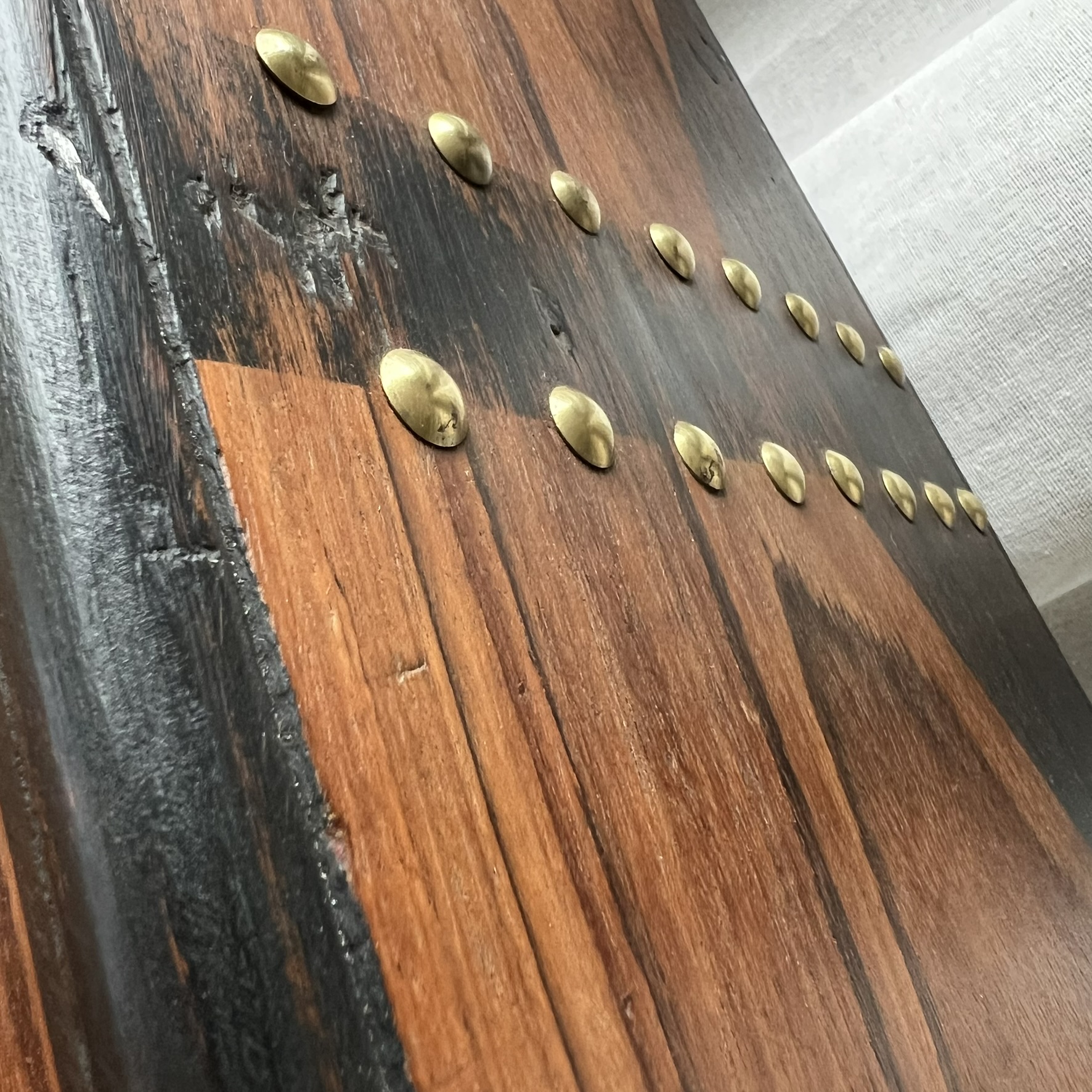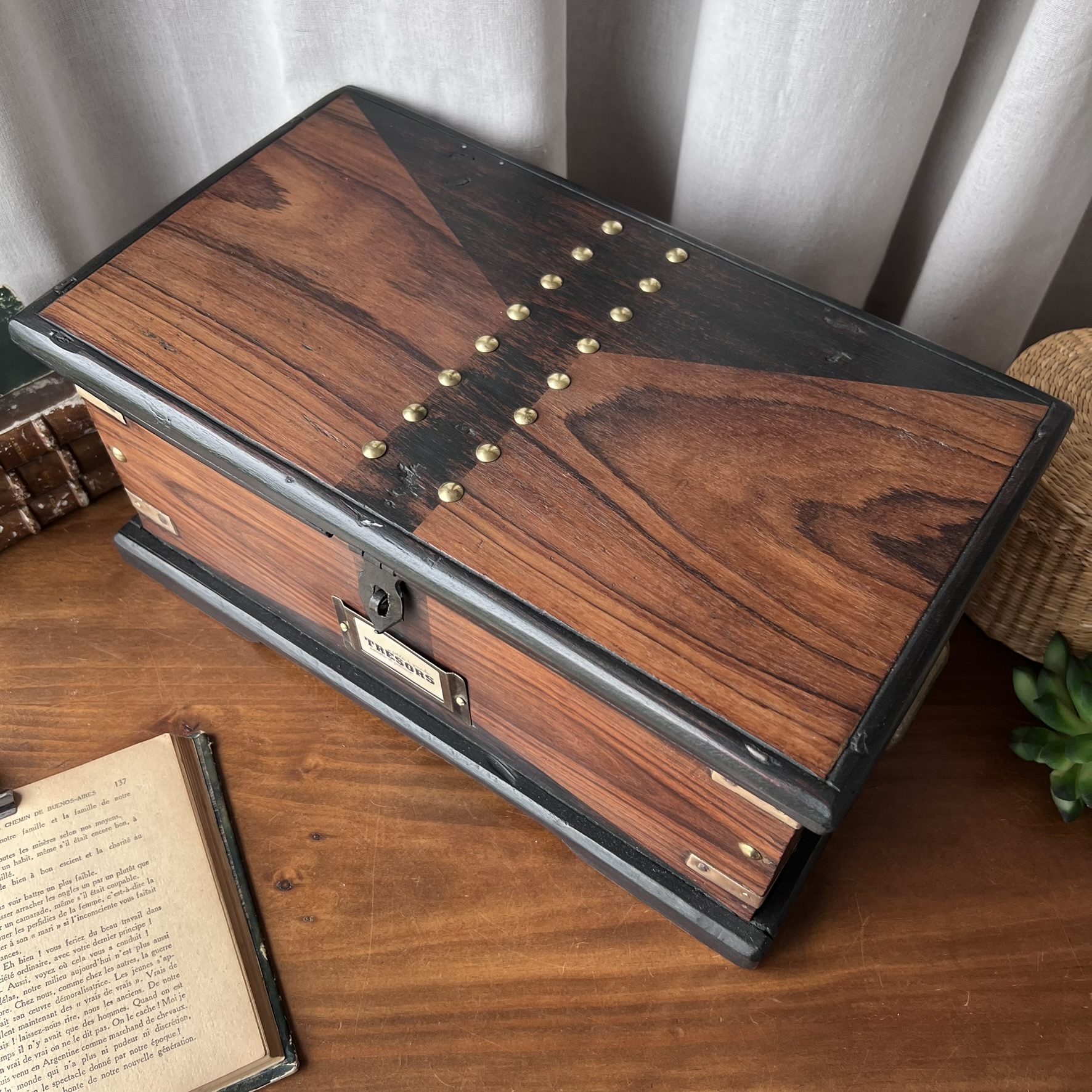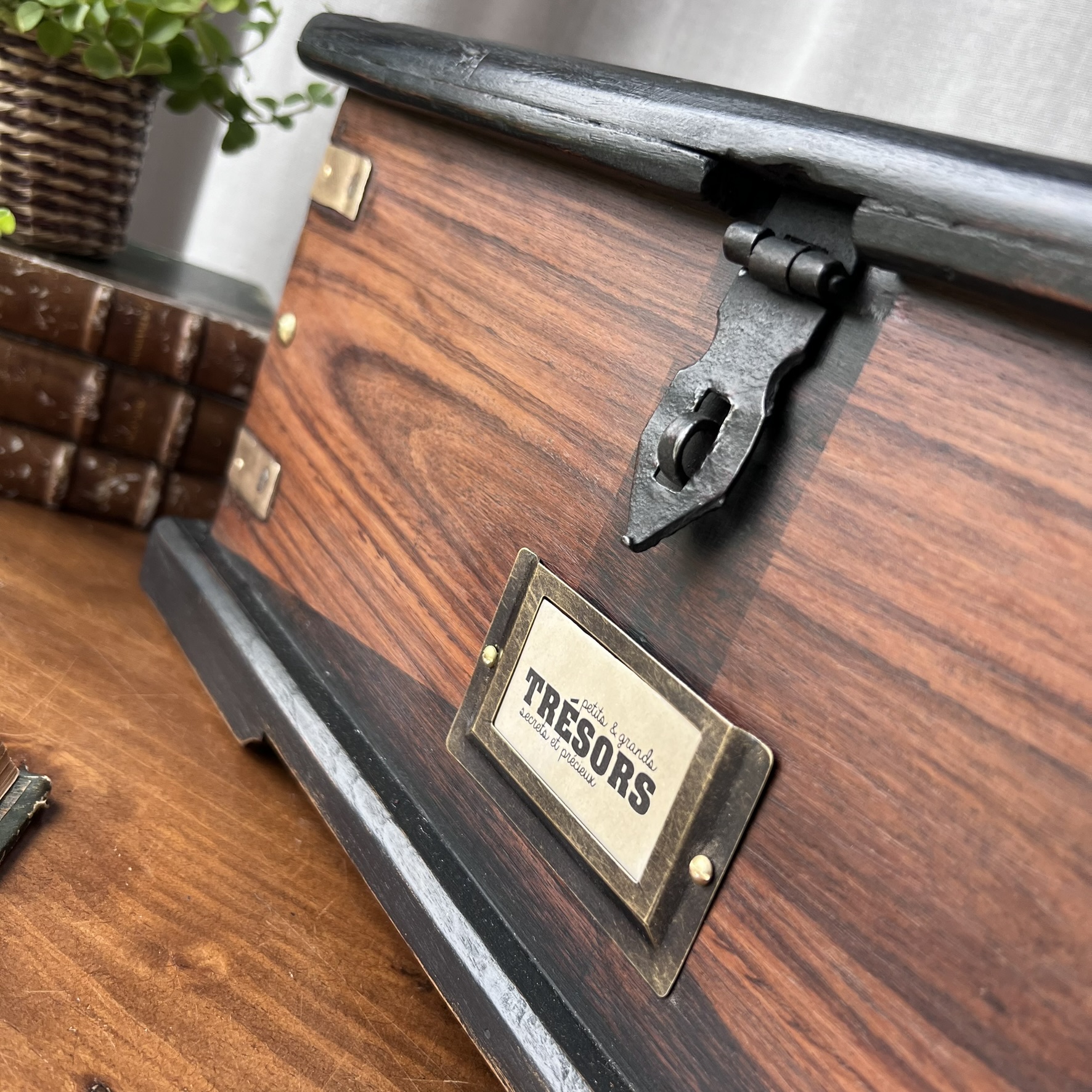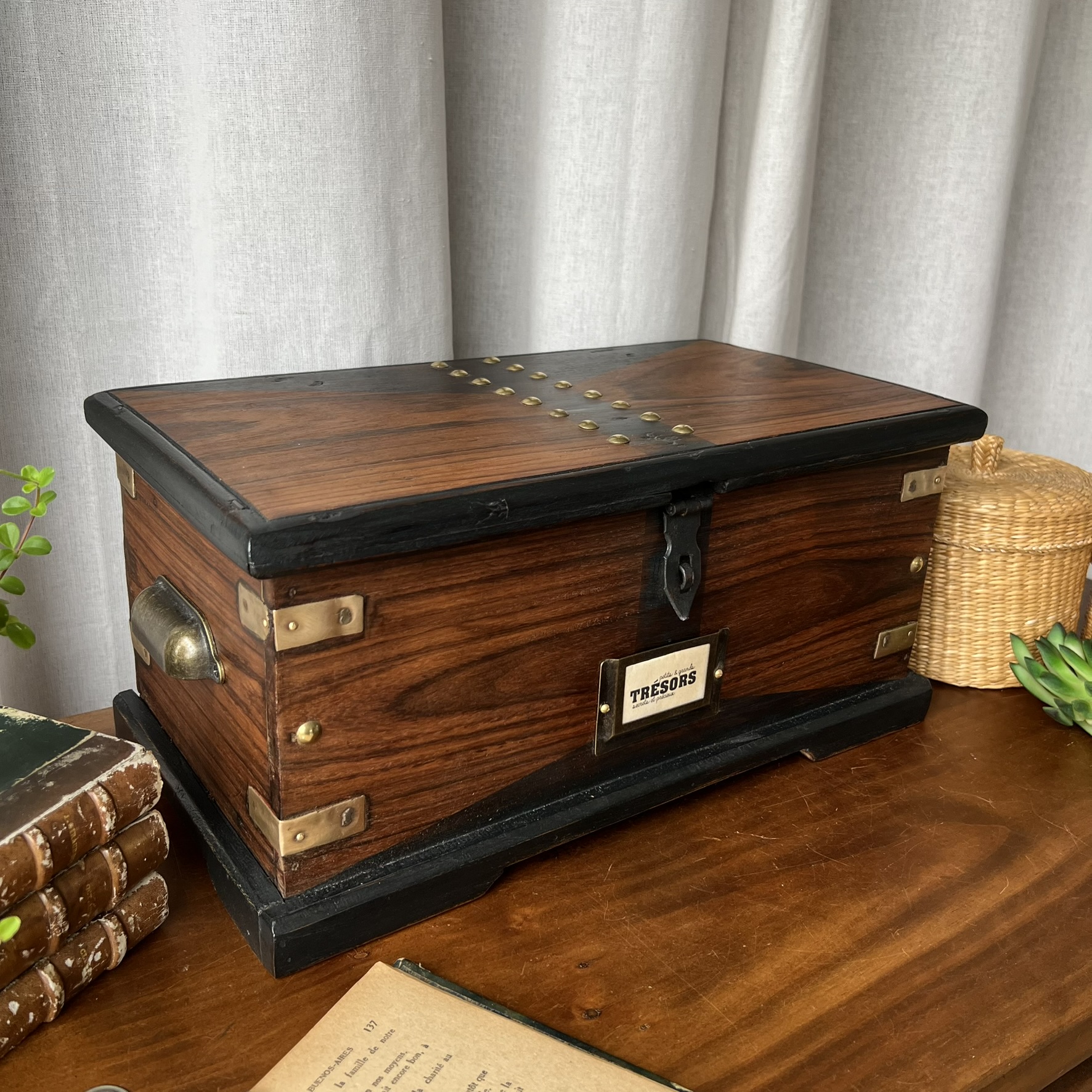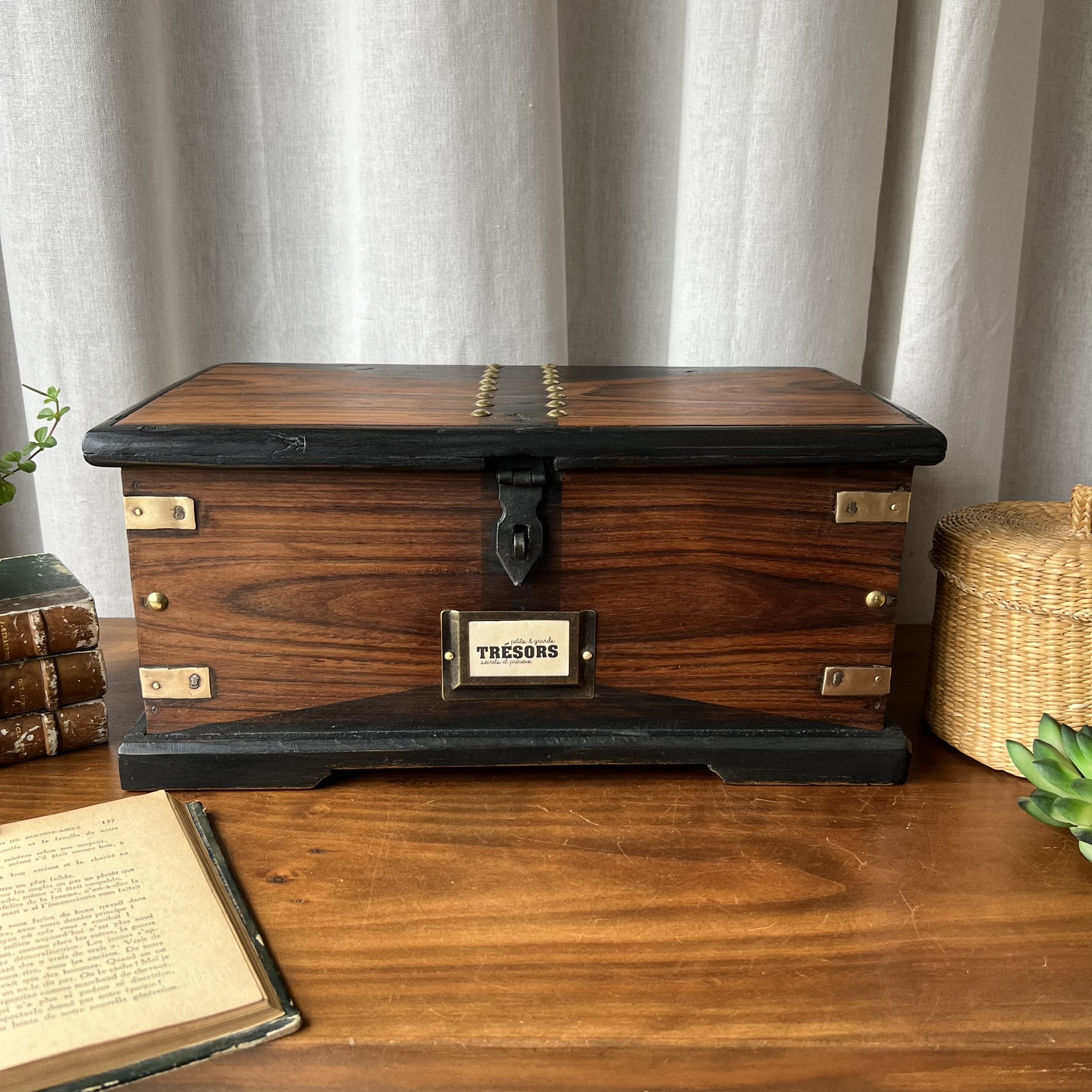 Il a ce quelque chose des objets qui ont déjà traversé des vies. Un grand coffre en bois massif, solide, rassurant. Des détails en laiton qui accrochent la lumière. La boucle d’origine, intacte.