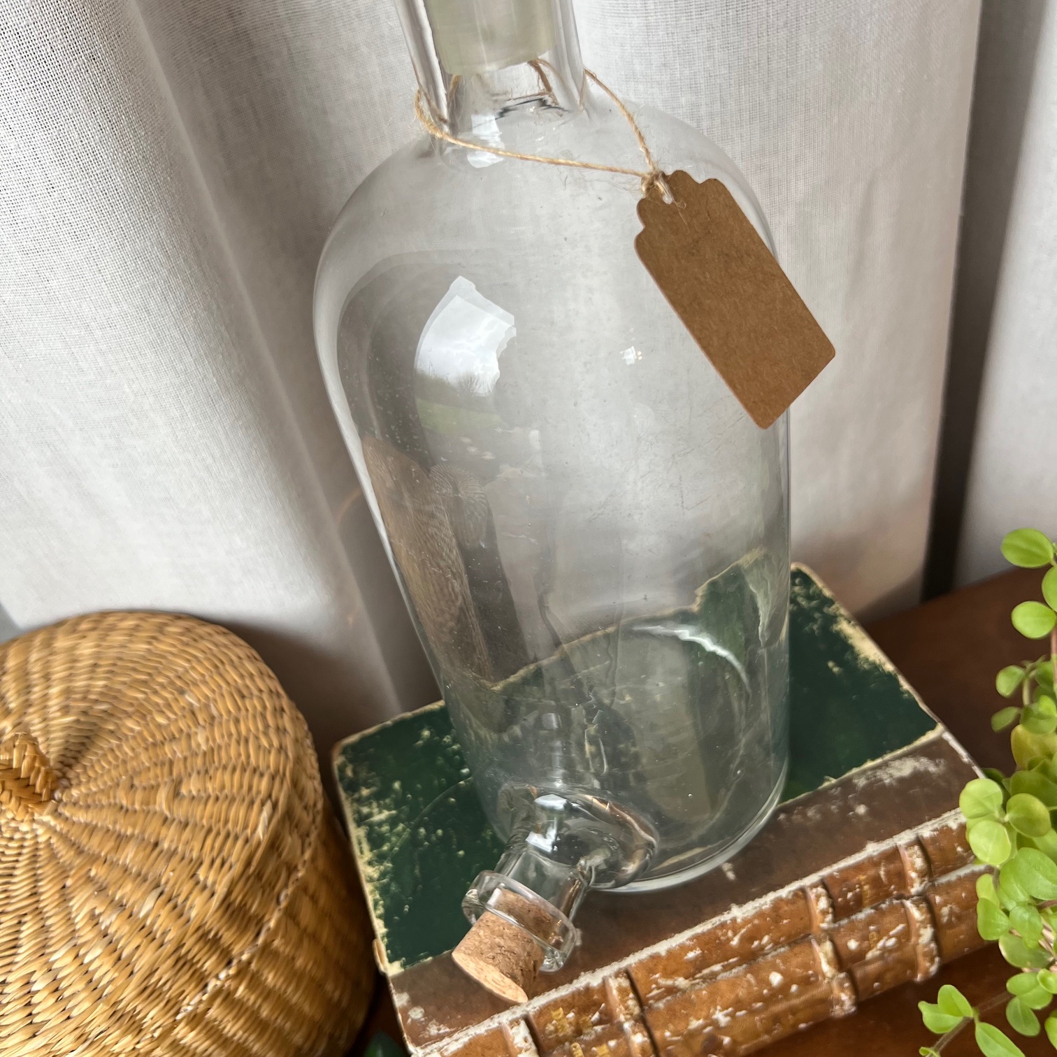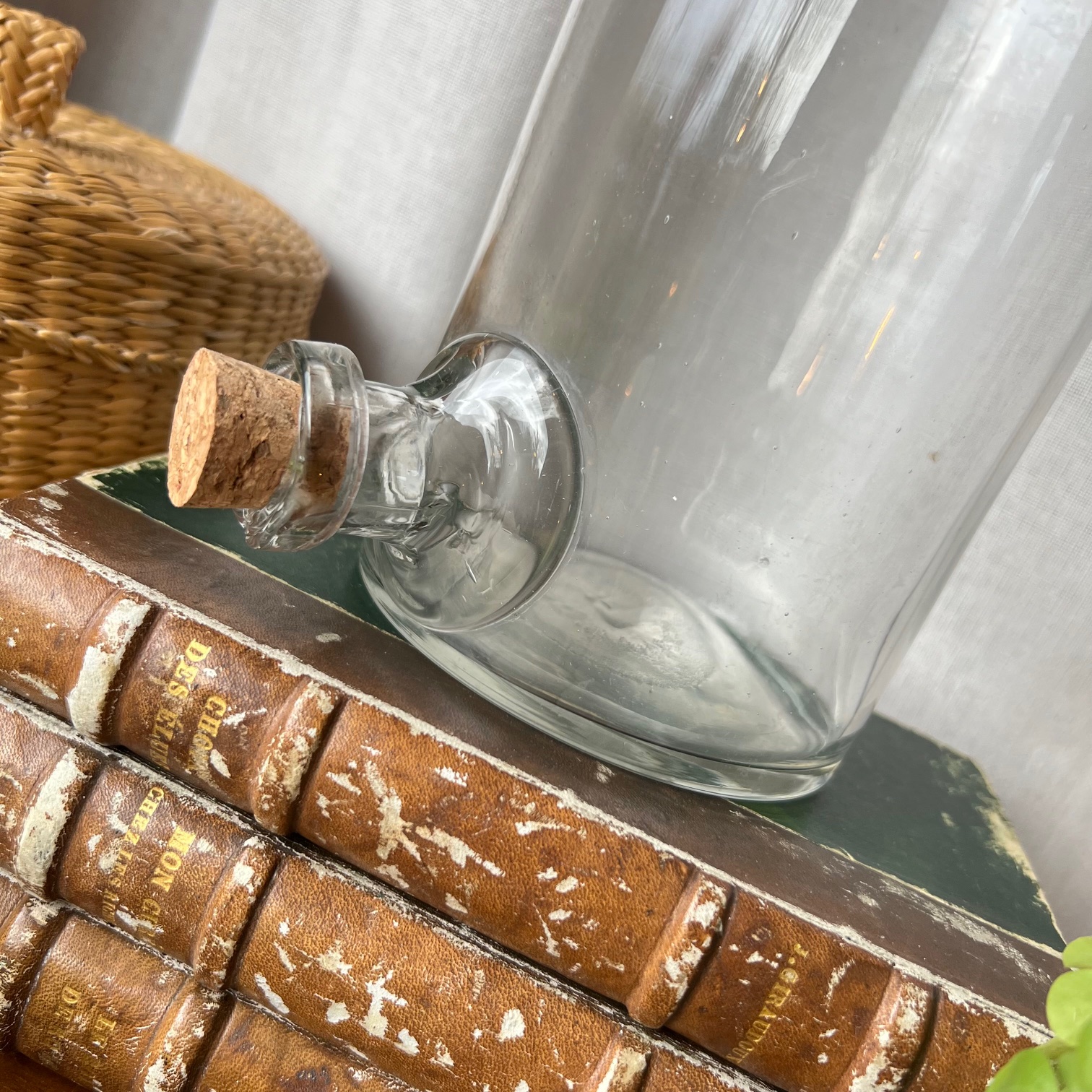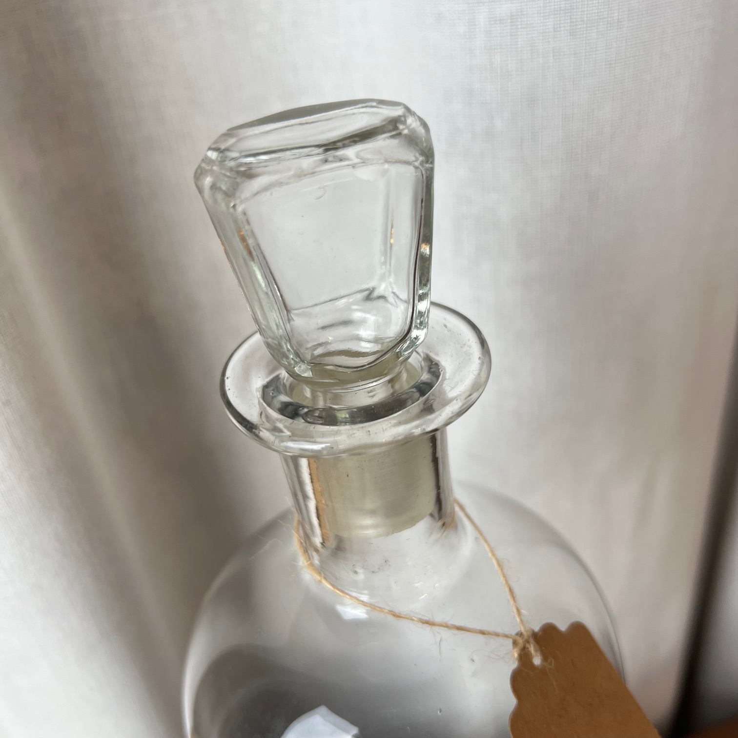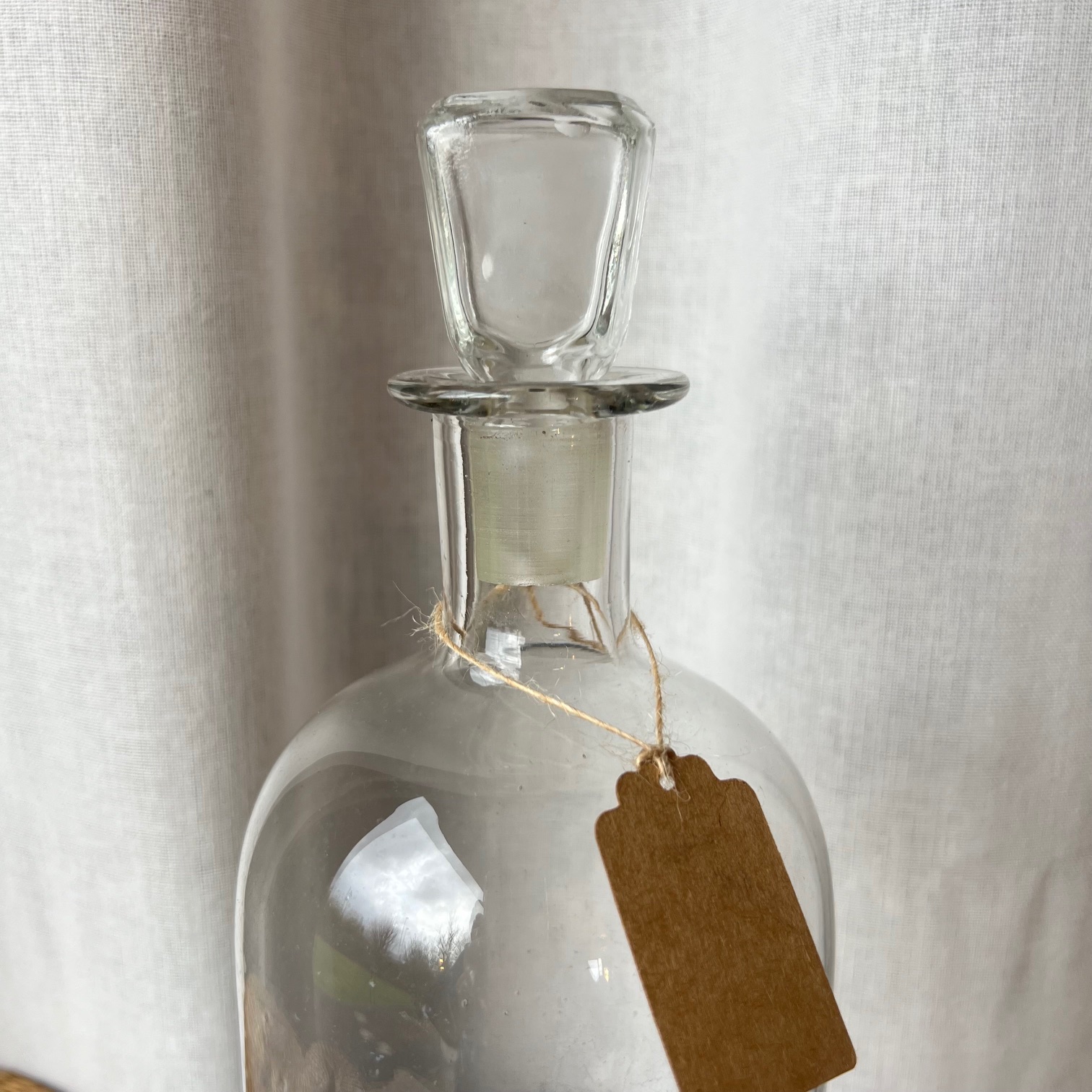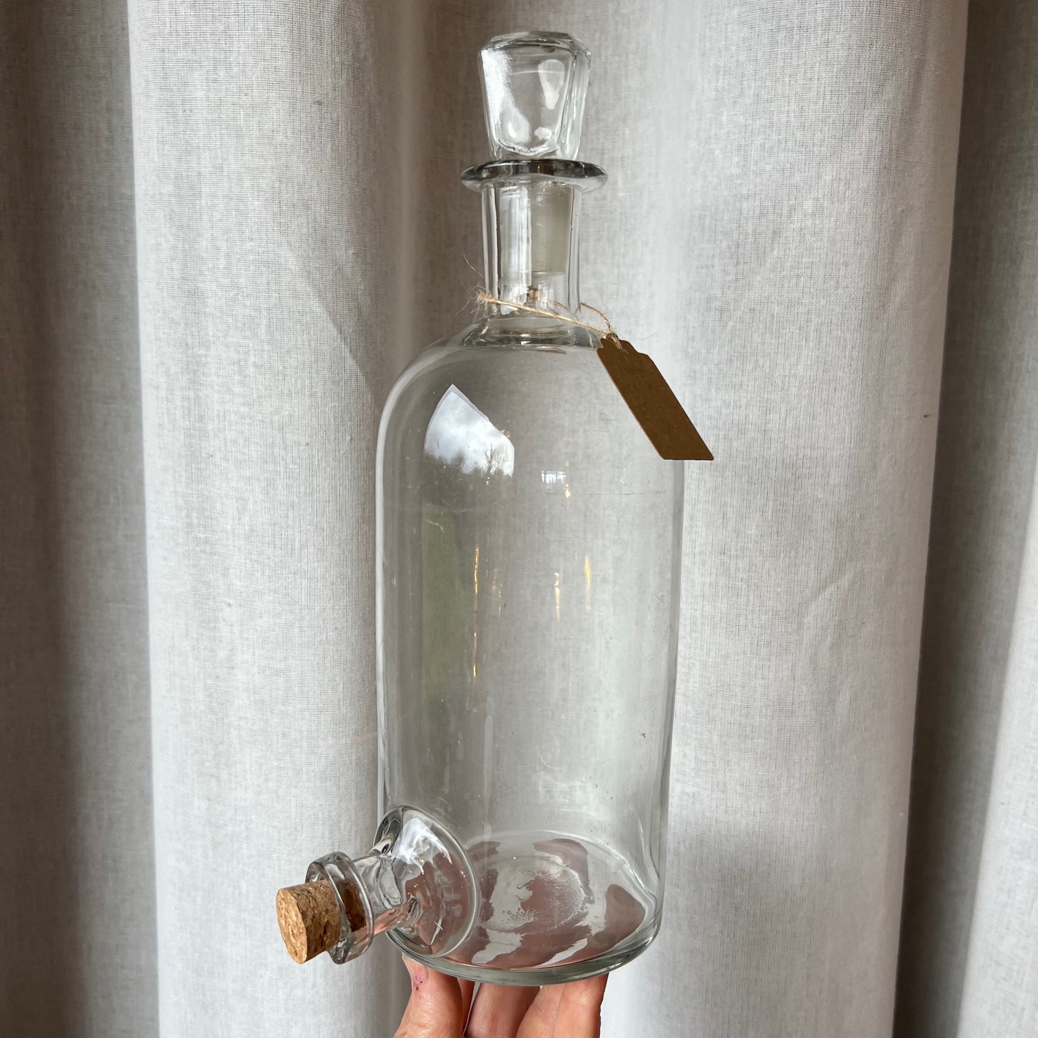 Ce flacon de laboratoire en verre transparent et bullé arbore 2 bouchons : l’un en verre, l’autre en liège. Il a traversé les années avec sobriété et élégance.