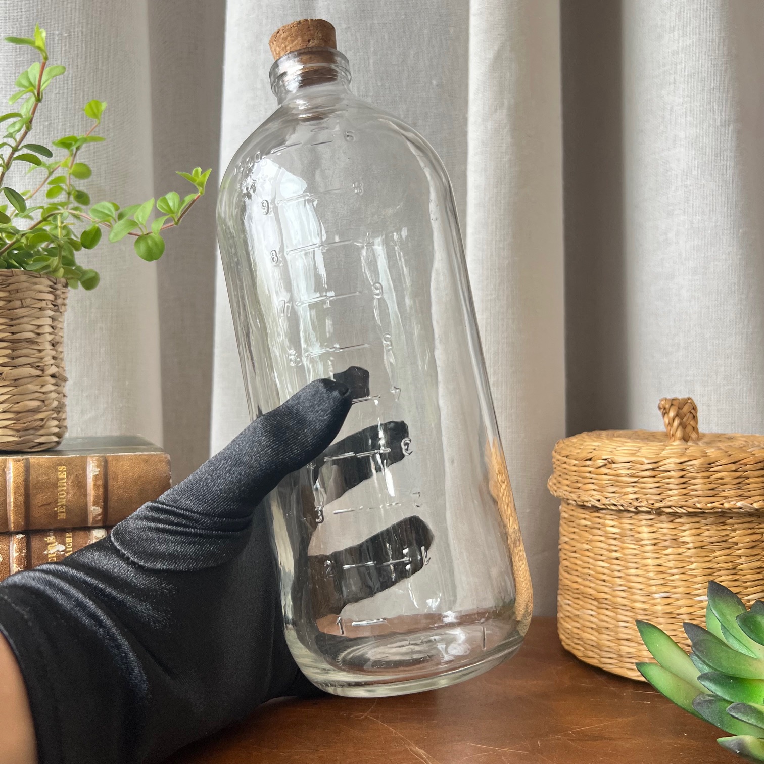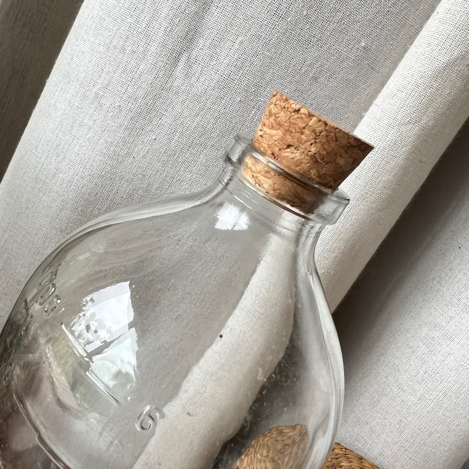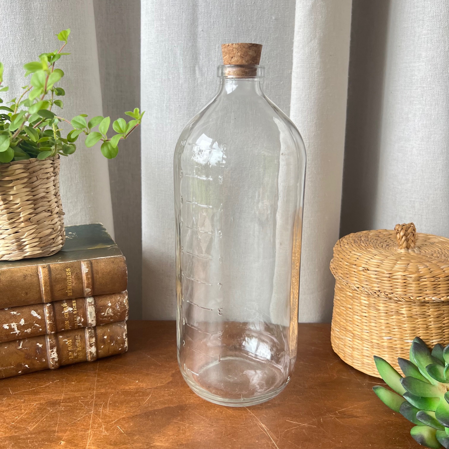 Ce flacon de pharmacie en verre transparent et épais est gradué. Il a traversé les années avec sobriété et élégance. Son bouchon de liège d’origine lui apporte une touche authentique et chaleureuse.
