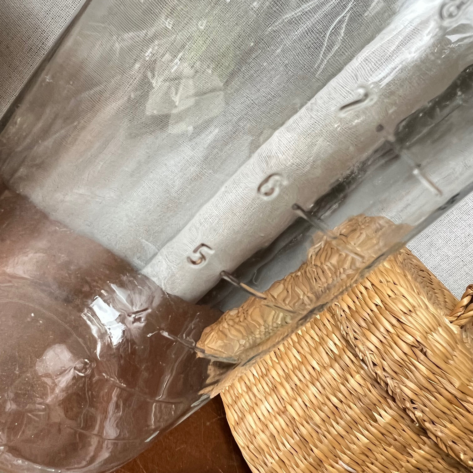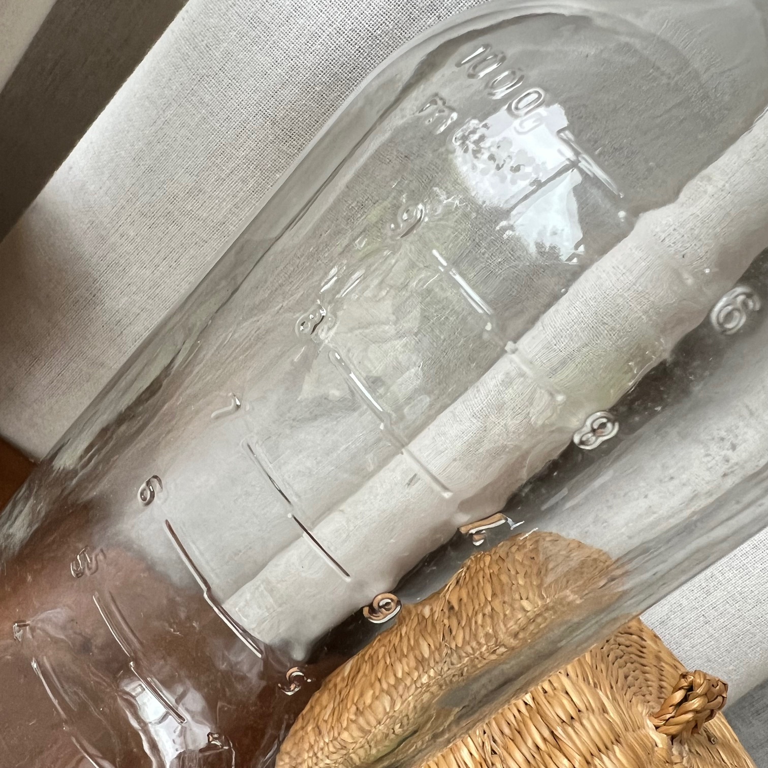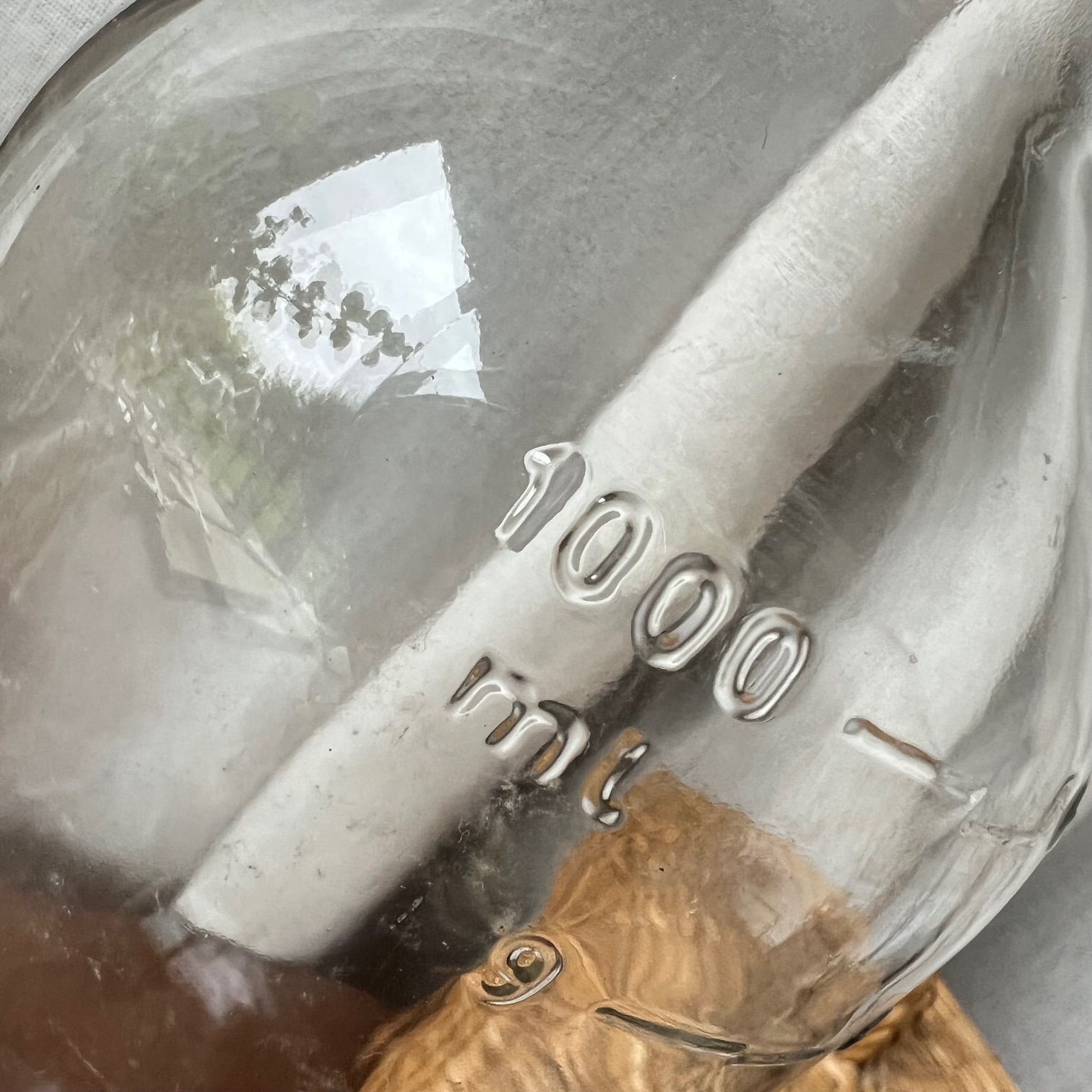 Ce flacon de pharmacie en verre transparent et épais est gradué. Il a traversé les années avec sobriété et élégance. Son bouchon de liège d’origine lui apporte une touche authentique et chaleureuse.
