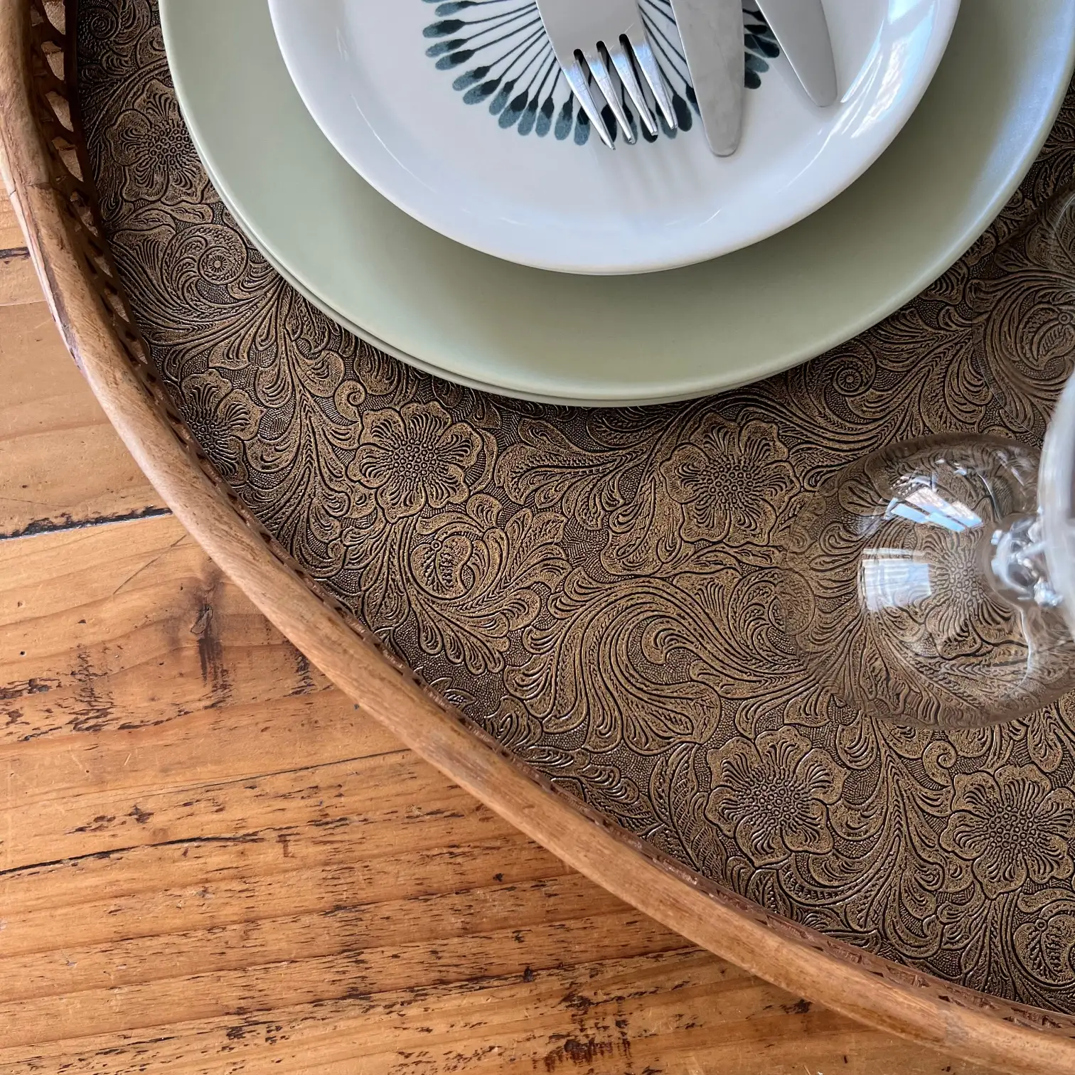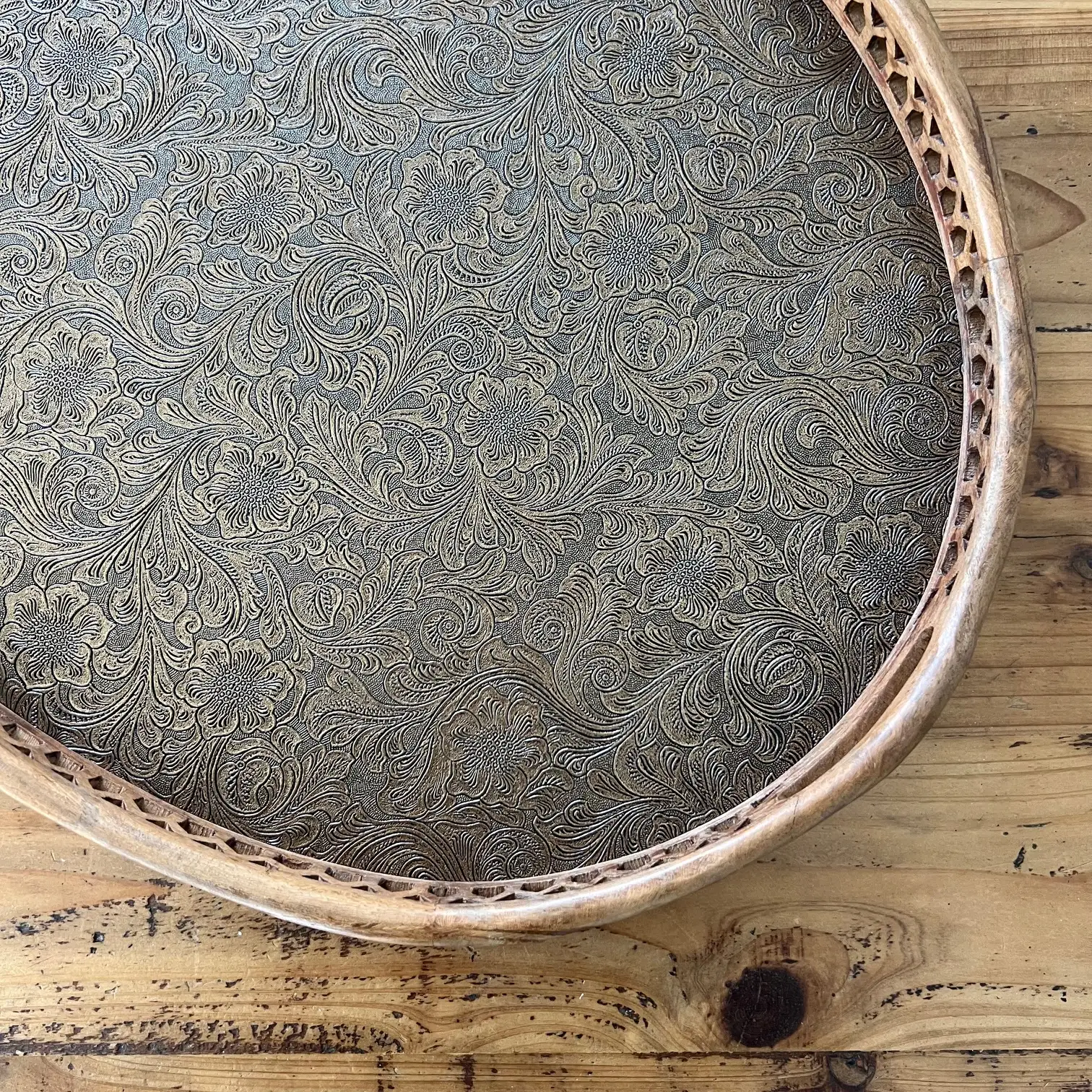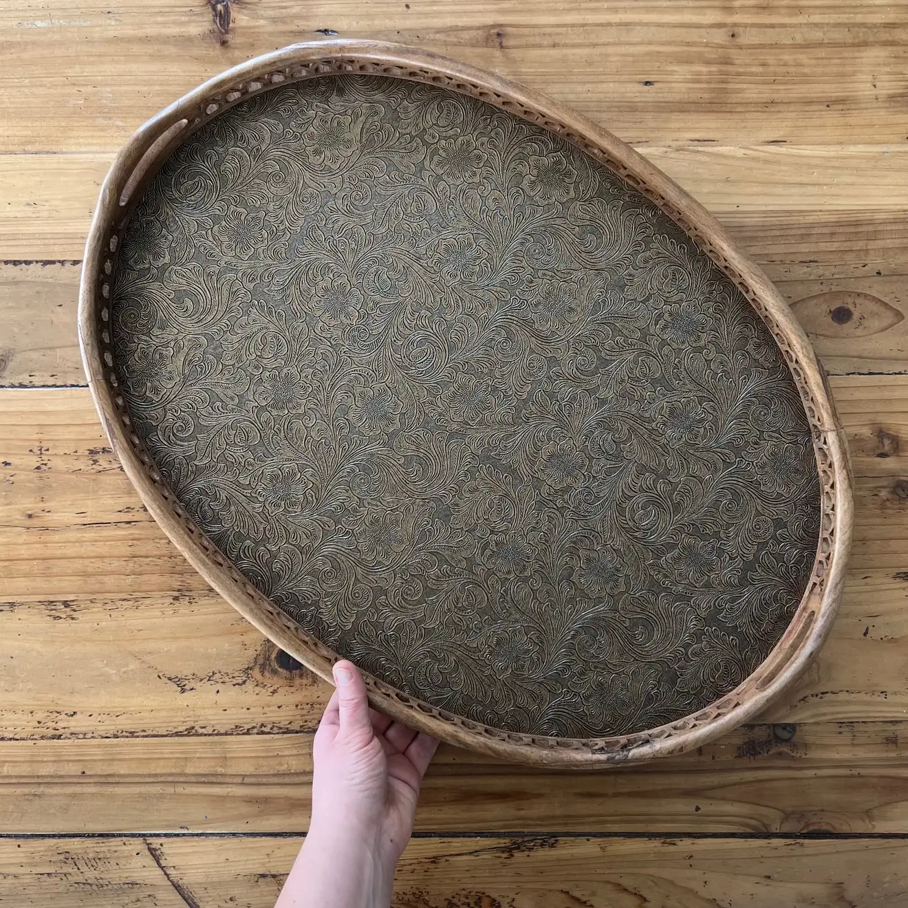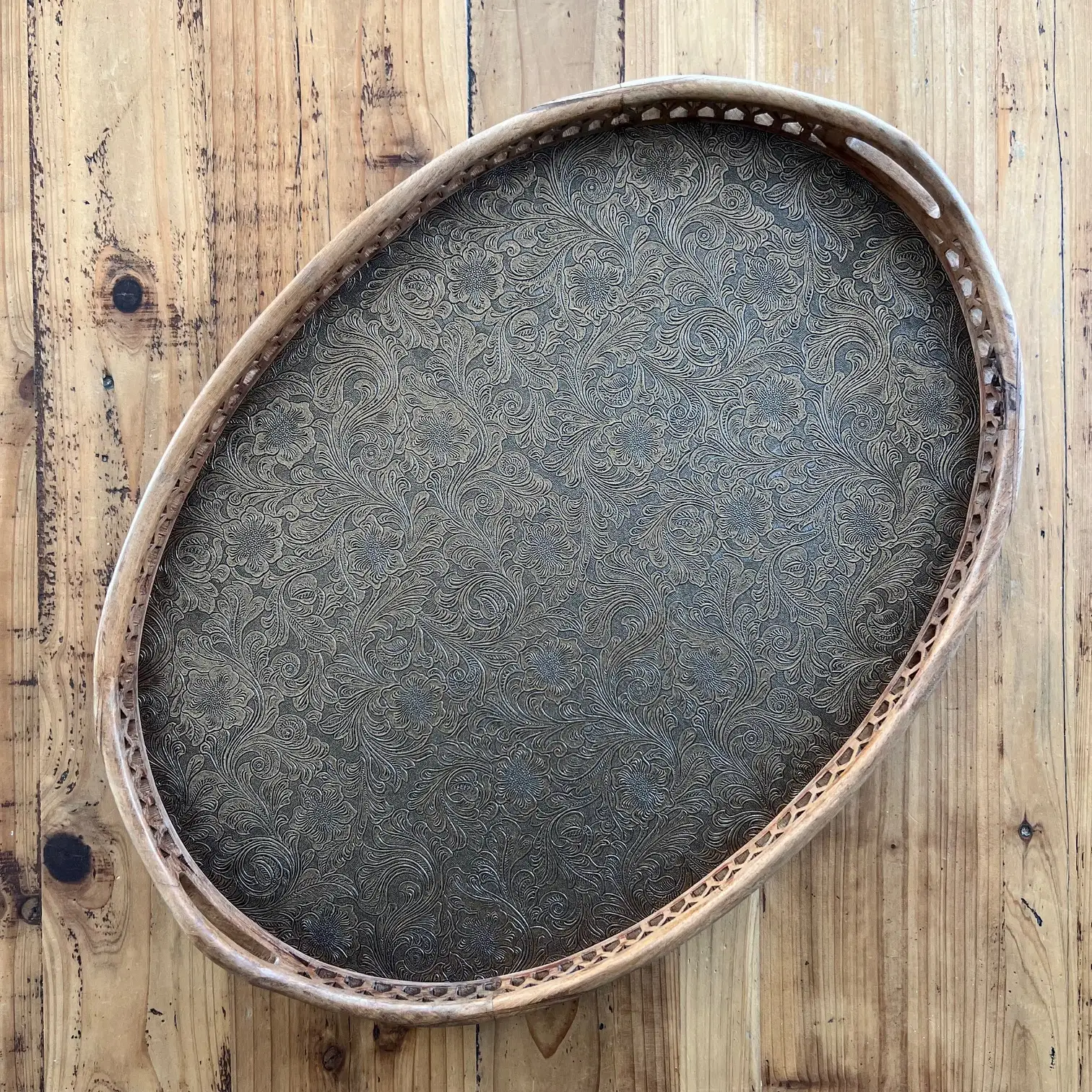 Ce grand plateau ovale, avec ses bords sculptés et ses deux anses, a été repensé avec un habillage en simili cuir aux arabesques dorées et noires, légèrement moirées, qui capte la lumière et attire le regard. Un décor plus affirmé, mais qui reste au service de l’usage.