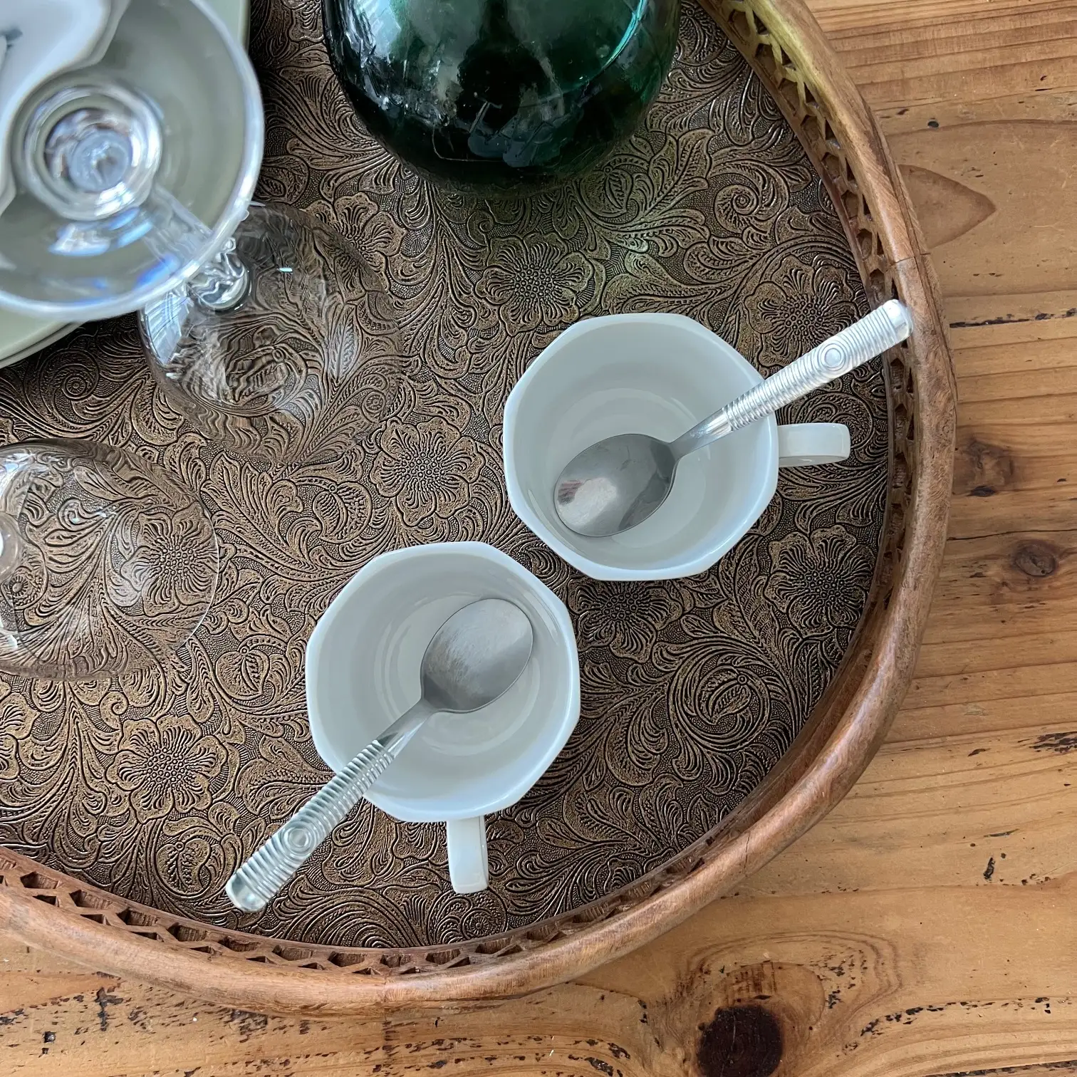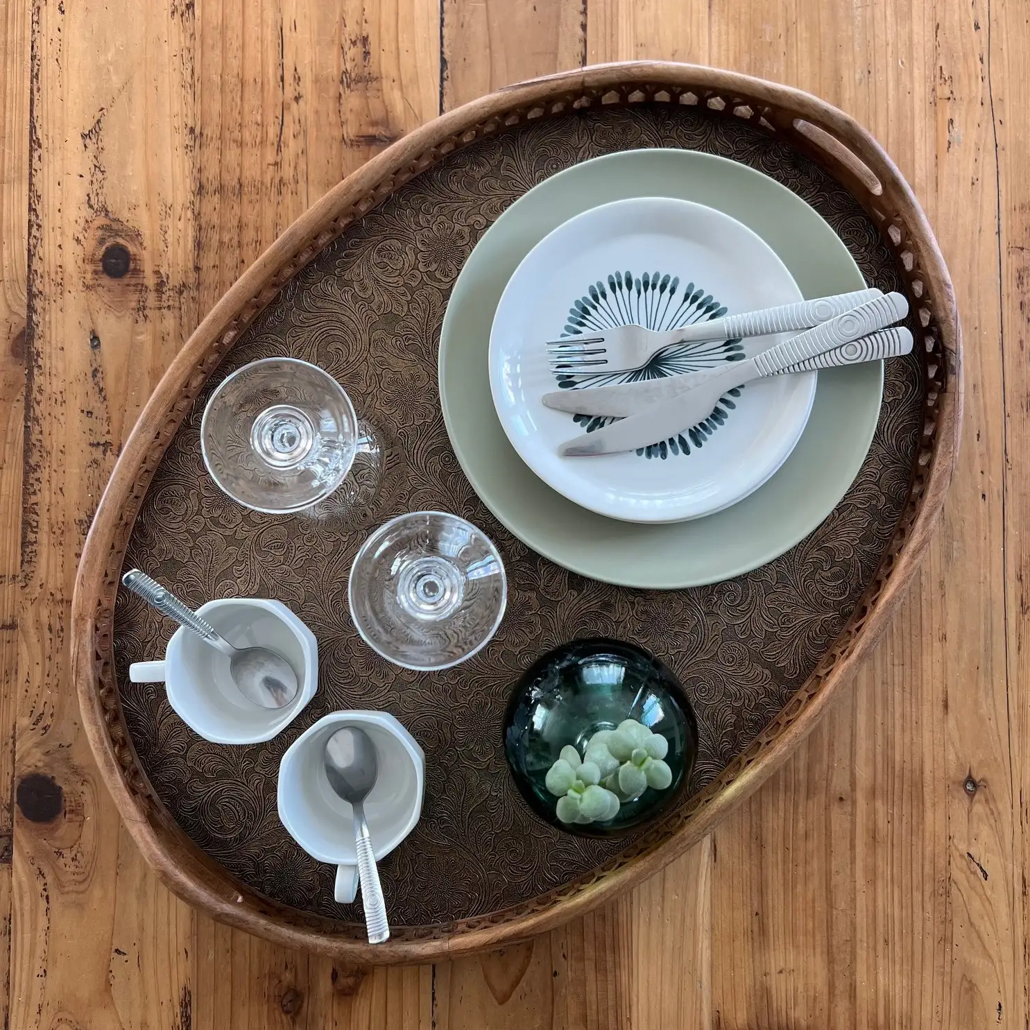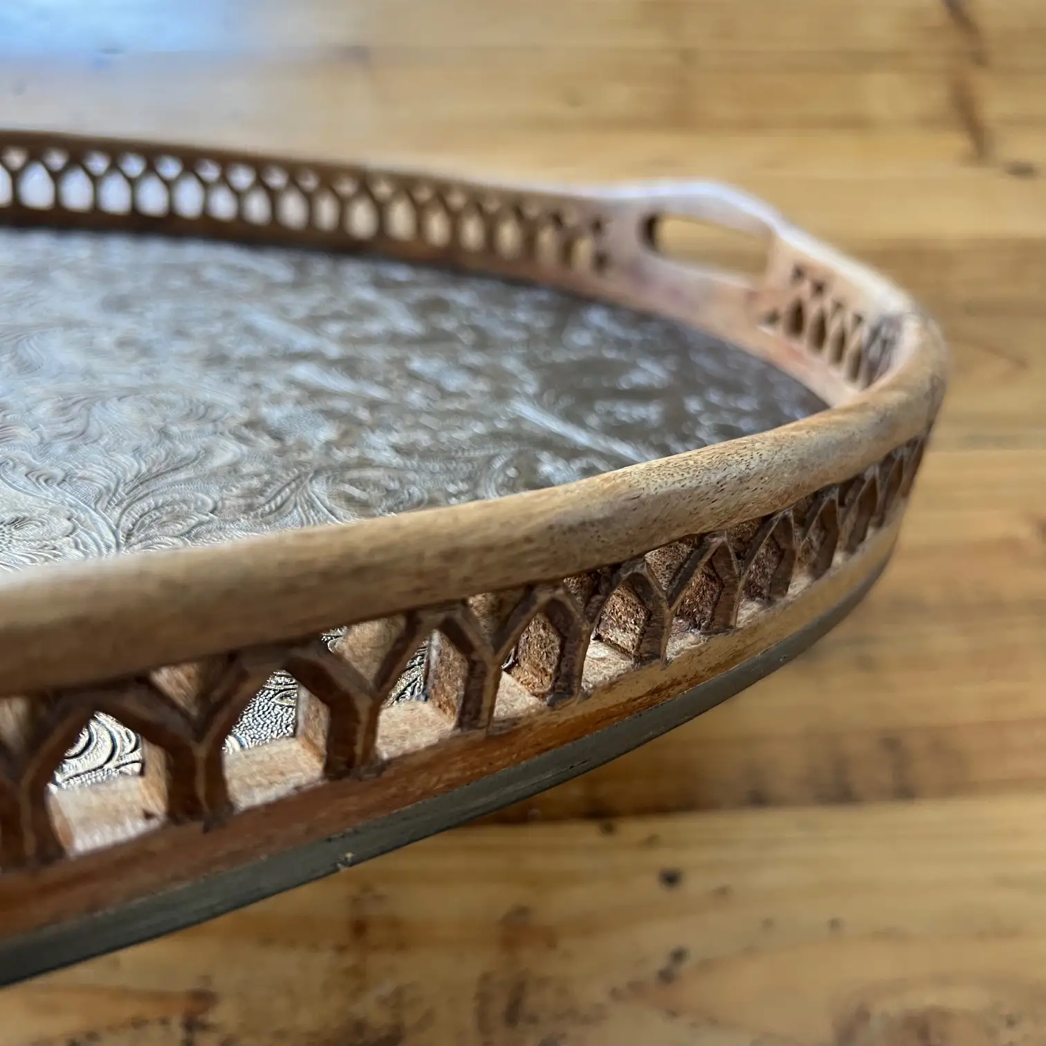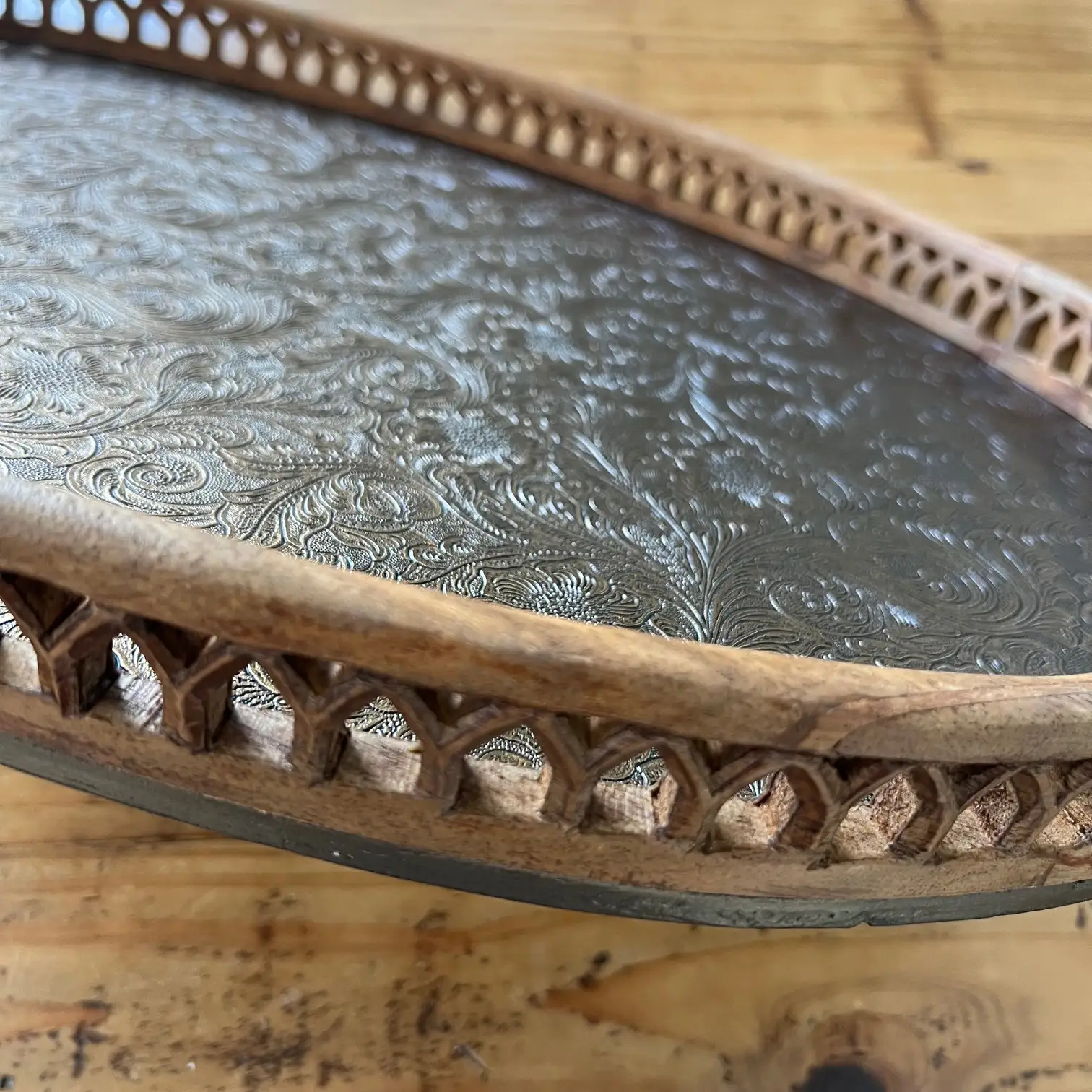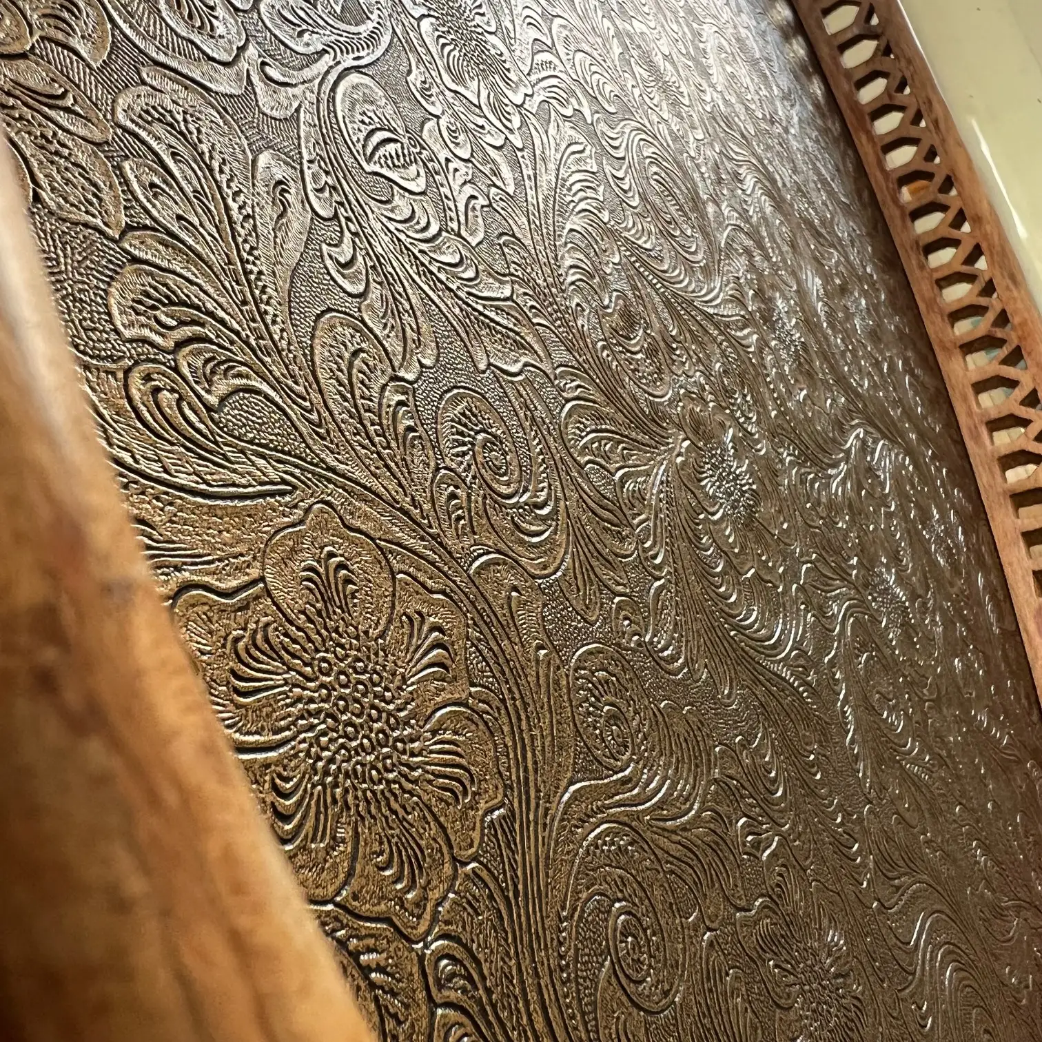 Ce grand plateau ovale, avec ses bords sculptés et ses deux anses, a été repensé avec un habillage en simili cuir aux arabesques dorées et noires, légèrement moirées, qui capte la lumière et attire le regard. Un décor plus affirmé, mais qui reste au service de l’usage.