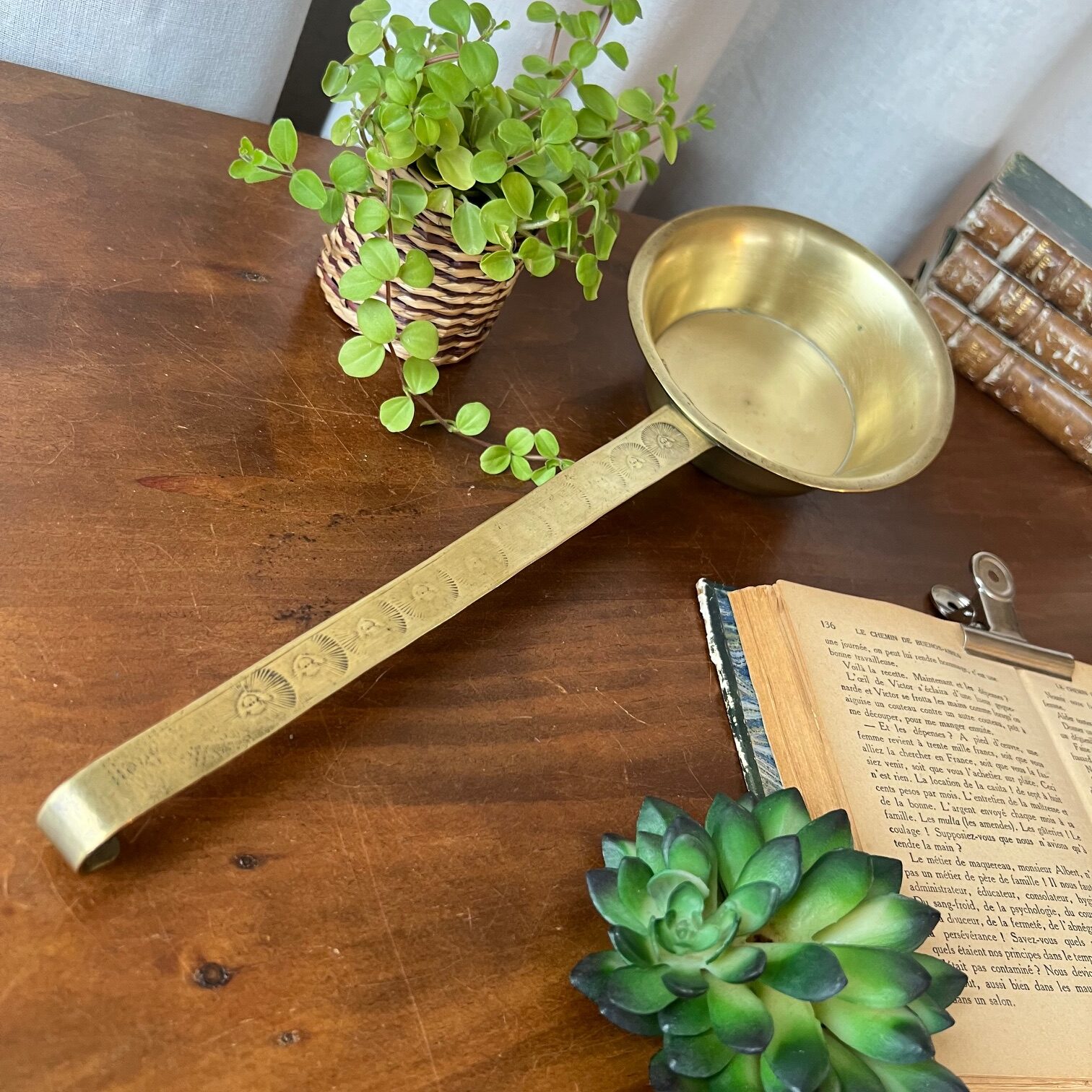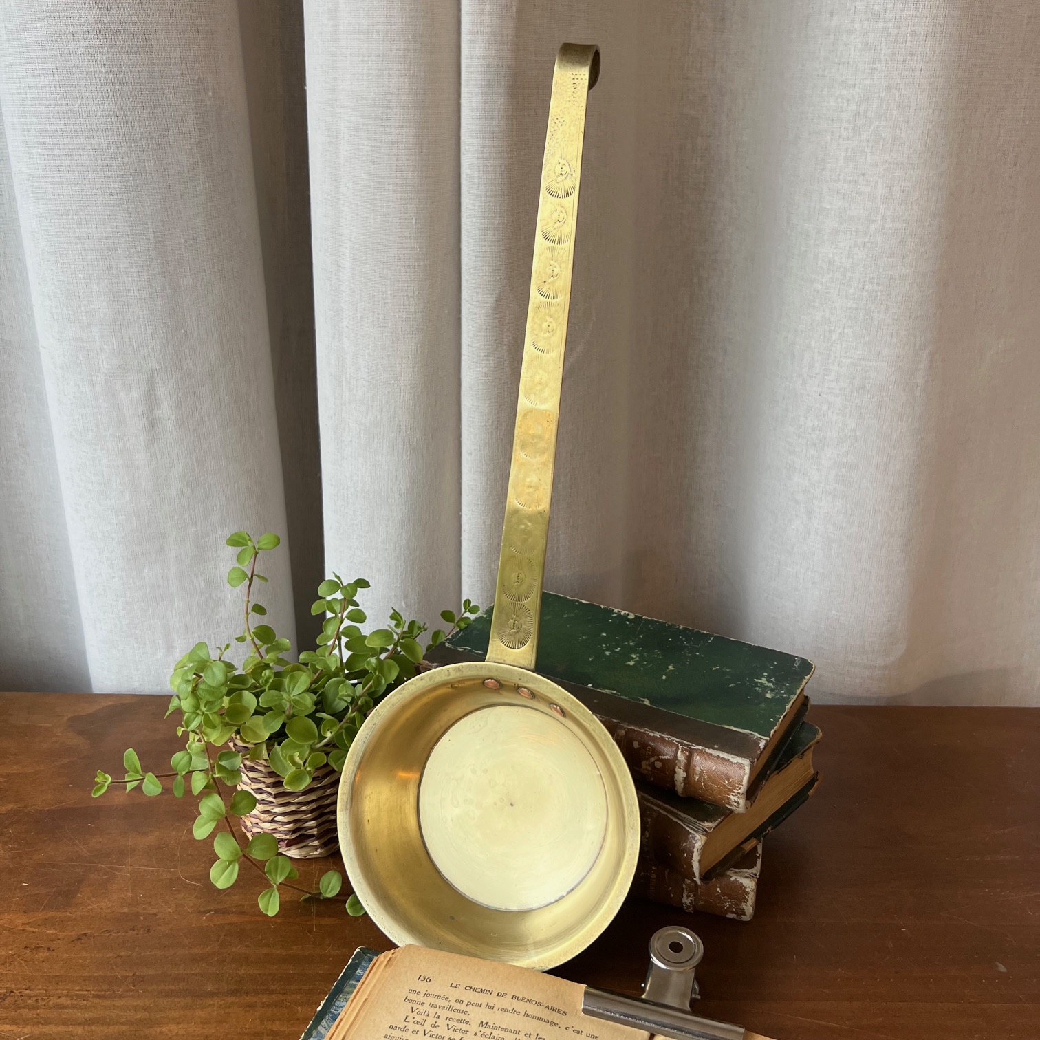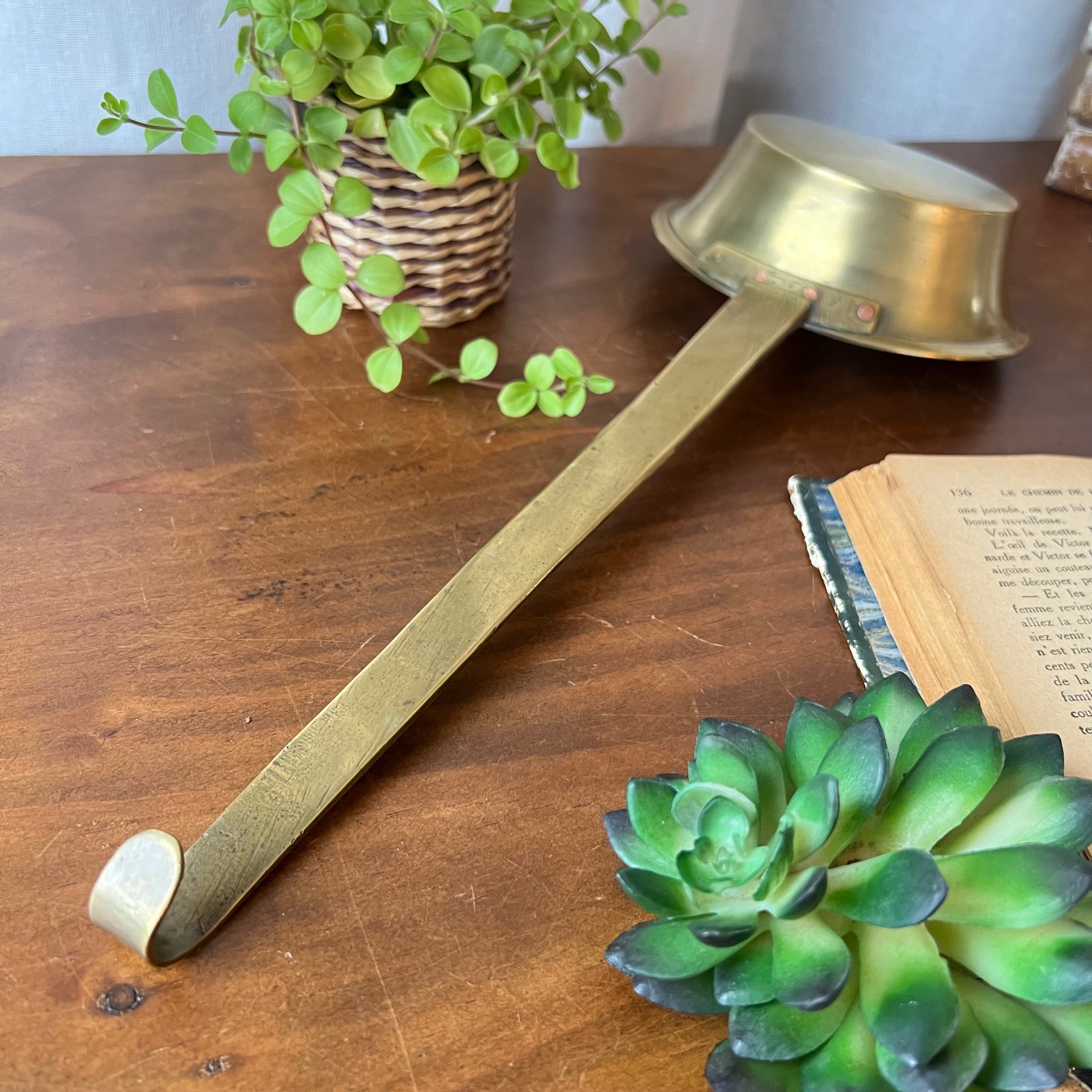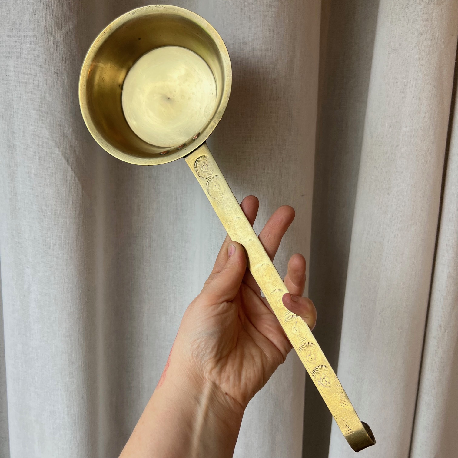 Grande louche en laiton doré avec son manche joliment ciselé : beaucoup de charme pour cet ustensile d’un autre temps qui se plaira en décoration dans votre cuisine !